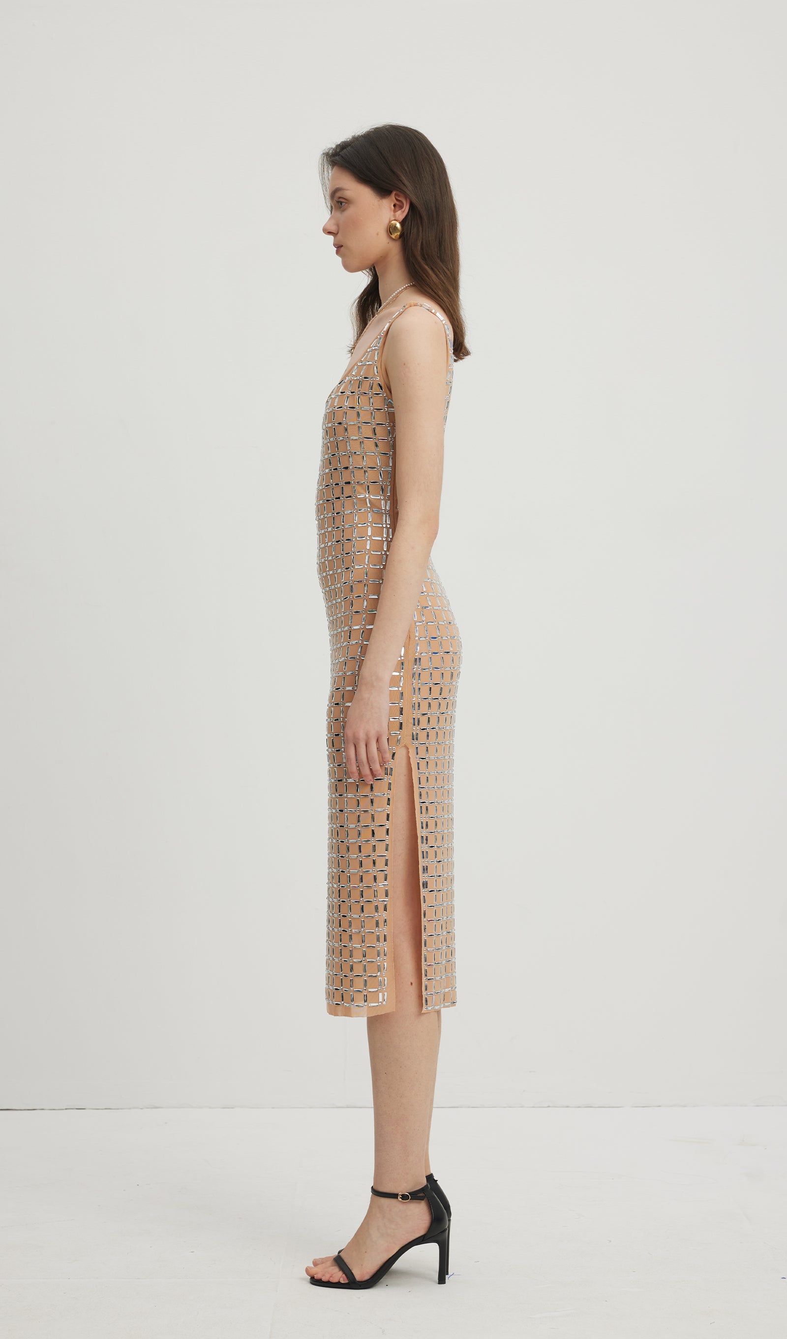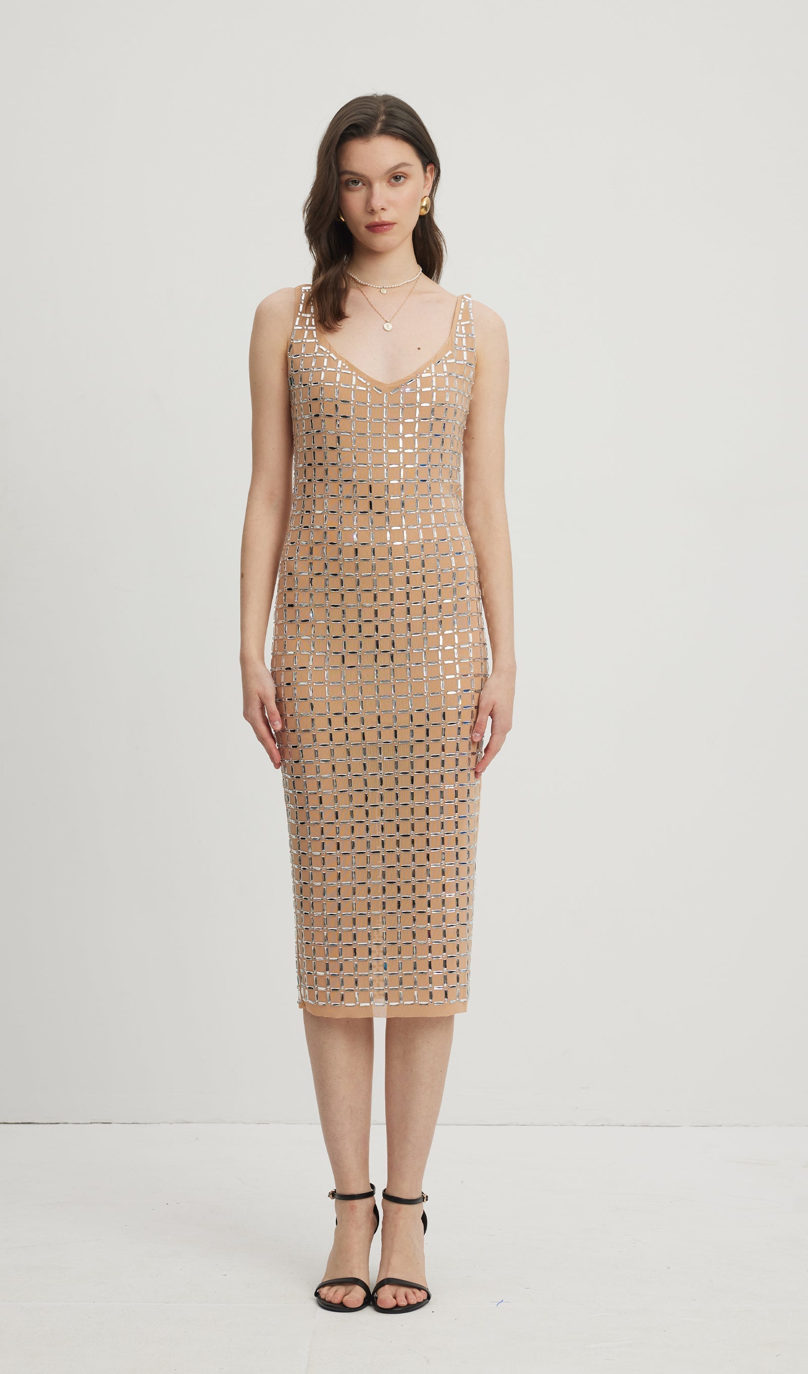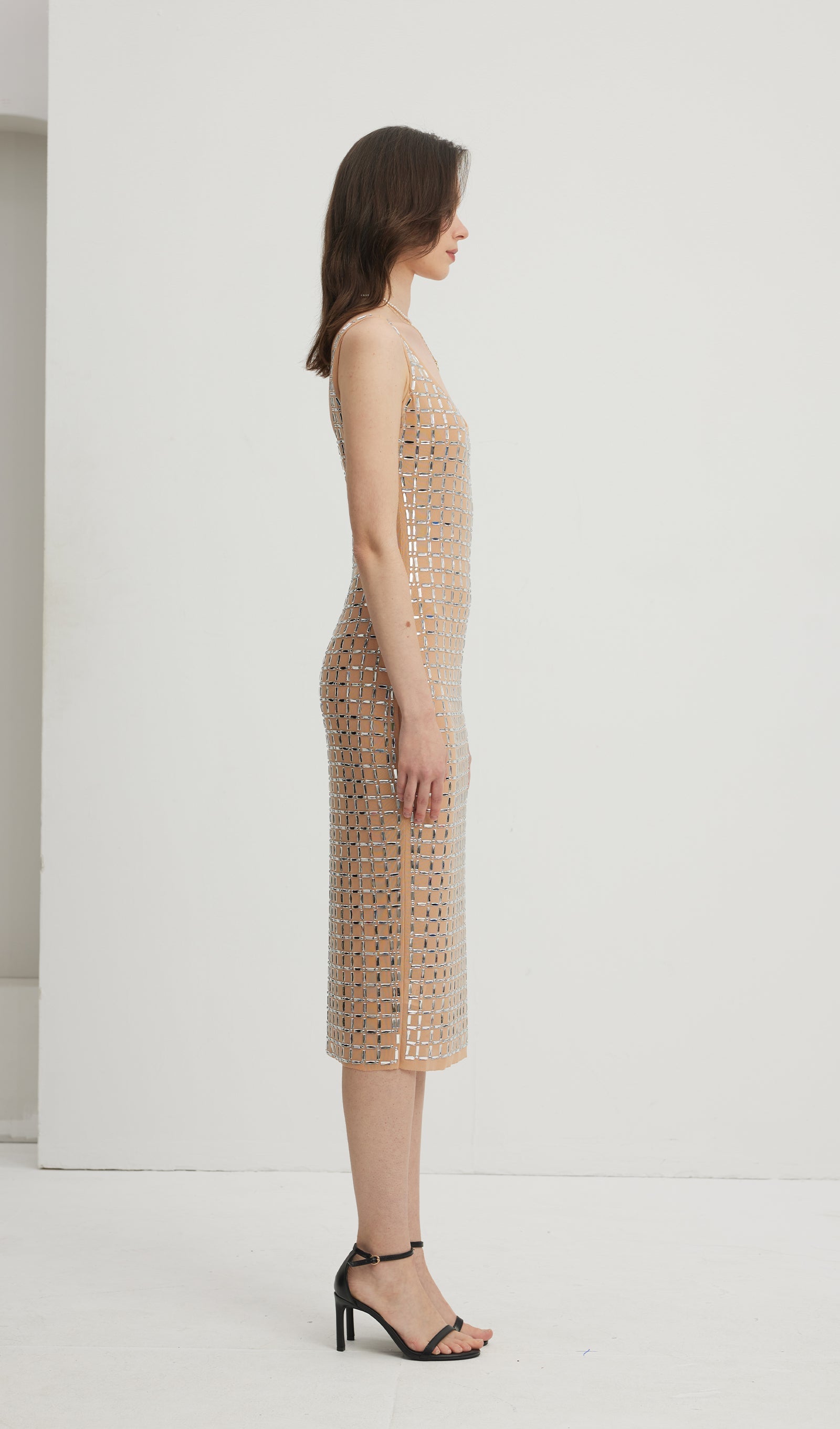 Süslemeli Sırtı Açık Midi Elbise Nude