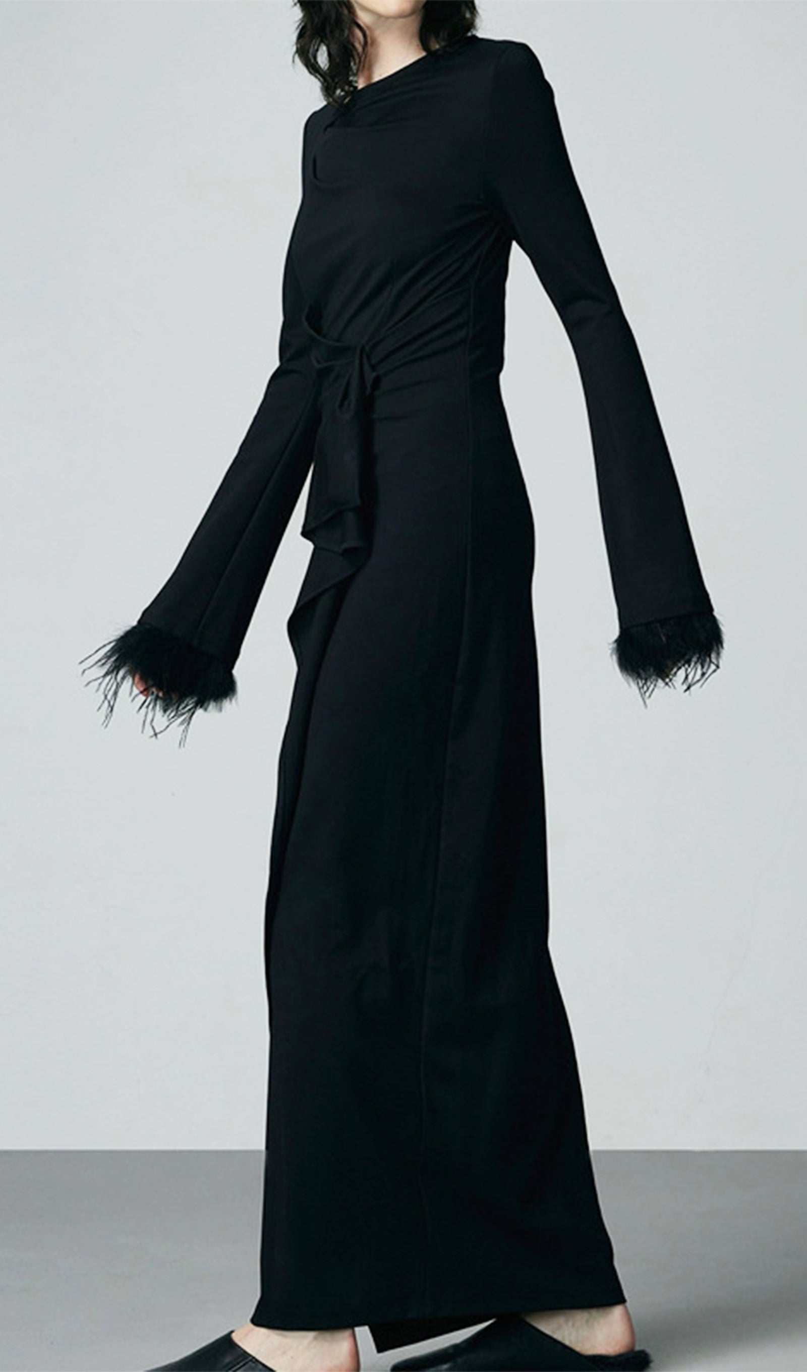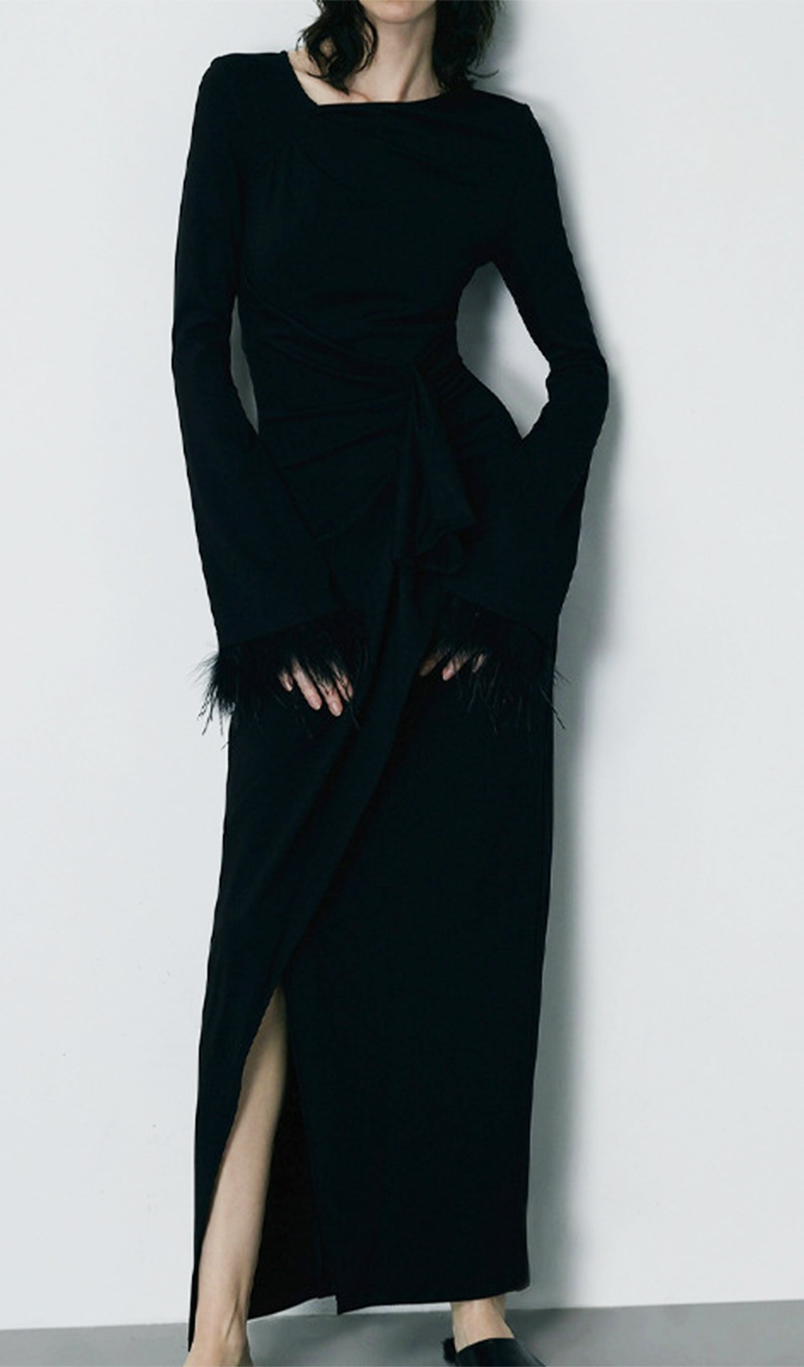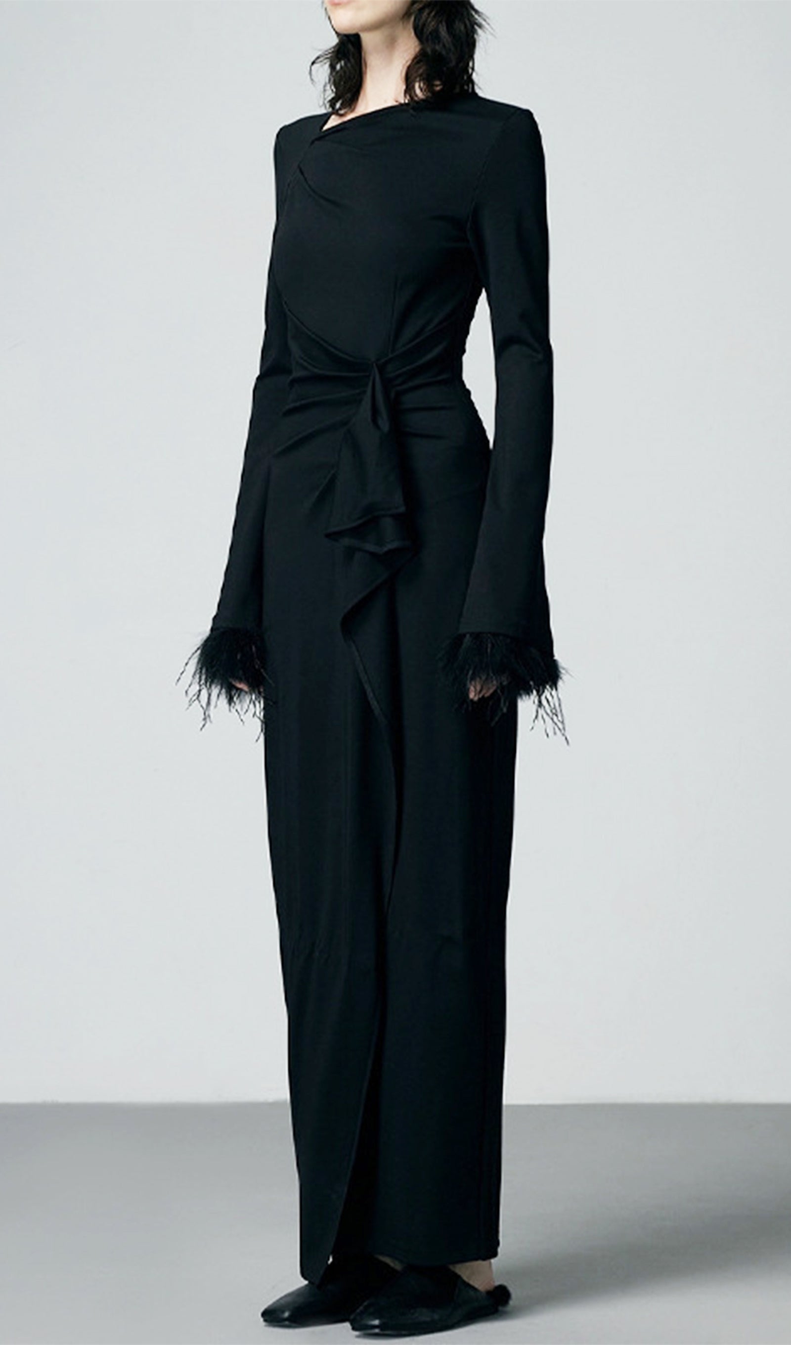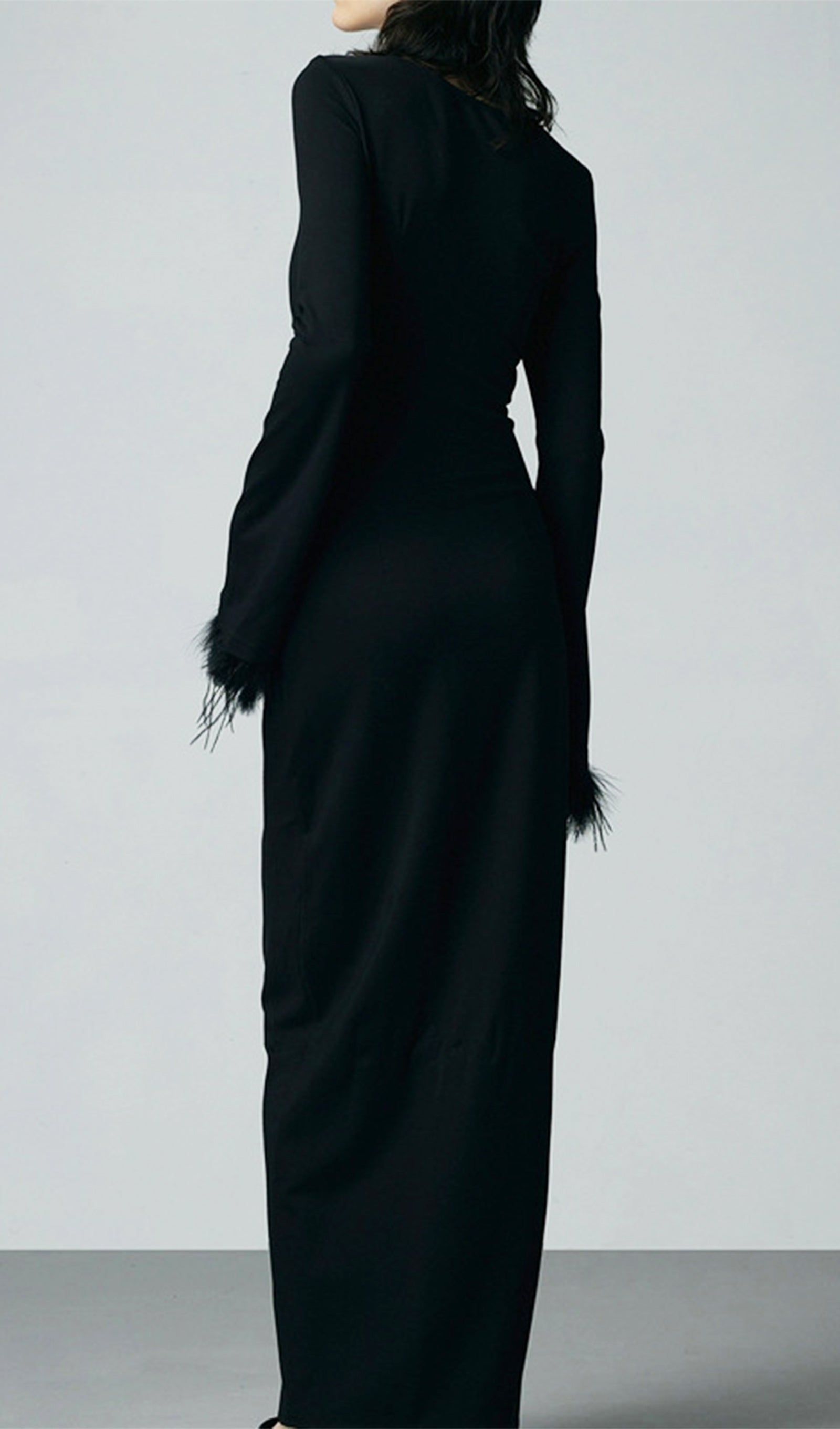 - Bu, tek kelime etmeden çok şey anlatan bir elbise. Narin tüylerle süslenmiş uzun kollara ve siluetinizi şekillendiren, her açıdan kendinize güvenmenizi sağlayan bodycon kesime sahiptir. Bel kısmındaki büzgü sadece görsel olarak çekici bir kum saati şekli yaratmakla kalmaz, aynı zamanda rahat ve gurur verici bir uyum sağlar. Güçlü omuzlar, bu zarif takıma bir parça güç ve cesaret katarak sofistike bir görünümden ödün vermeden cesur bir ifade yaratır.