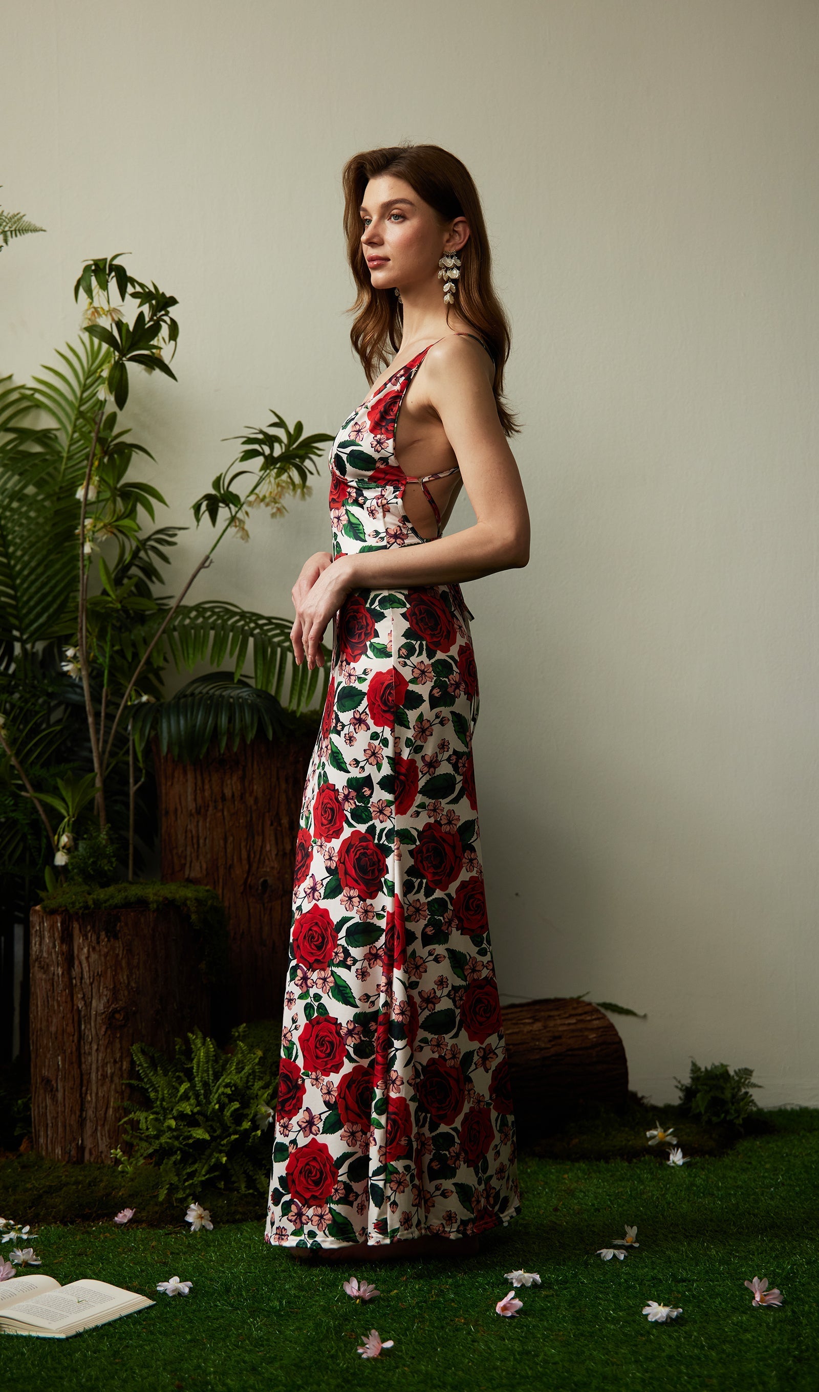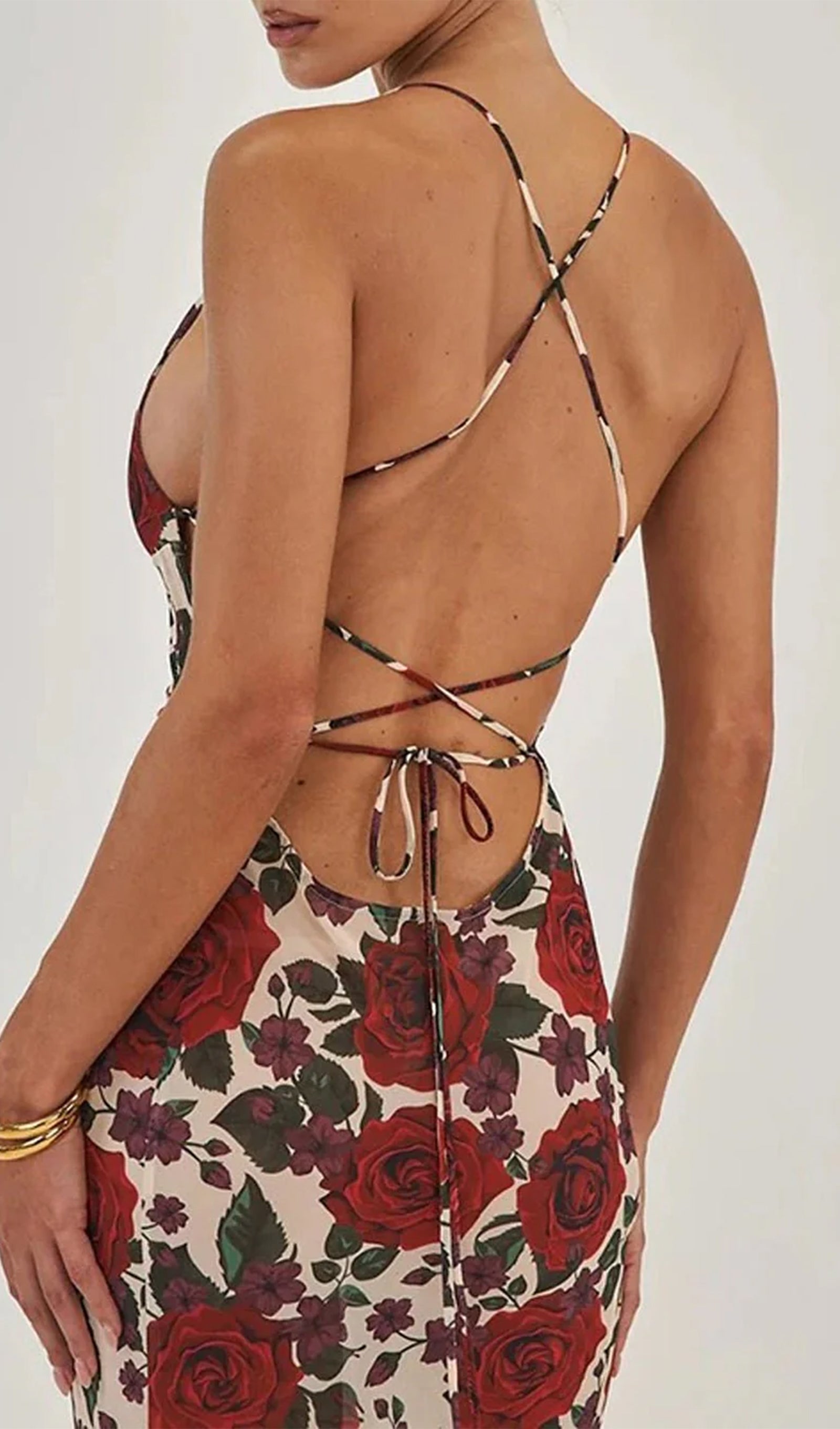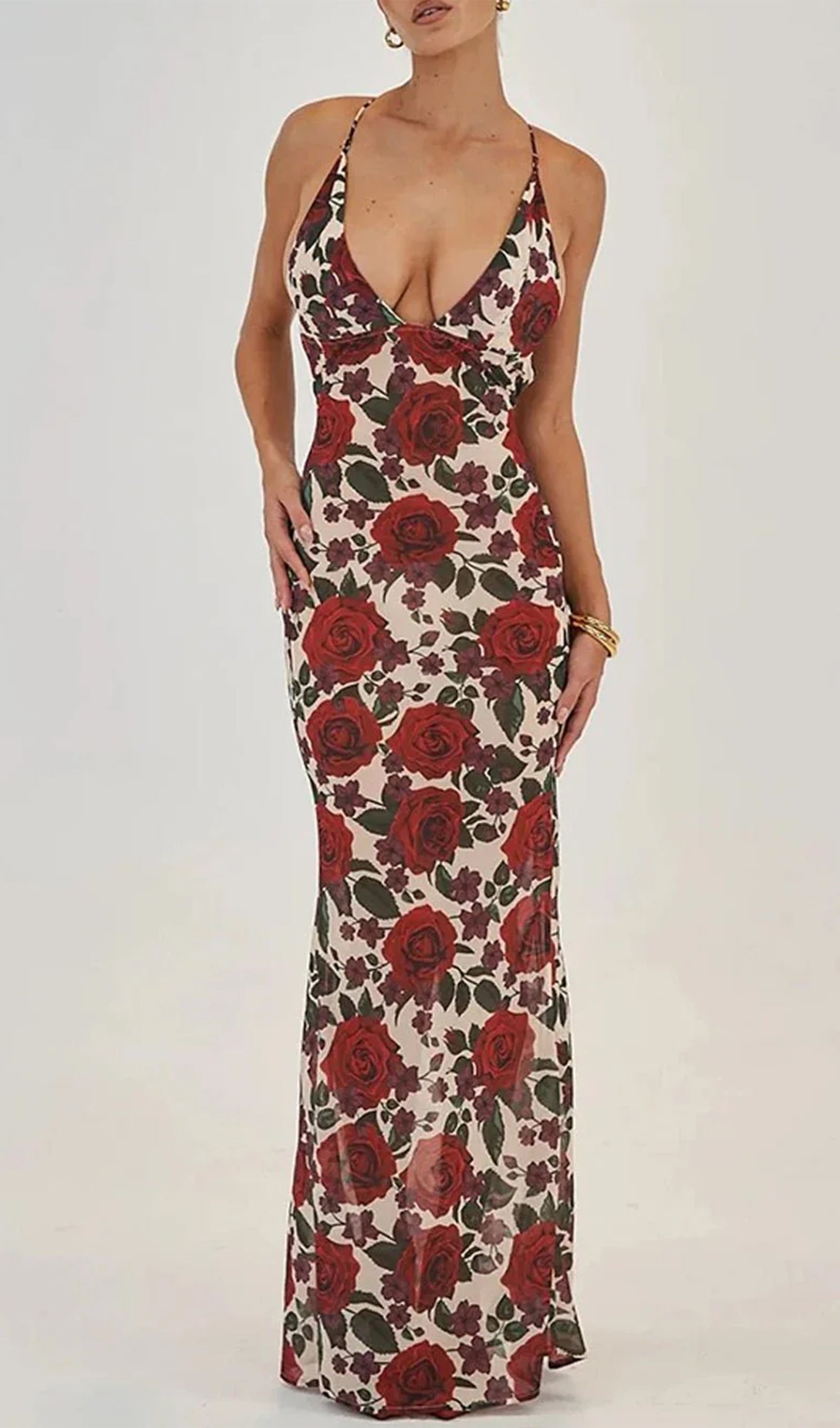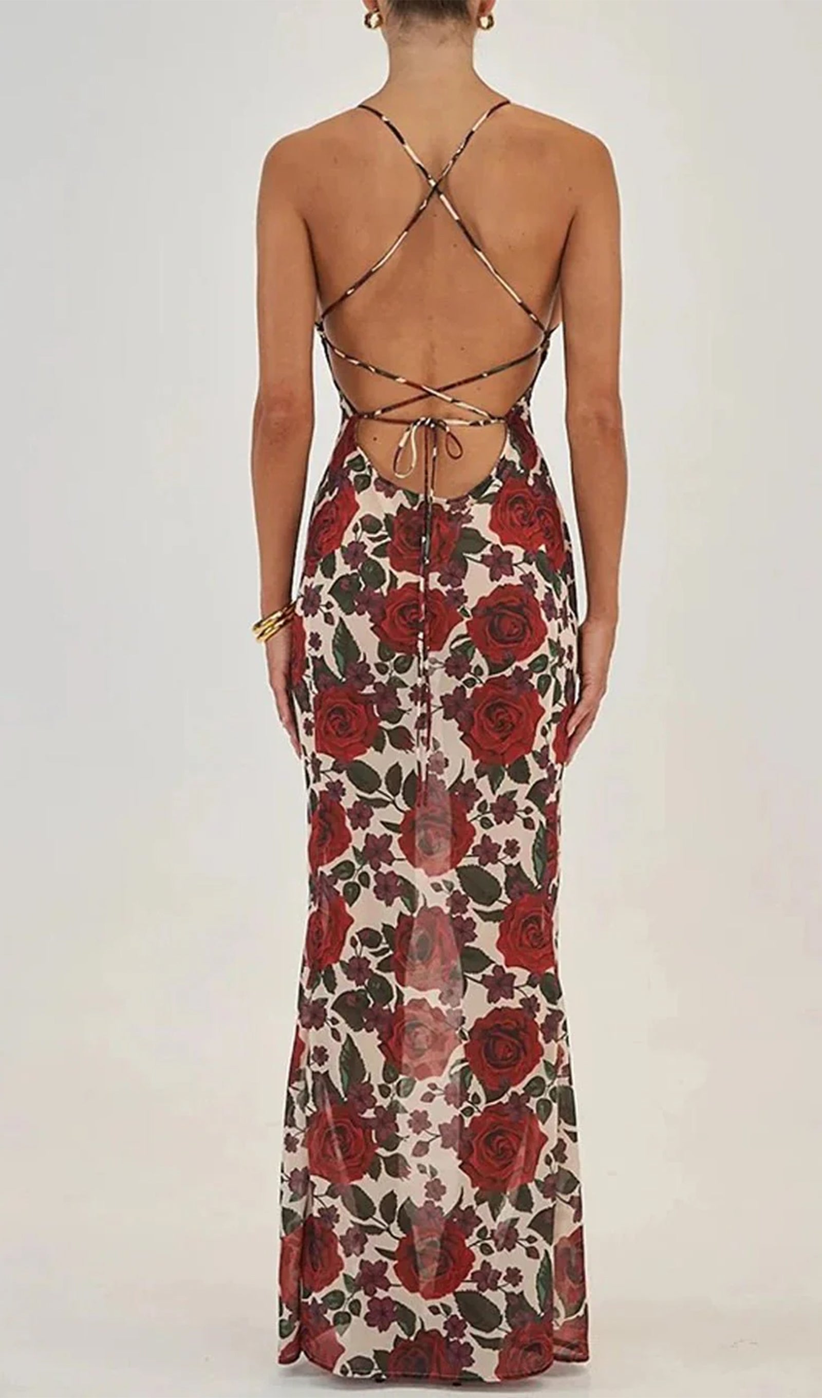 Kırmızı Çiçekli Sırtı Açık Maksi Elbise