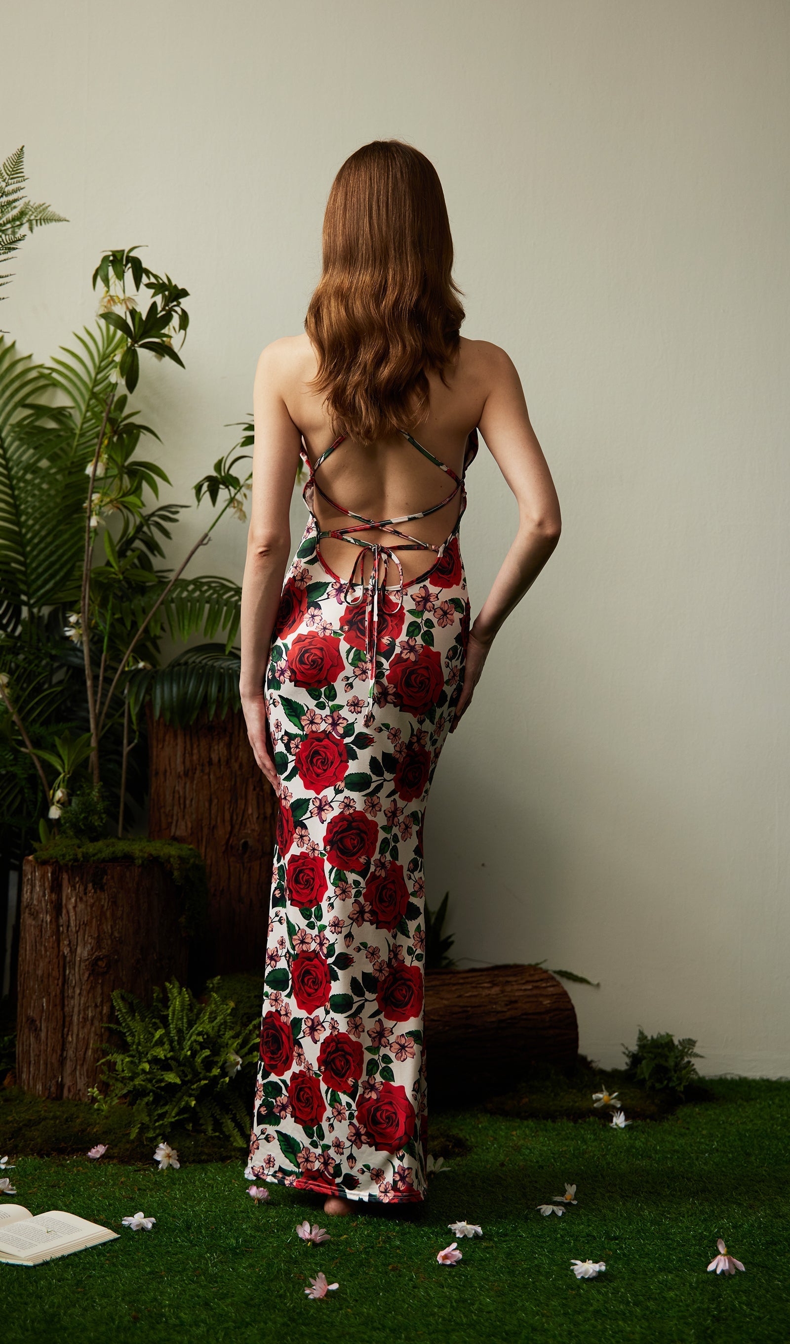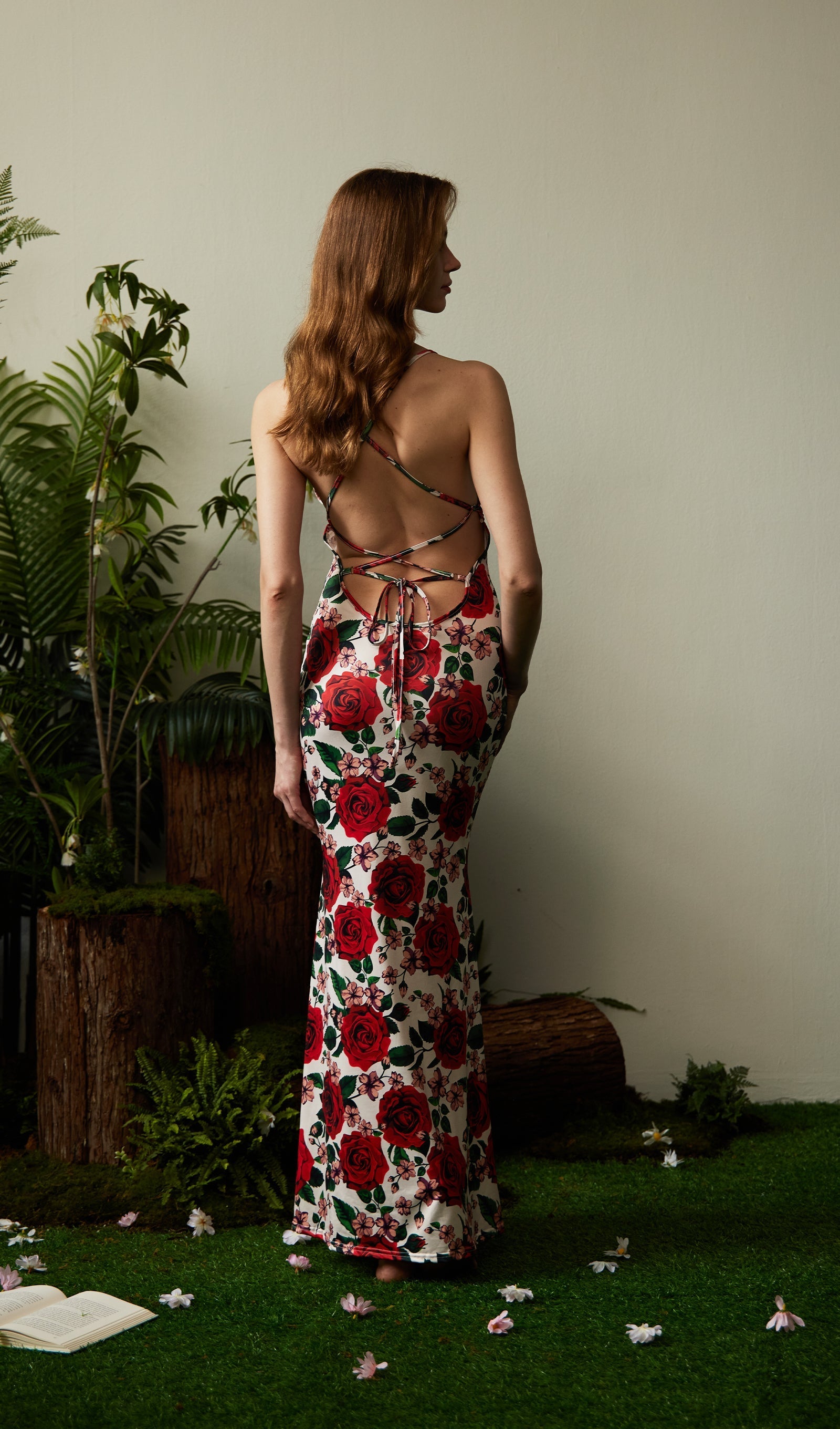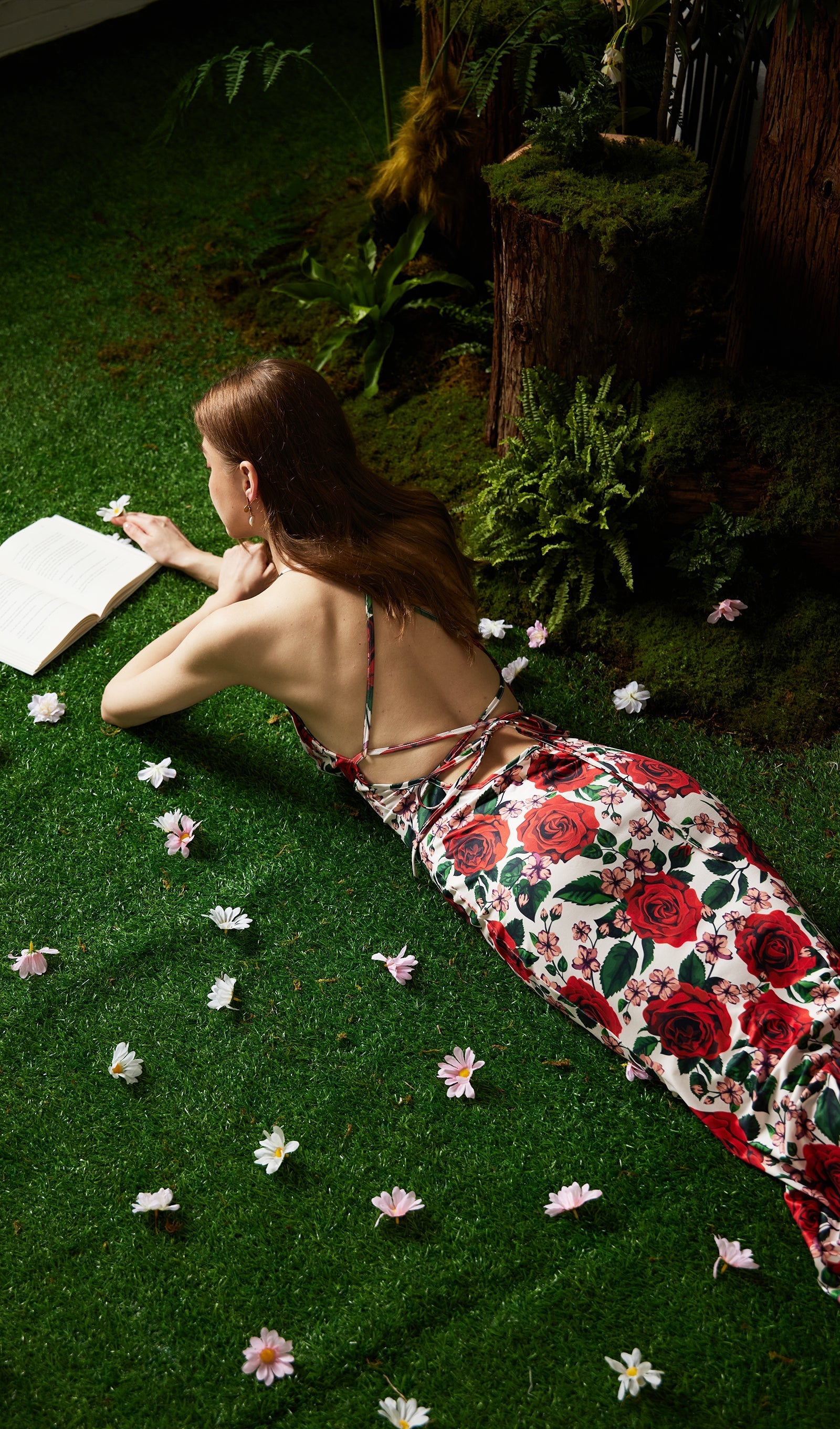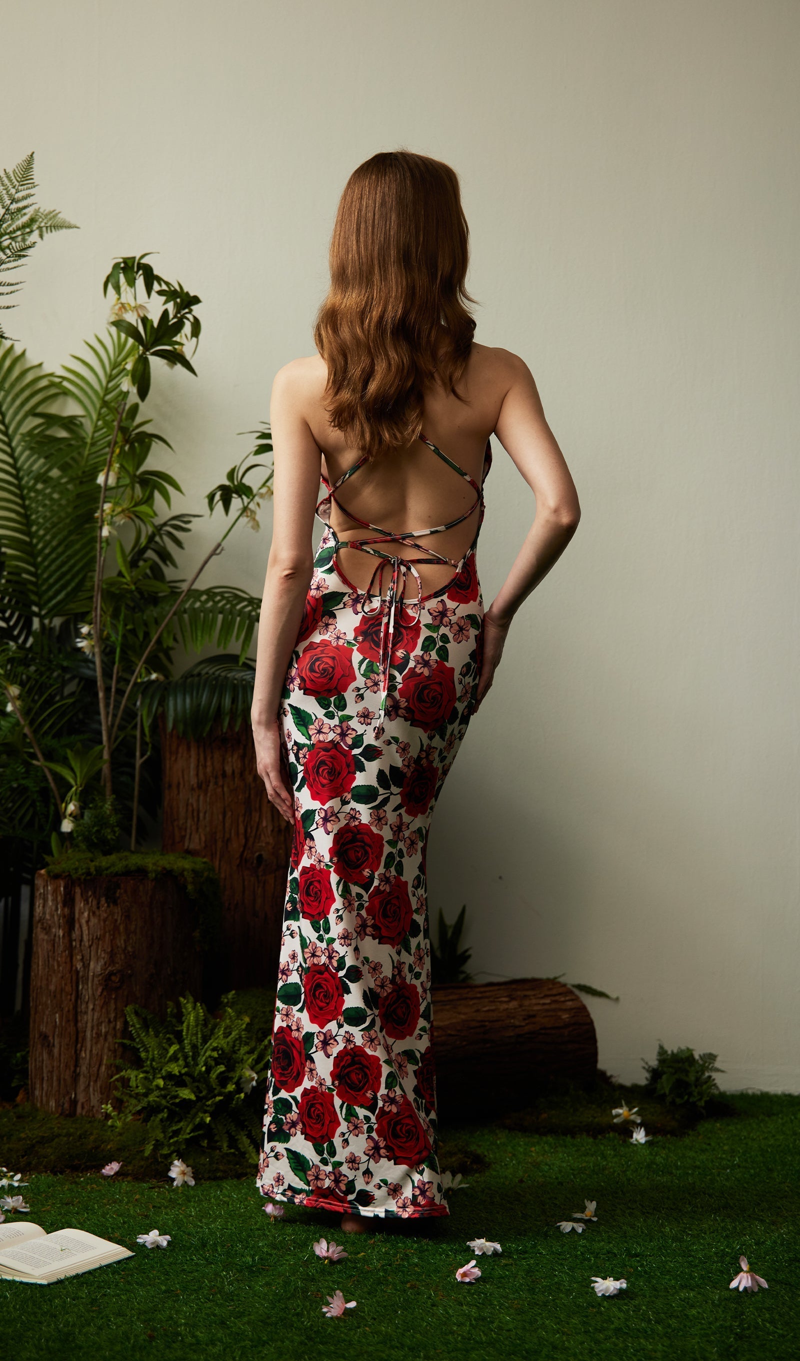 Kırmızı Çiçekli Sırtı Açık Maksi Elbise