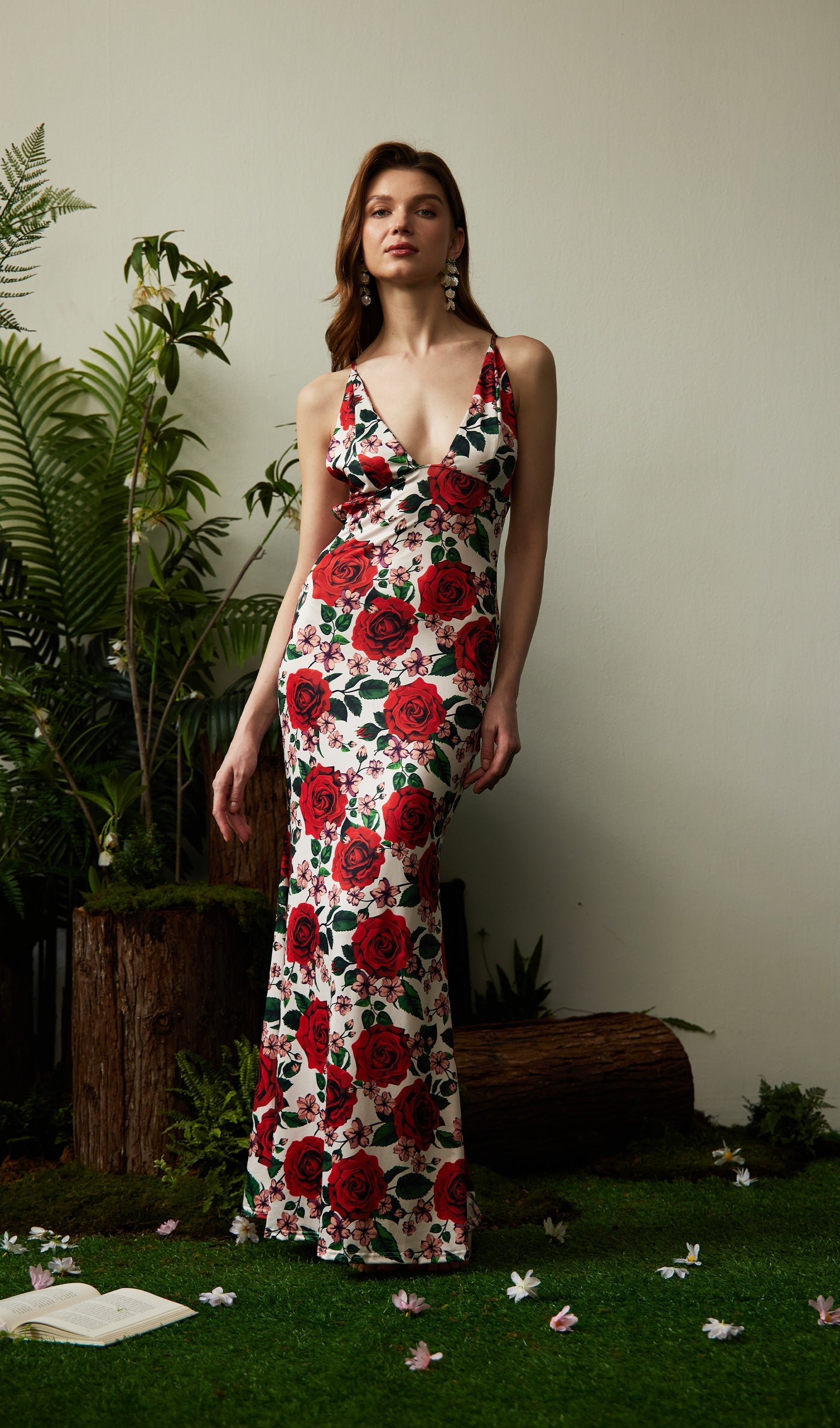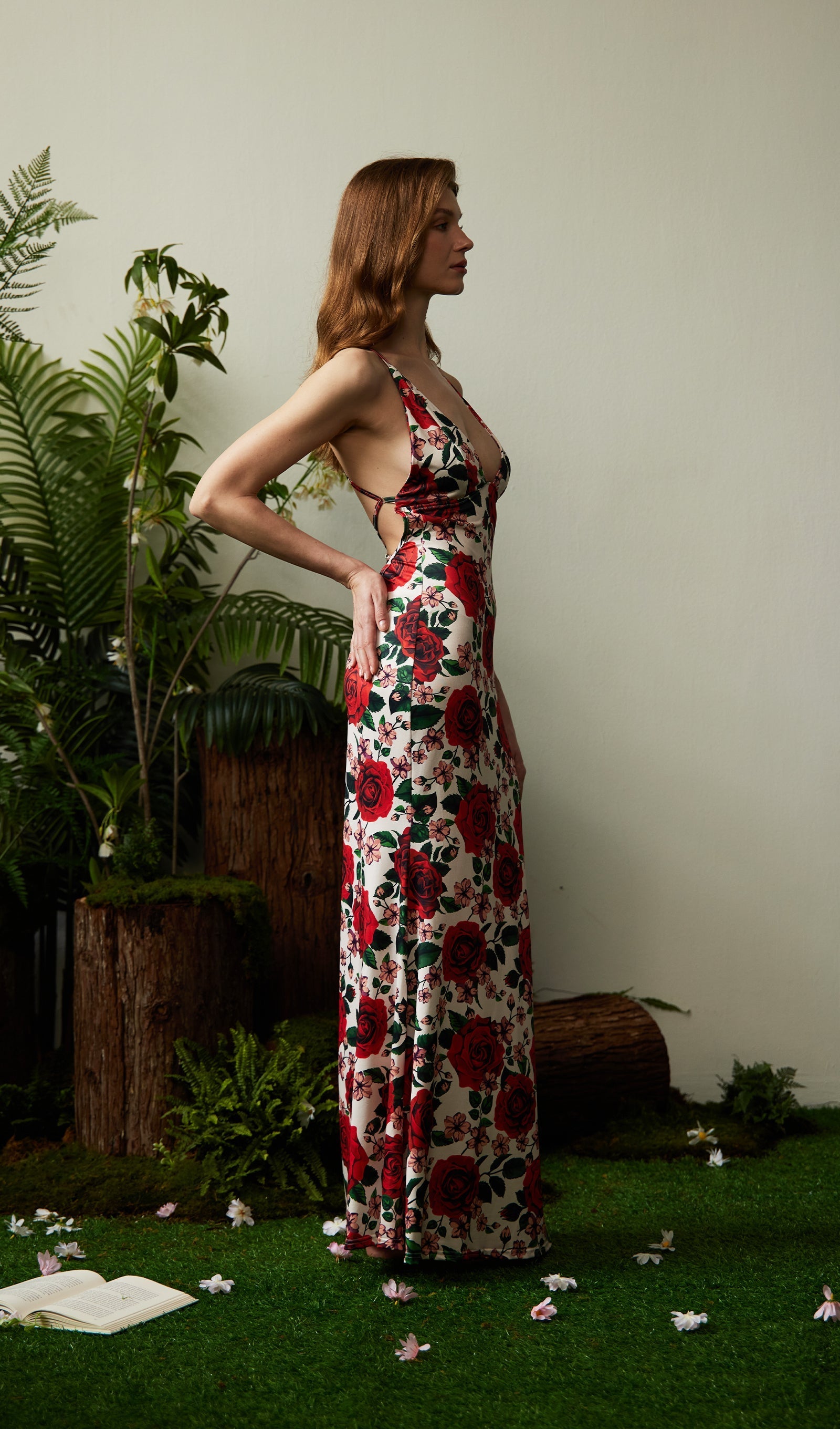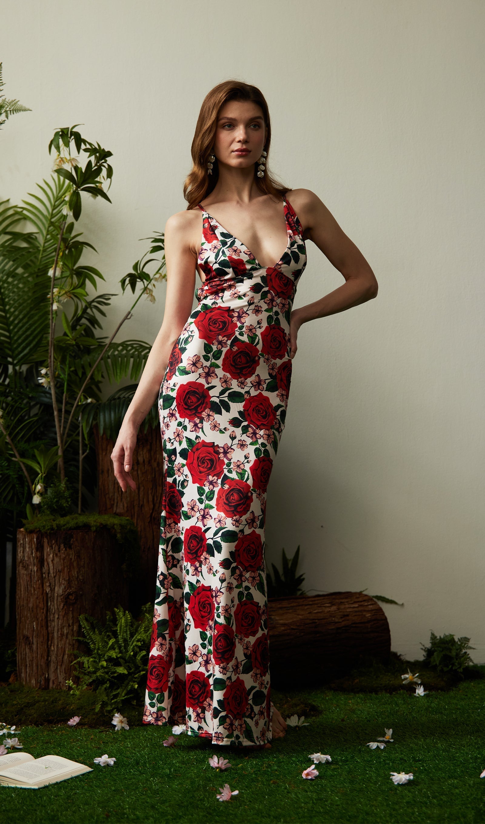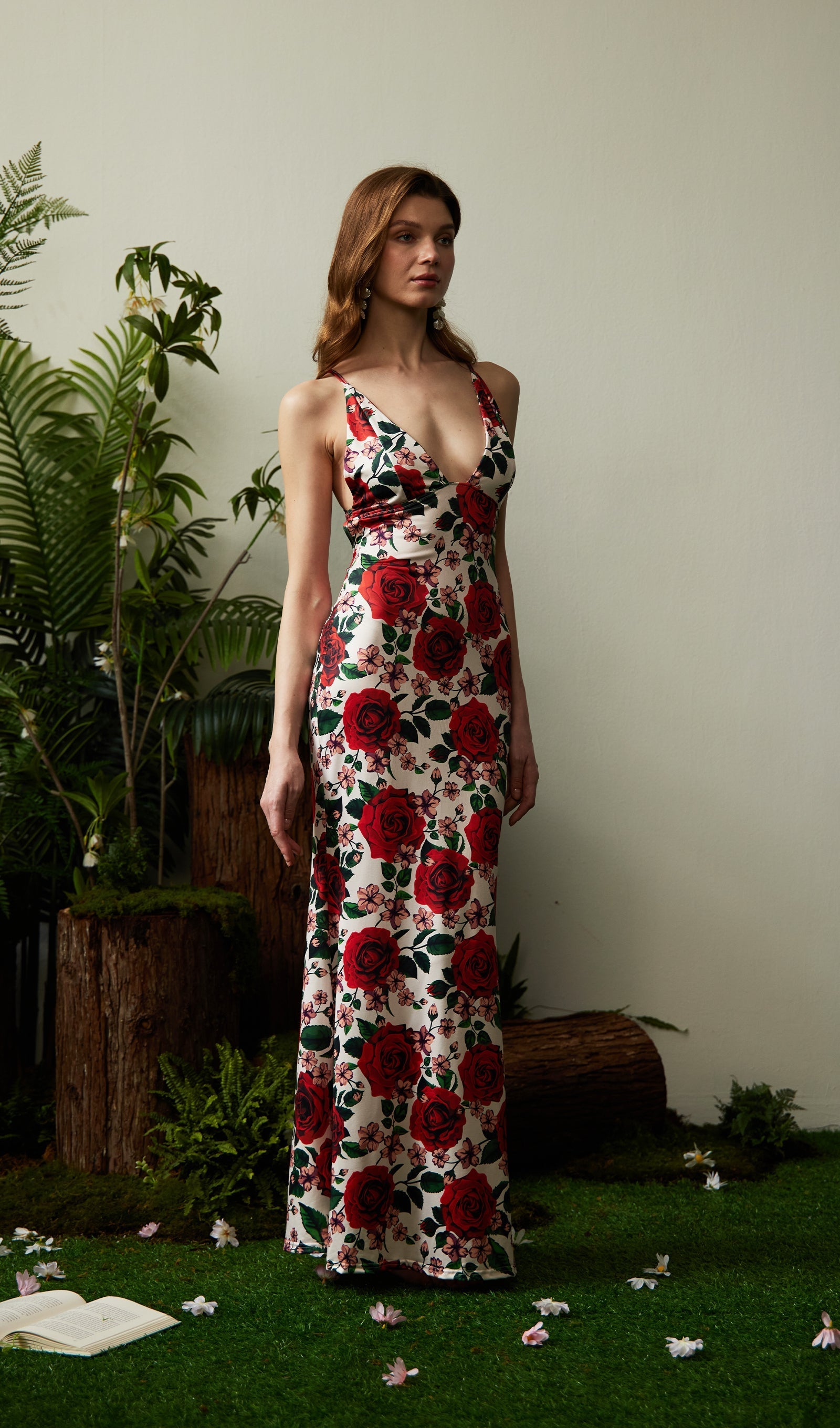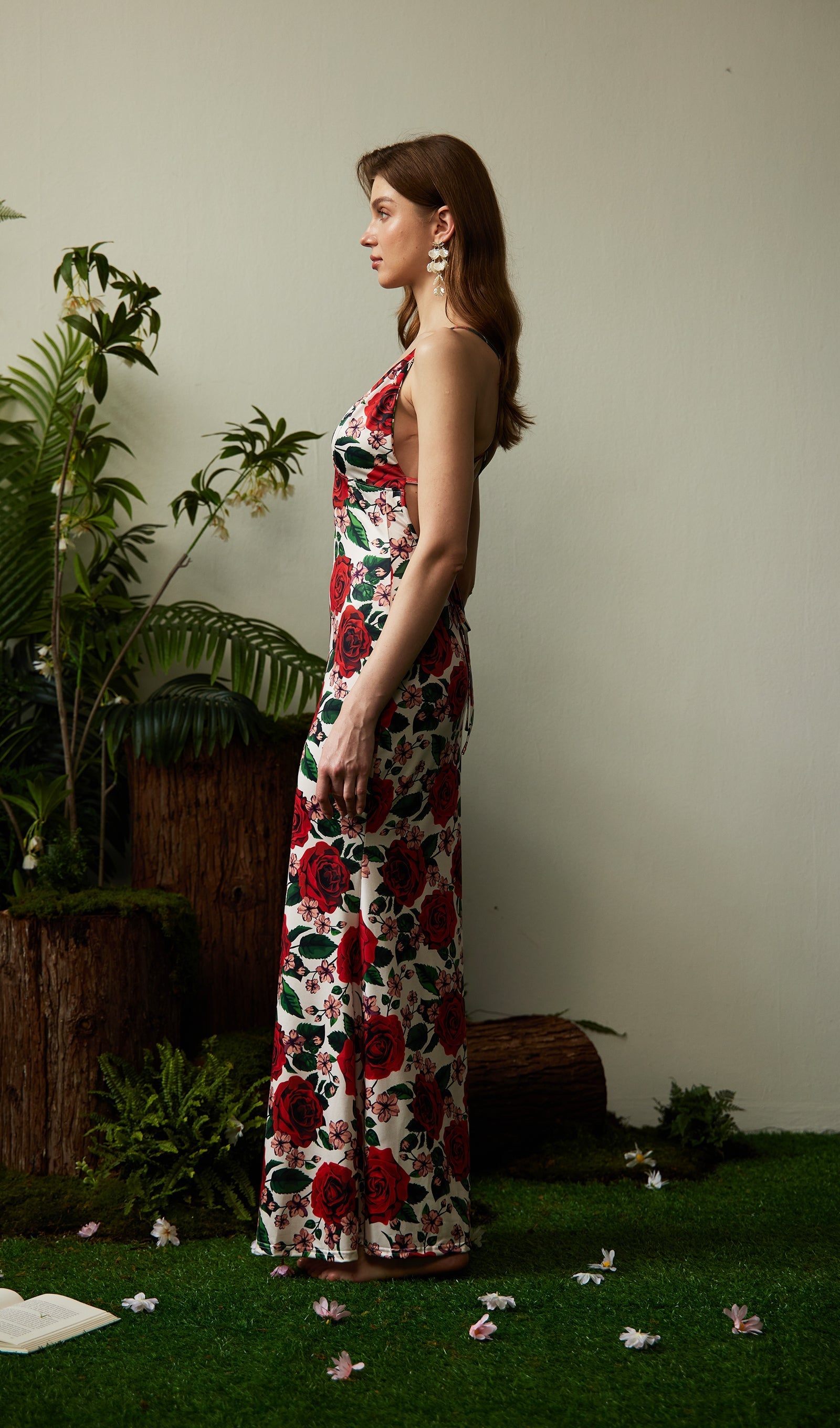 Kırmızı Çiçekli Sırtı Açık Maksi Elbise