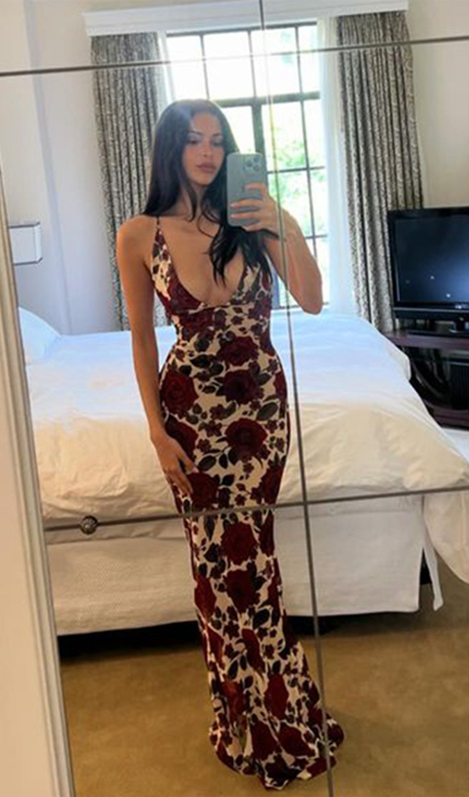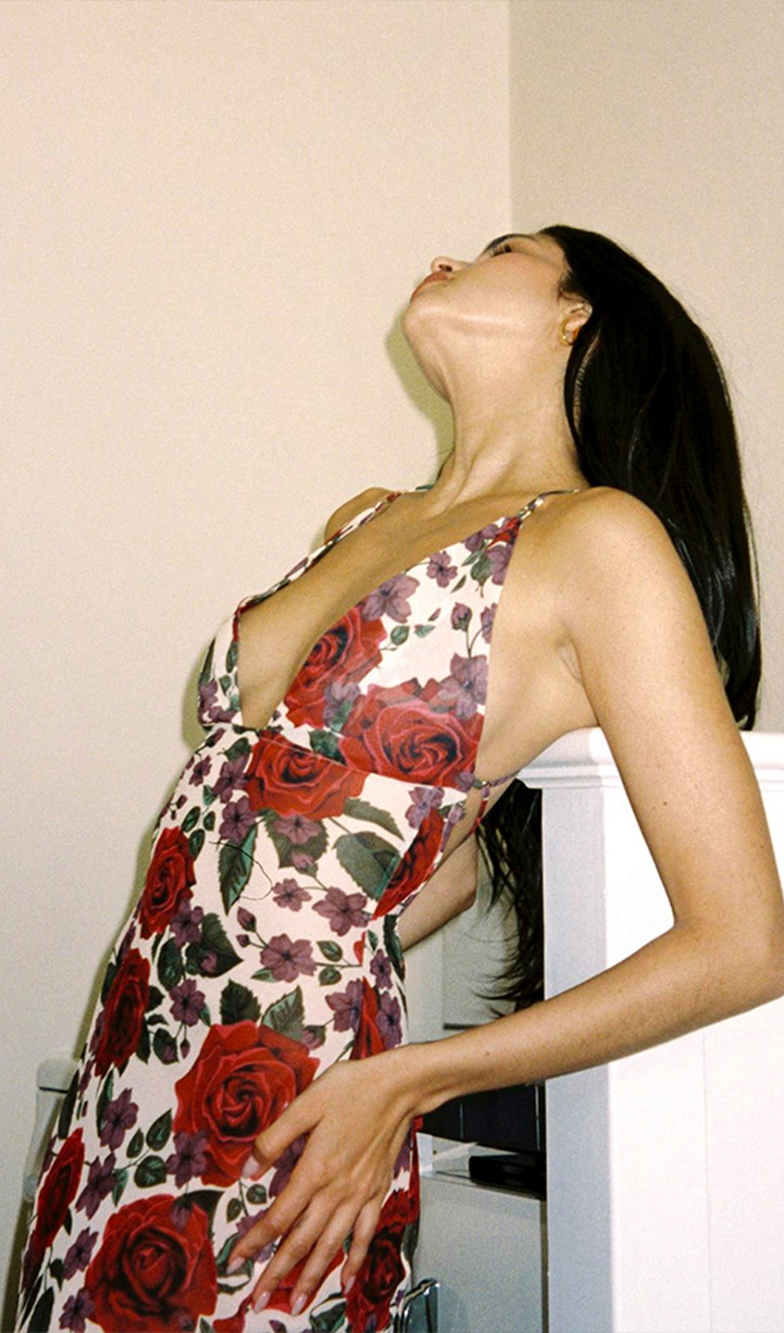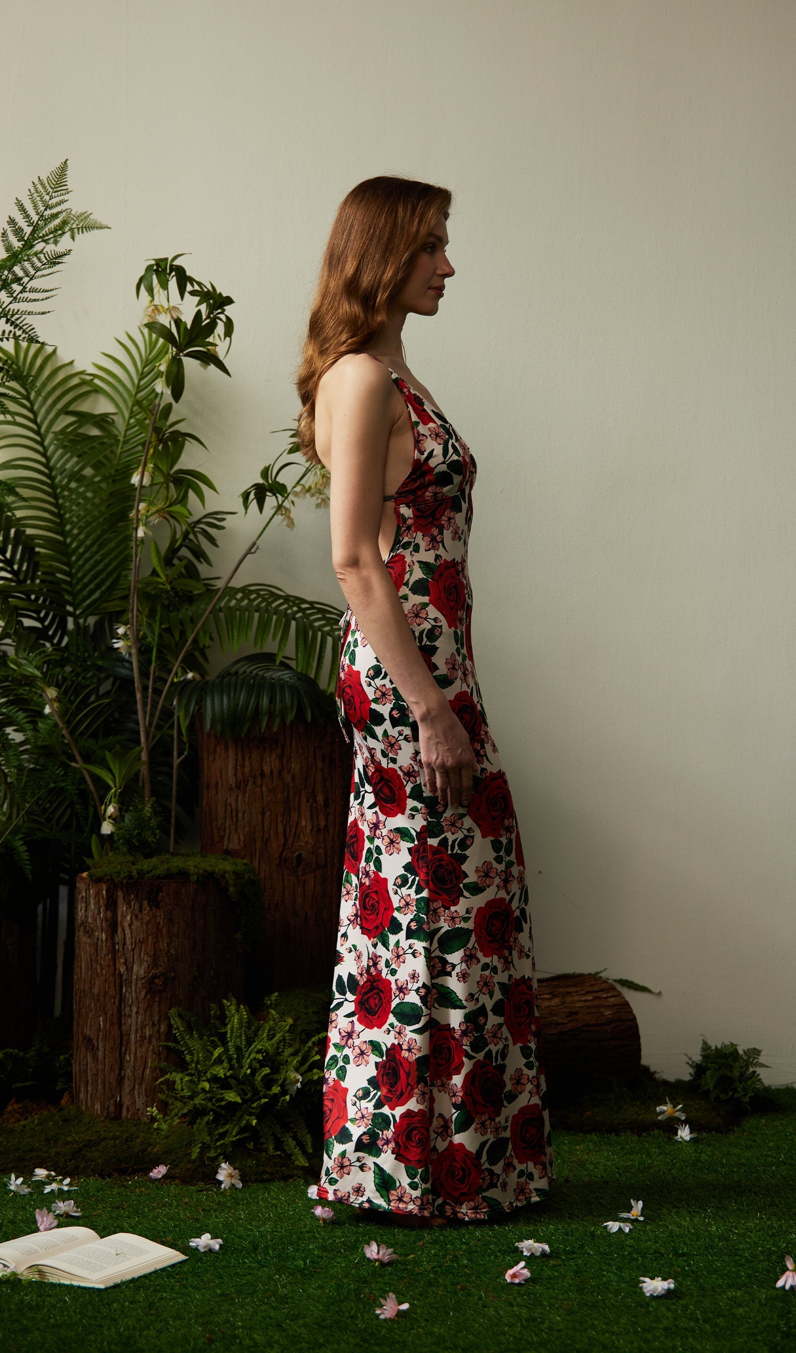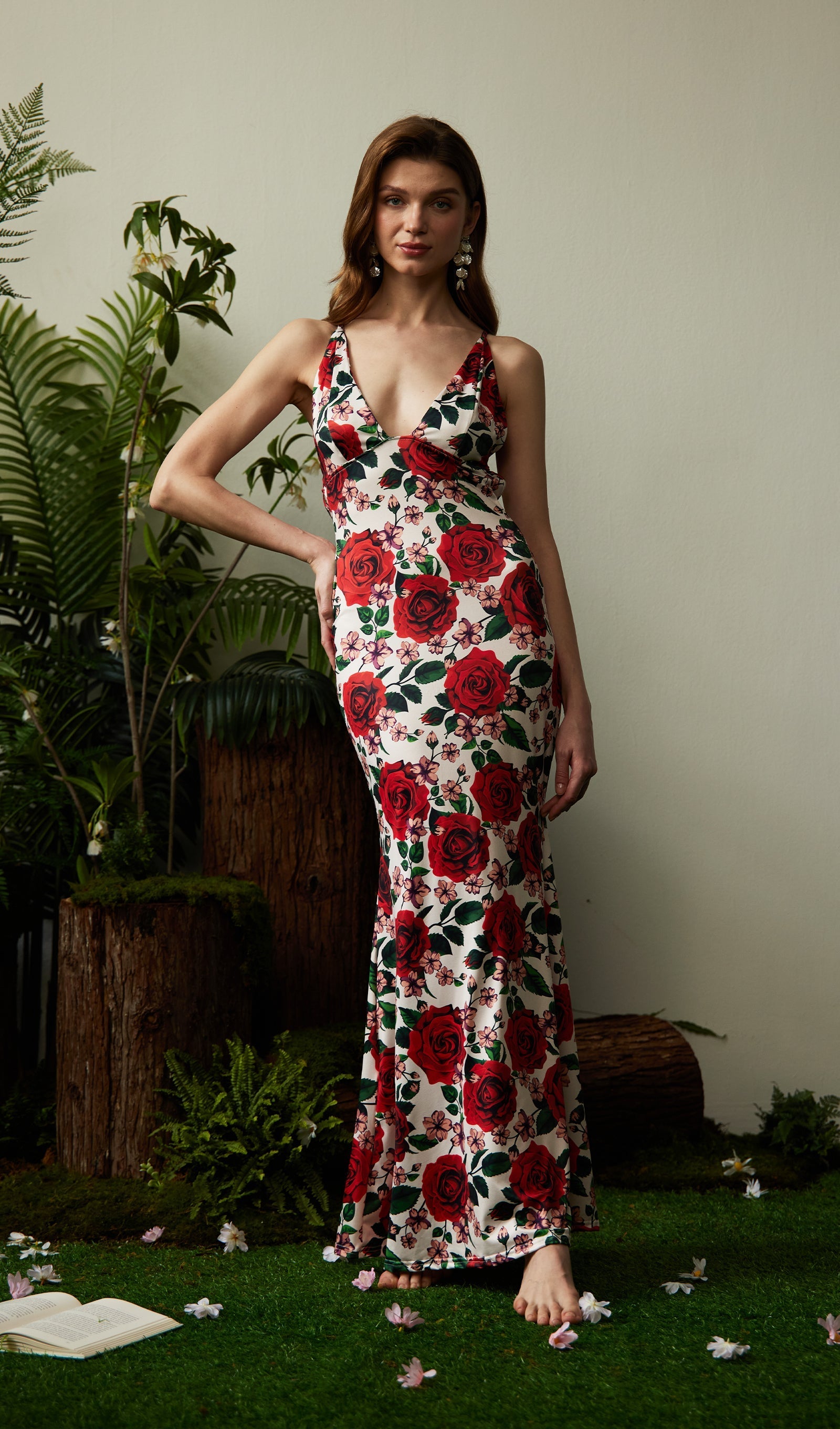 Kırmızı Çiçekli Sırtı Açık Maksi Elbise