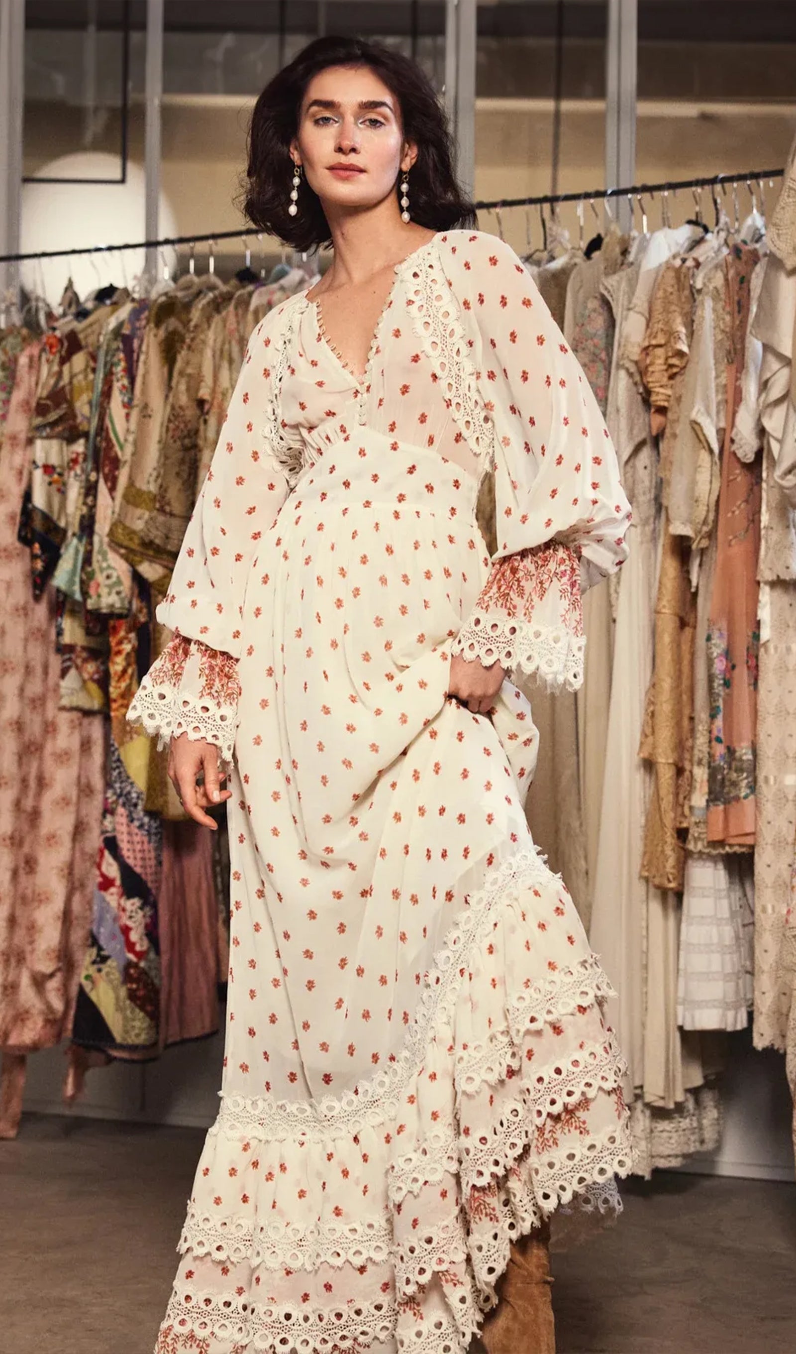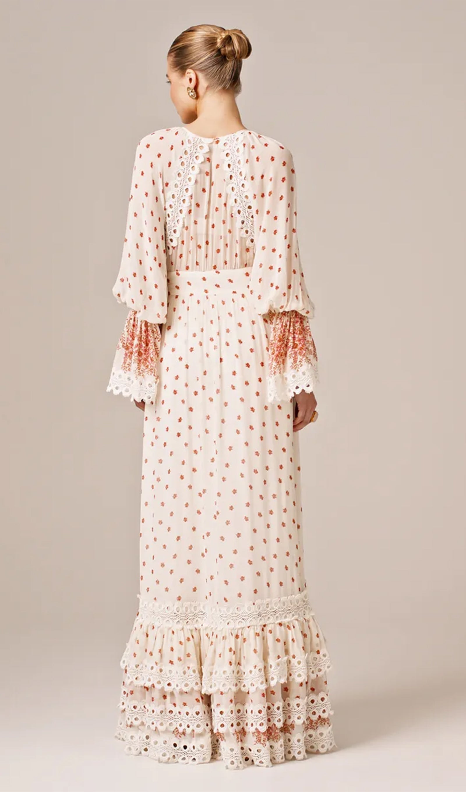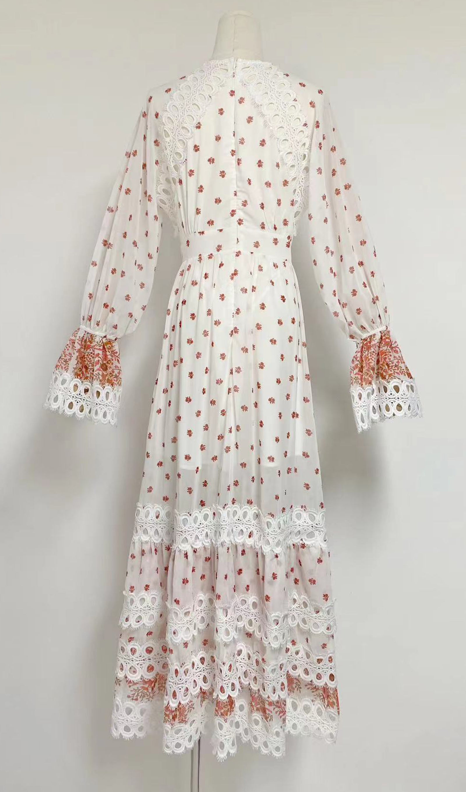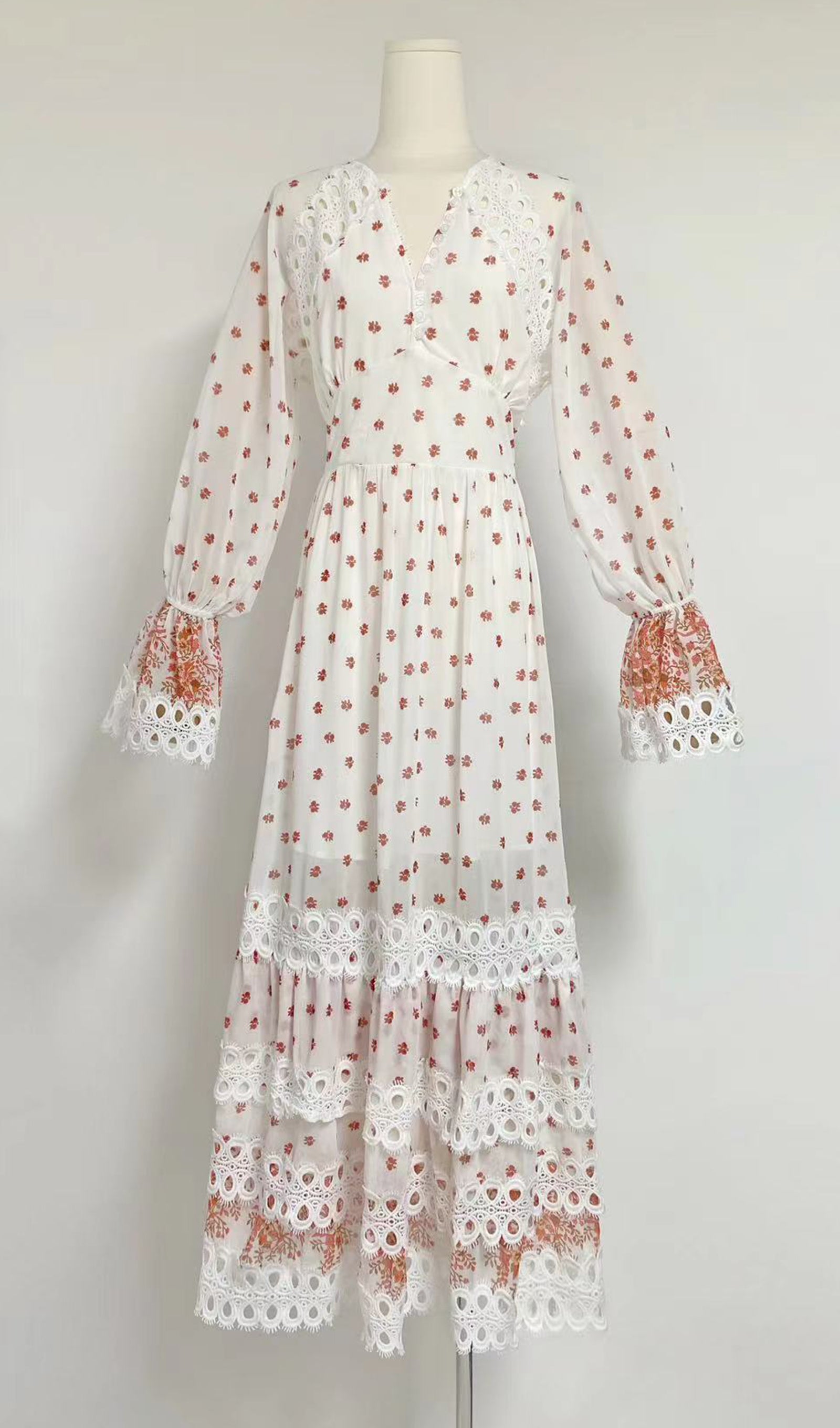 Çiçekli Uzun Kollu V Yaka A Line Maxi Elbise