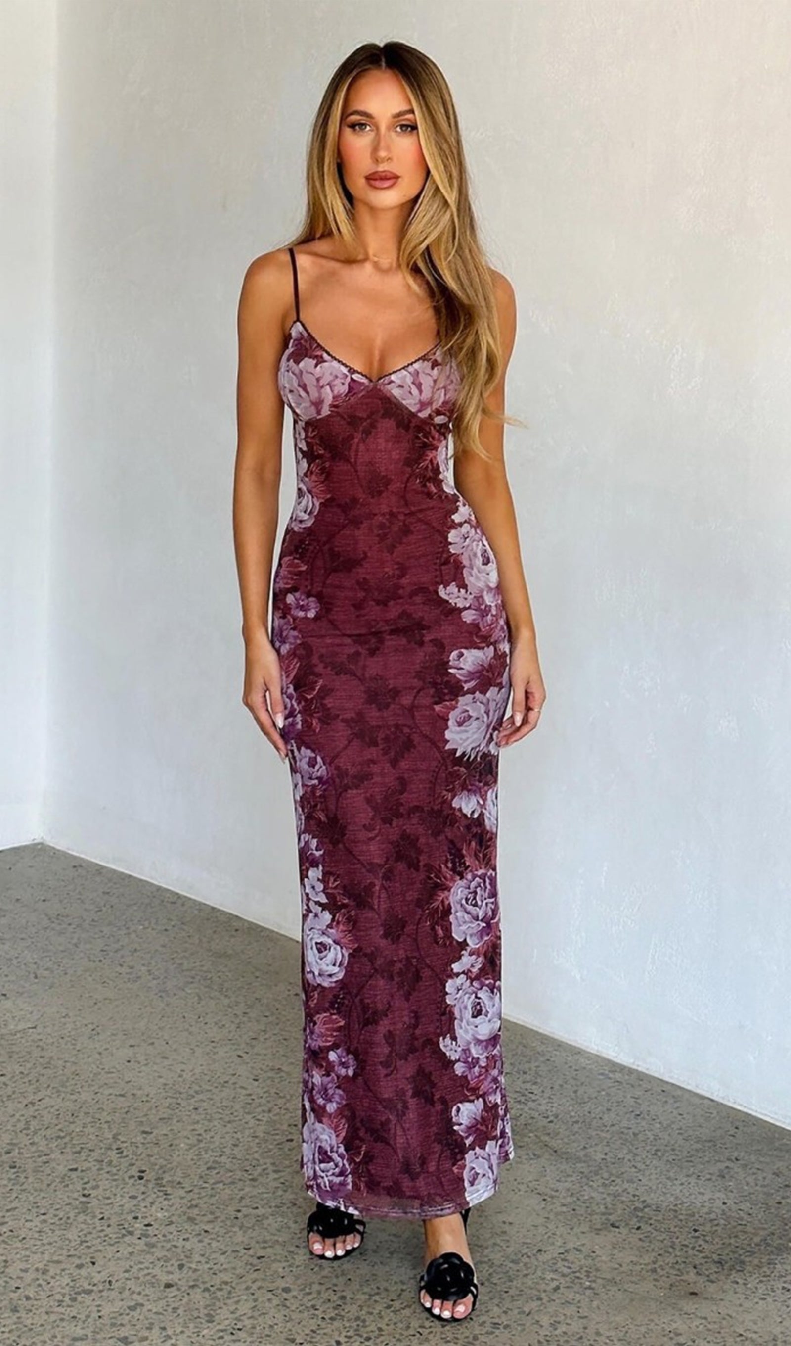 Çiçekli Gül Çizgili Maksi Elbise