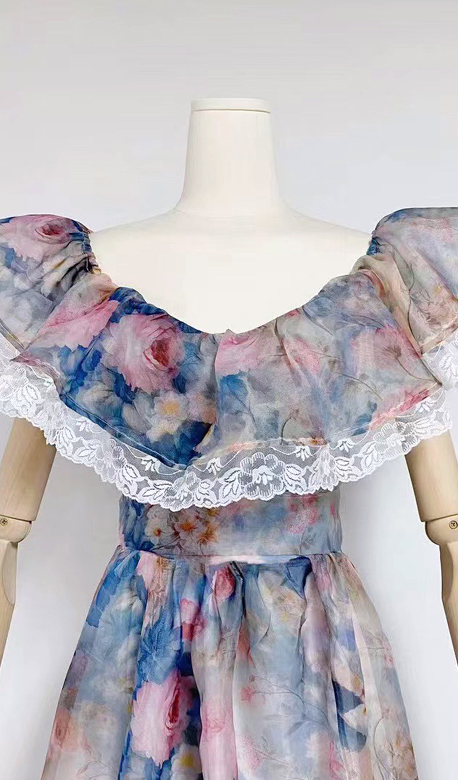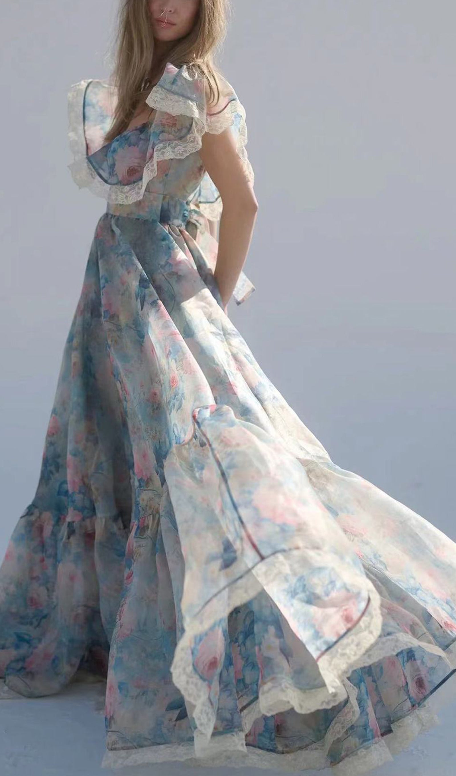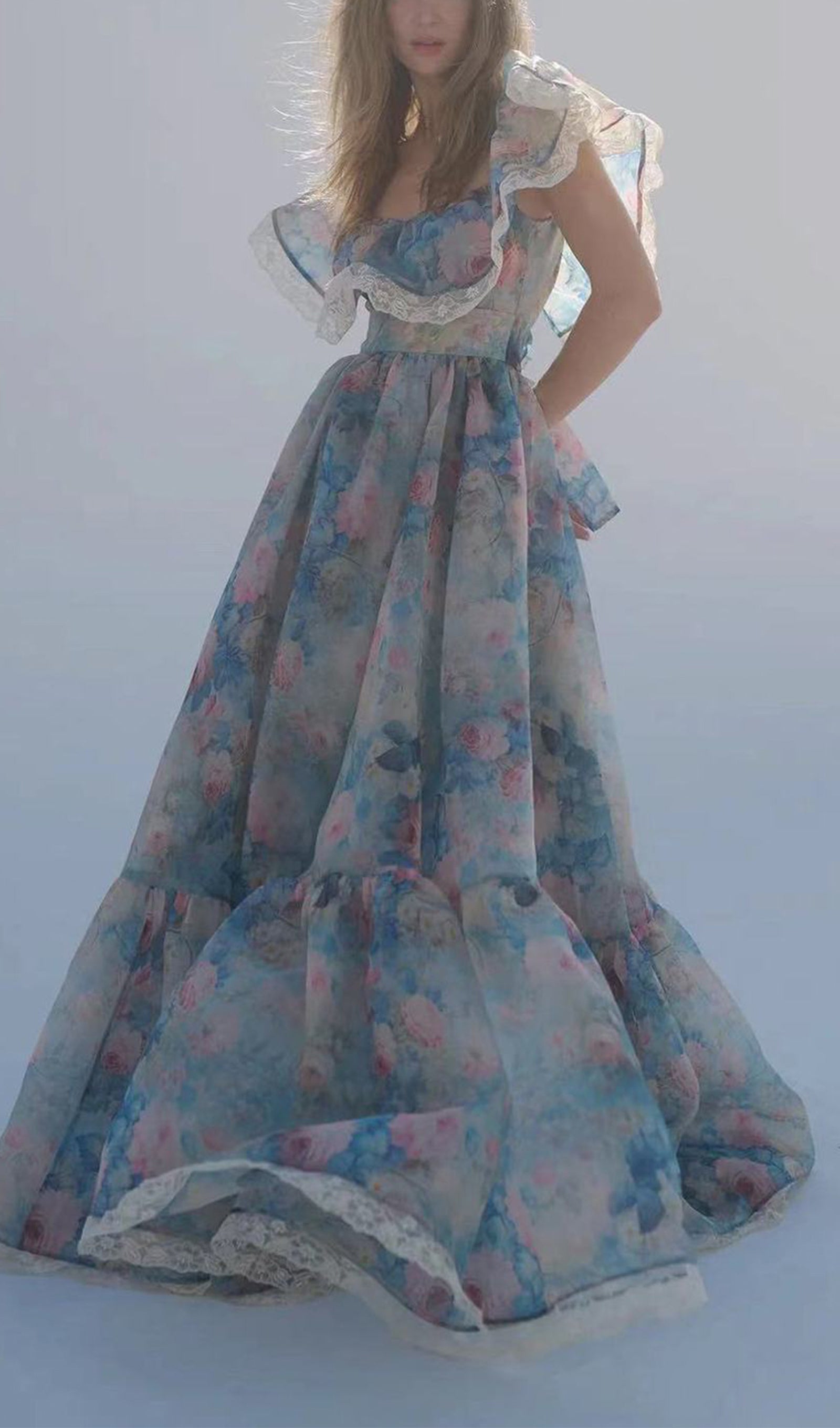 Çiçekli Fırfırlı V Yaka Fit ve Flare Maksi Elbise