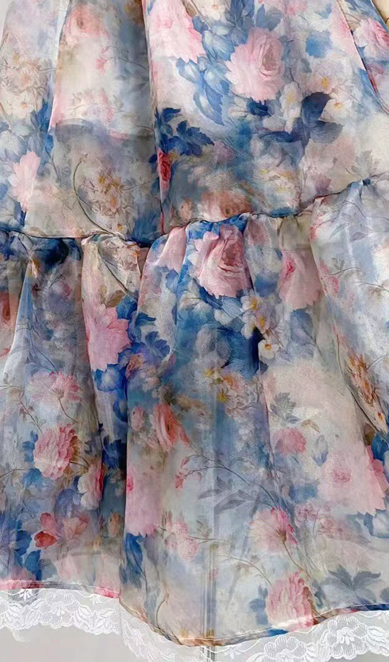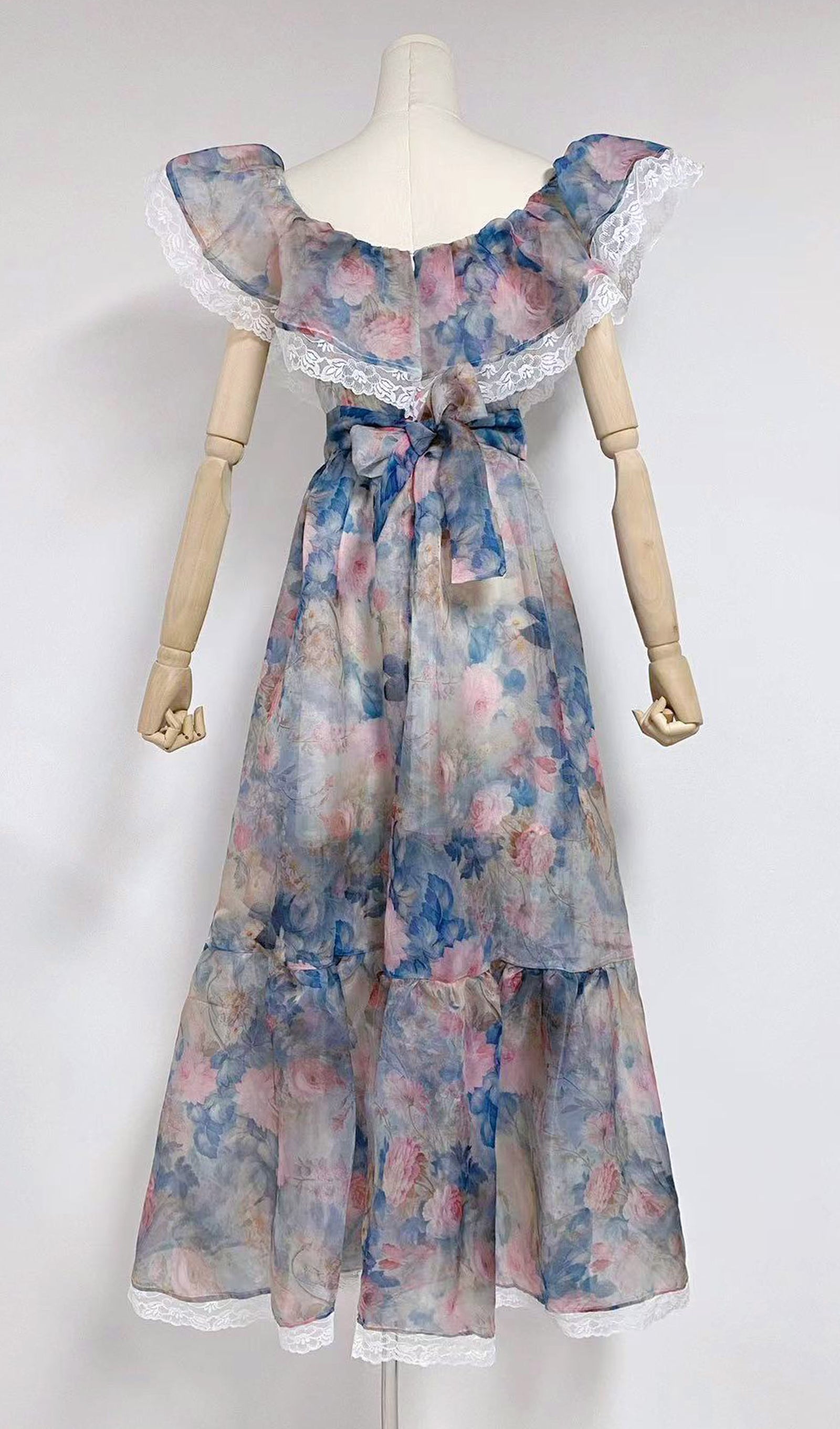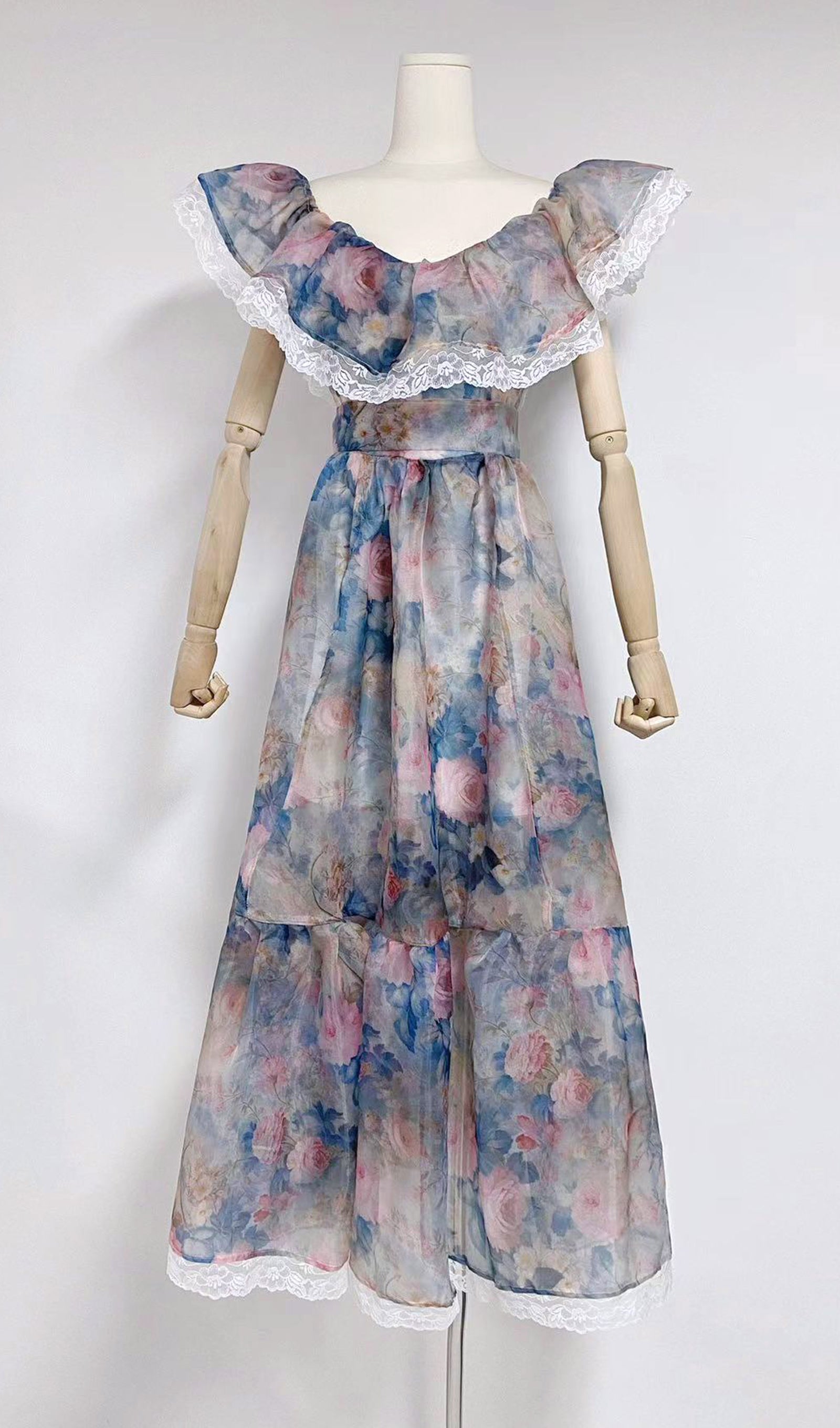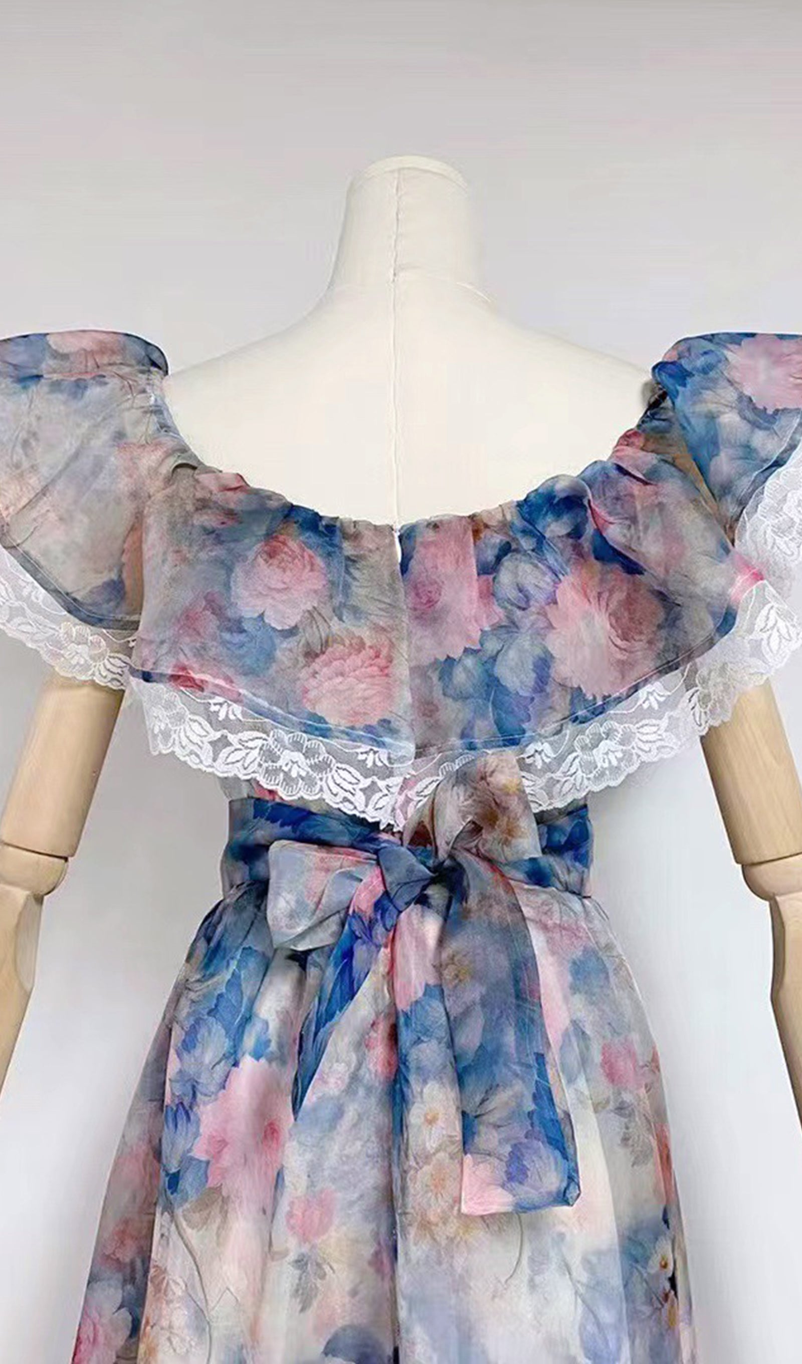 Çiçekli Fırfırlı V Yaka Fit ve Flare Maksi Elbise