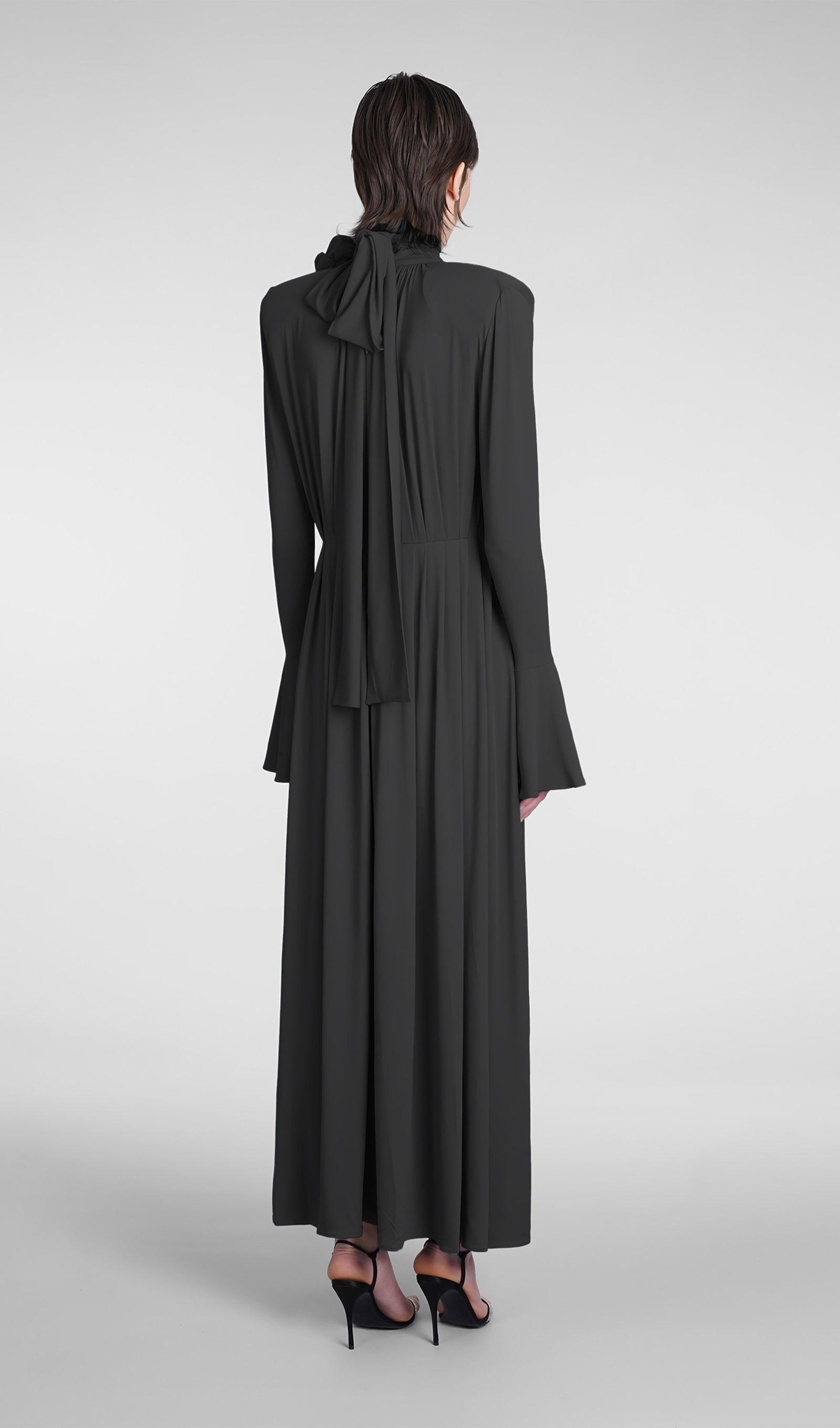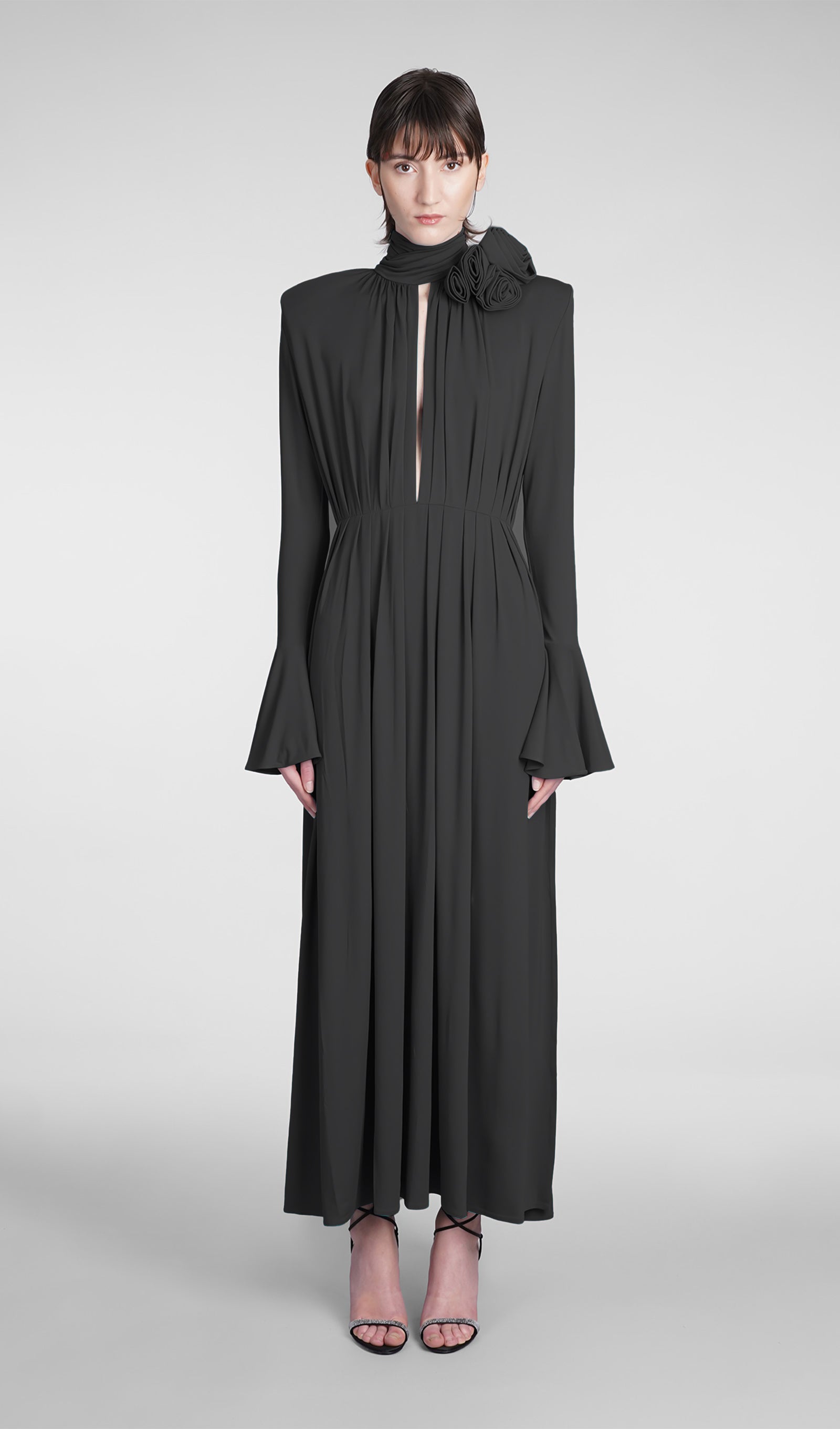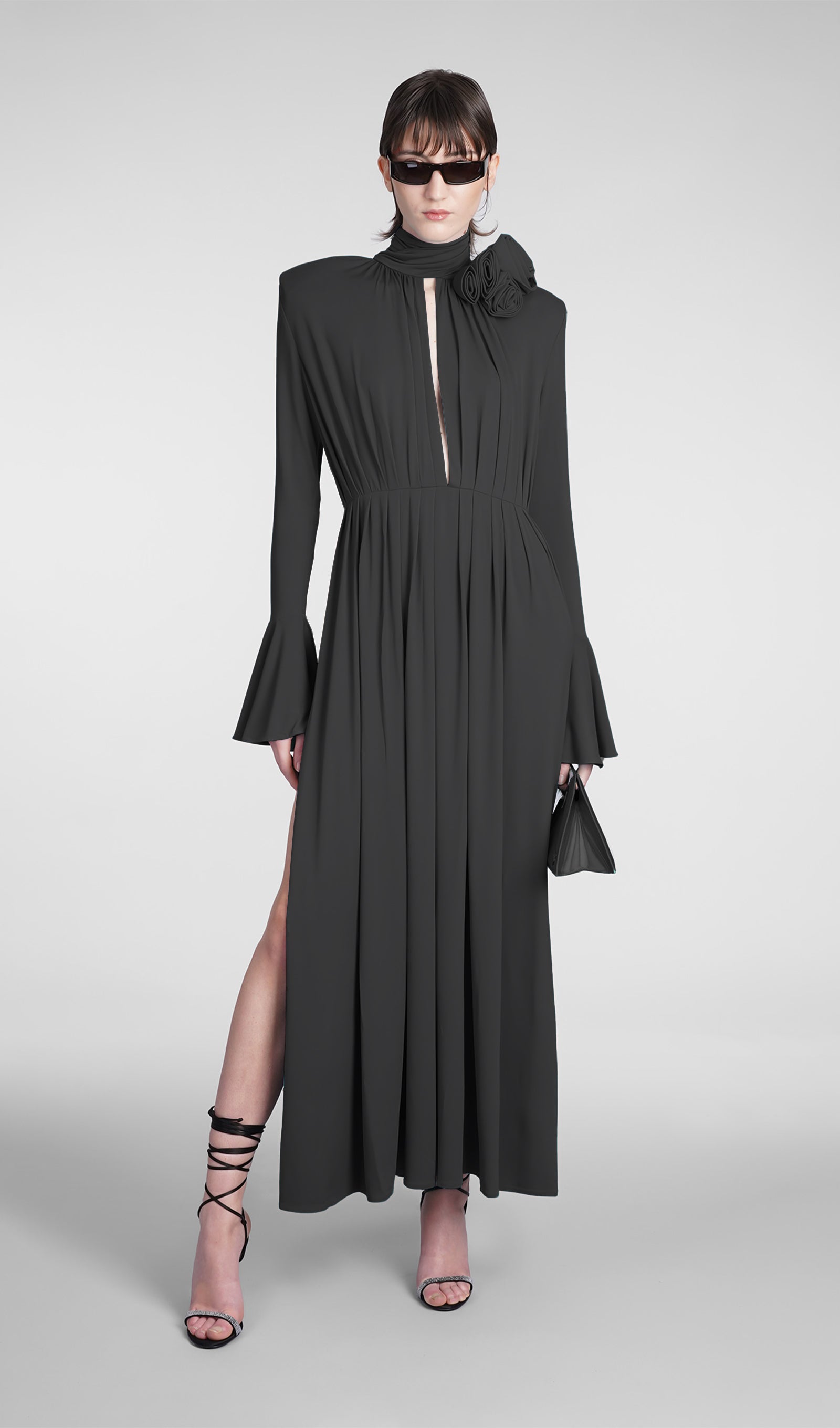 Çiçek V Yaka Pileli Yırtmaçlı Maksi Elbise-Siyah