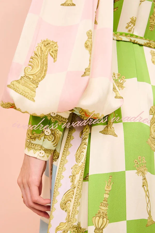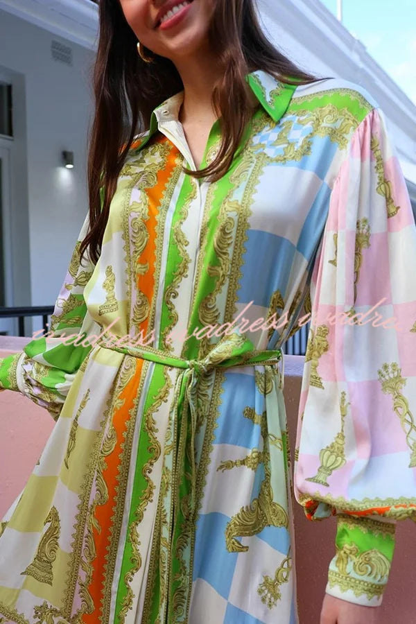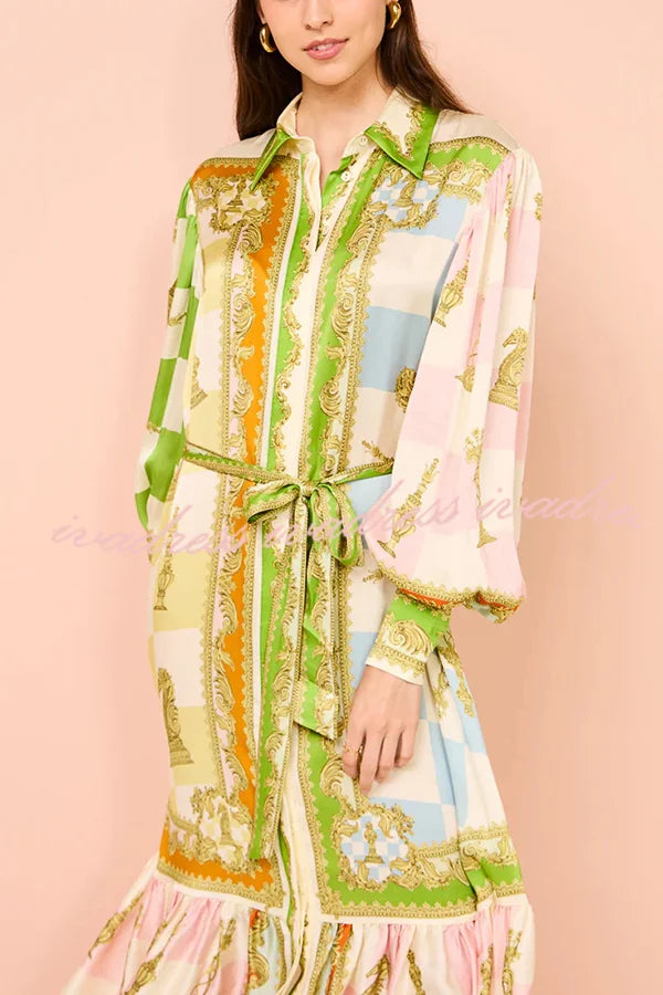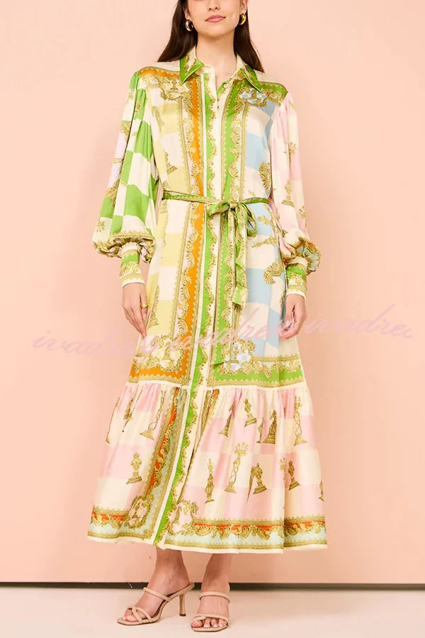 Bahçe Partisi Saten Balon Kollu Kuşaklı Gömlek Maksi Elbise