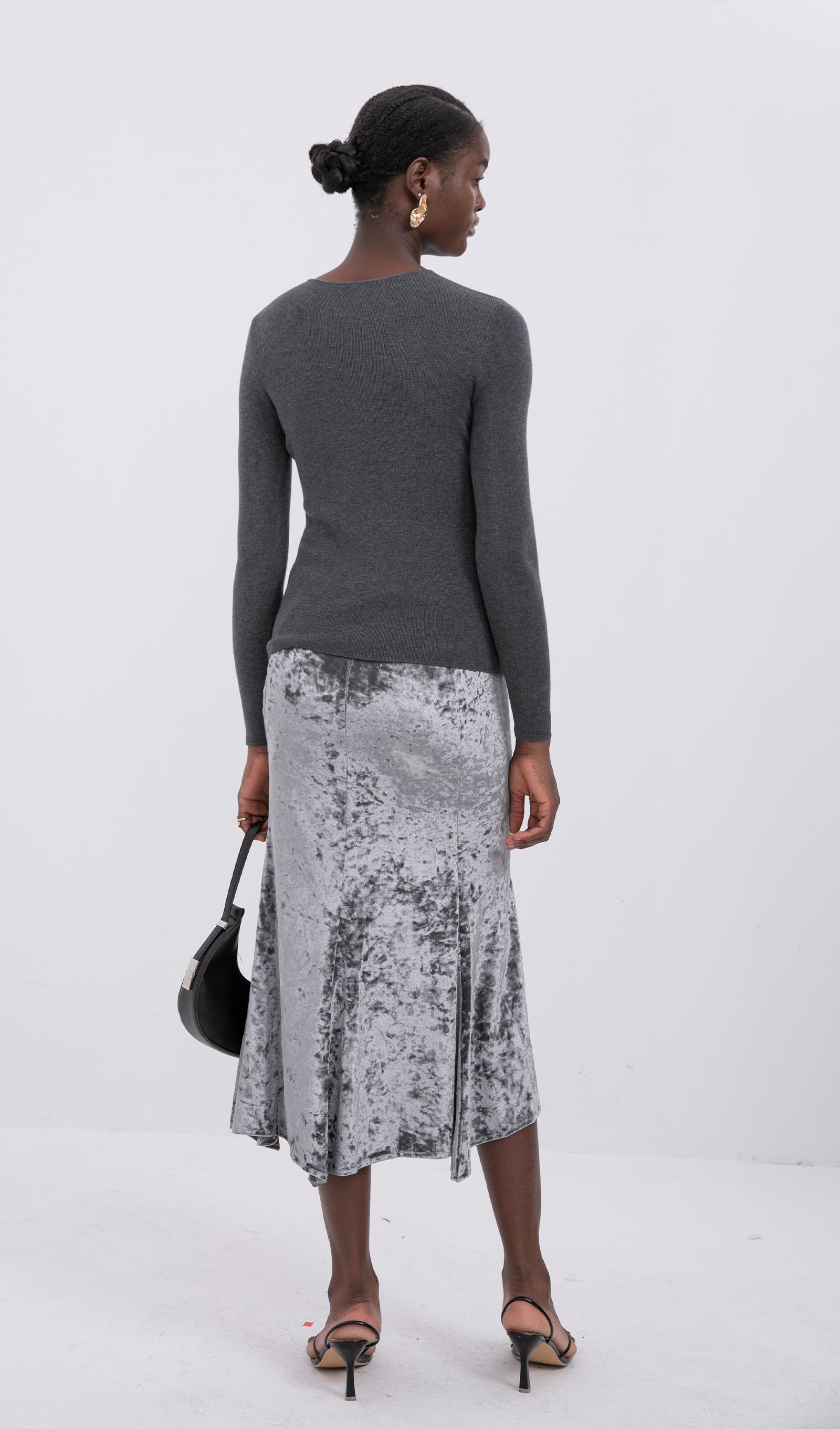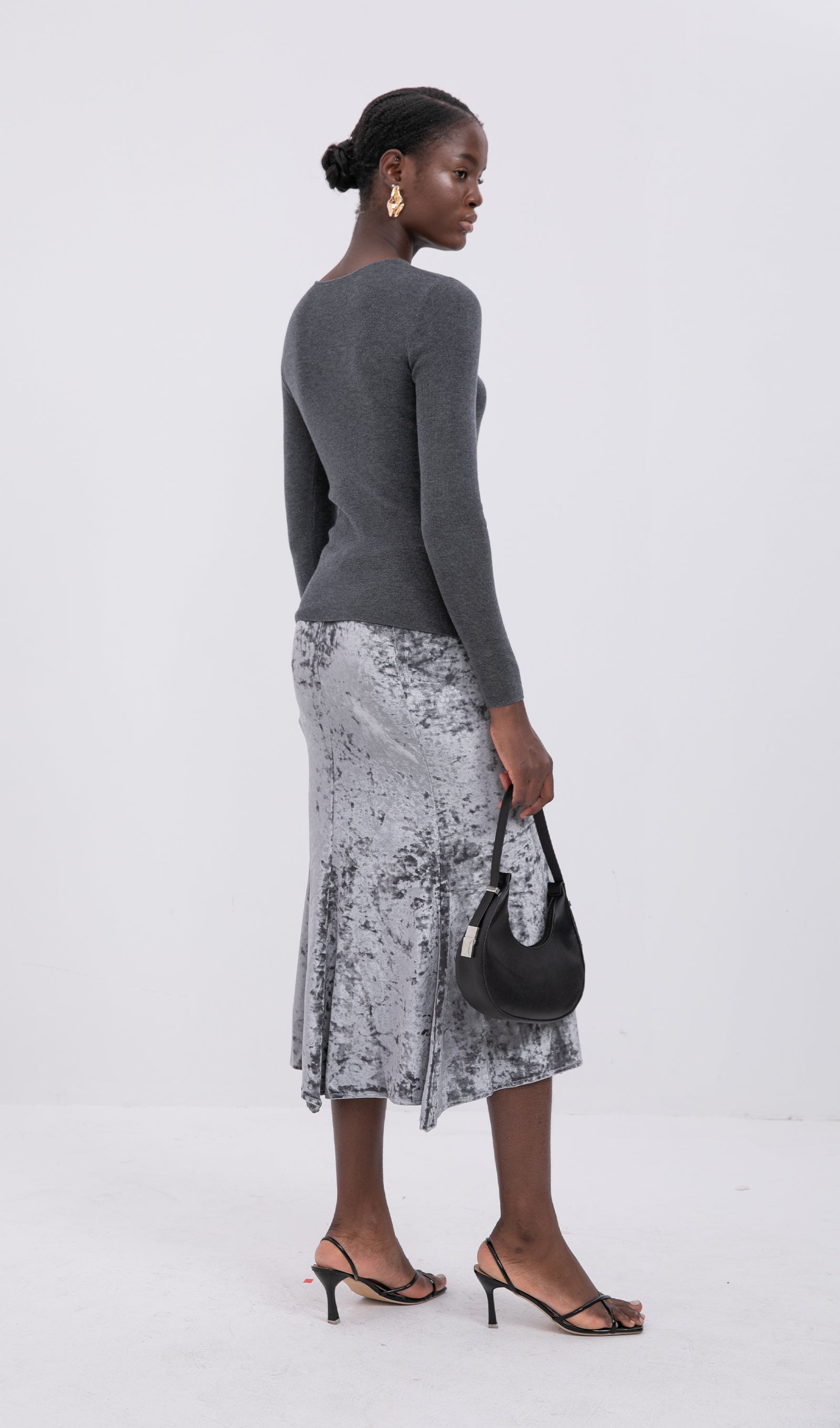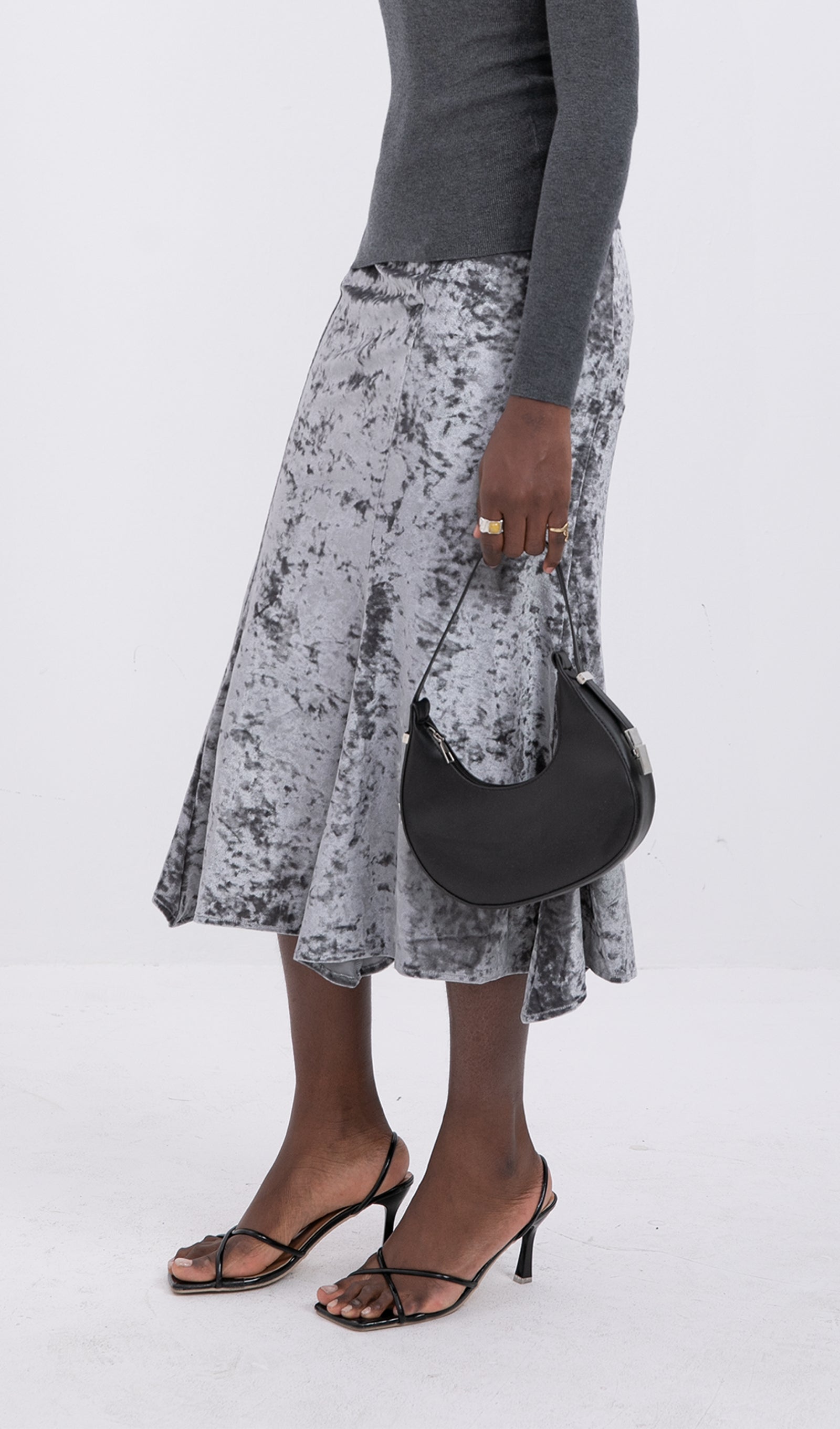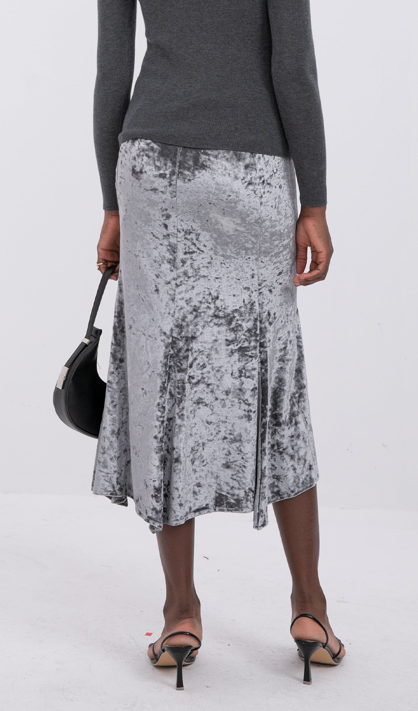Trendy Yüksek Bel Kadife Midi Etek-Gümüş
