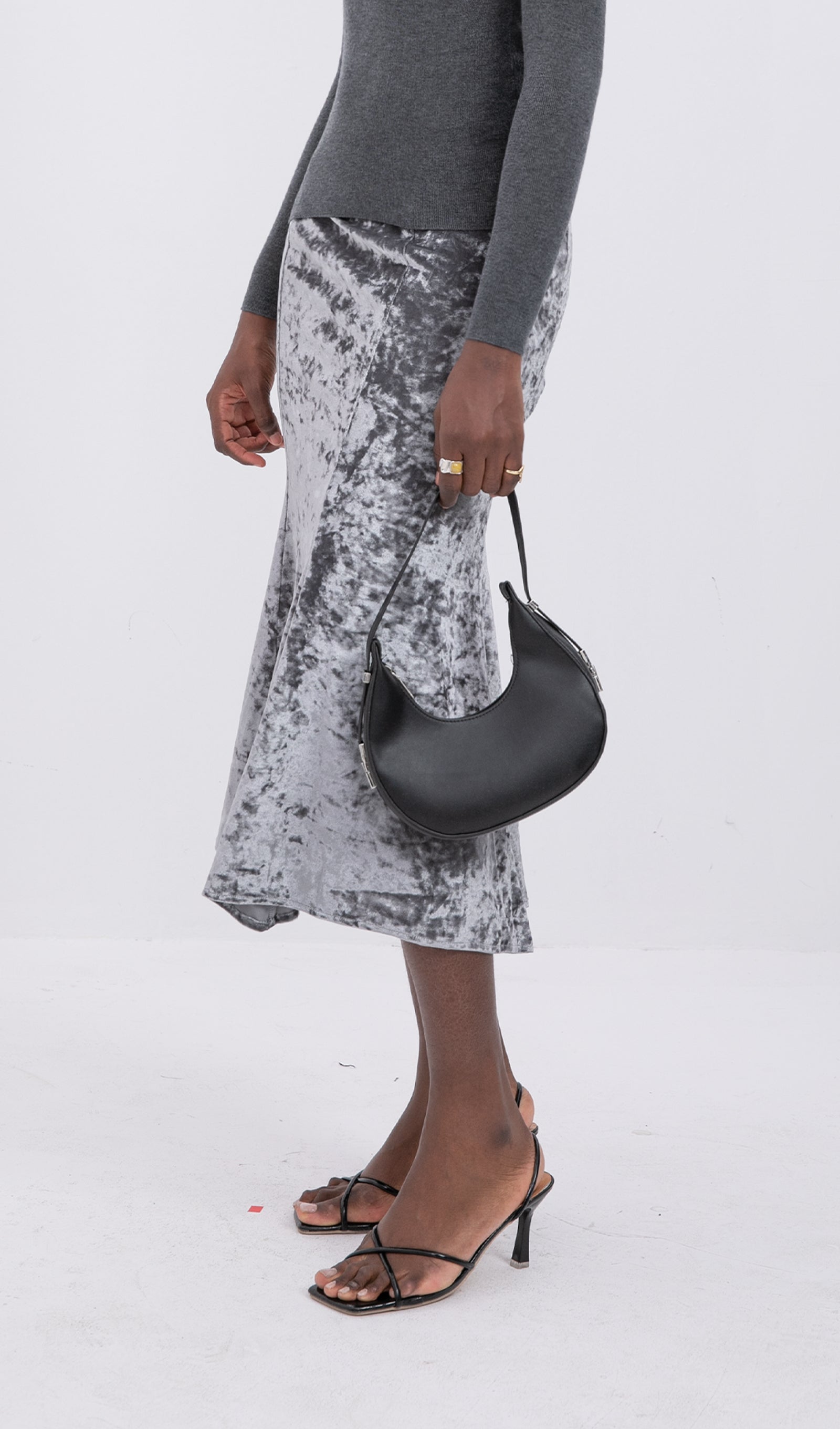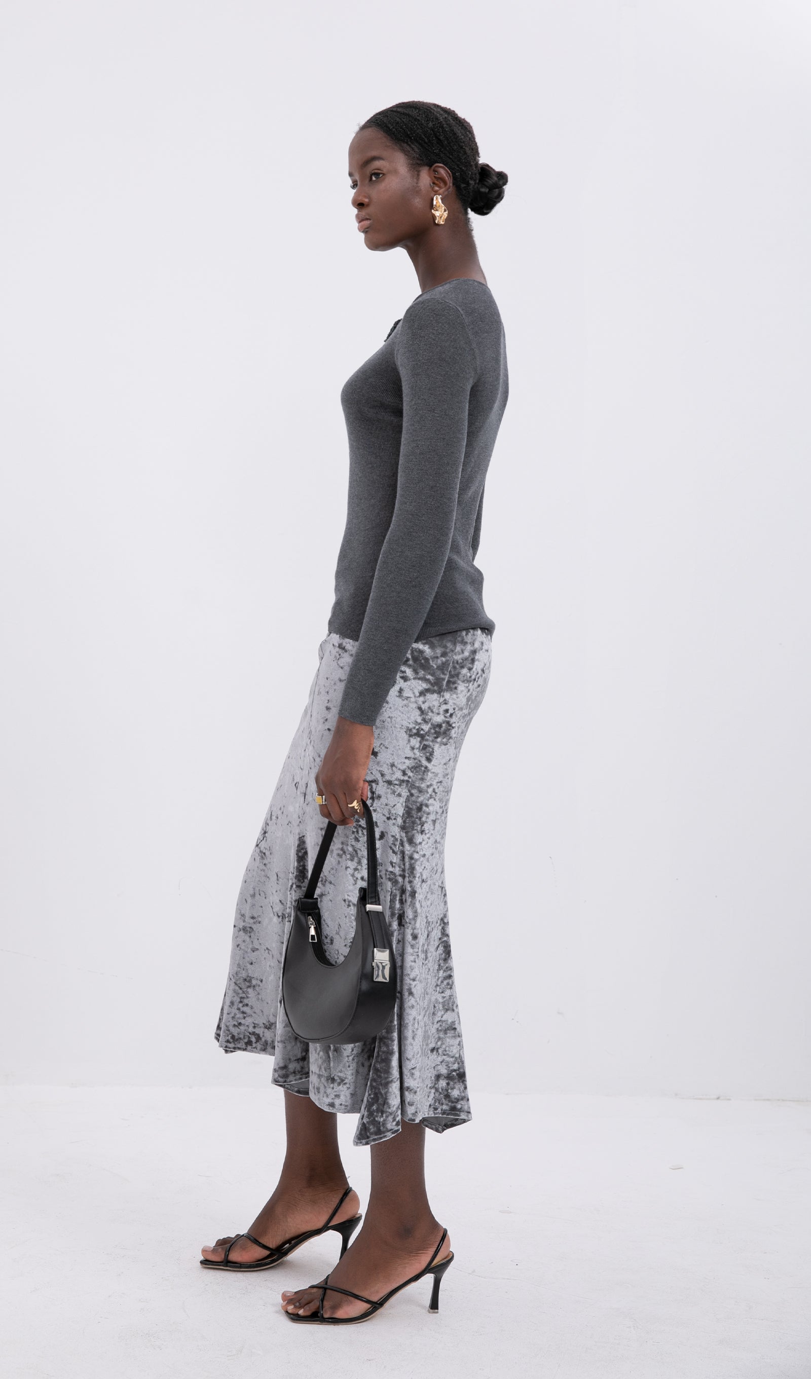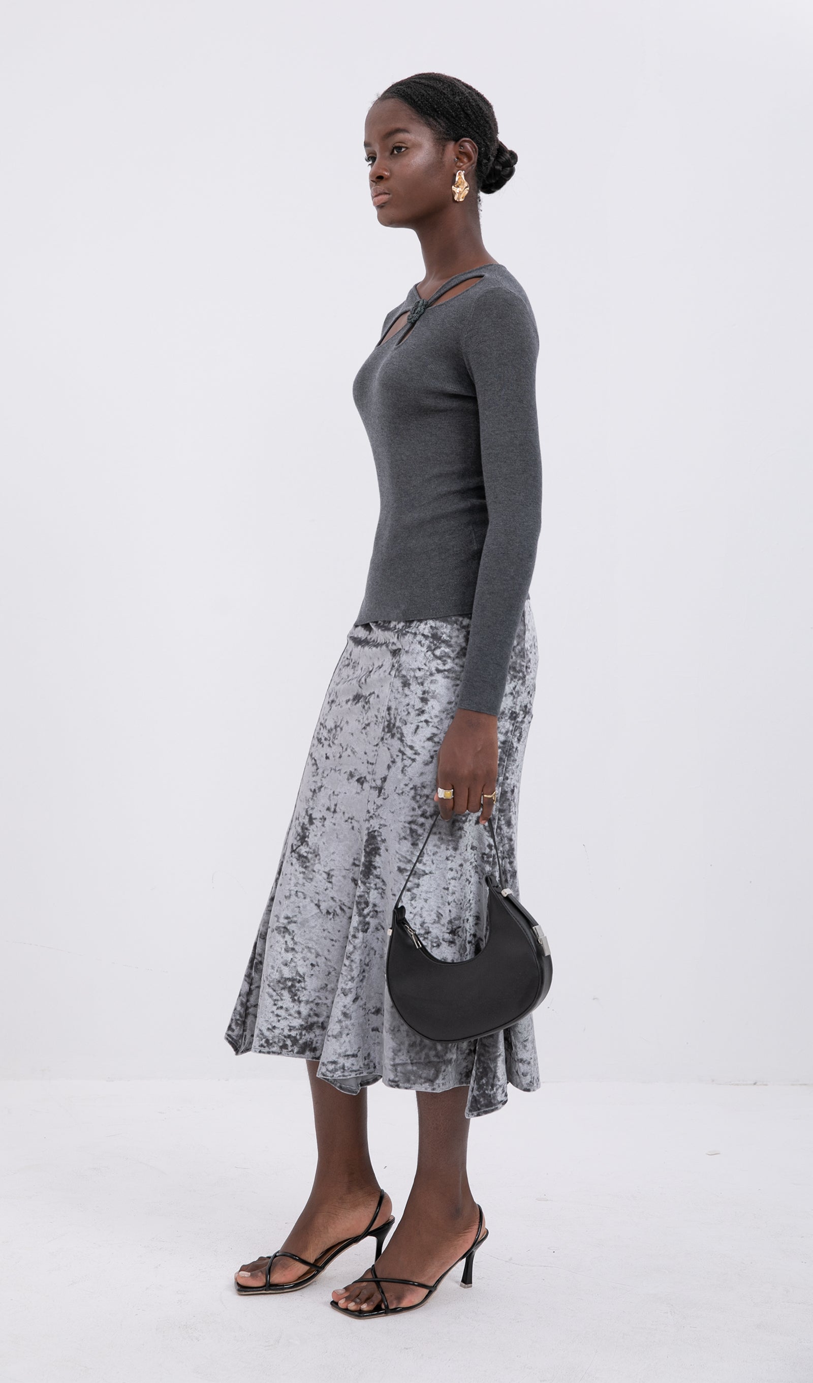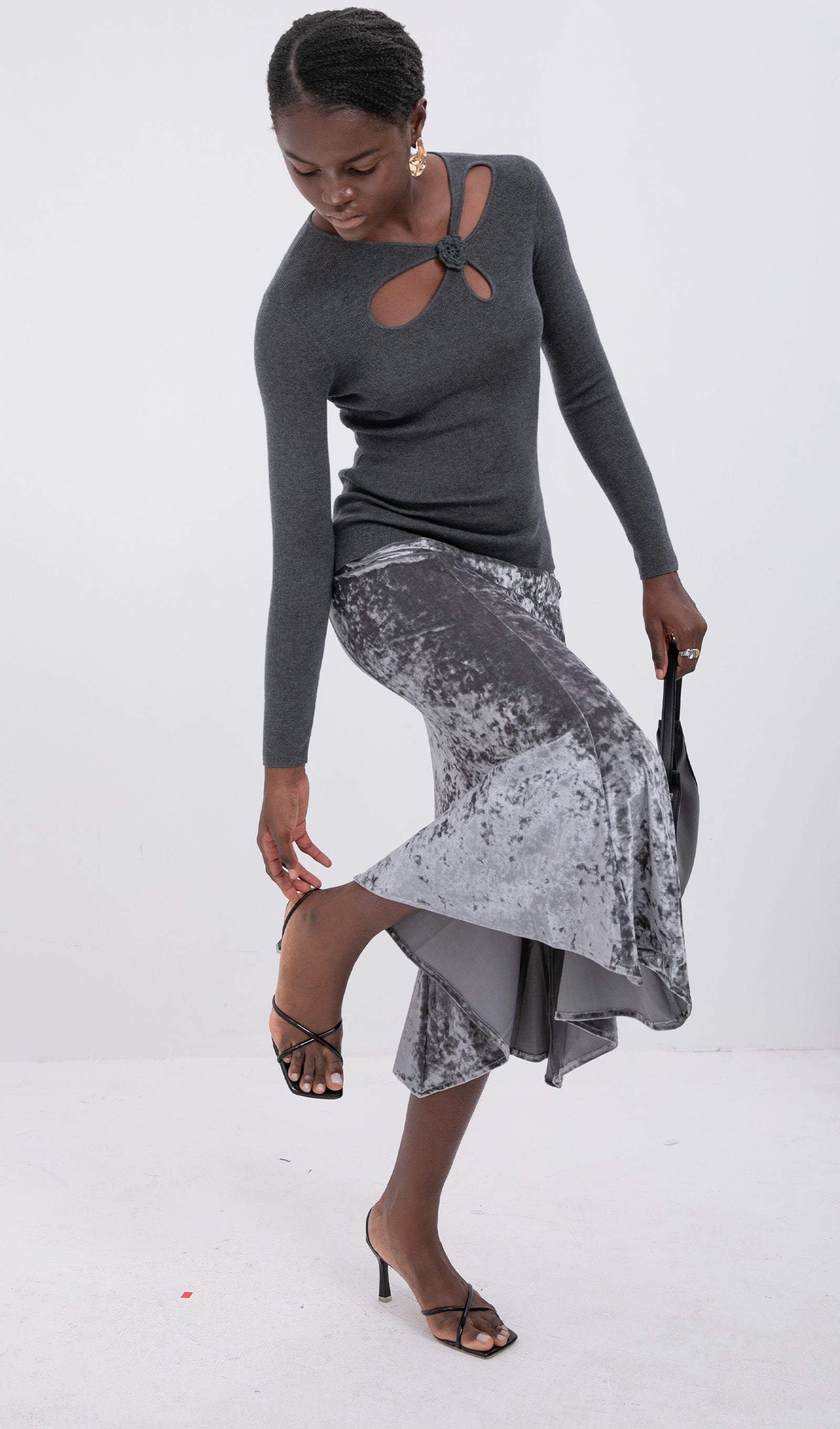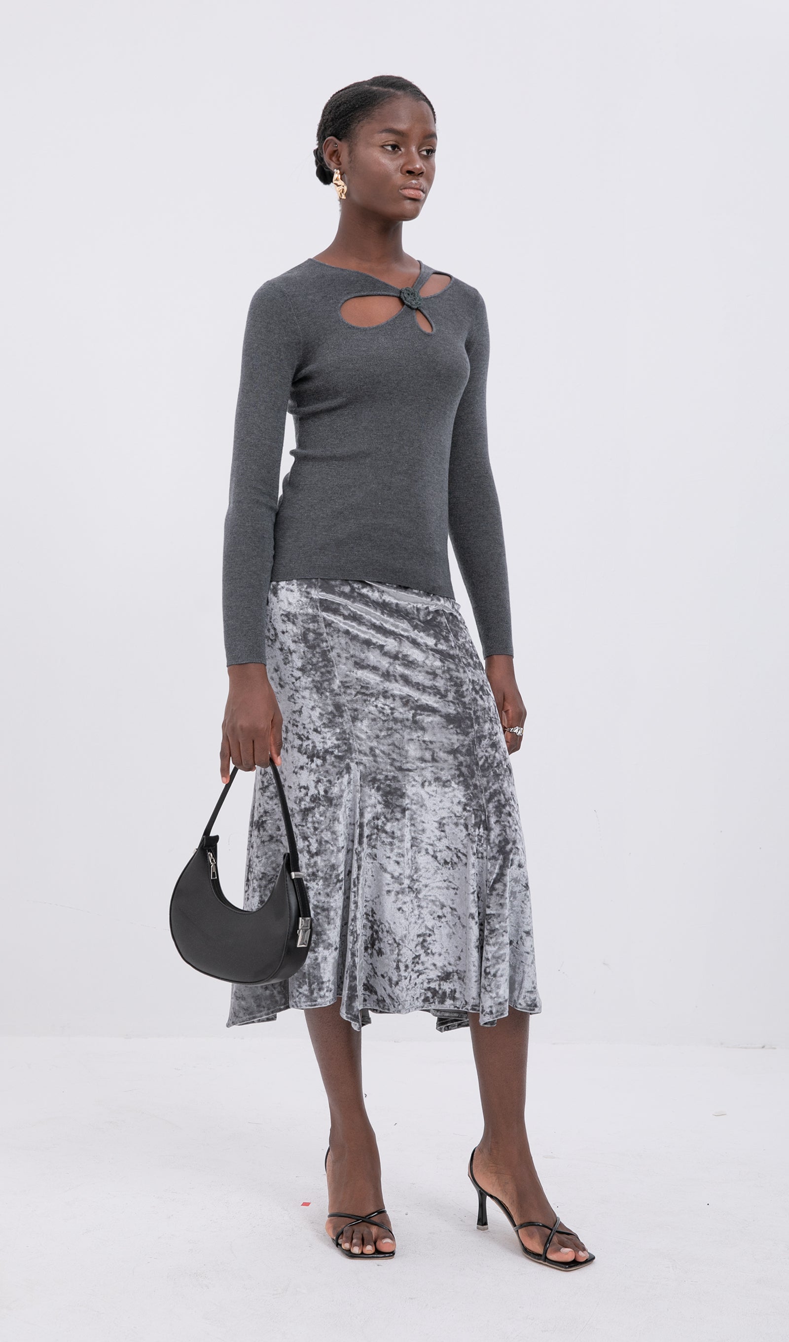 Trendy Yüksek Bel Kadife Midi Etek-Gümüş