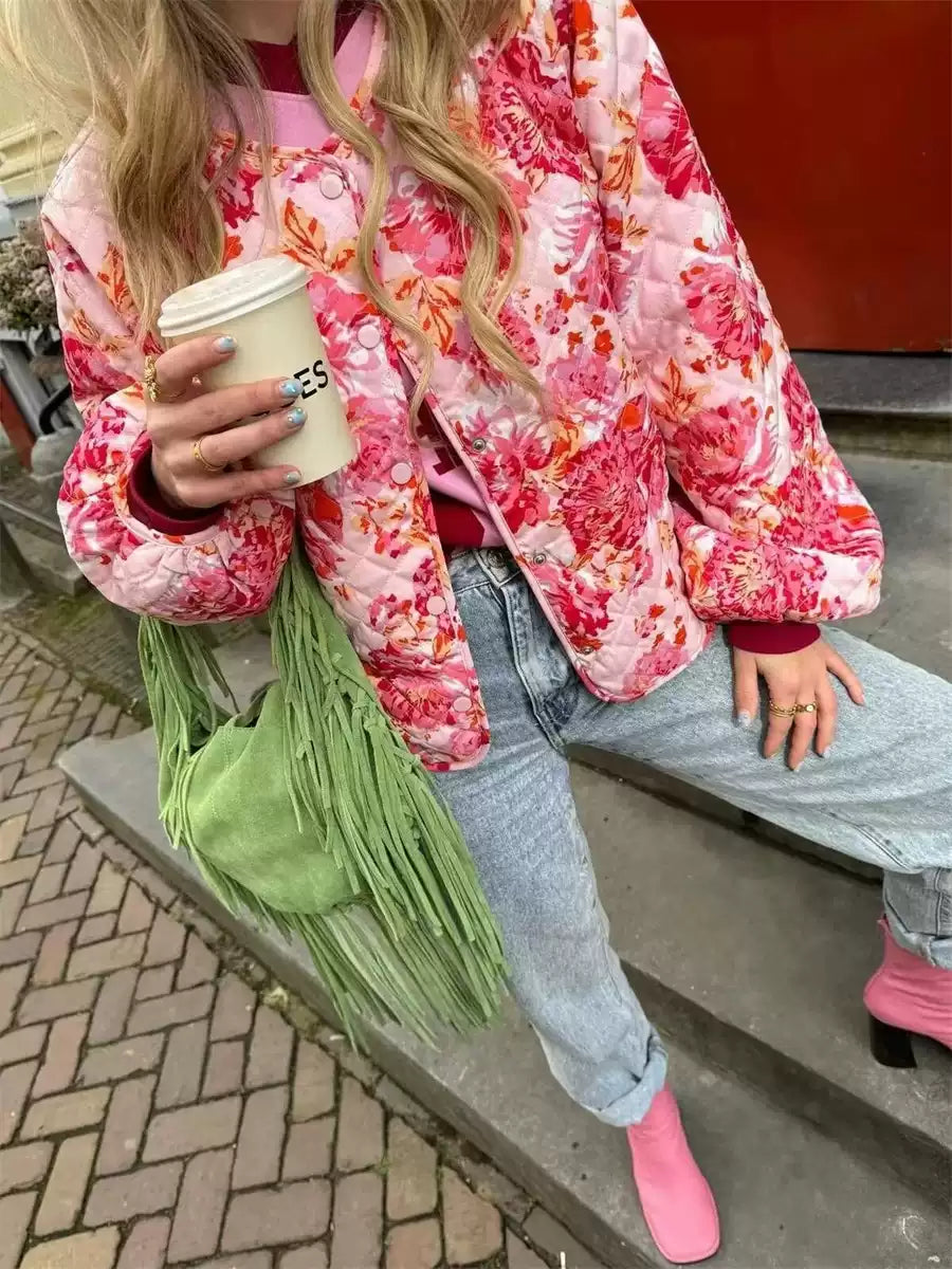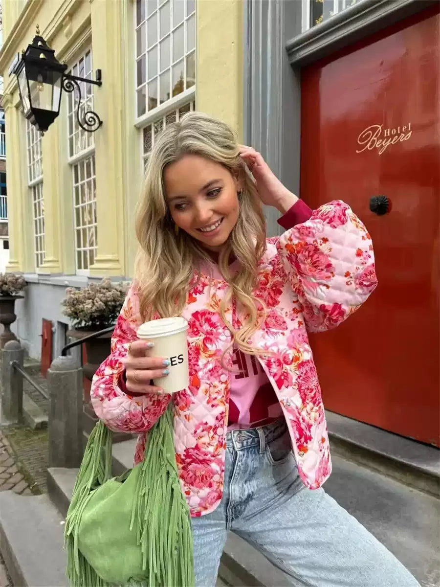 Jade Floral Diamond Kapitone Hafif Ceket, zarafet ve işlevselliği bir araya getiriyor. Canlı pembe çiçek desenli yumuşak kapitone tasarımıyla bu ceket, stil ve konforun ön planda olduğu serin günler için ideal.