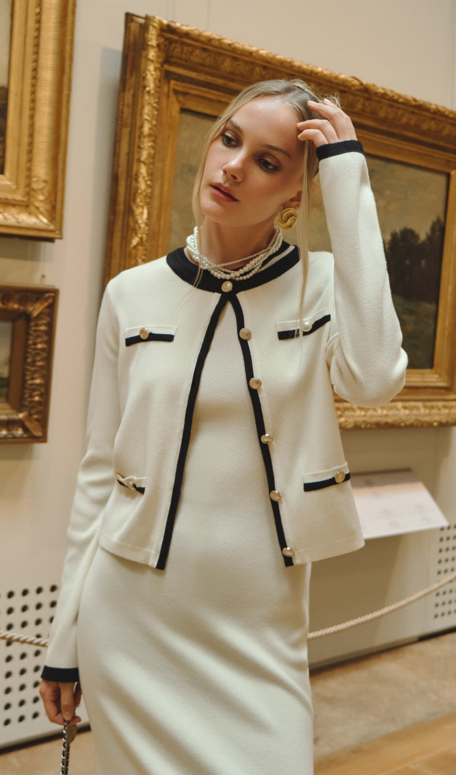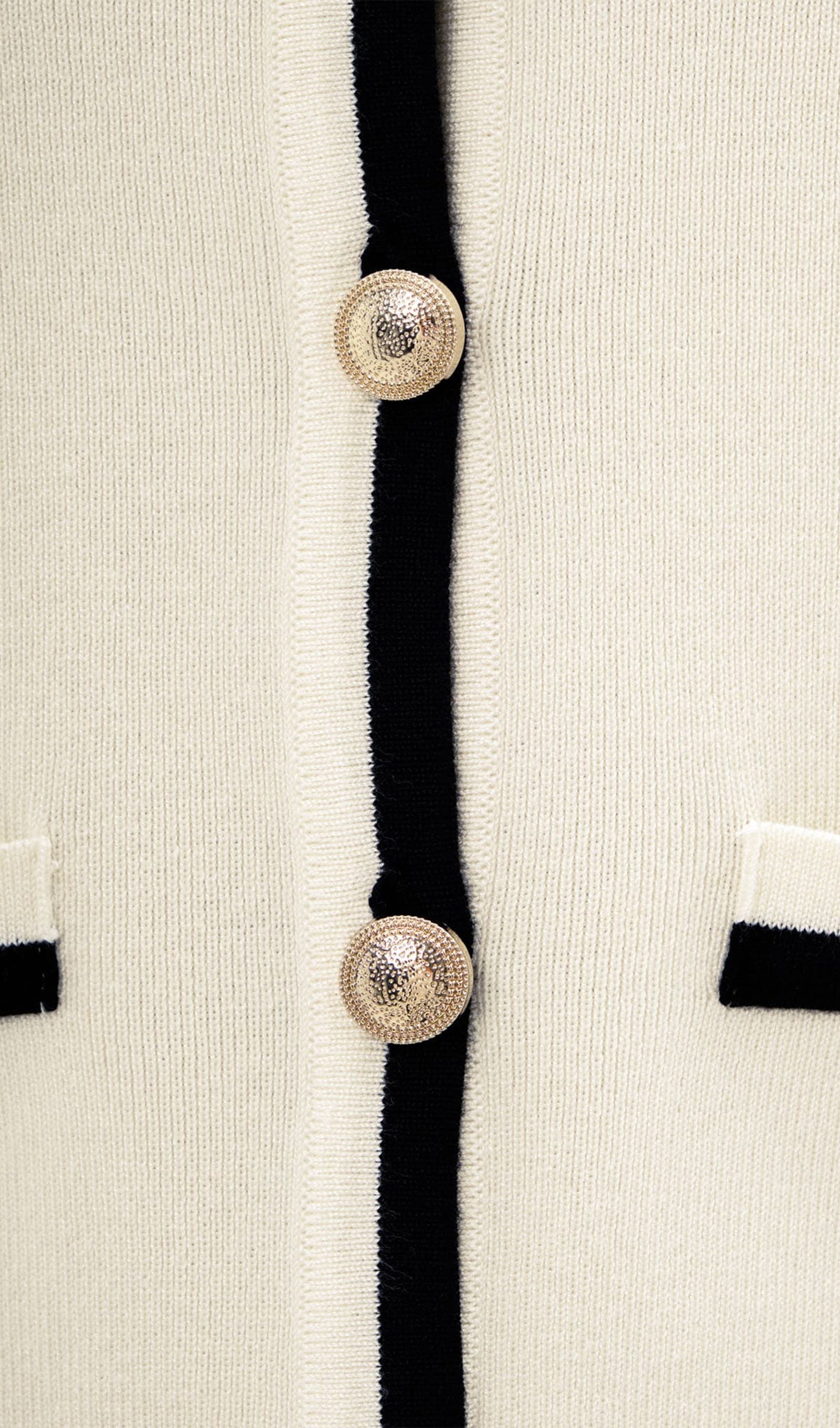 Yuvarlak yakalı, çok sayıda dekoratif cepli ve önden büyük altın tonlu düğmeli düz kesim hırka, ribana örgü jarseden üretilmiş ve yaka, manşet ve patta kontrast eklerle tamamlanmıştır.