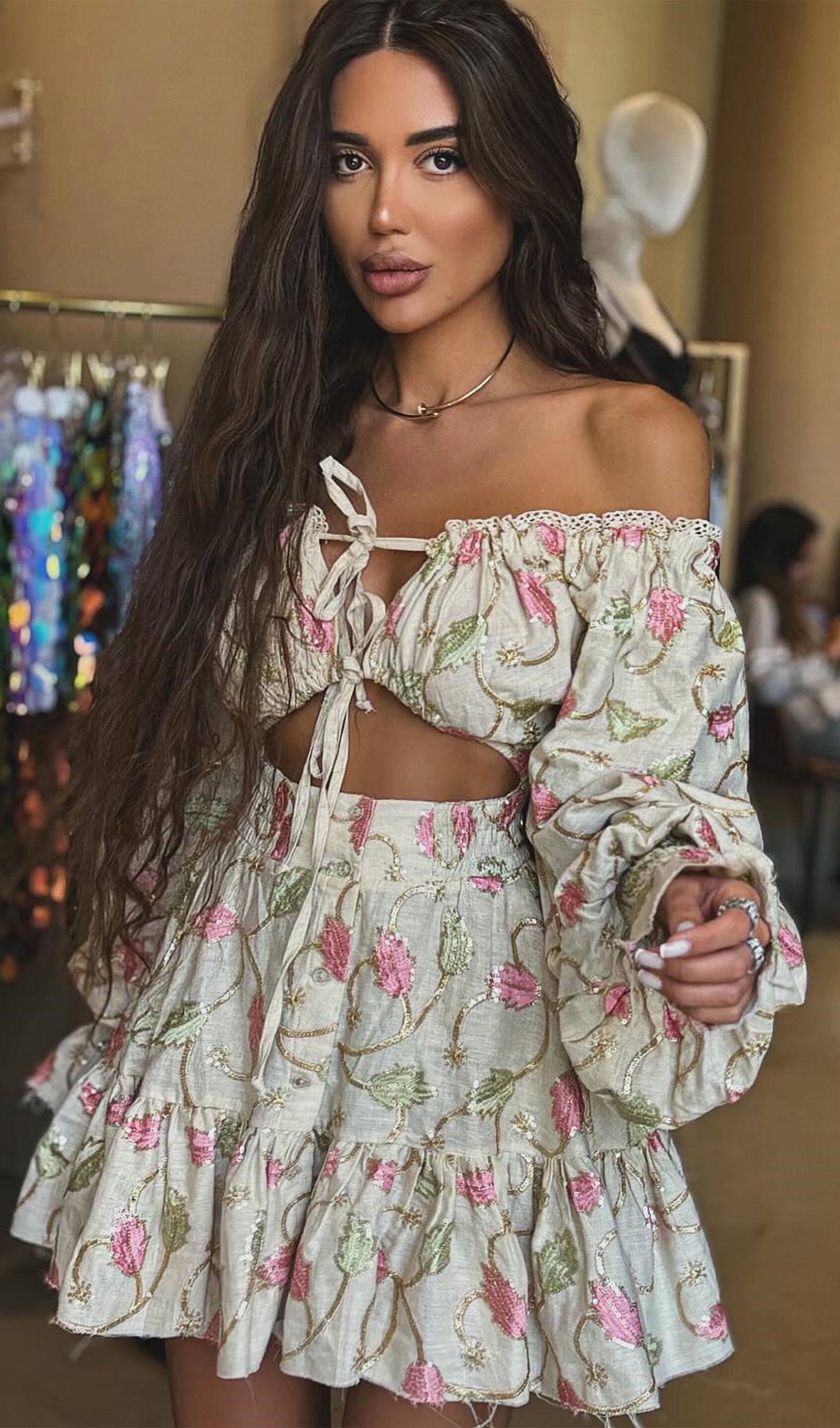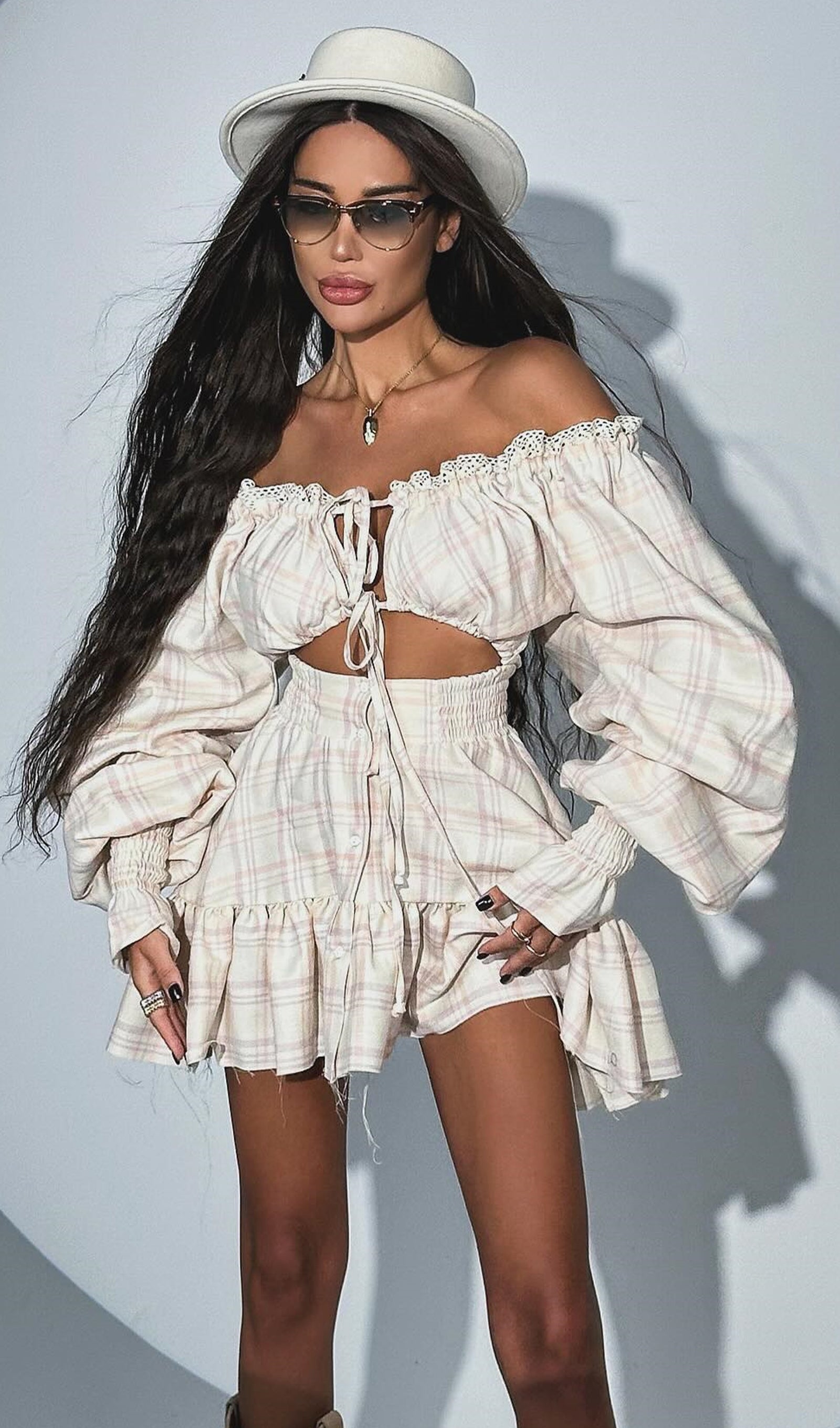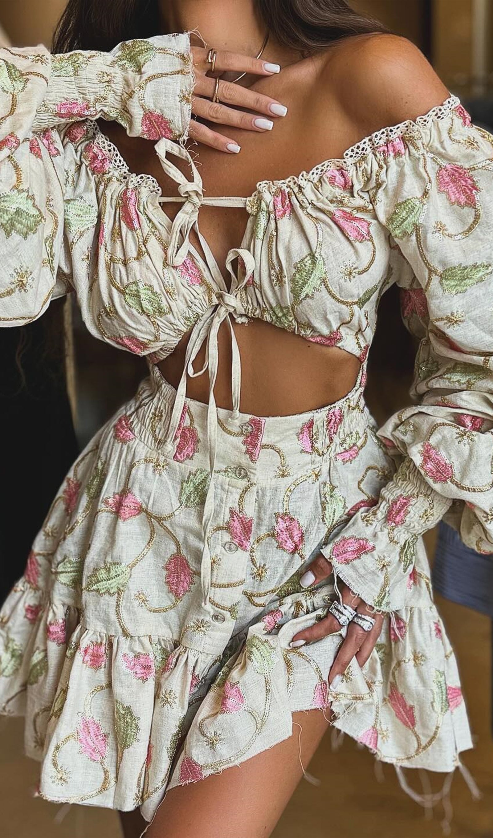 Bu Dantelli Mini Elbise İki Parçalı Set, puf kolları ve narin fırfır detaylarıyla modaya uygun bağcıklı bir tasarıma sahiptir. Her durum için mükemmeldir.