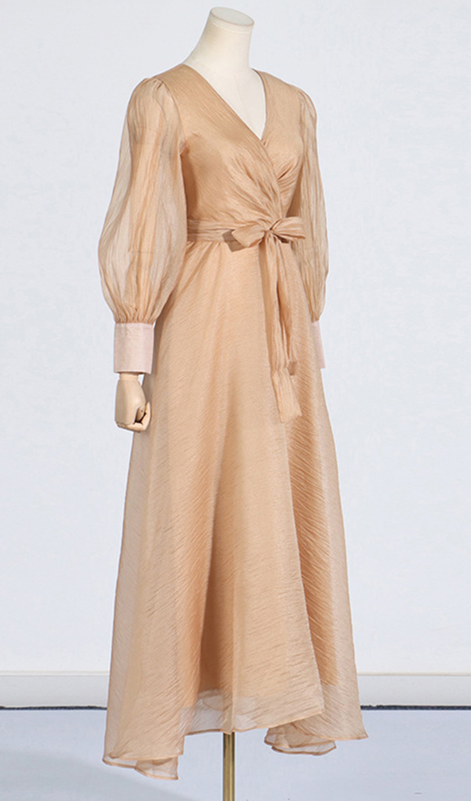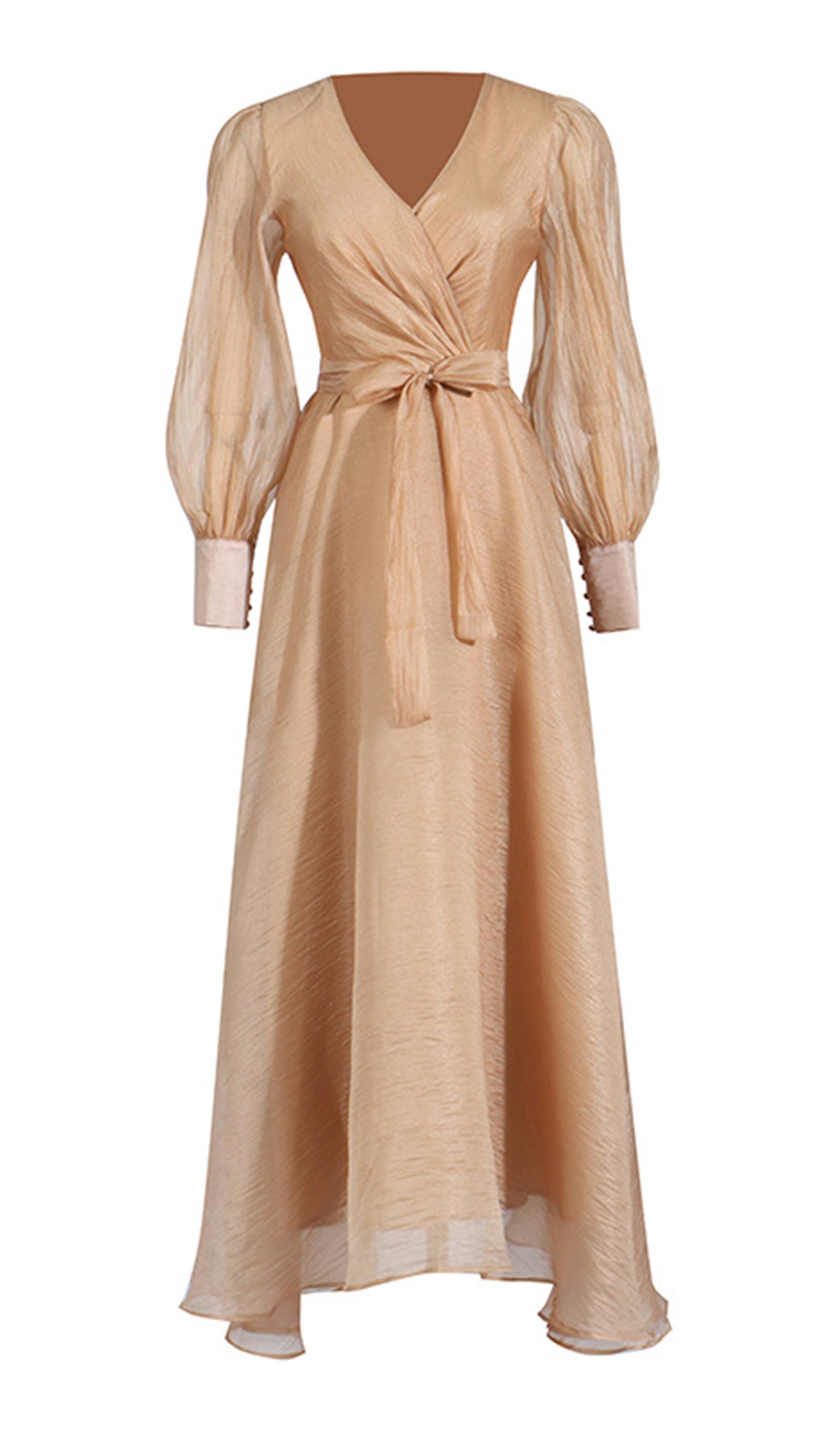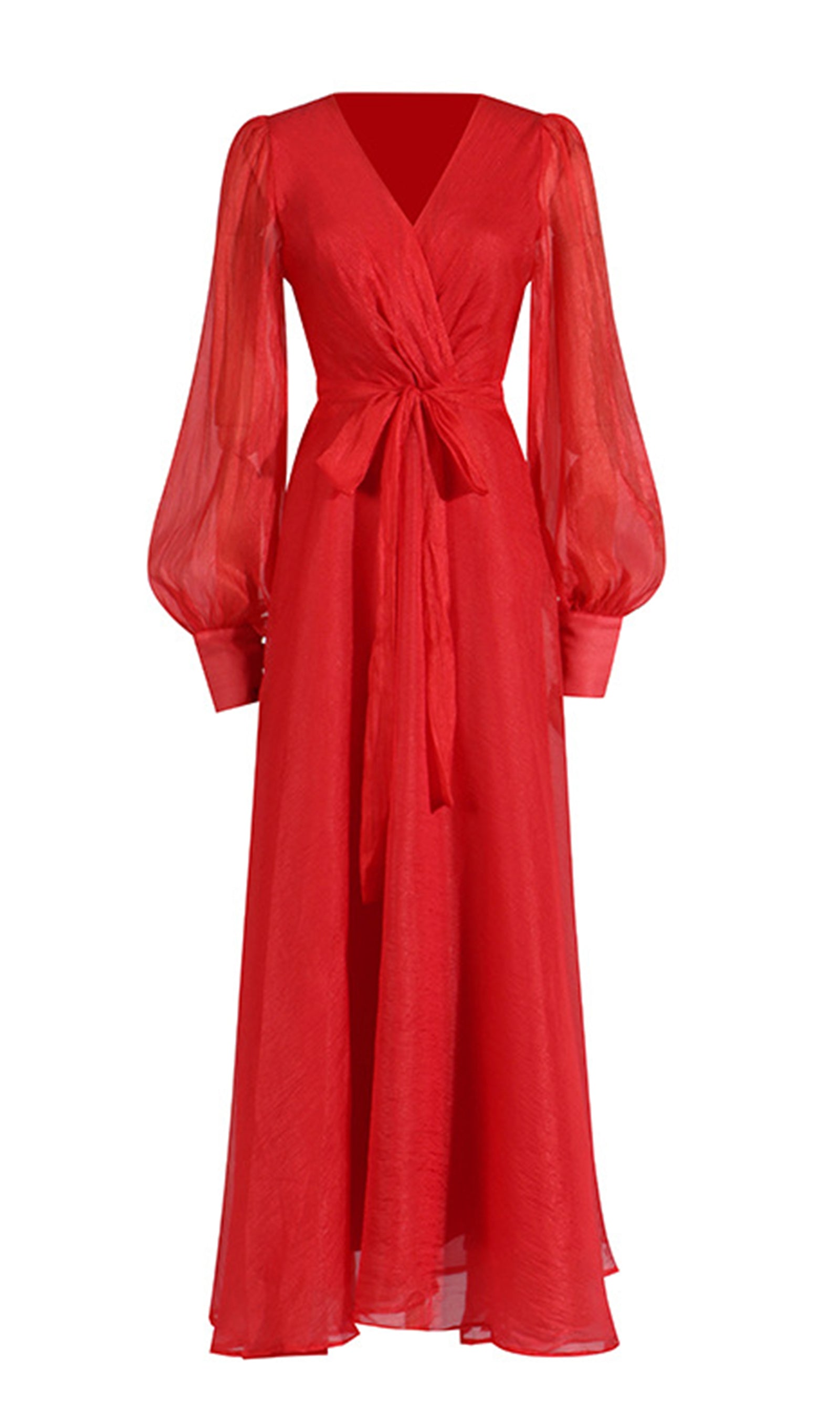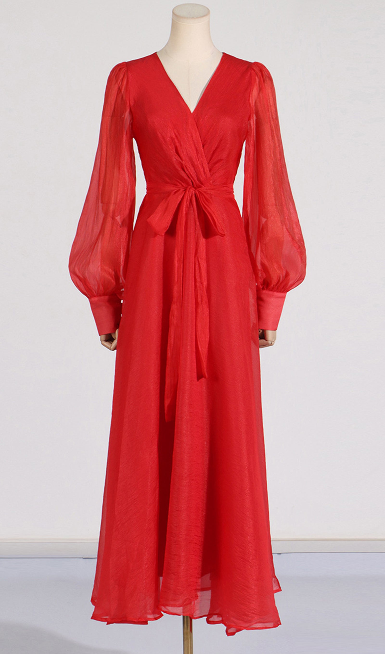 Fener Kollu V Yaka Bel Kemerli Maksi Elbise