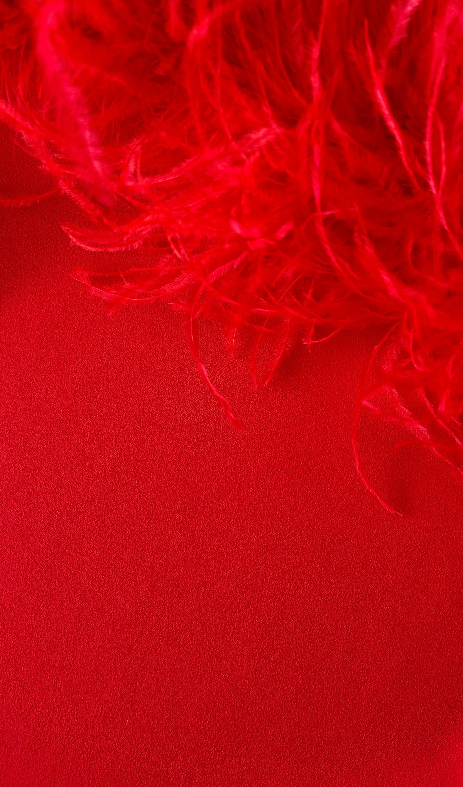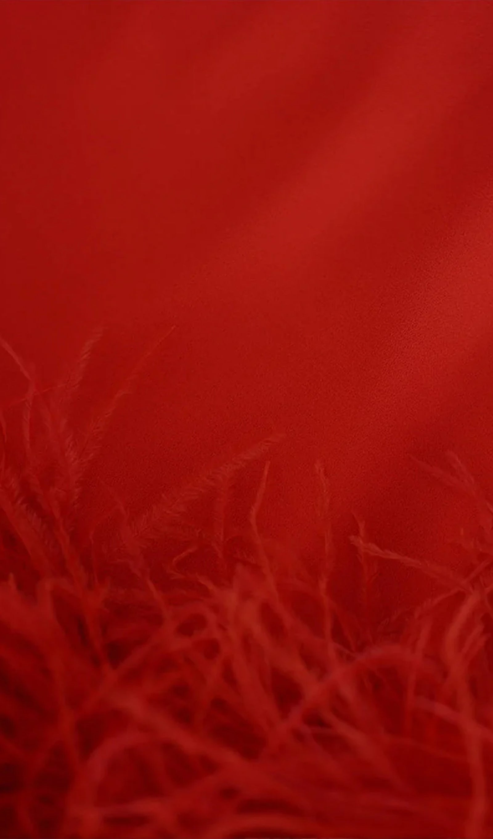 Tüylerin tamamı %100 devekuşu tüyüdür. Sürdürülebilir üretim çerçevesine tam bağlılıkla üretilirler ve sertifikalı çiftliklerden tedarik edilirler. Serin ve kuru bir ortamda saklayınız. Tüyler sentetik olmadığından, bir miktar dökülme olması beklenmektedir. Tüm tüyler elbiseye elle dikilmiştir. Elbiseyi kuru temizlemeye vermeden önce tüyler çıkarılmalı ve elbise temizlendikten sonra tekrar dikilmelidir.