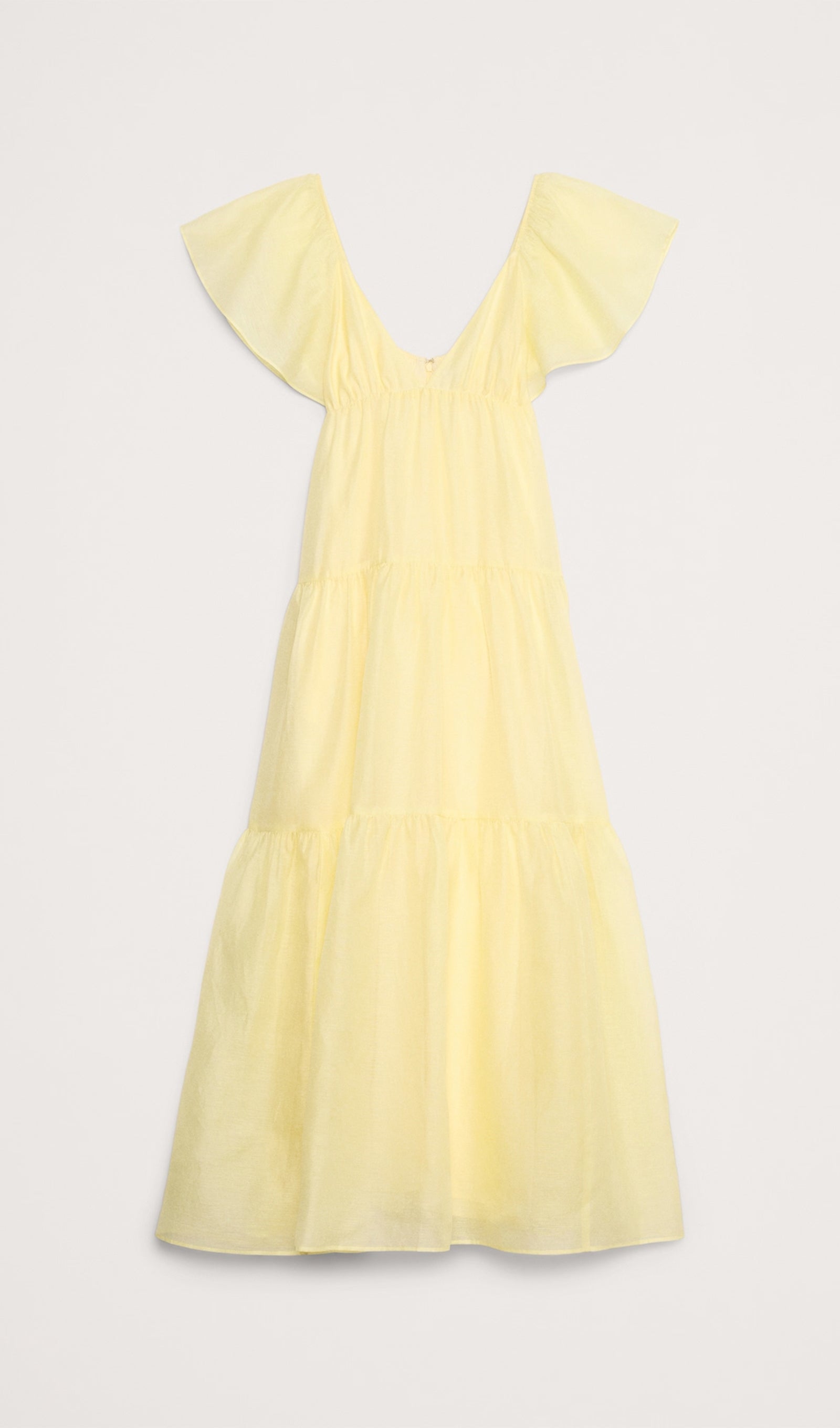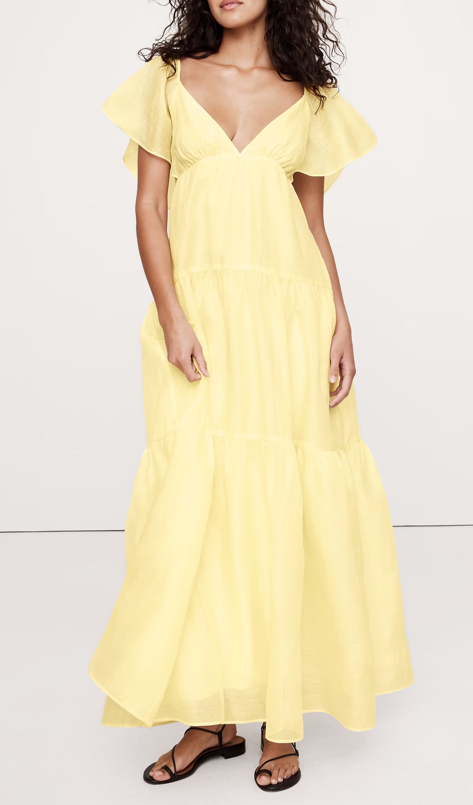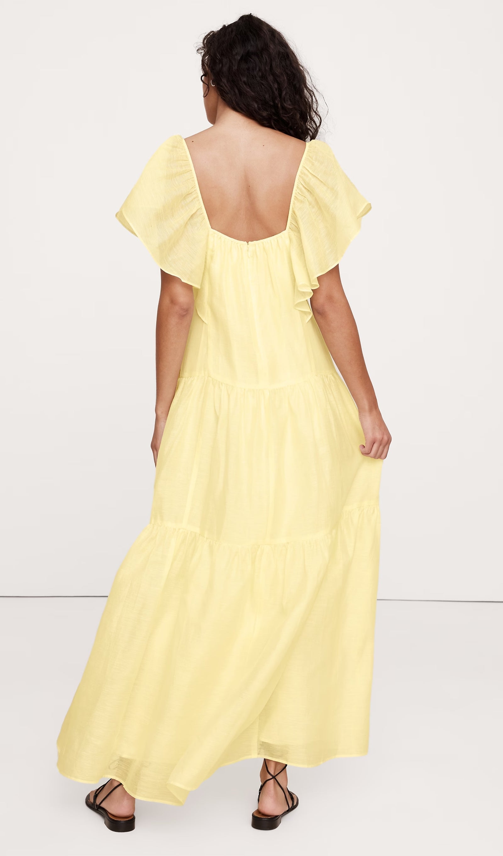 Süper özel bir elbise. Bu katmanlı maksi elbise tamamen detaylarla ilgili: volanlı kol, ampir bel ve dökümlü maksi etek. Keten ve ipek karışımı hafif bir kumaştan kesilmiştir ve harika görünür (ve hissettirir).