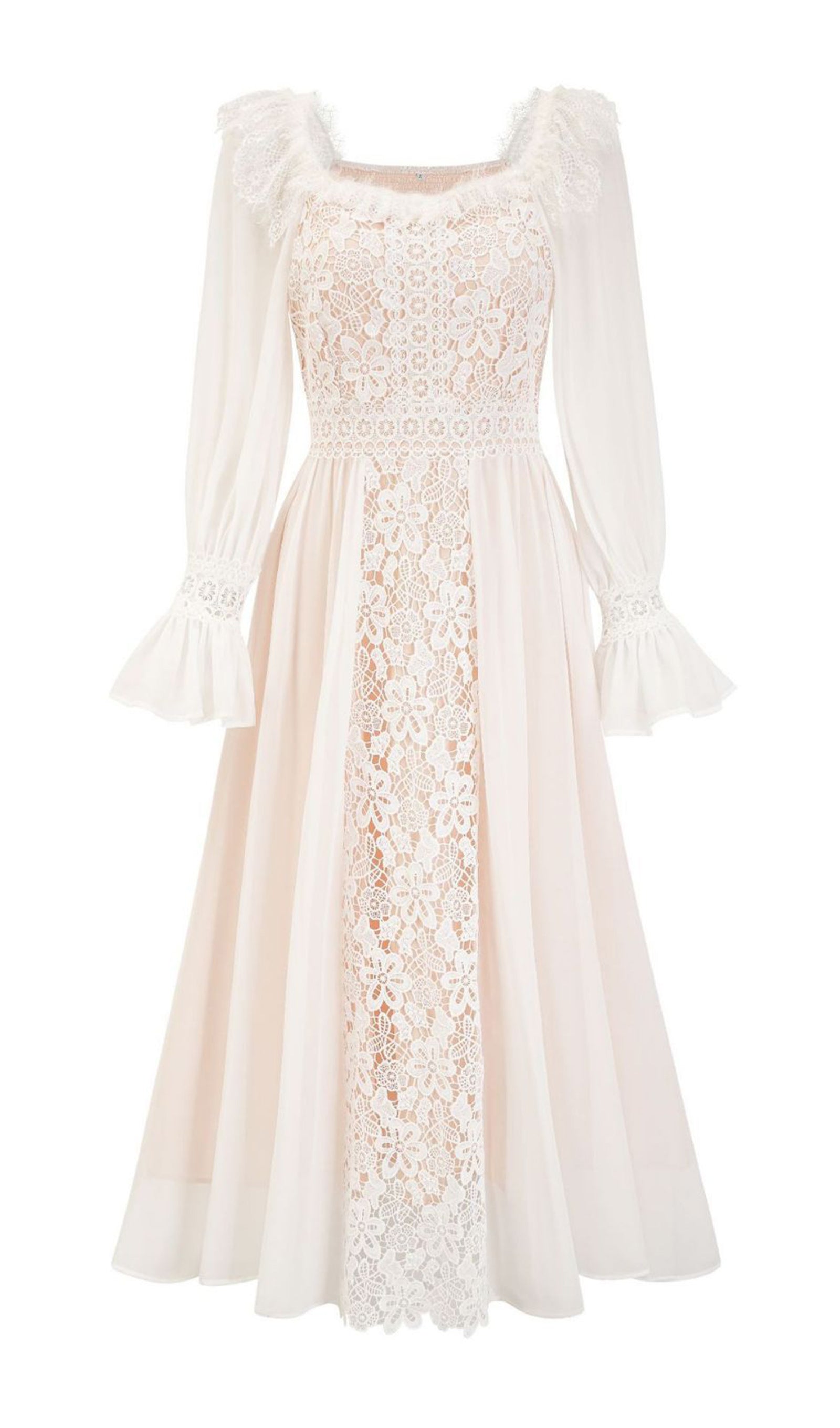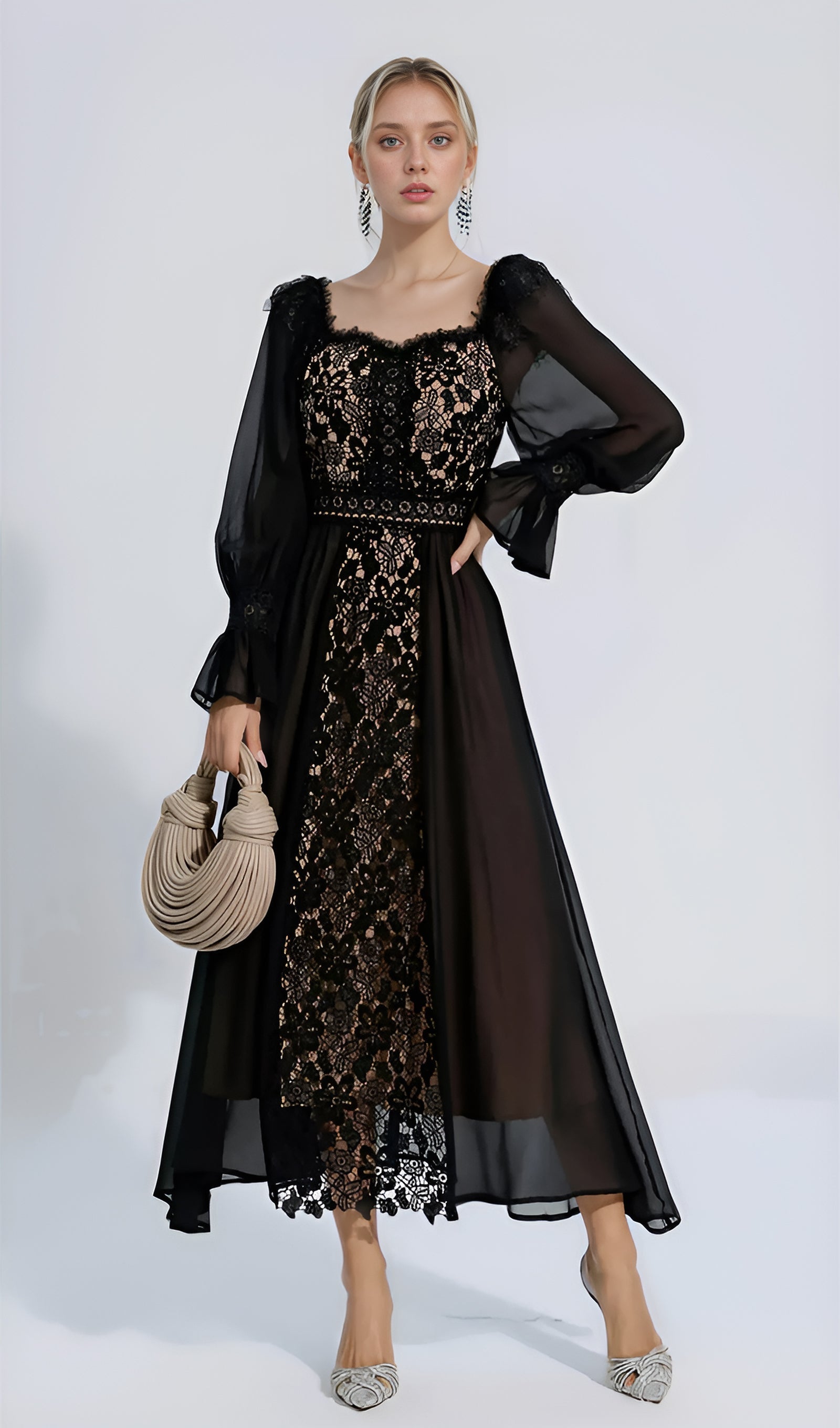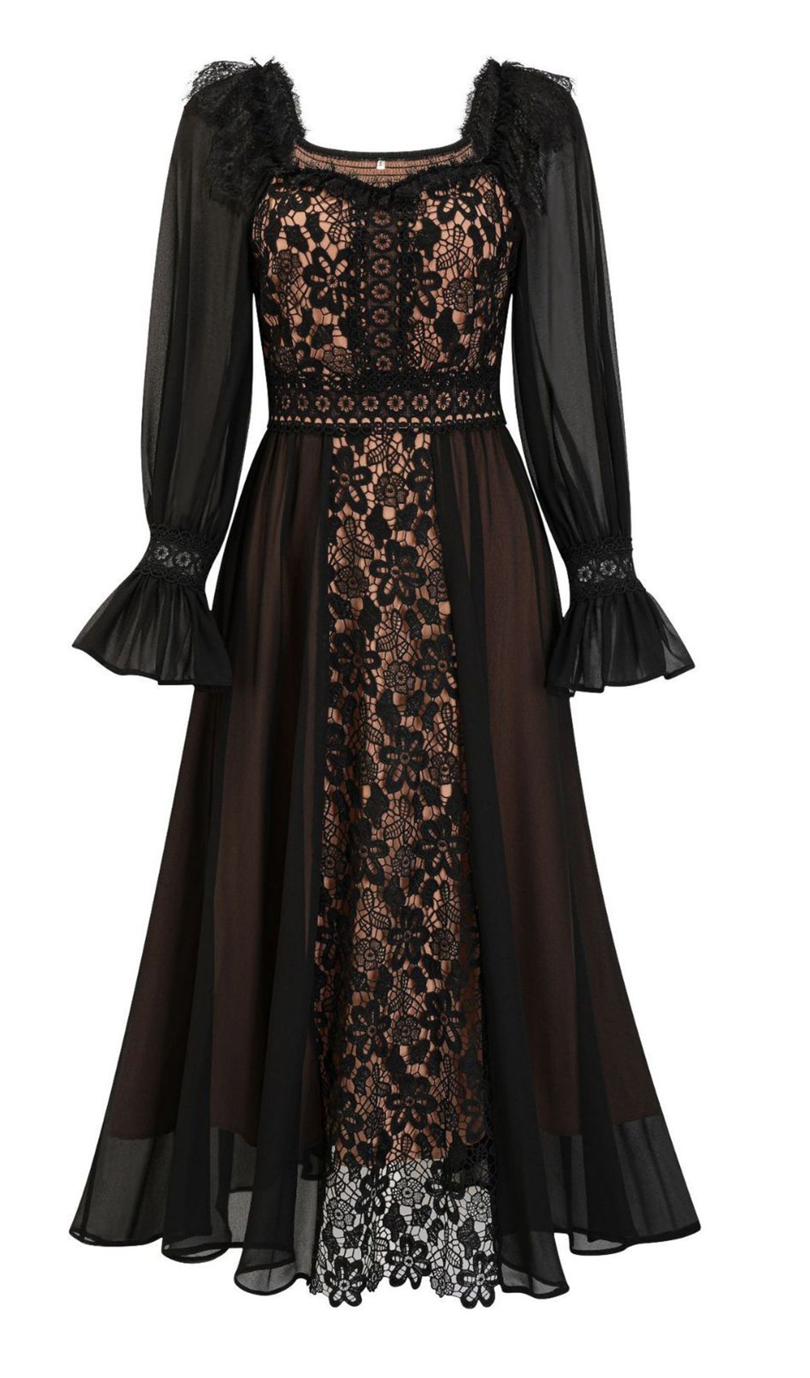 Uzun Kollu Dantel Çiçekli Fit ve Flare Maksi Elbise