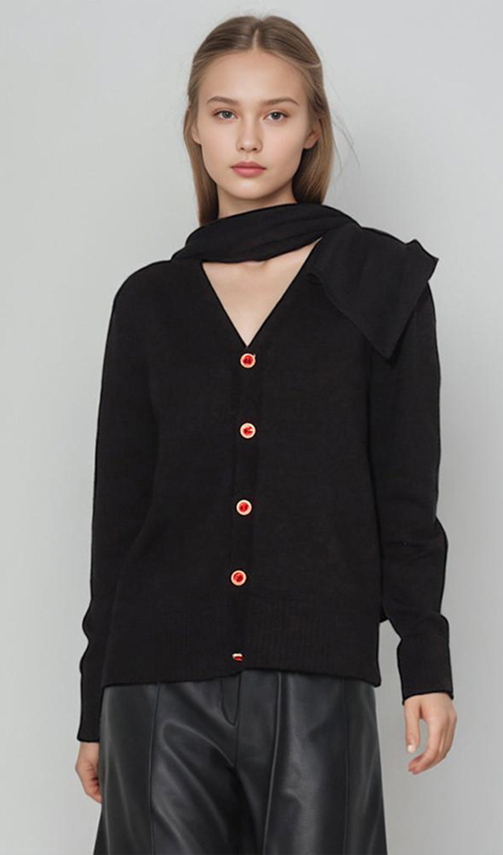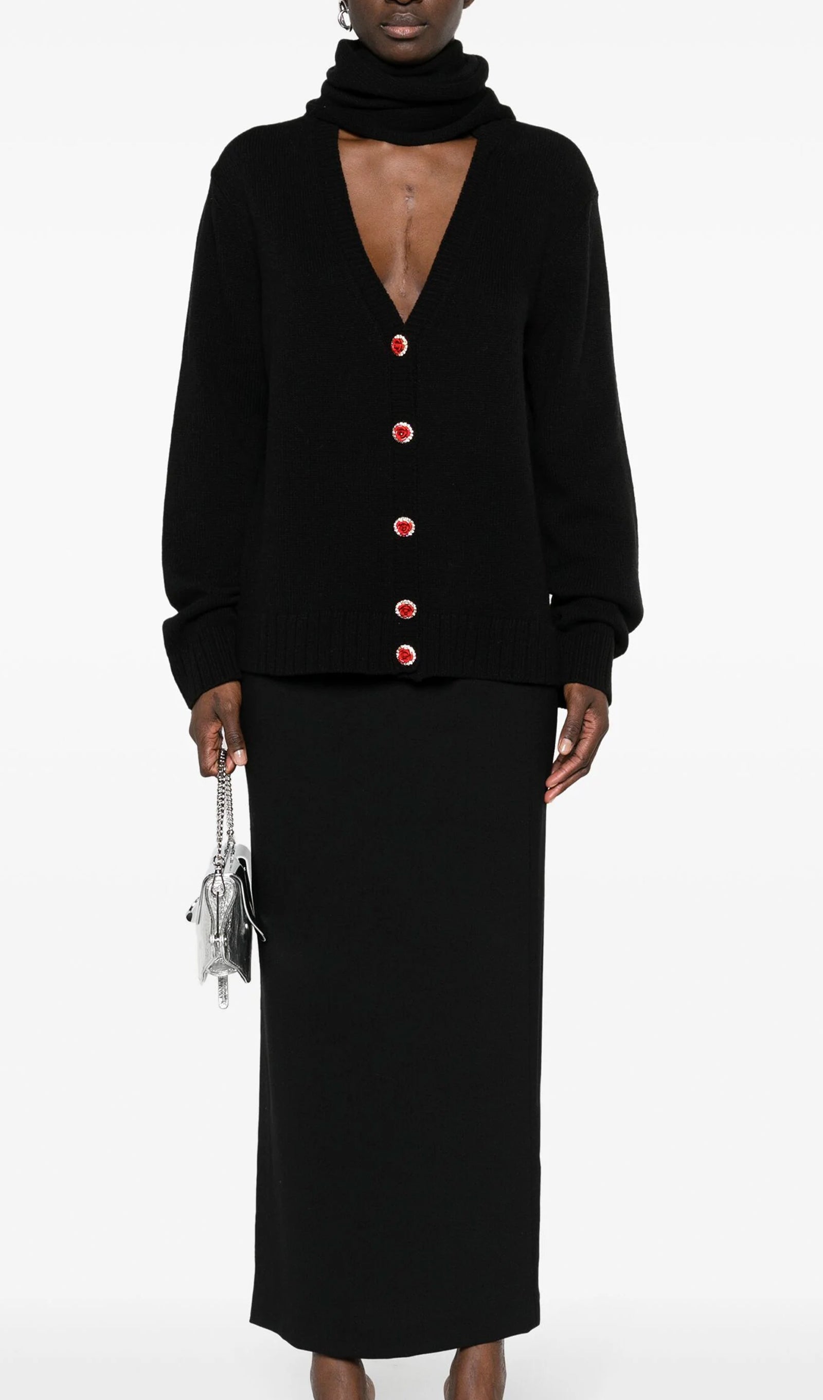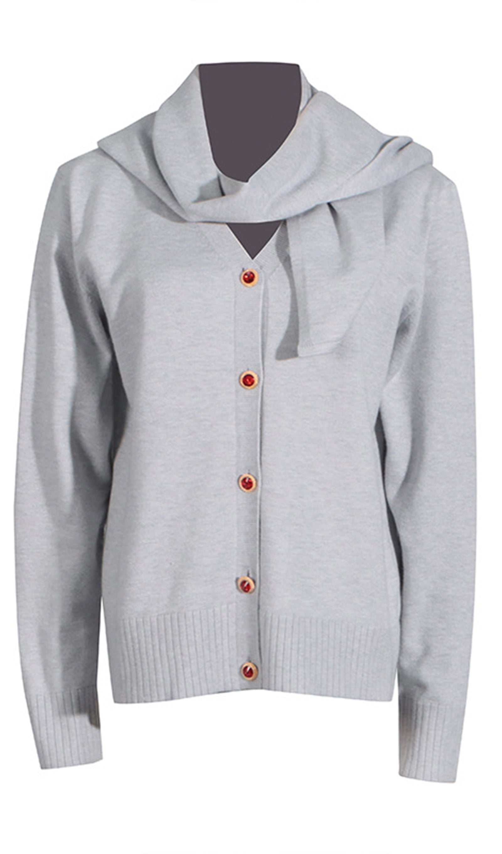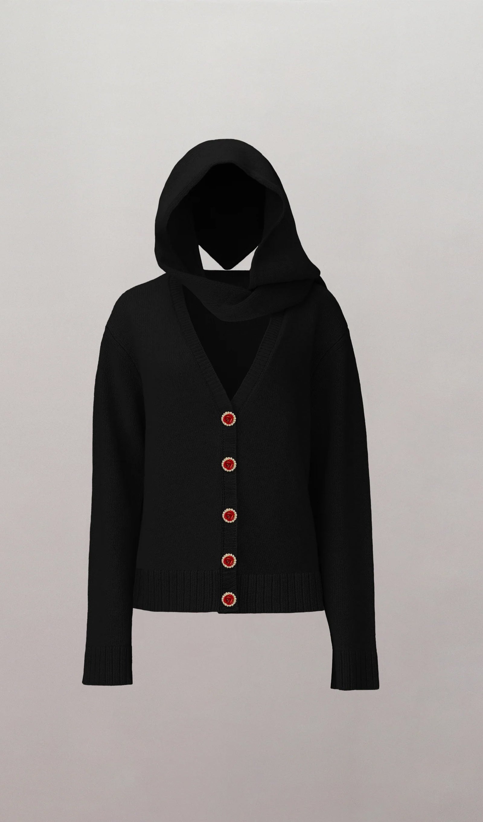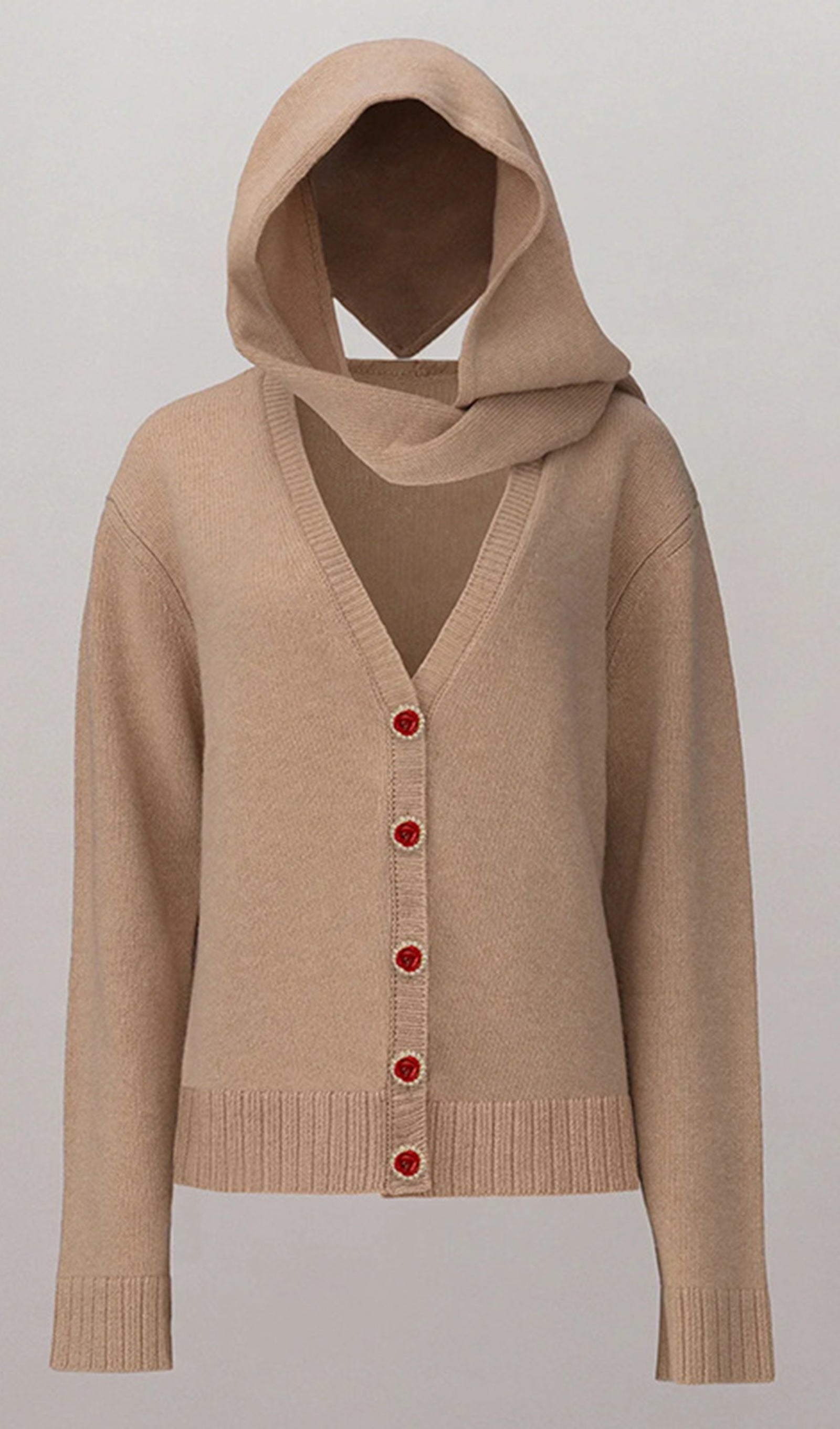 Bu sezon romantik bir hırka, üzerine iliştirilmiş bir eşarp gibi görünecek şekilde tasarlanmış ve çeşitli şekillerde şekillendirilebilen bir kapüşon ile sunuluyor. Hırkanın kapanışında gül şeklinde süslü düğmeler yer alıyor. Bu ürün, tercihe bağlı olarak beden seçebilen büyük boy bir siluete sahiptir.