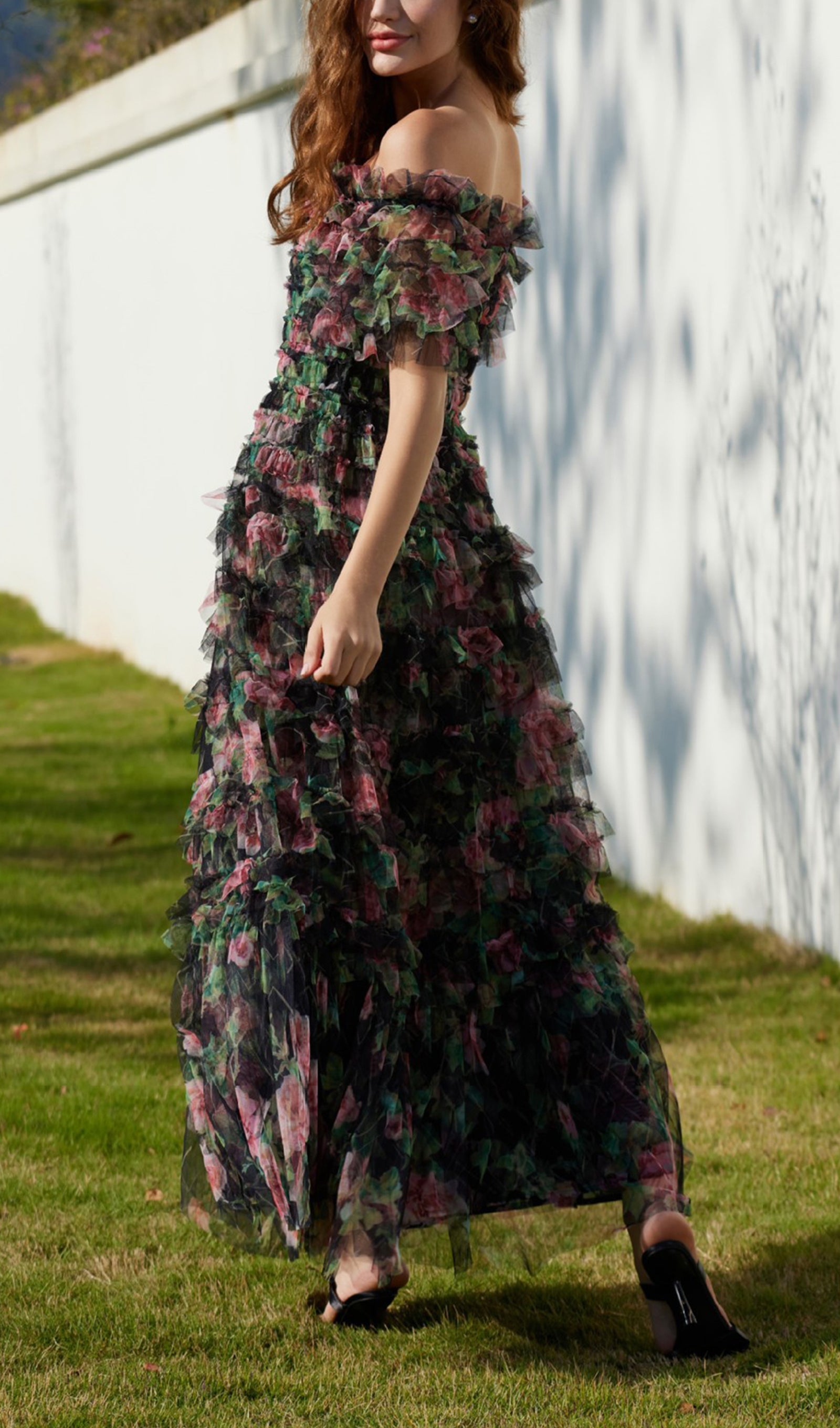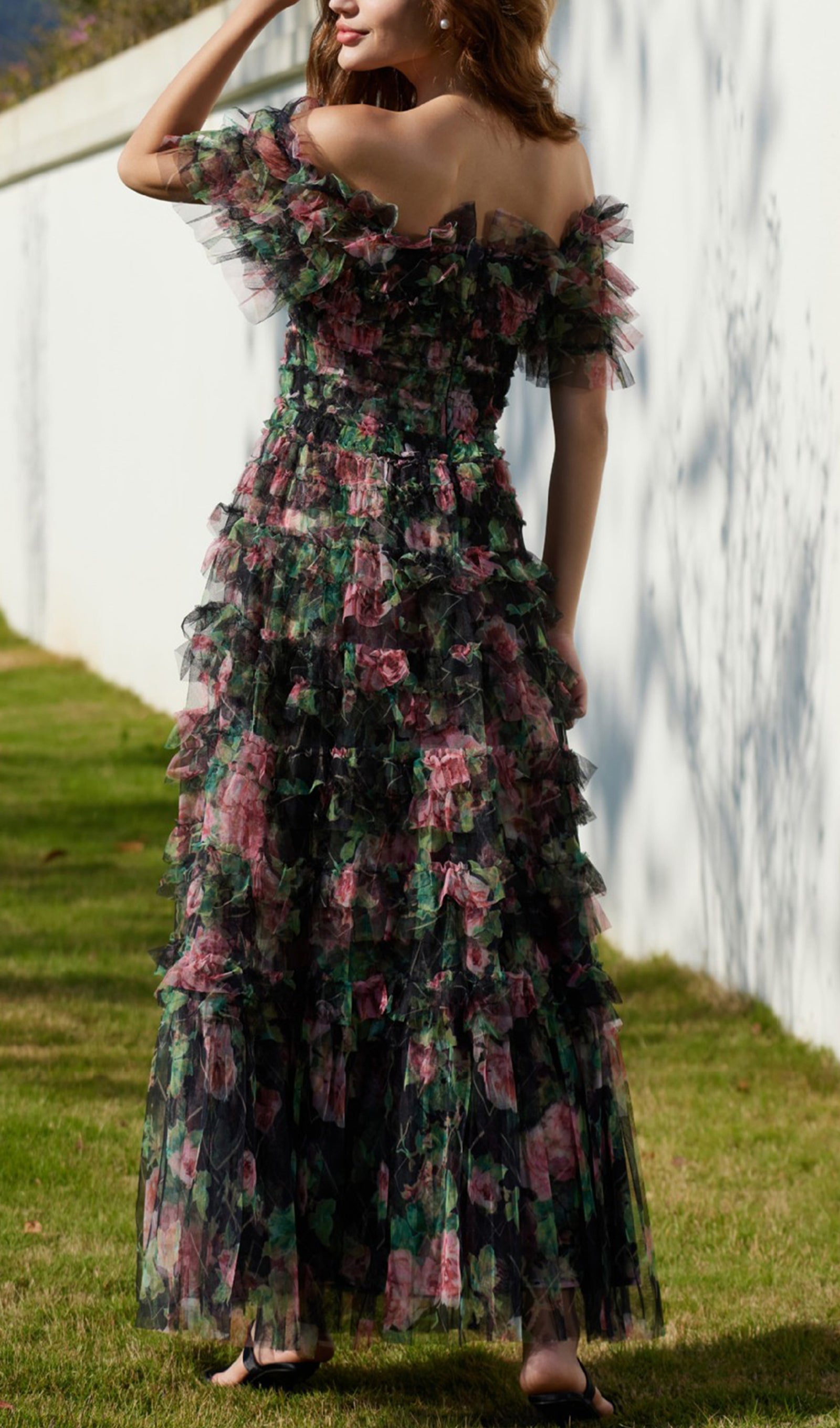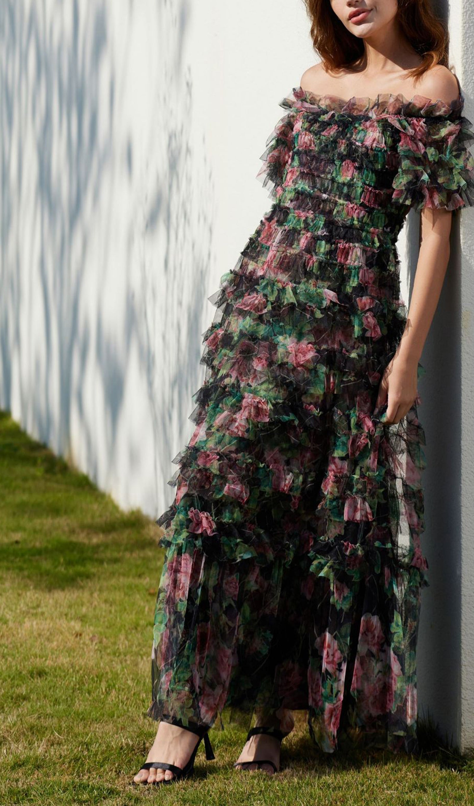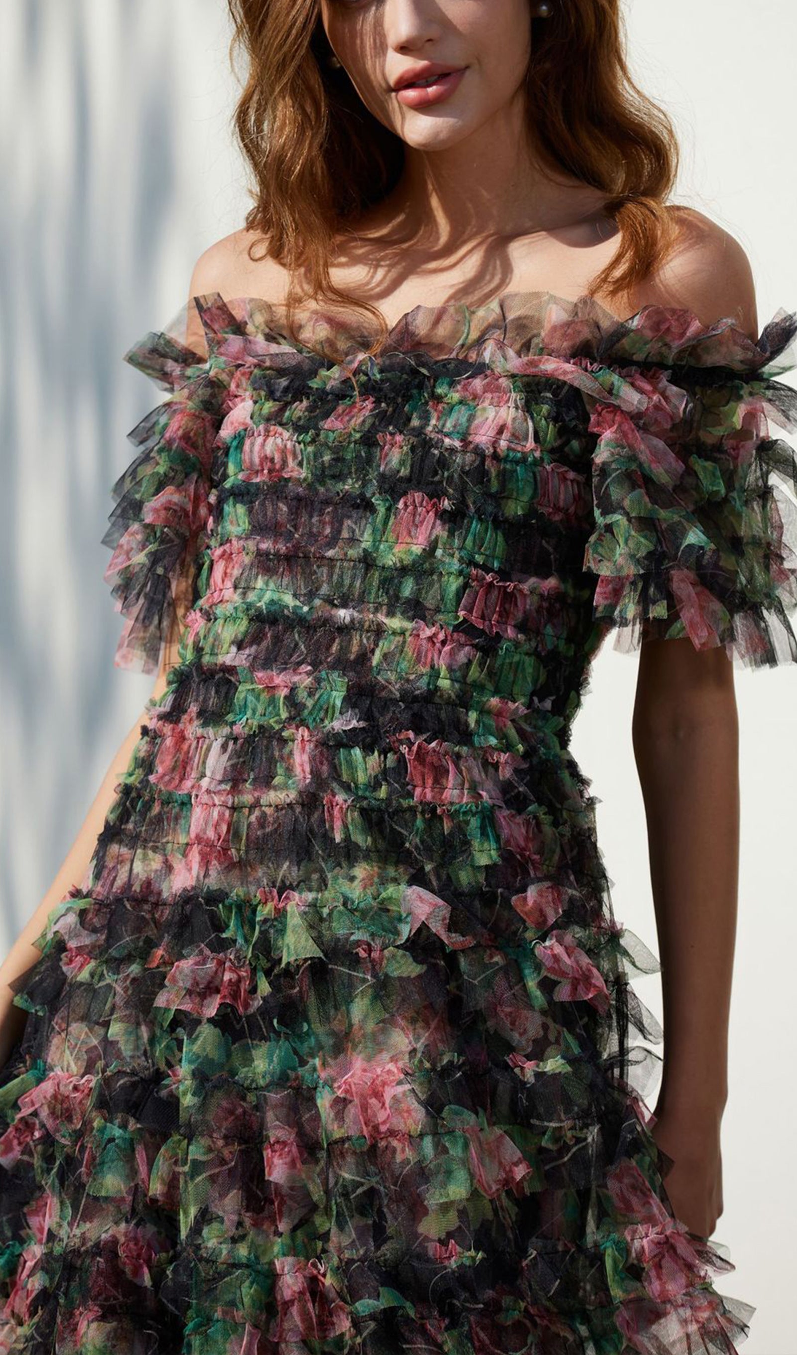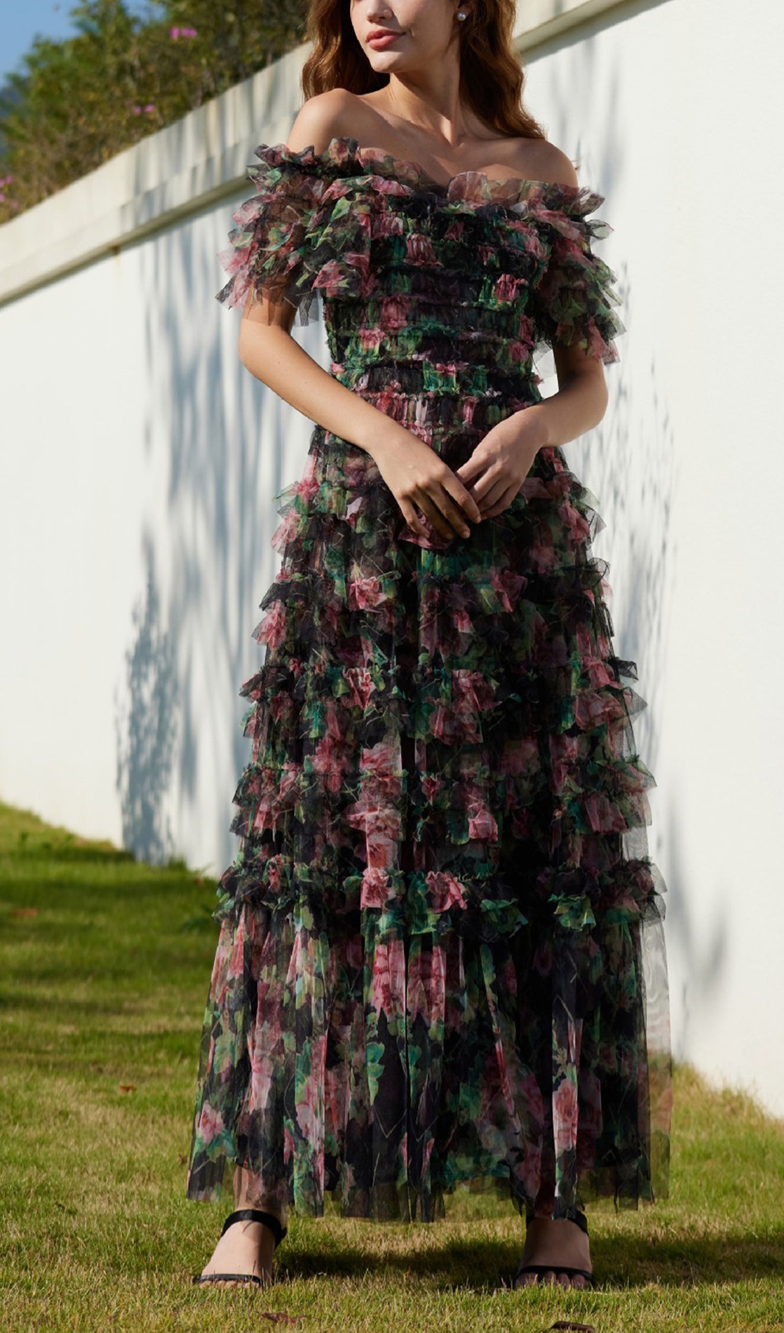 Kapalı Omuz Çiçekli Fırfırlı Örgü Maksi Elbise