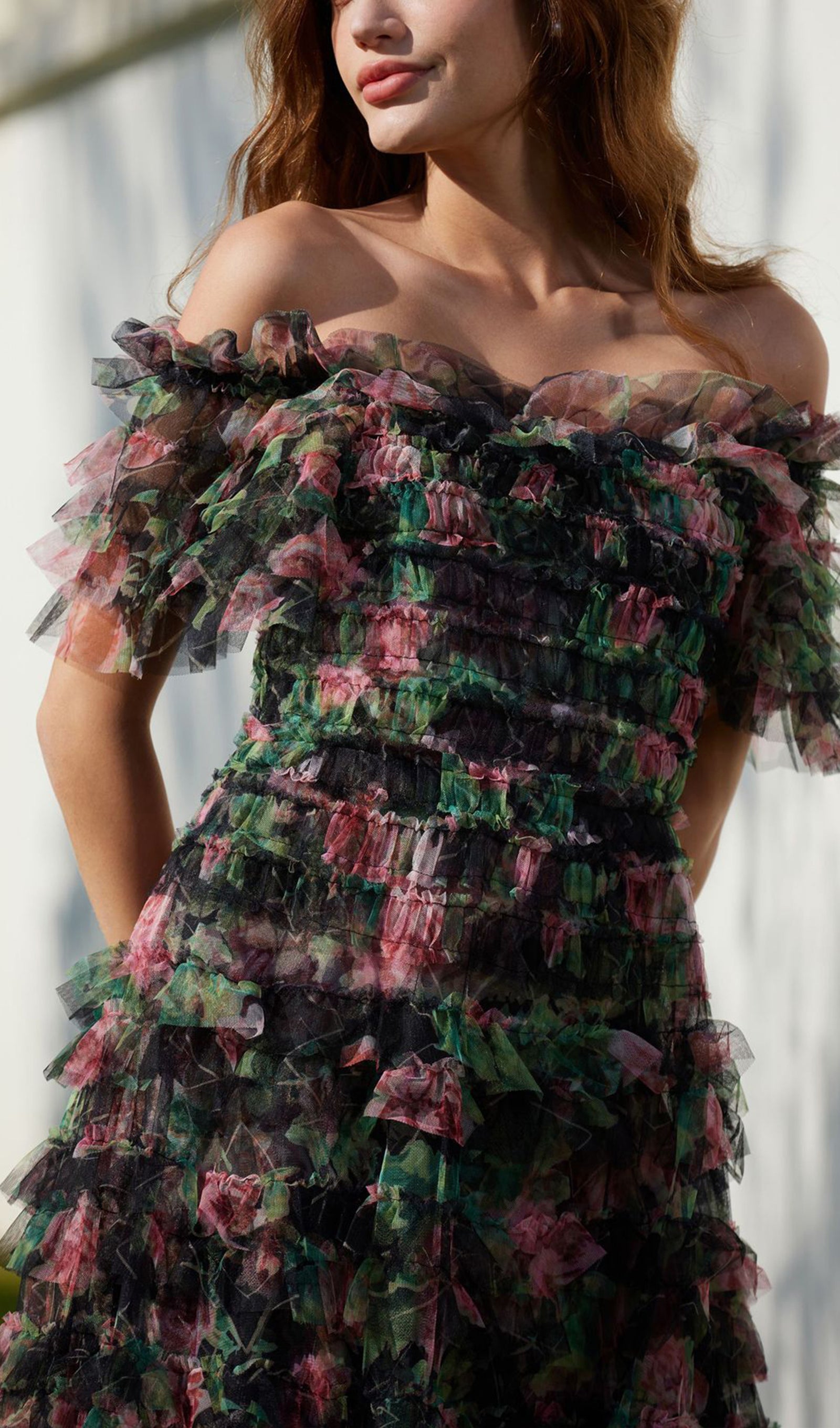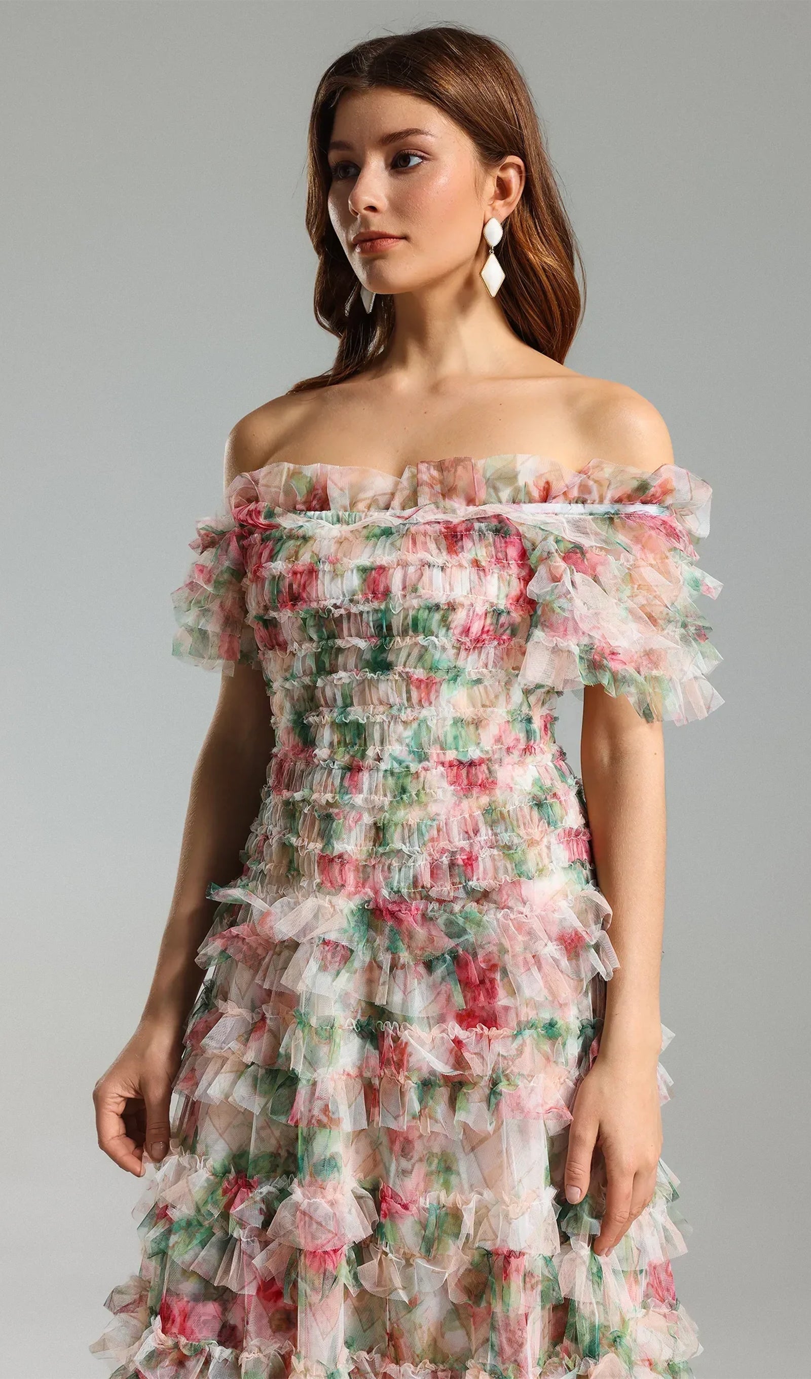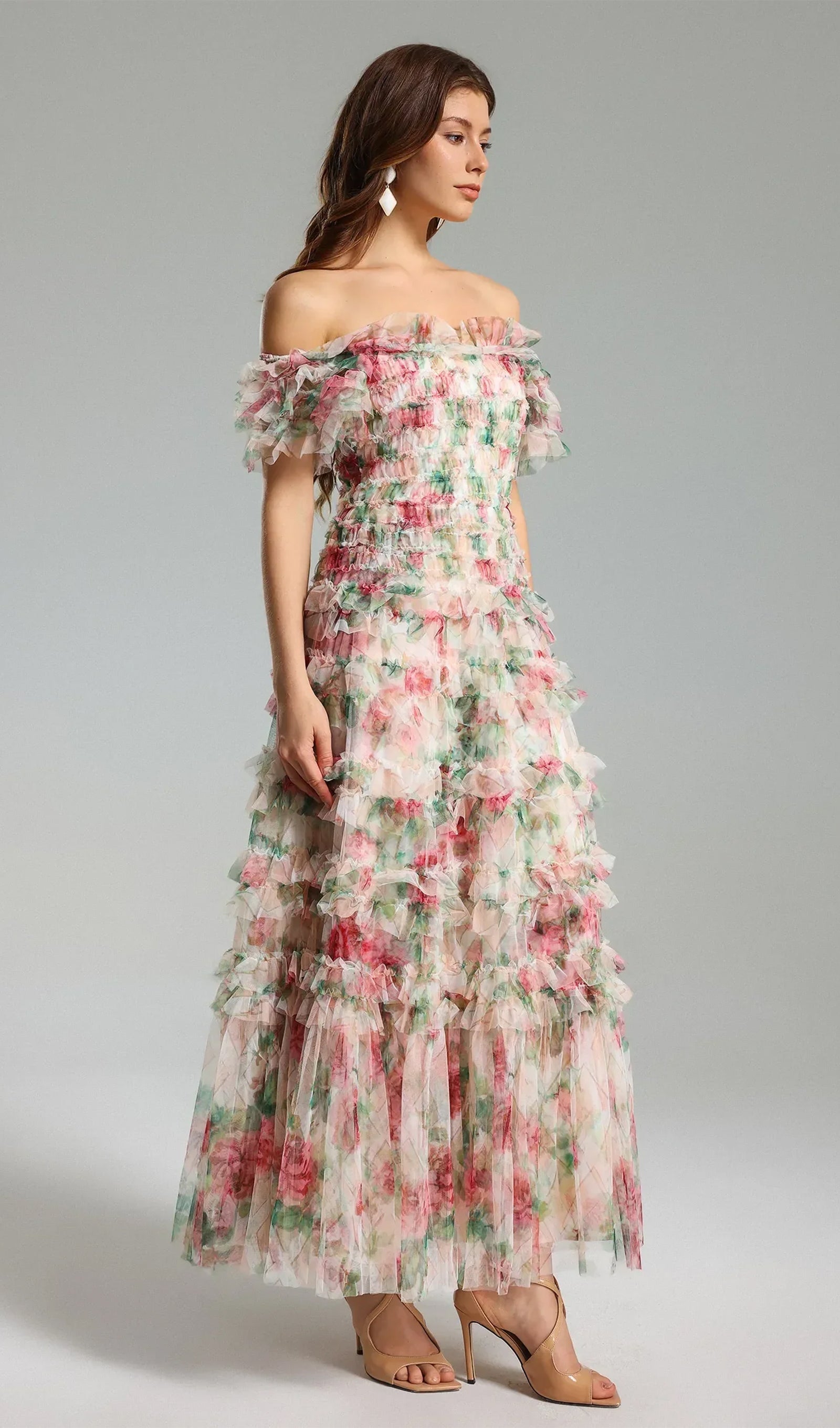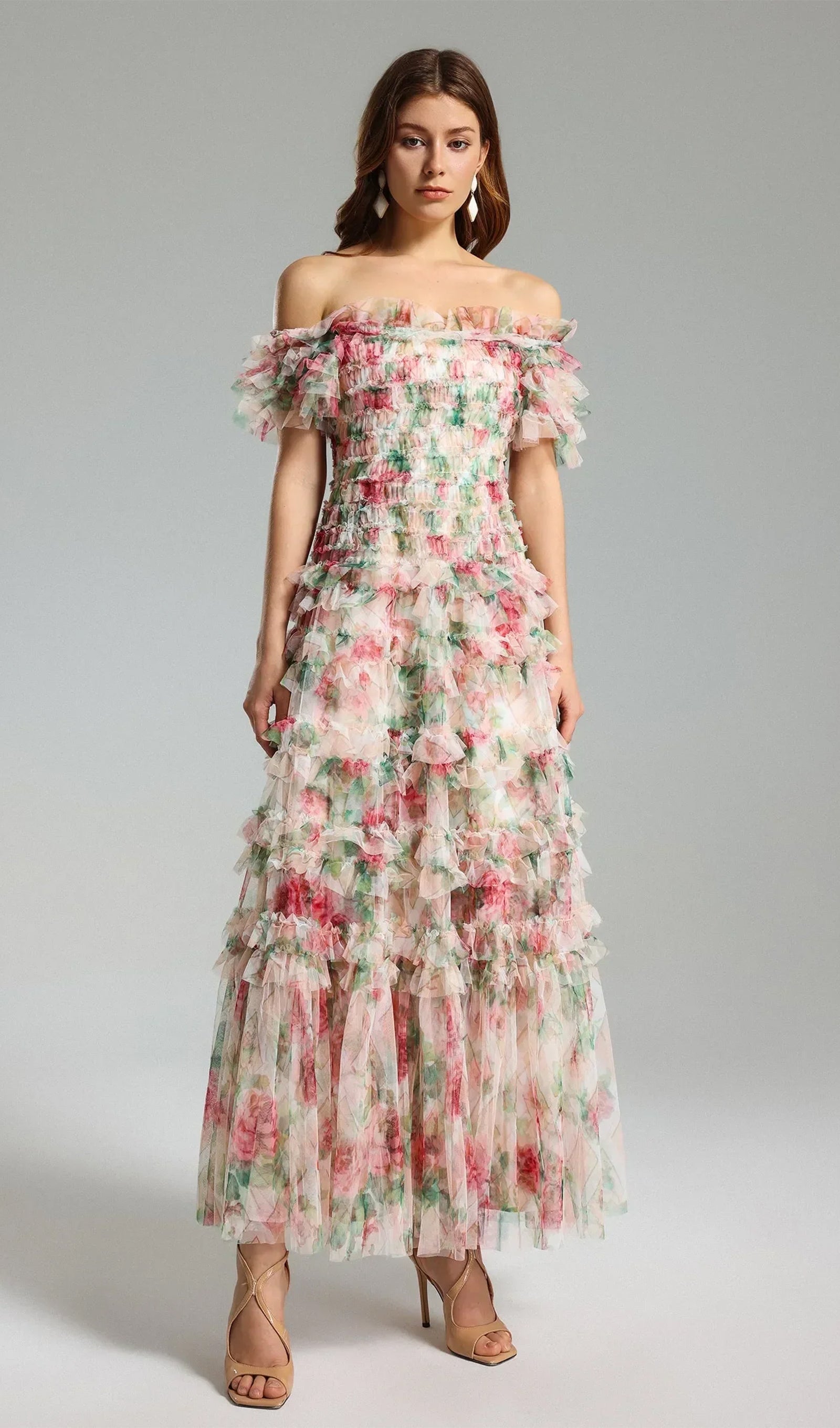 Kapalı Omuz Çiçekli Fırfırlı Örgü Maksi Elbise