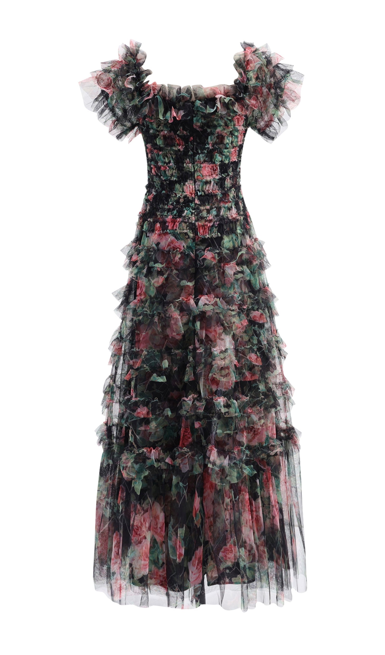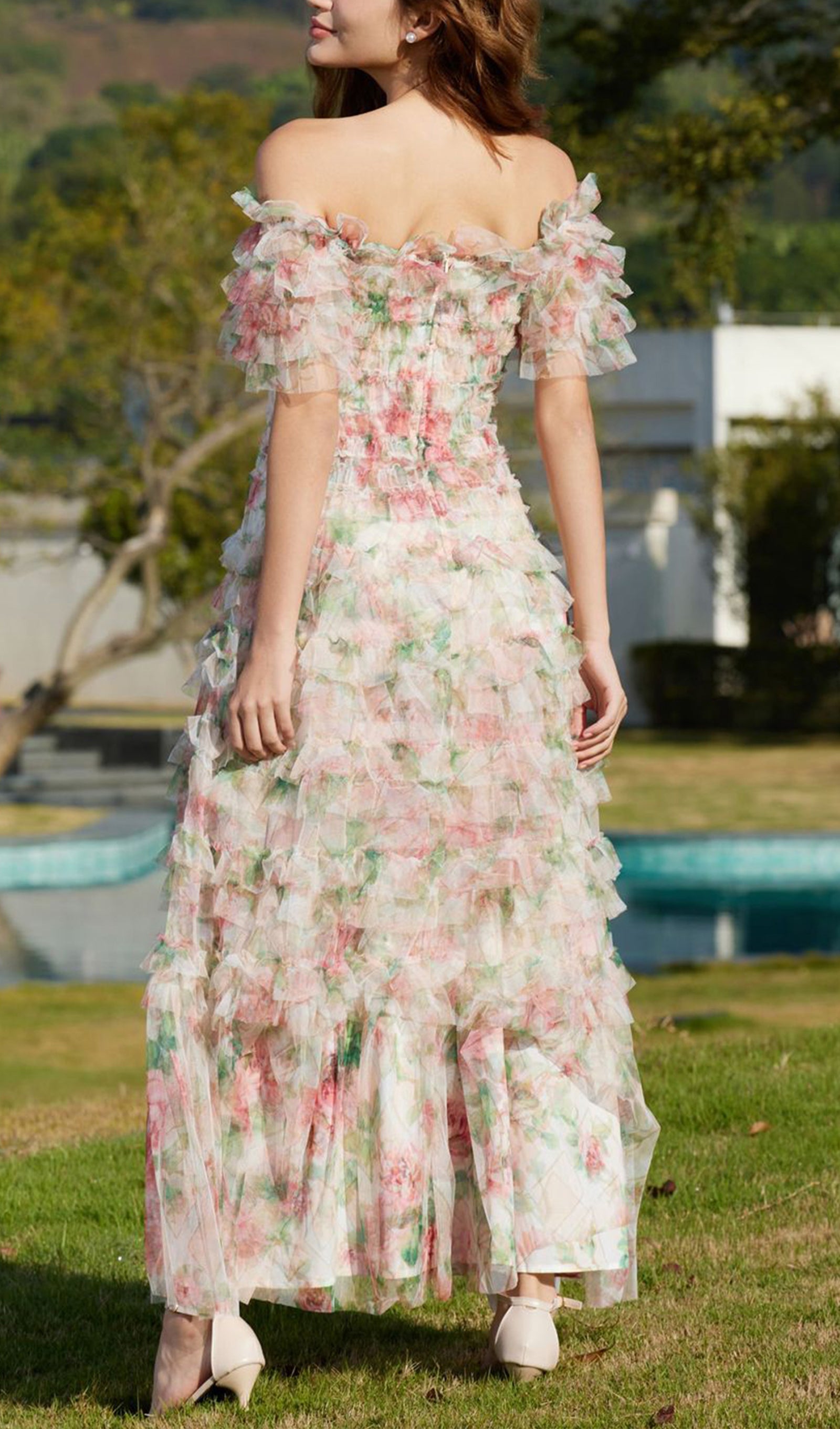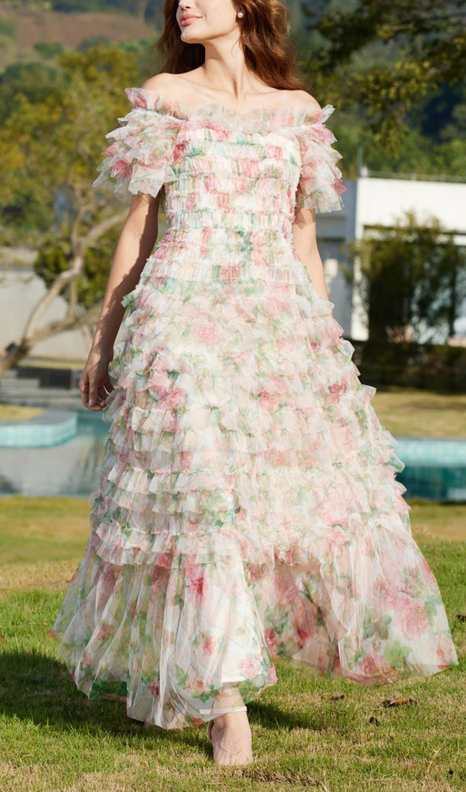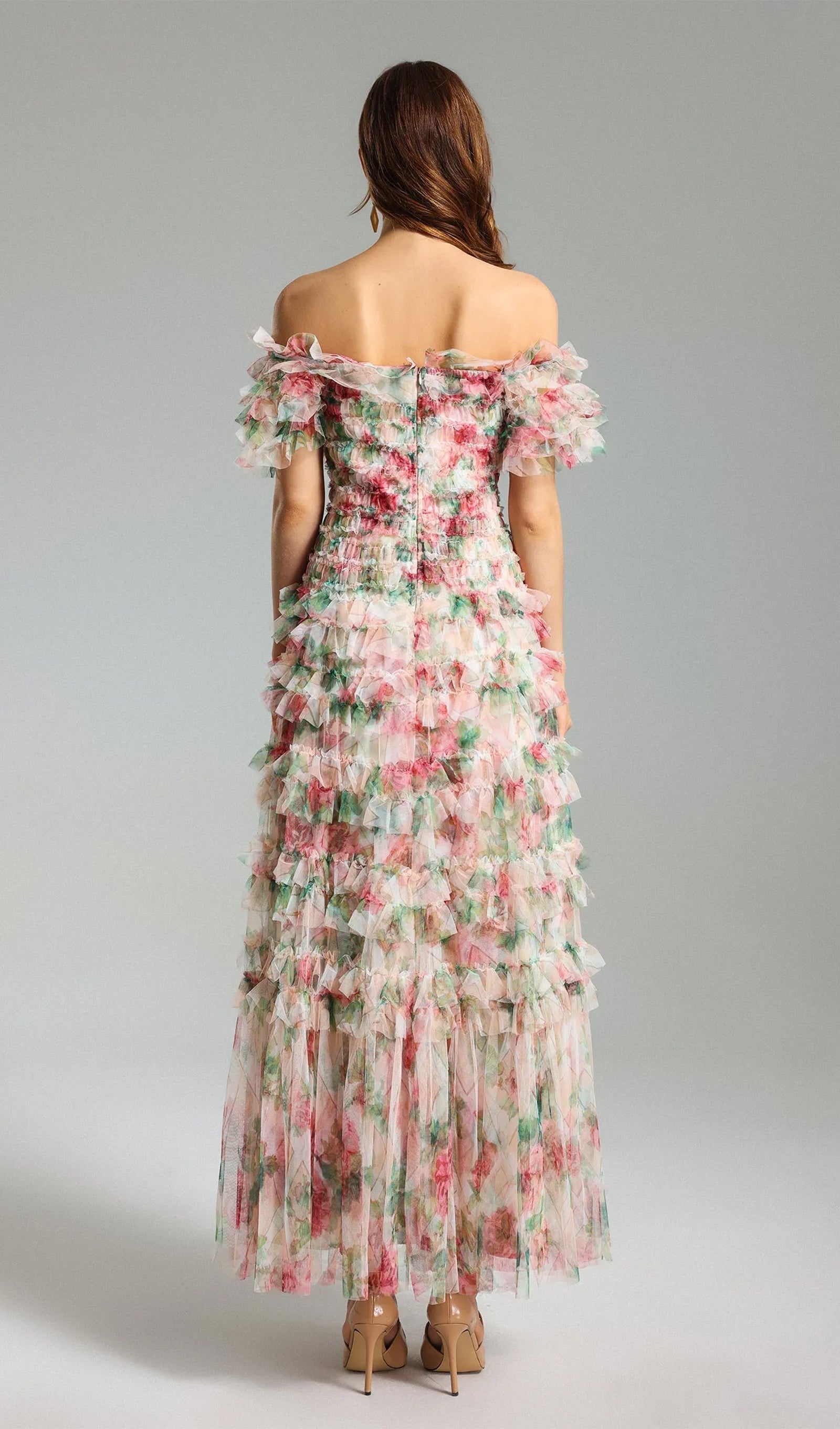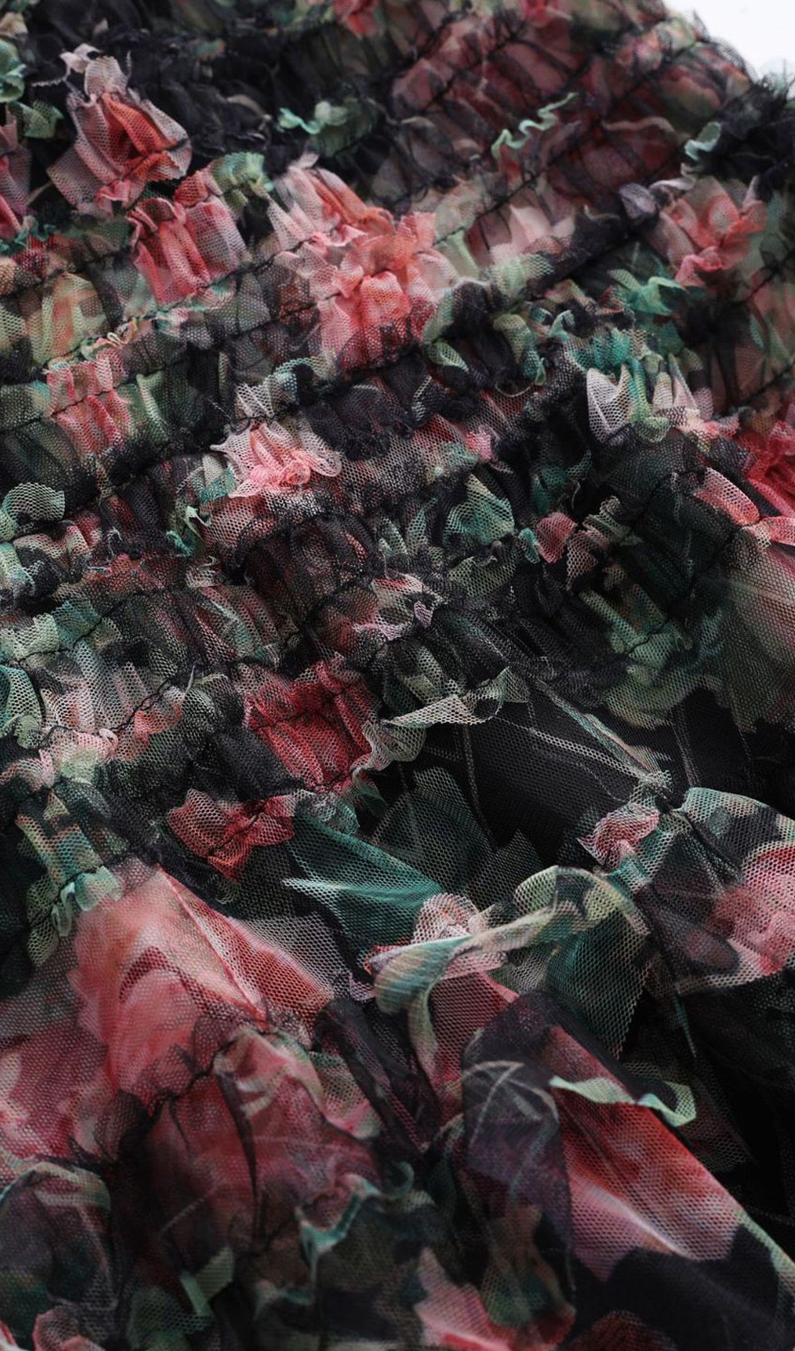 Kapalı Omuz Çiçekli Fırfırlı Örgü Maksi Elbise