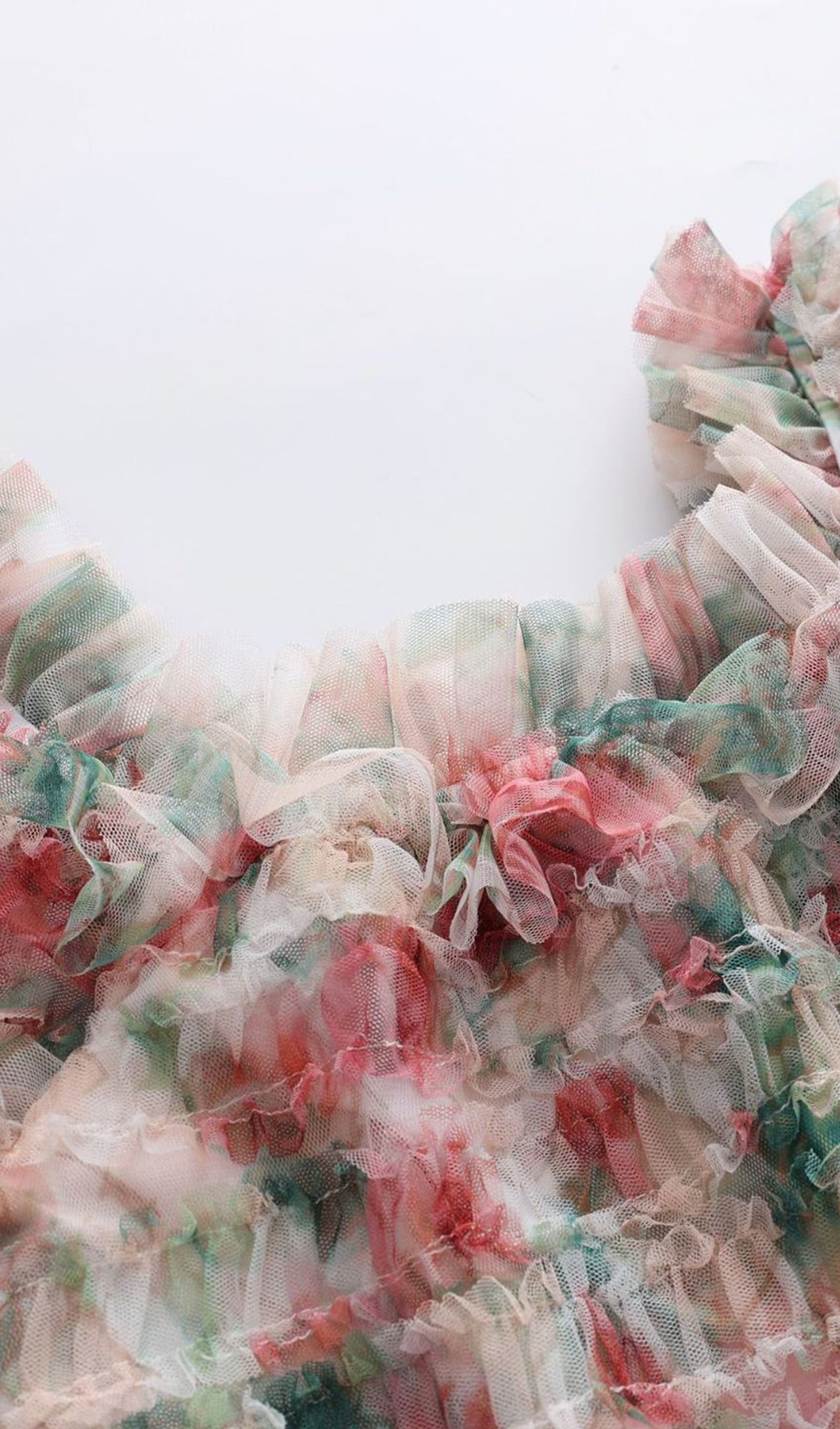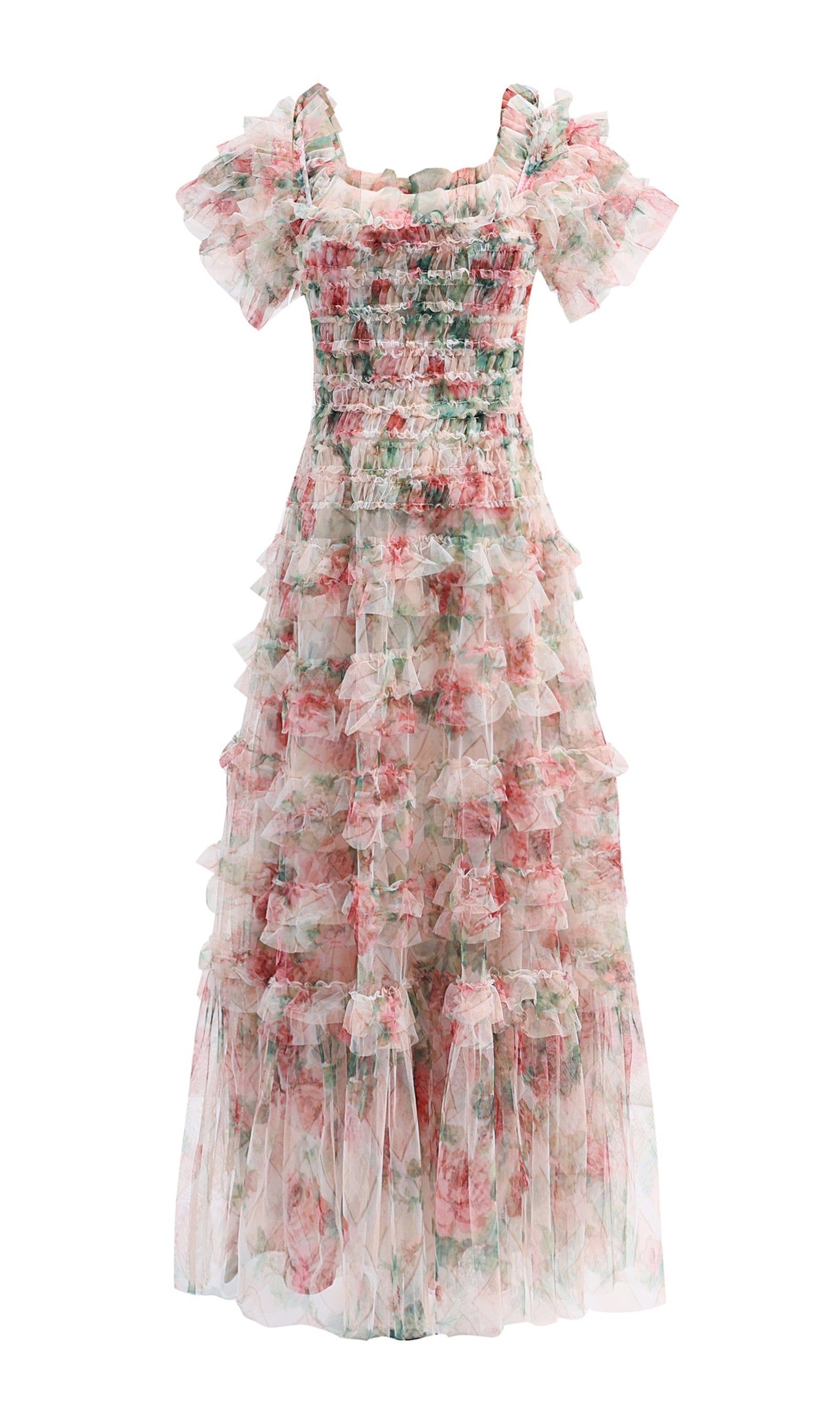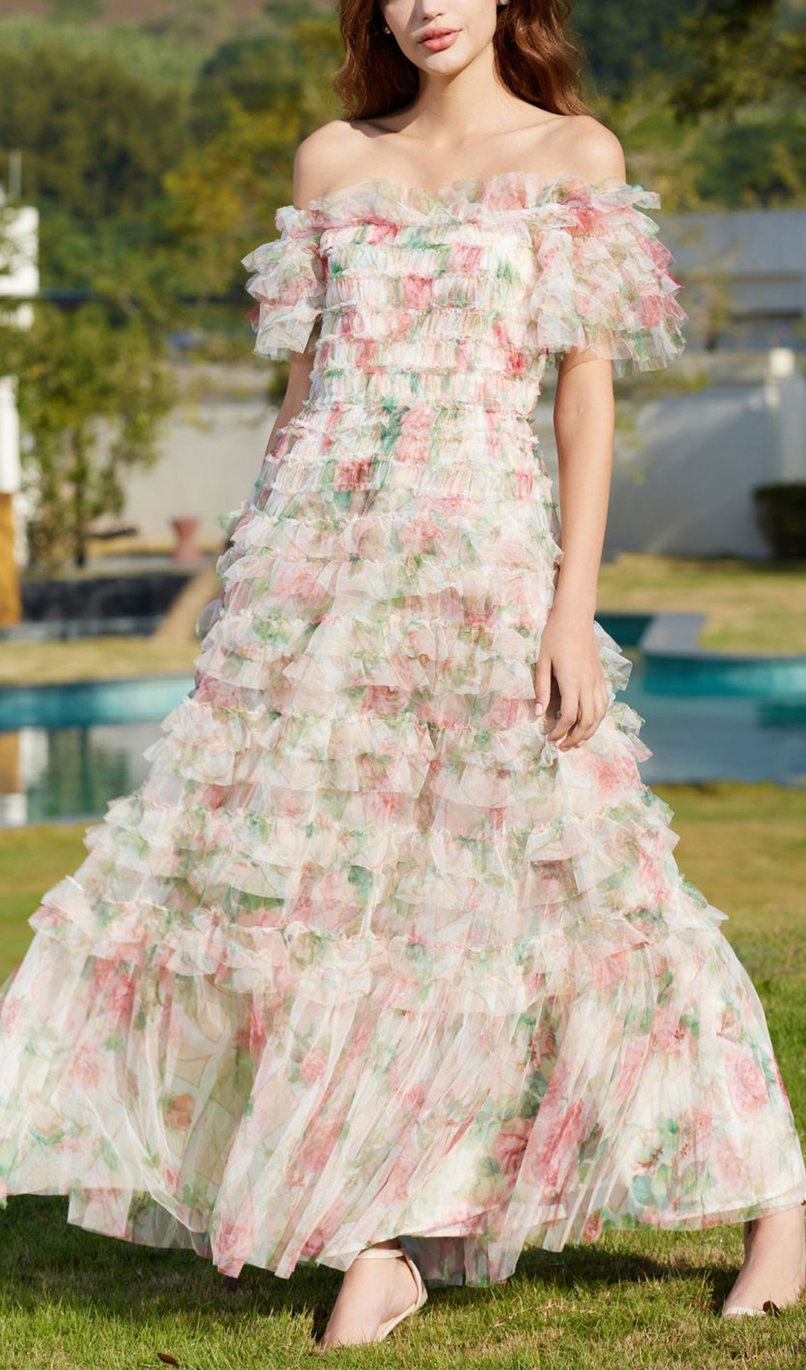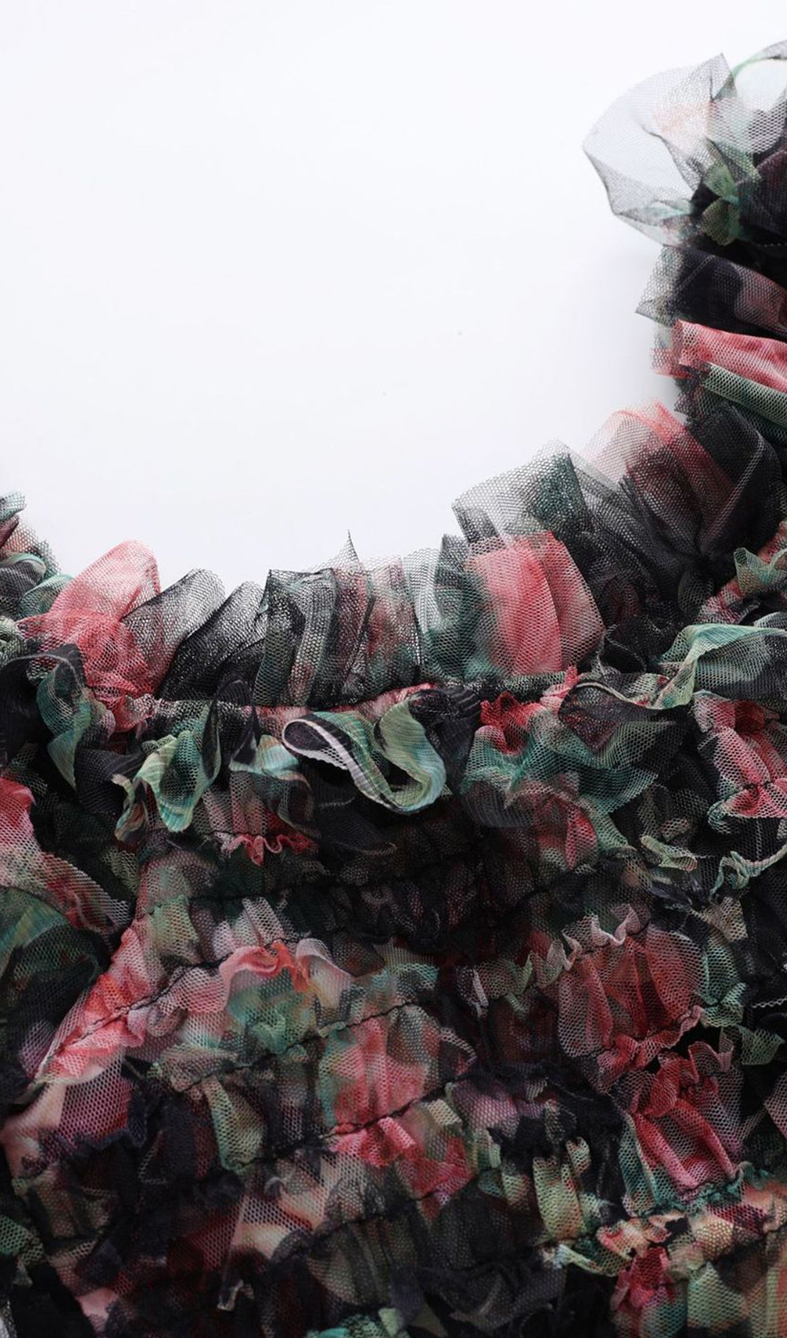 Kapalı Omuz Çiçekli Fırfırlı Örgü Maksi Elbise