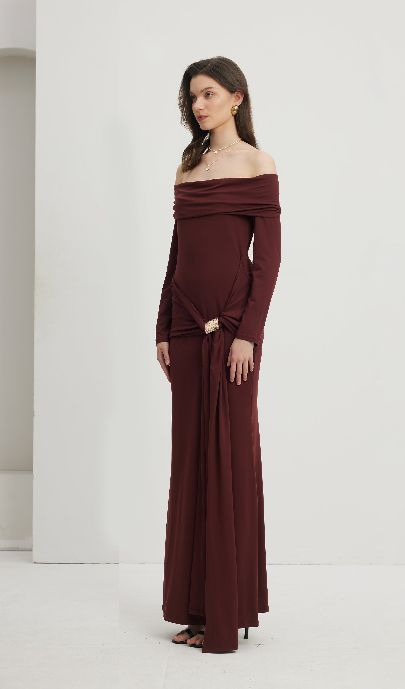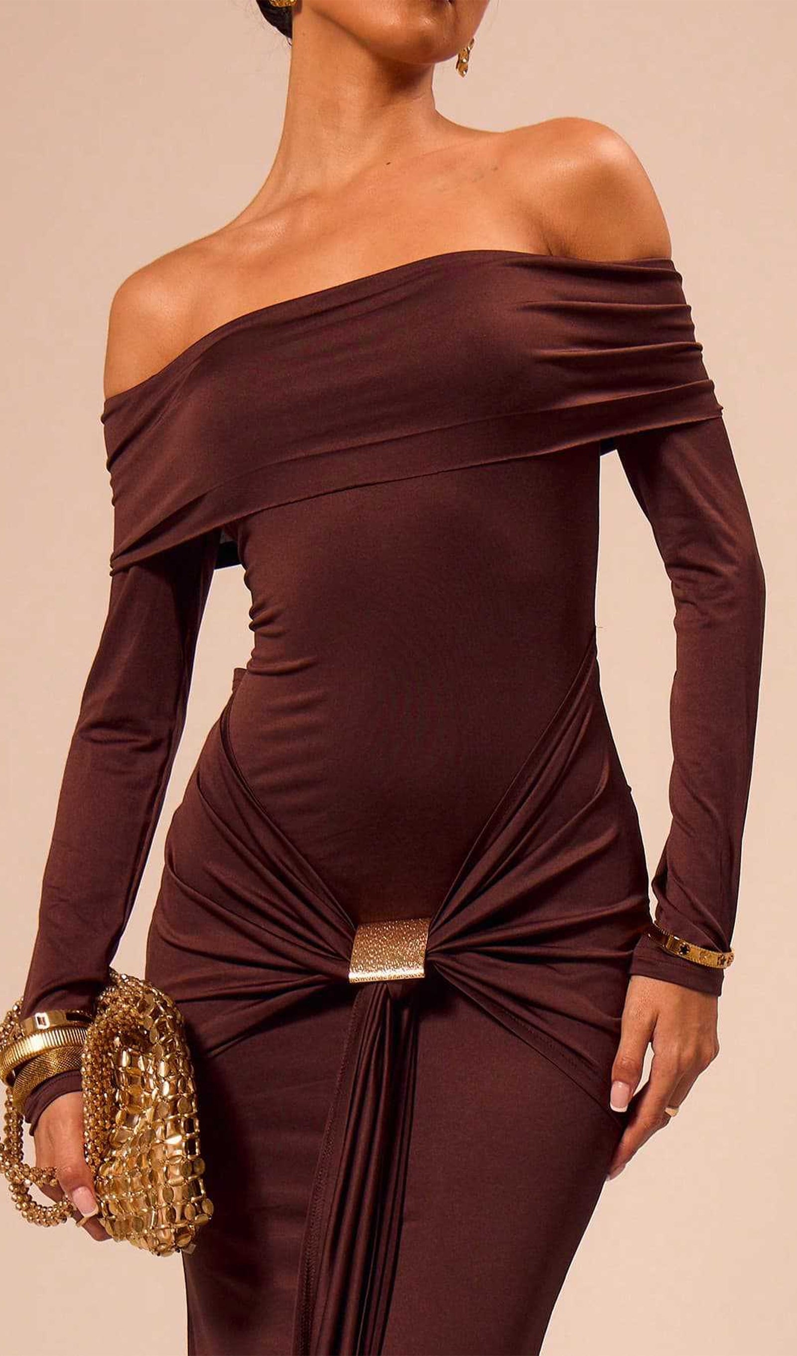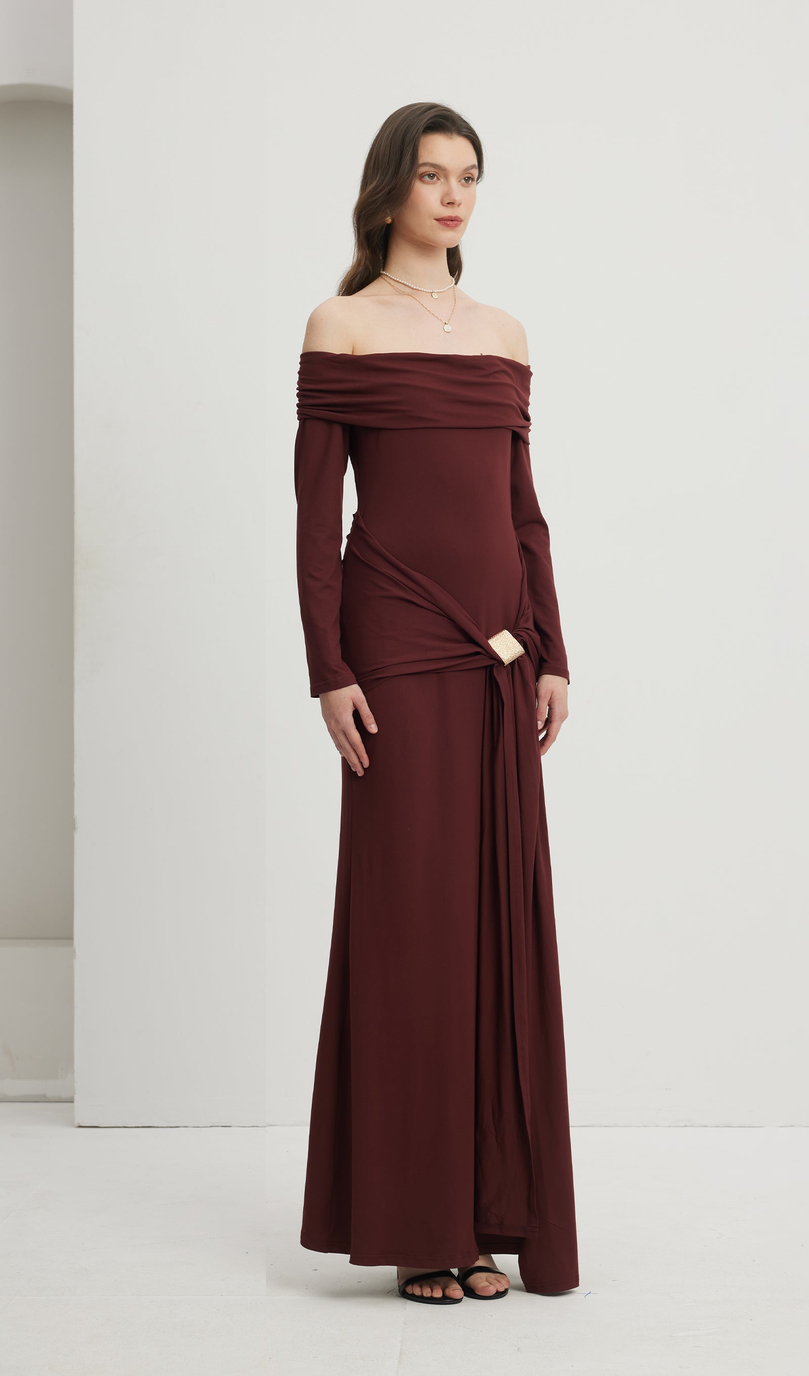 Elbise, uzun kollu, omuzları açık, kat kat yakalı ve fırfırlı etek katmanına sahip maksi bir elbisedir. Esnek bodycon kumaşı, kıvrımları düzleştiren klasik, zarif bir siluet oluşturur. Streç jarseden üretilen model, bel kısmında vurgulu metalik bir süslemeye sahiptir ve hem şehvetli hem de sofistike bir görsel yaratır.