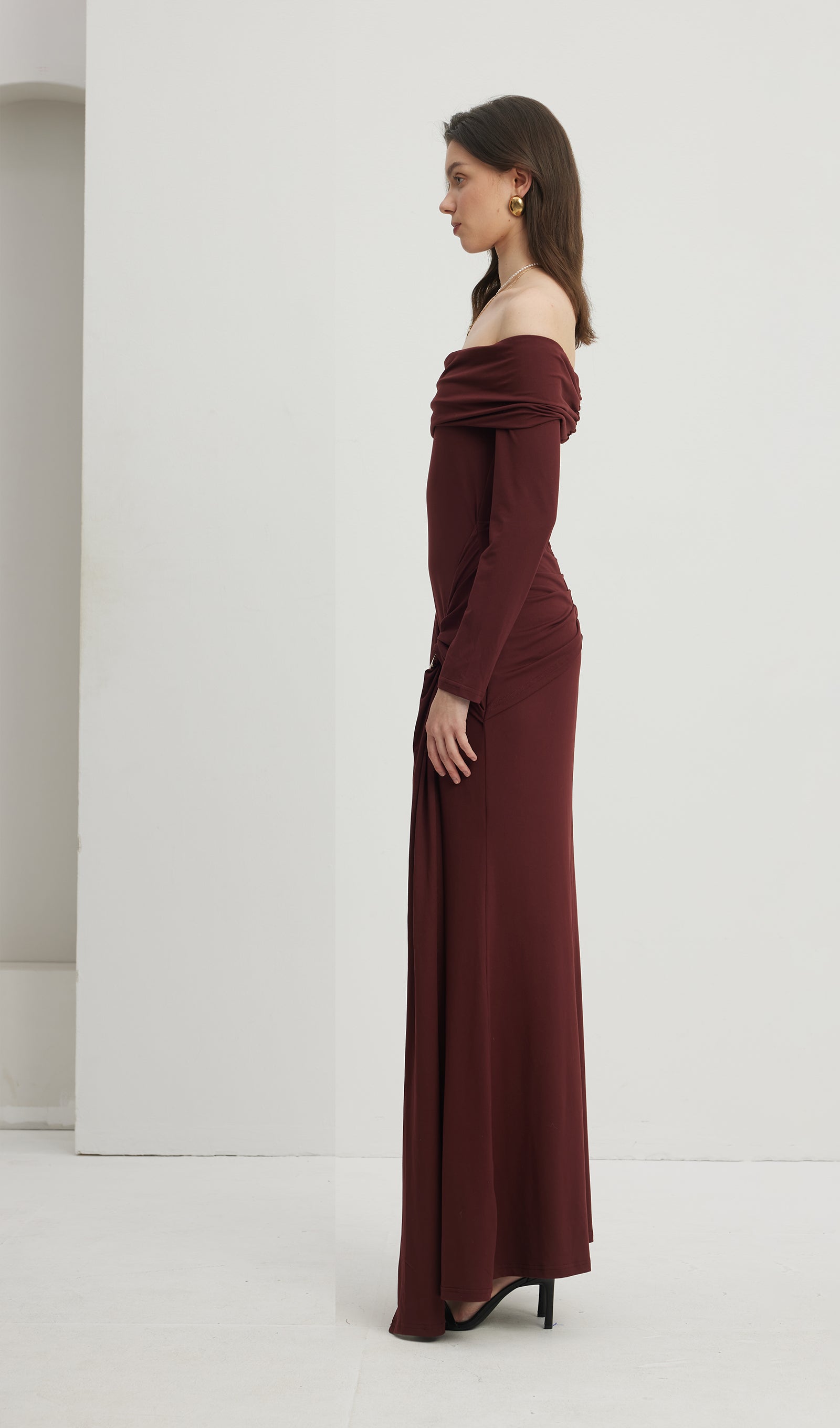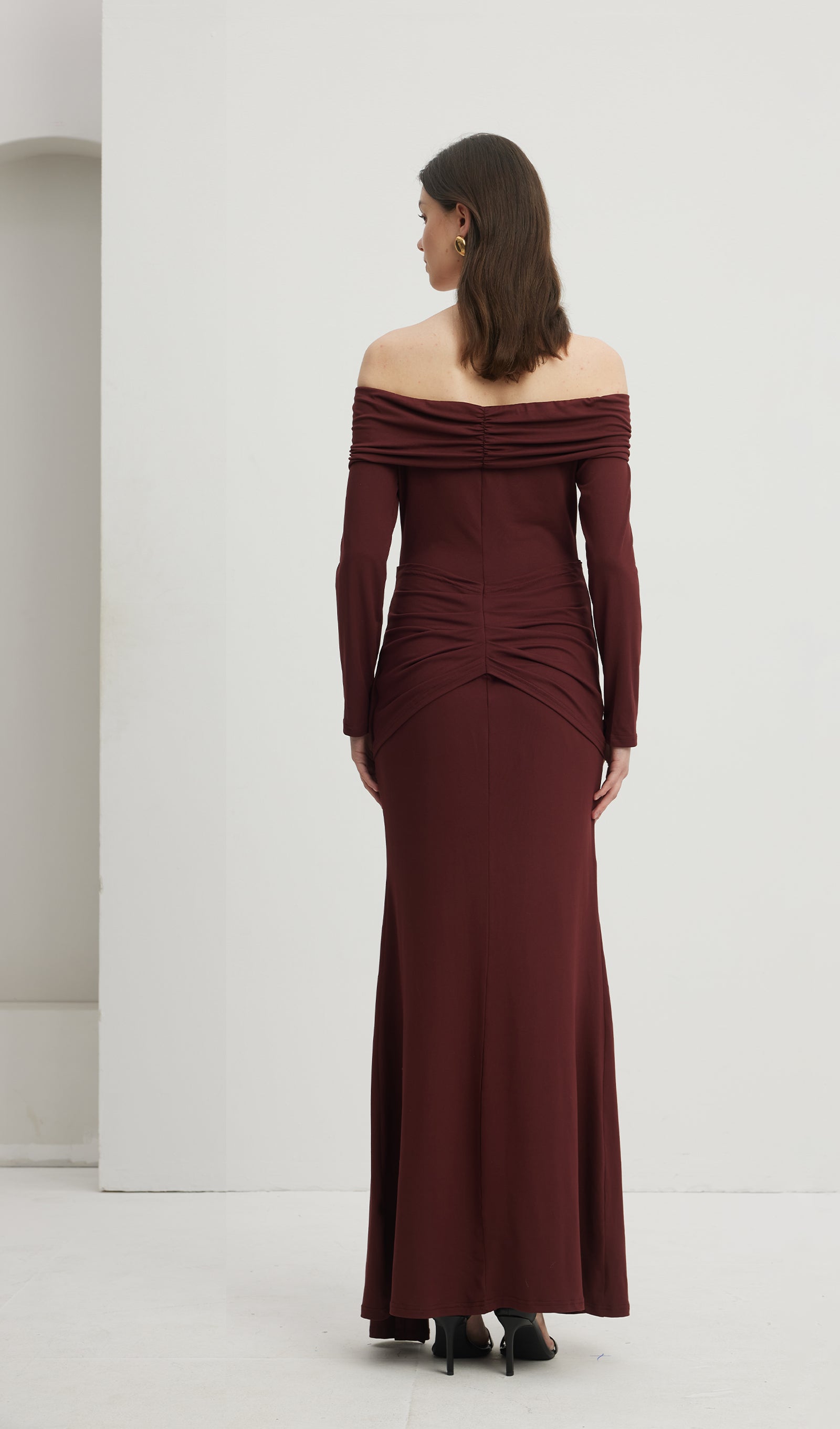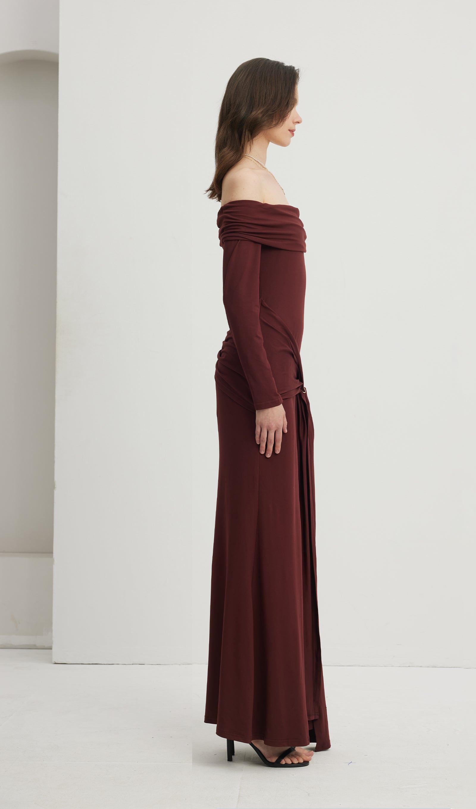 Kapalı Omuz Fırfırlı Maksi Elbise Kırmızımsı Kahverengi