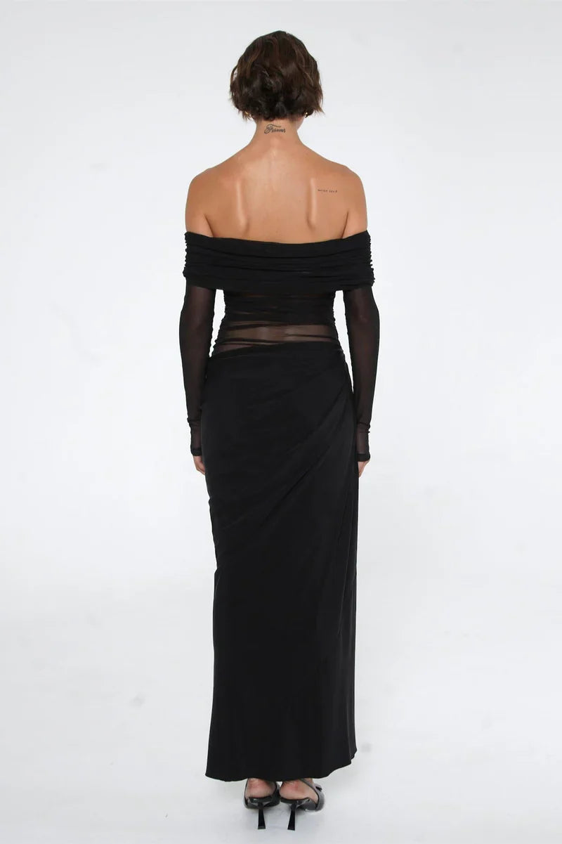Maxi Elbise ile dikkatleri üzerinize çekin. Yarı şeffaf streç örgüden üretilen bu elbise, omuzları açık tasarımı ve eğlenceli fırfırlı etek ucuyla gece görünümünüze dramatik bir dokunuş katmak için mükemmeldir.