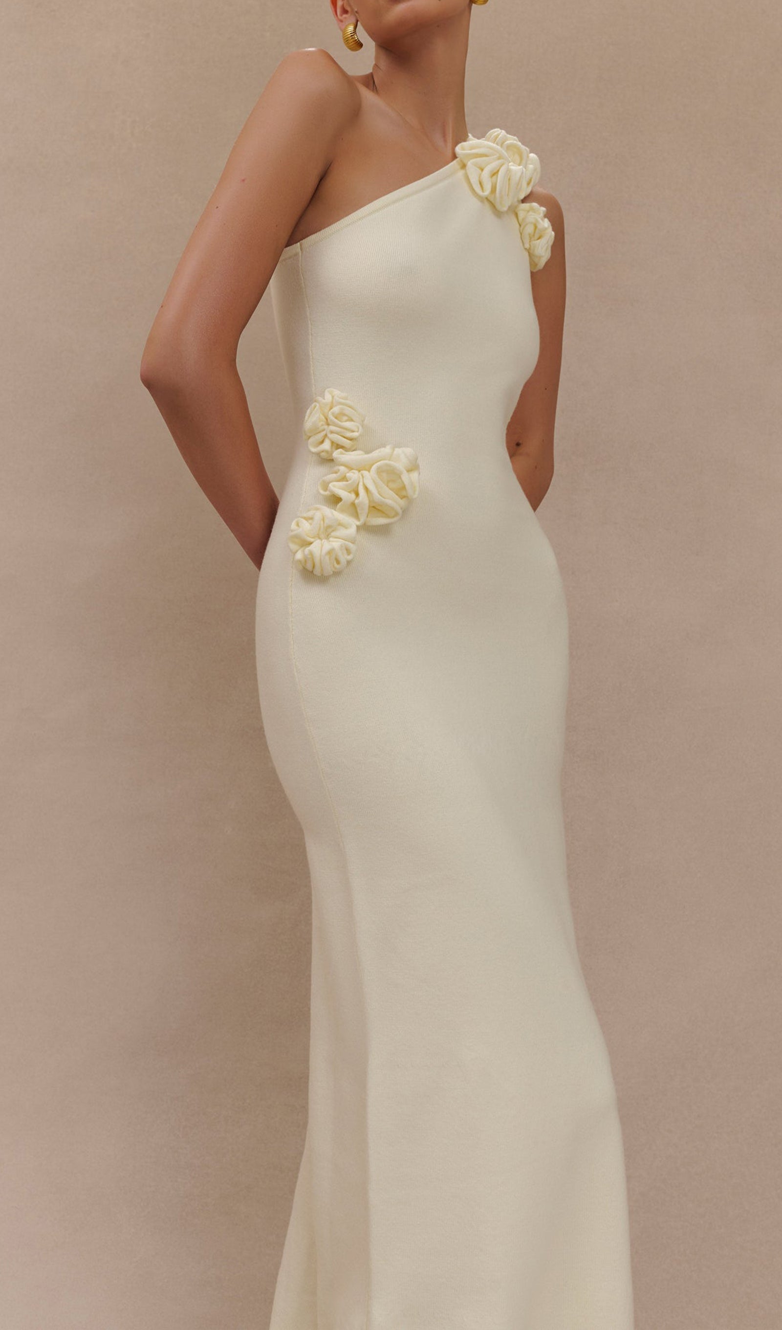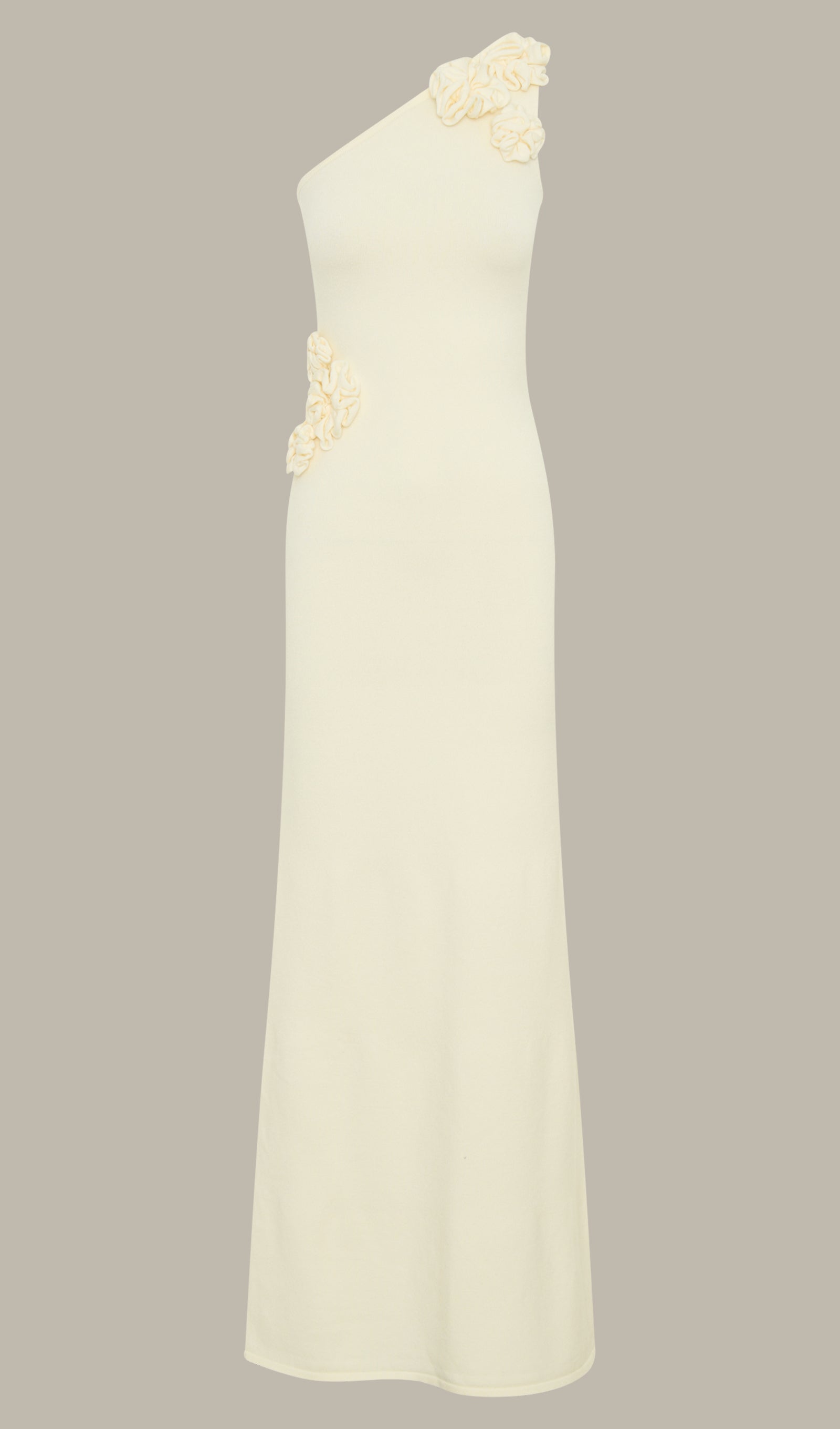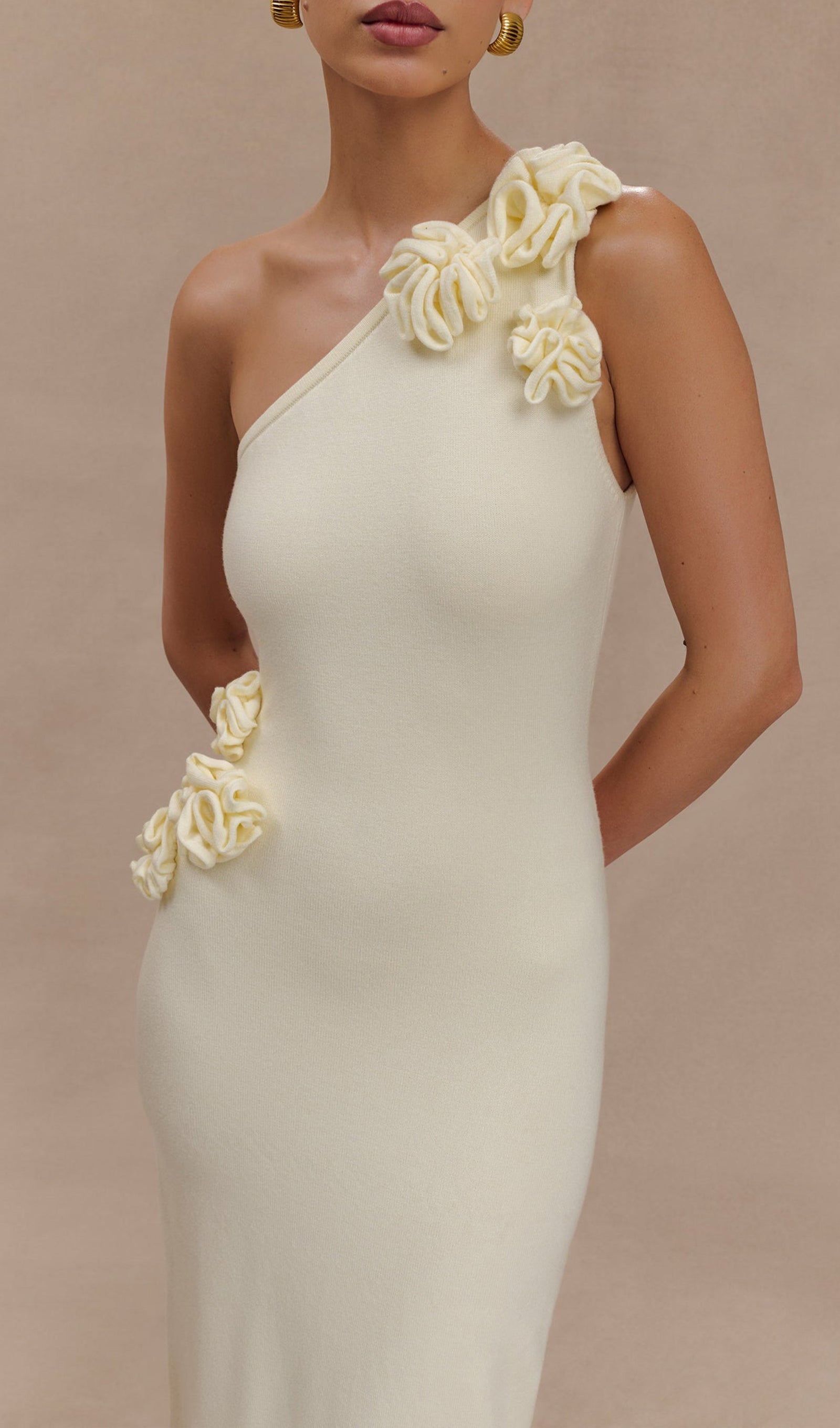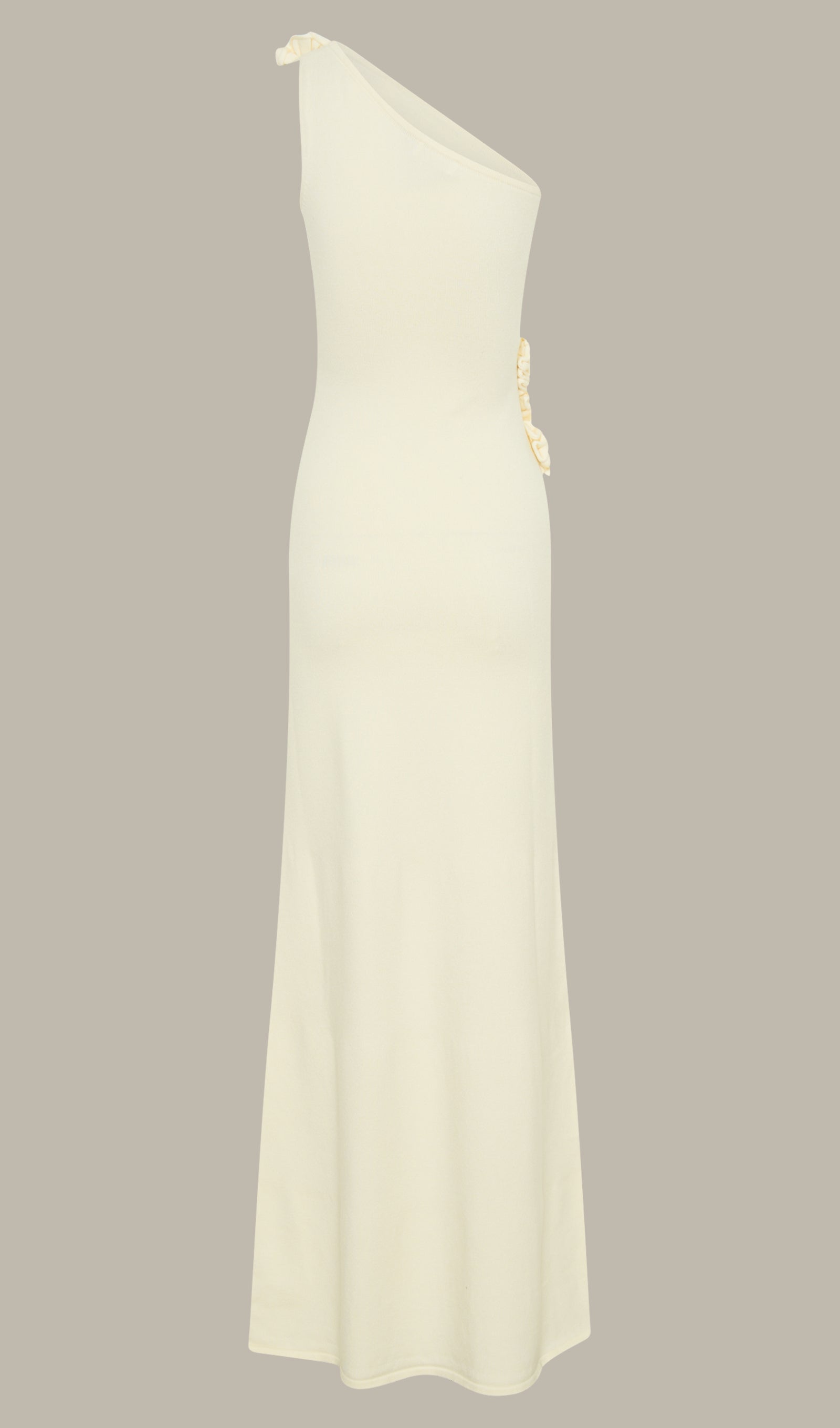 Tek Omuz Çiçekli Örgü Maksi Elbise - Fildişi
