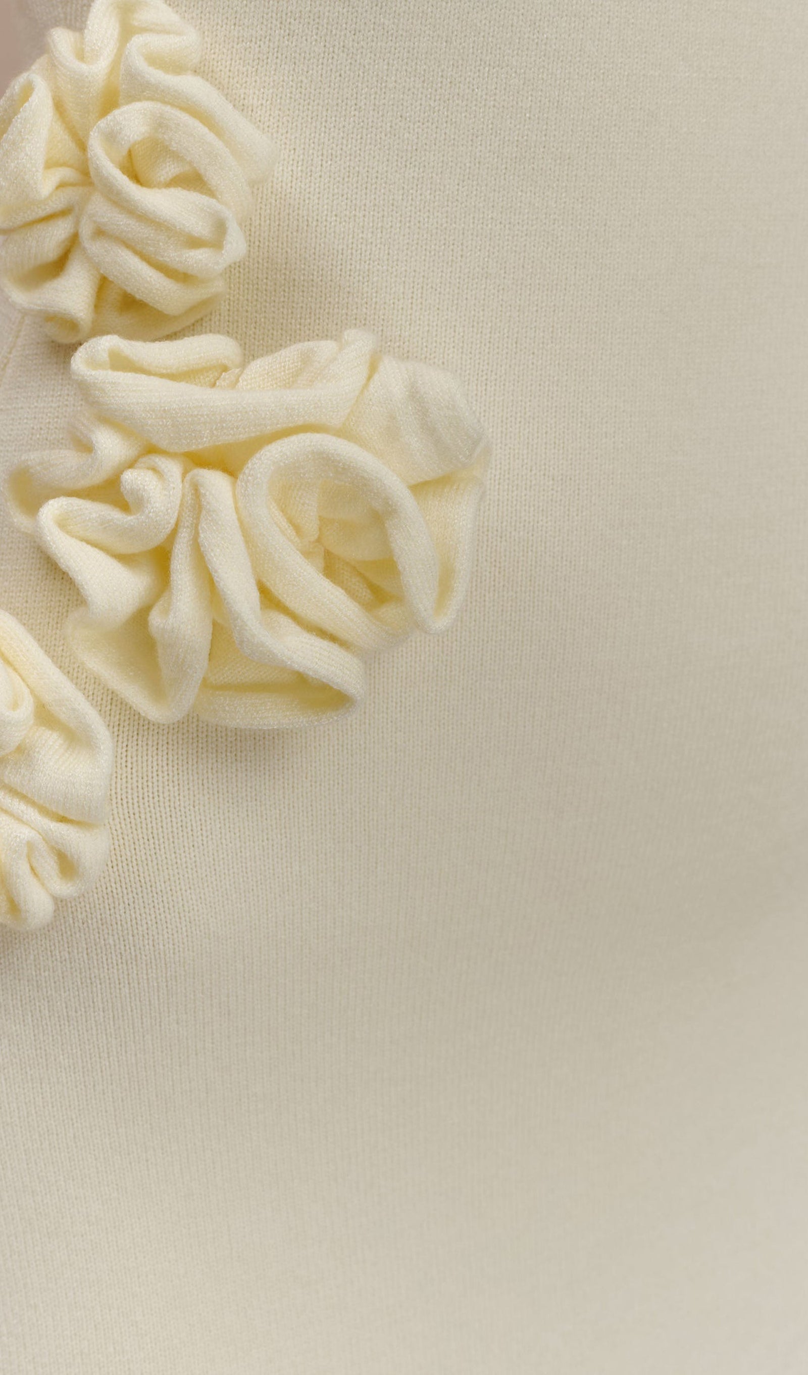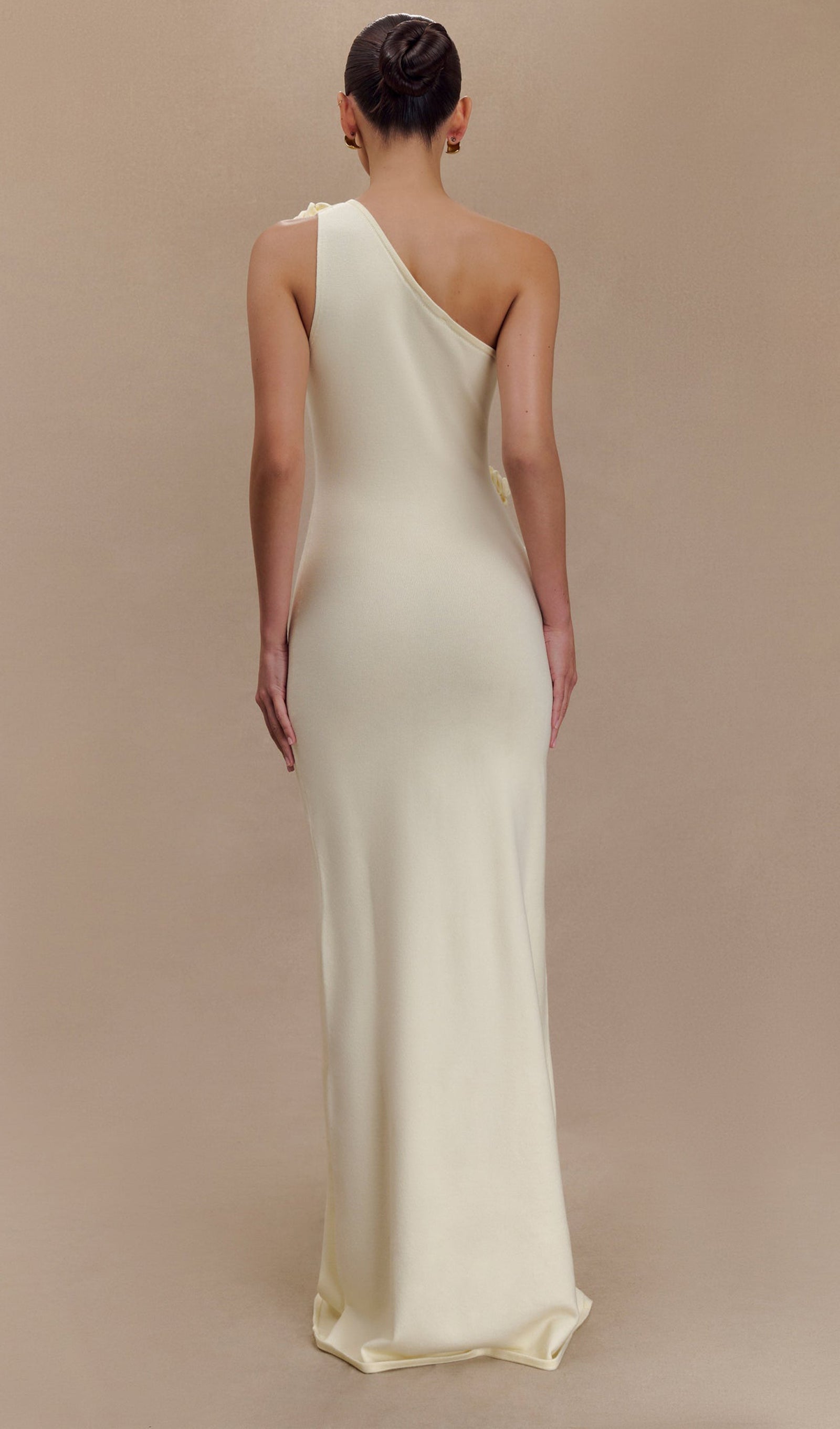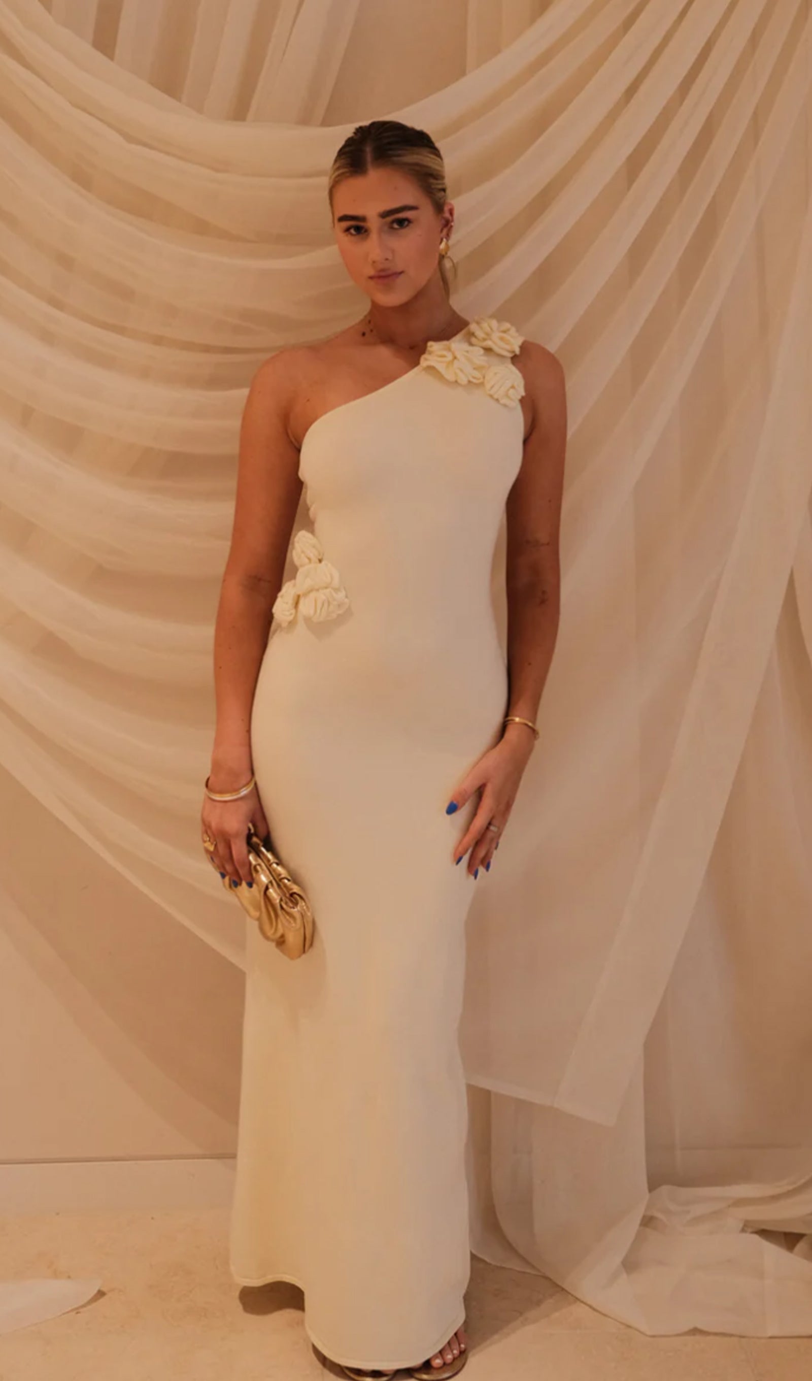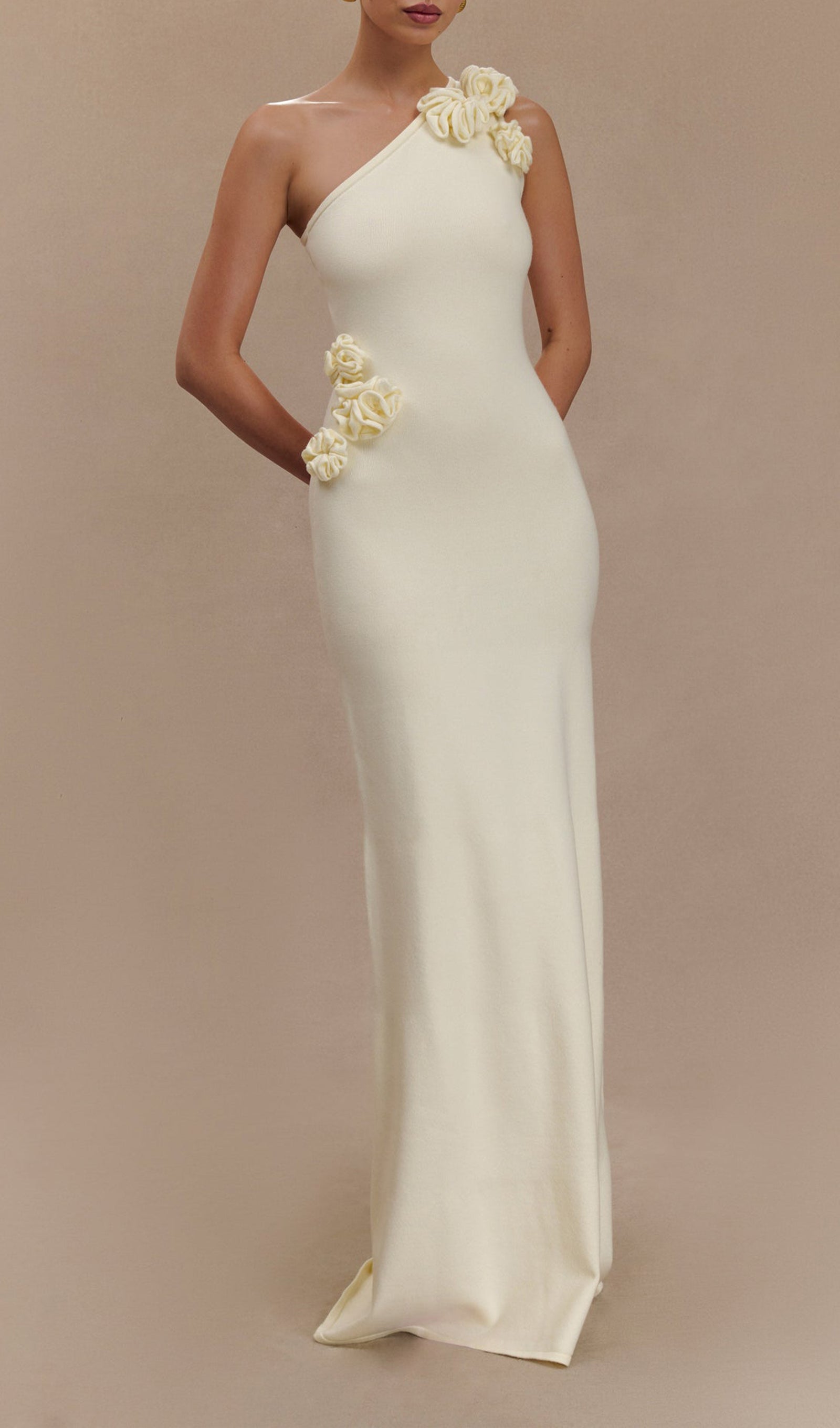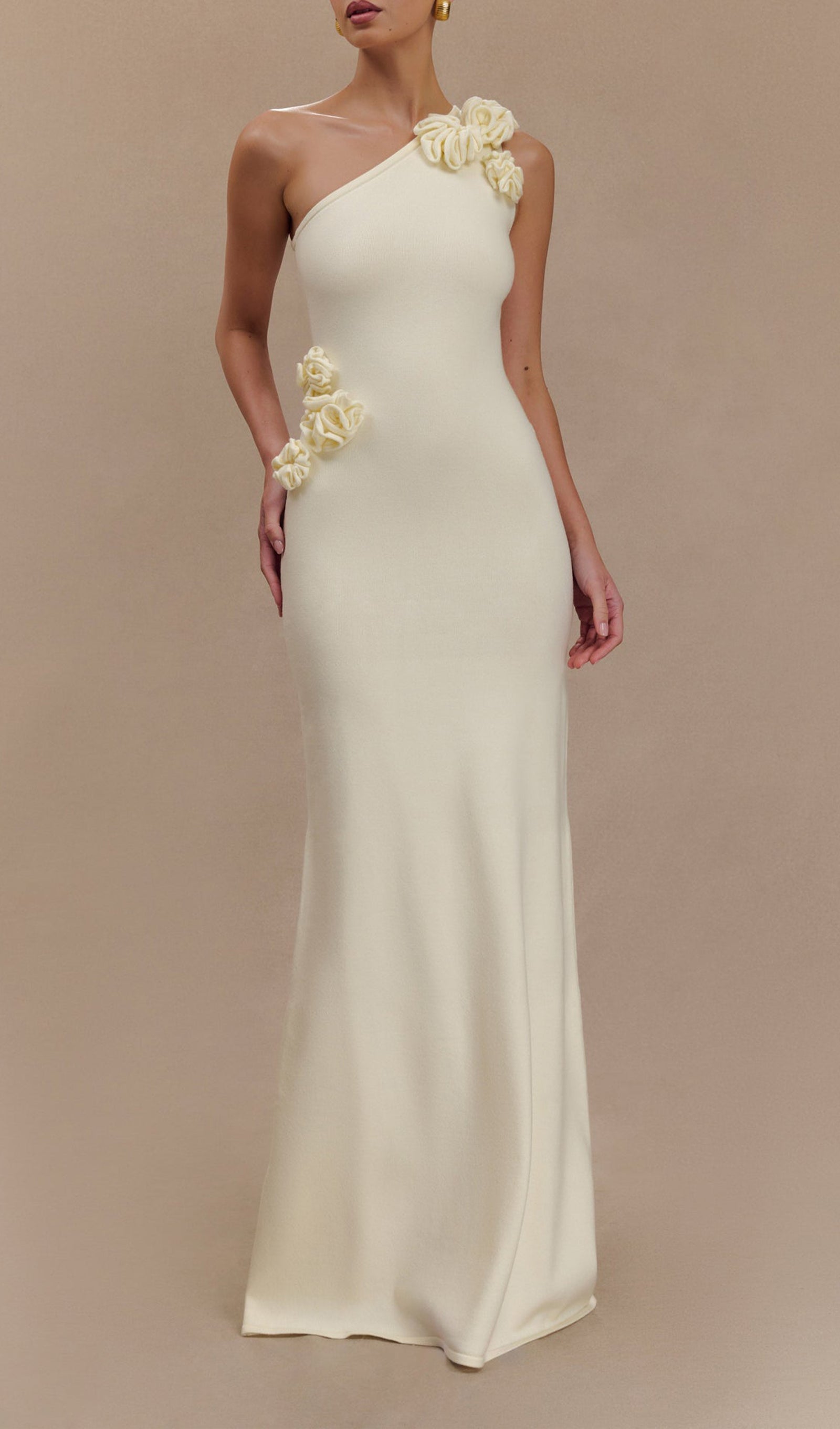 Tek Omuz Çiçekli Örgü Maksi Elbise - Fildişi
