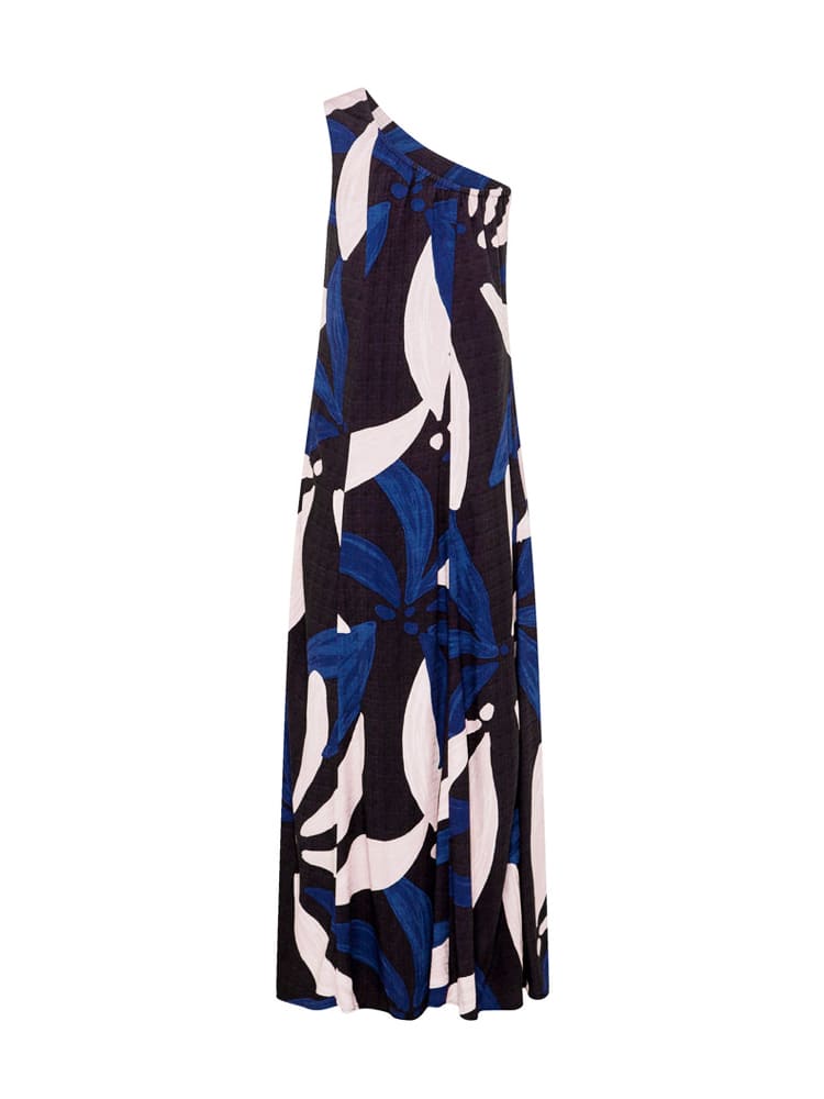Bu koyu kırmızı renkteki tek omuzlu bağcıklı maksi elbiseyle tüm gözleri üzerinize çekin. Tropikal lacivert rengiyle cesur ve şık bir ifade yaratan bu maksi elbise, omuzların cazibesini ustaca sergileyen şık tek omuz deseniyle birlikte büyüleyici bir görünüme sahiptir. Topuklu ayakkabılar ve tamamlayıcı altın rengi detaylarla eşleştirerek genel görünümü yükseltin.