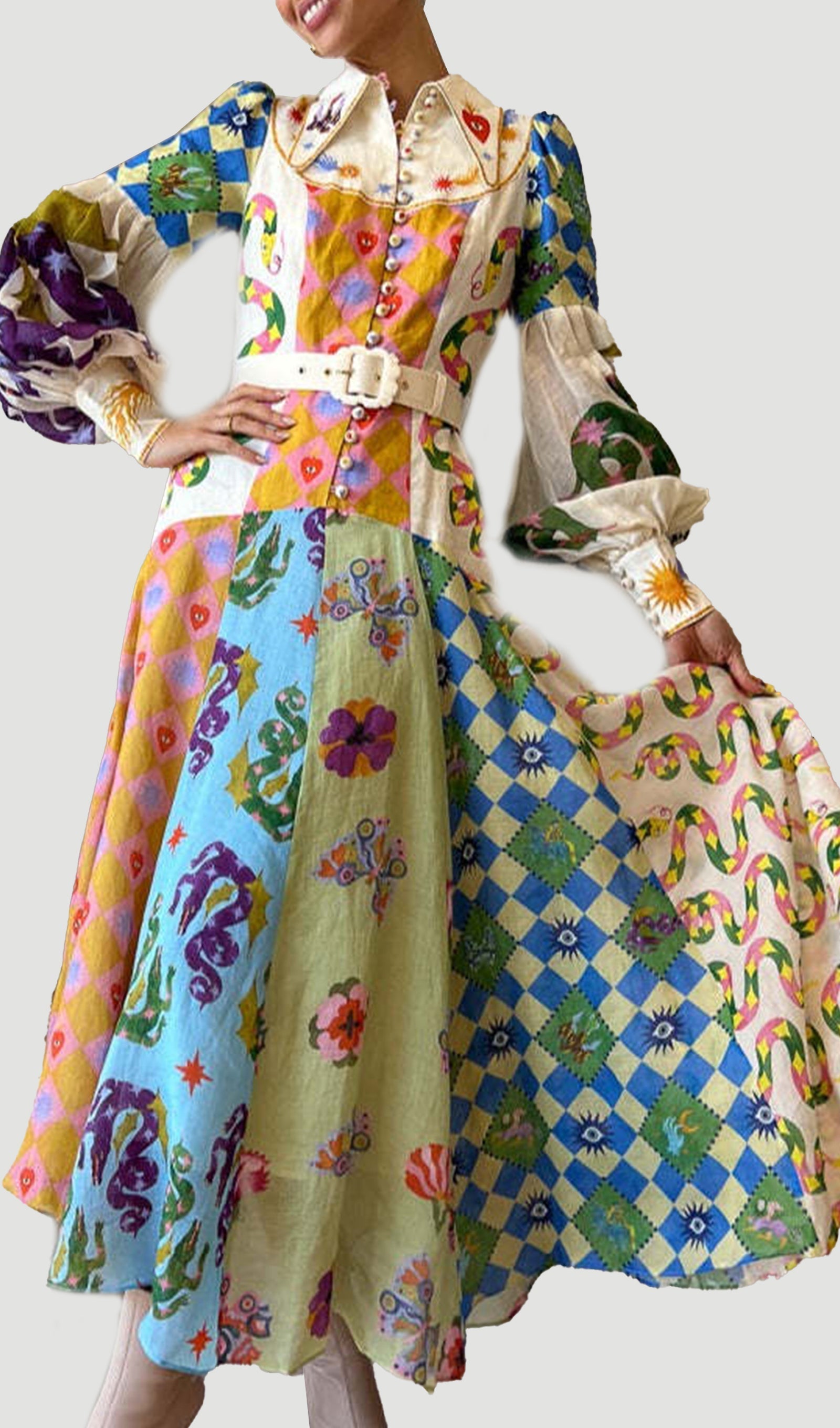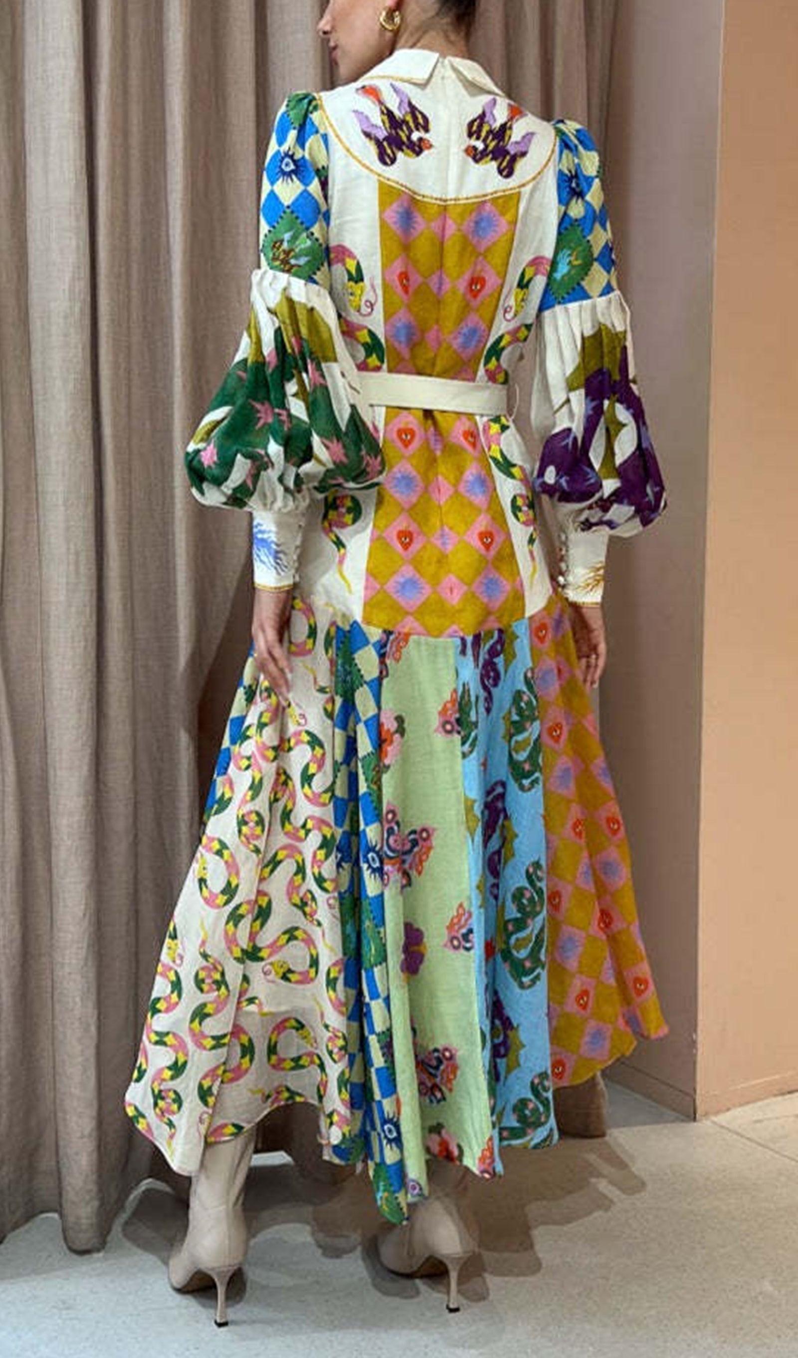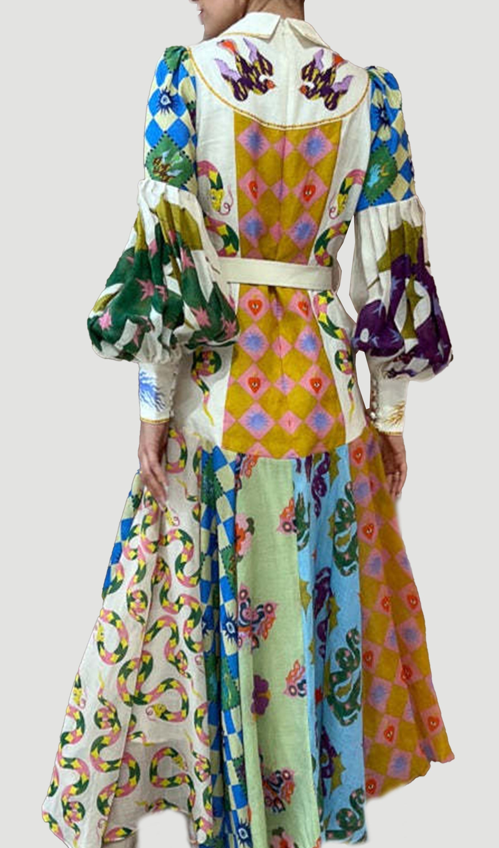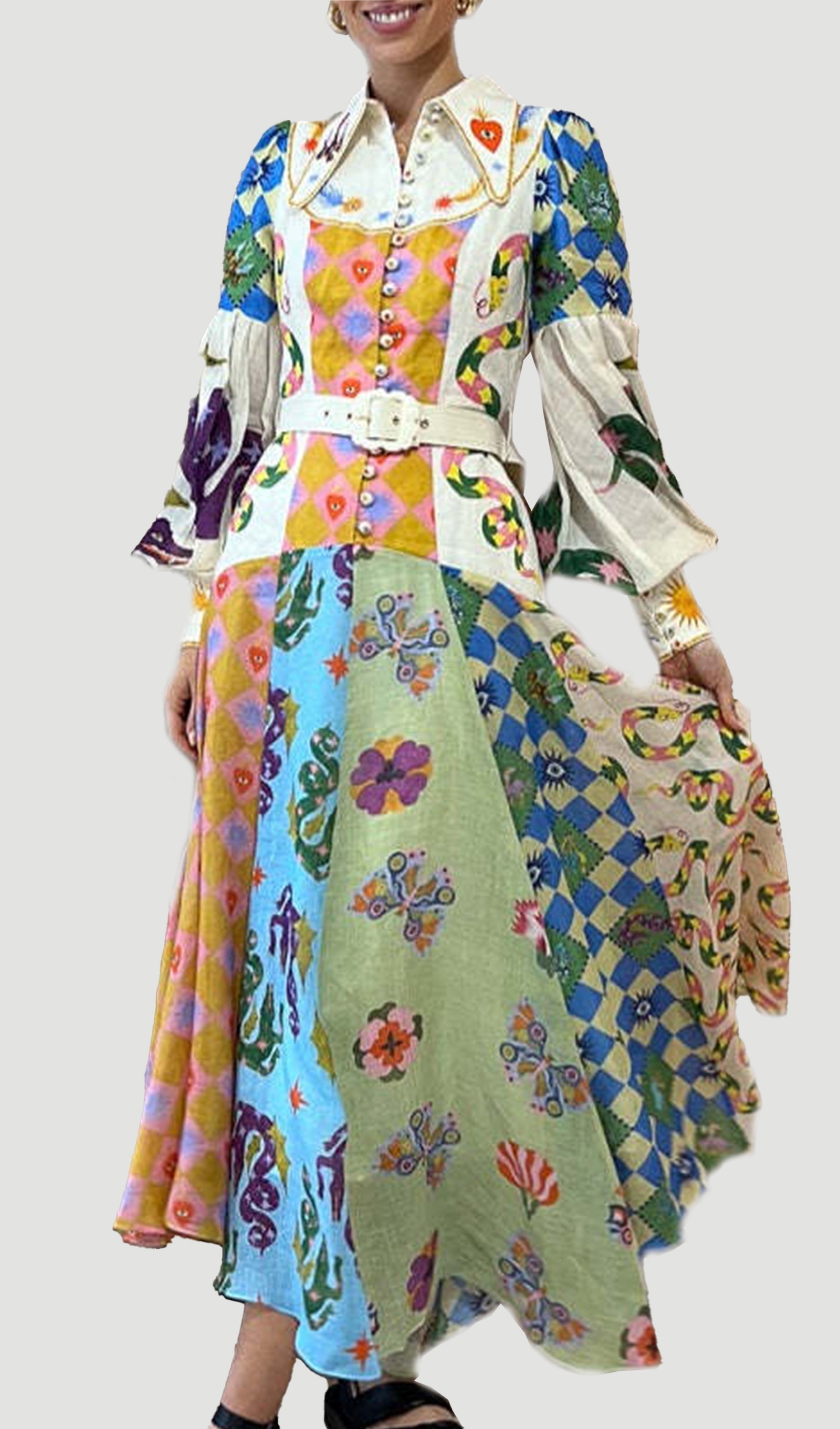 Patchwork Fener Kollu Kemer Gömlek Maksi Elbise