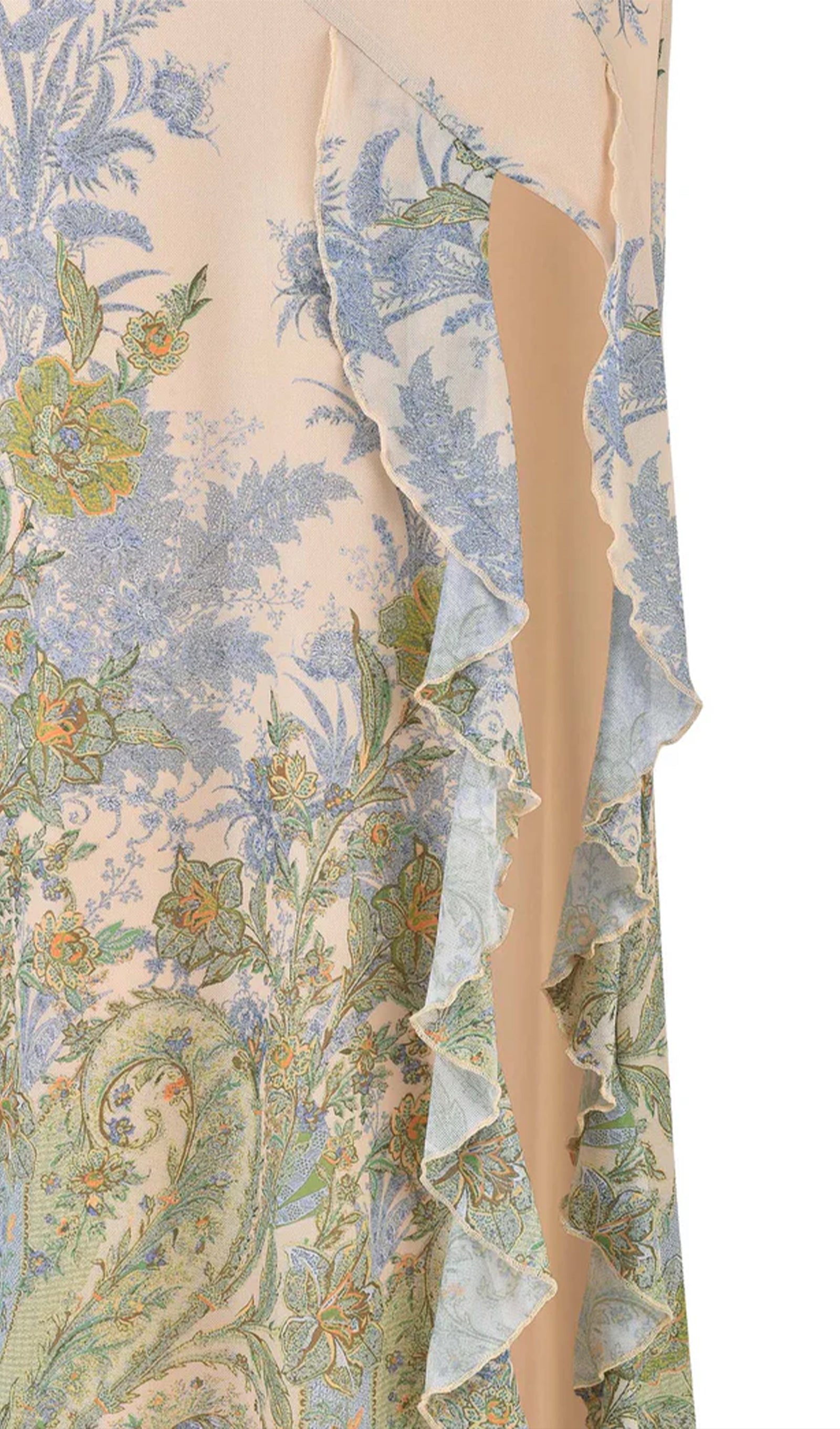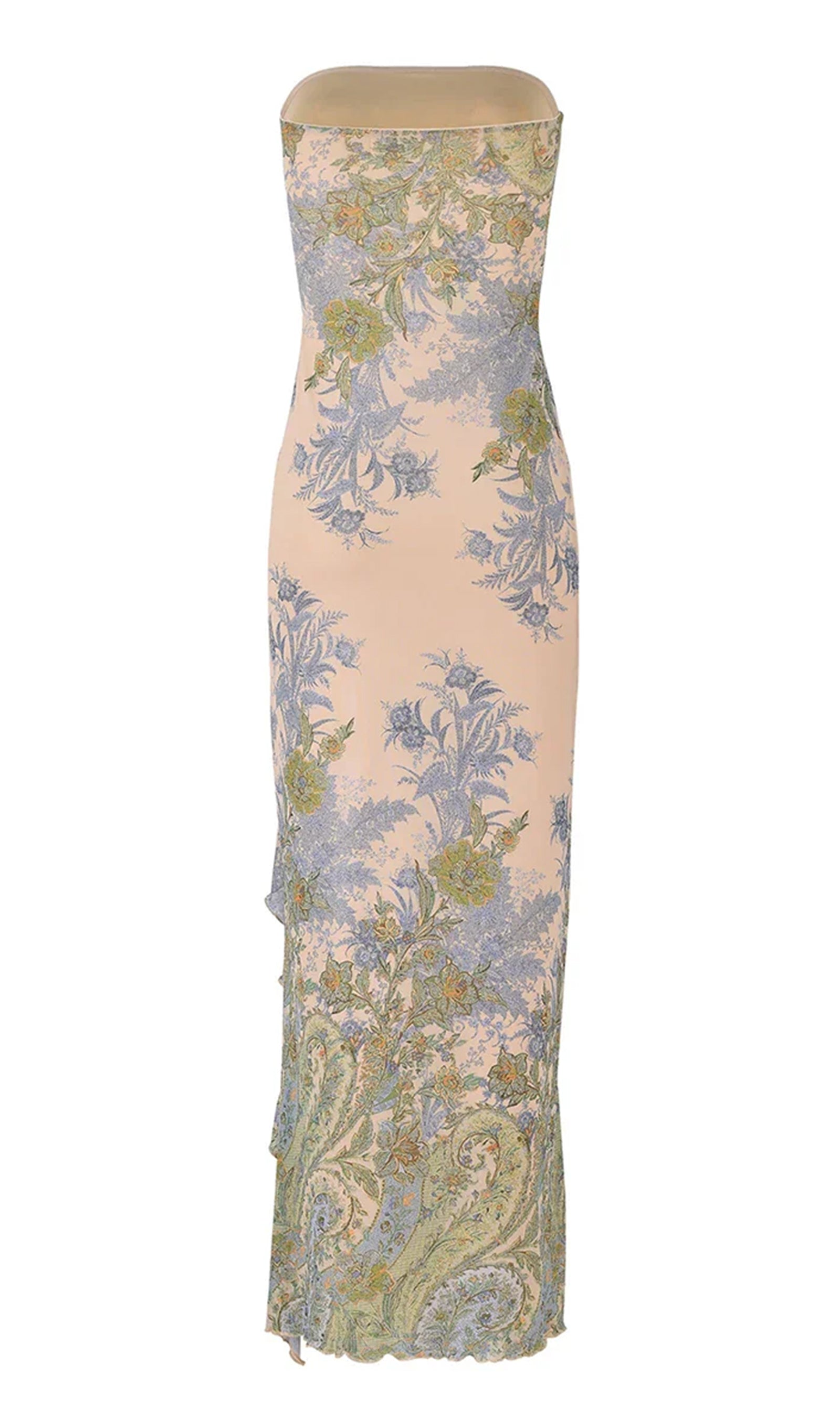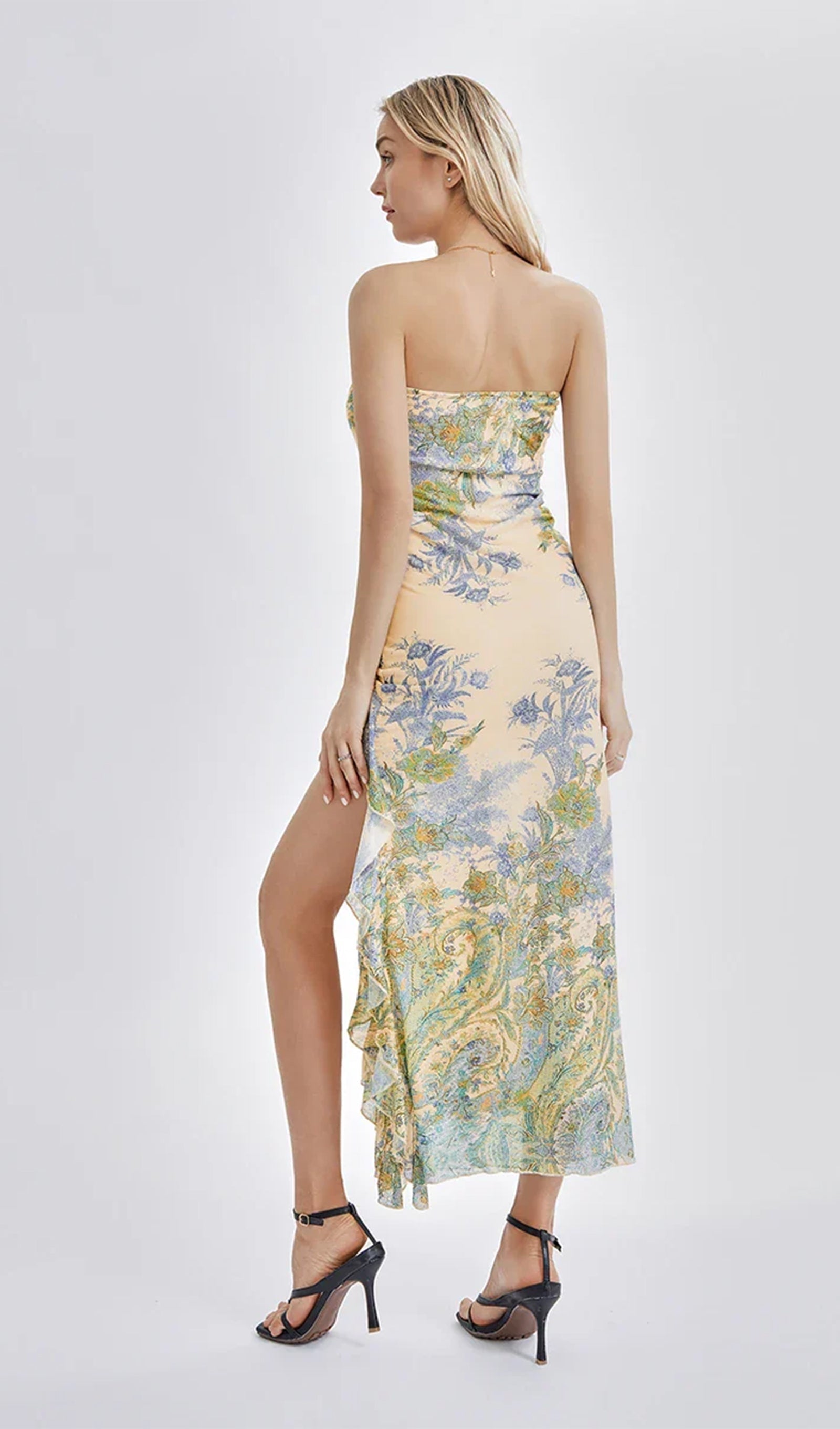 Baskılı Straplez Yırtmaçlı Midi Elbise