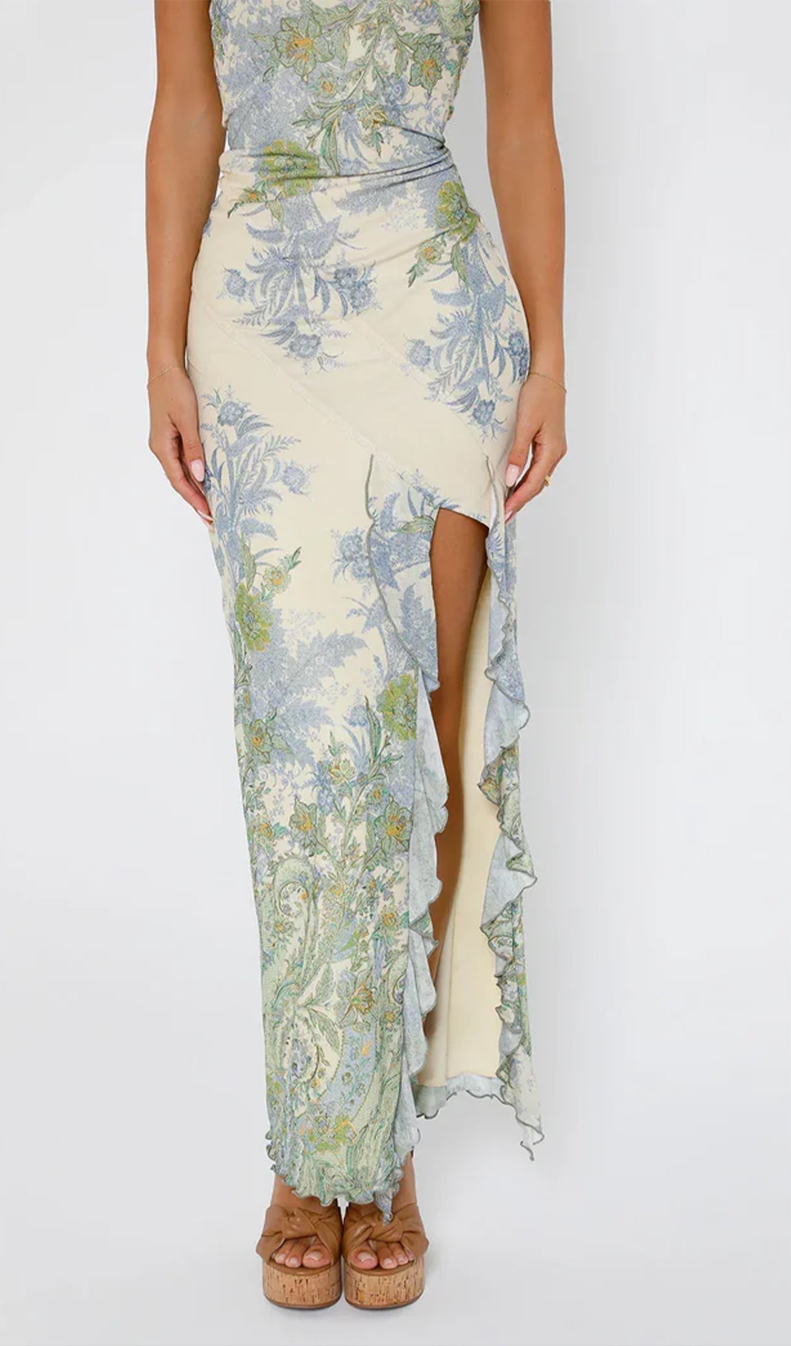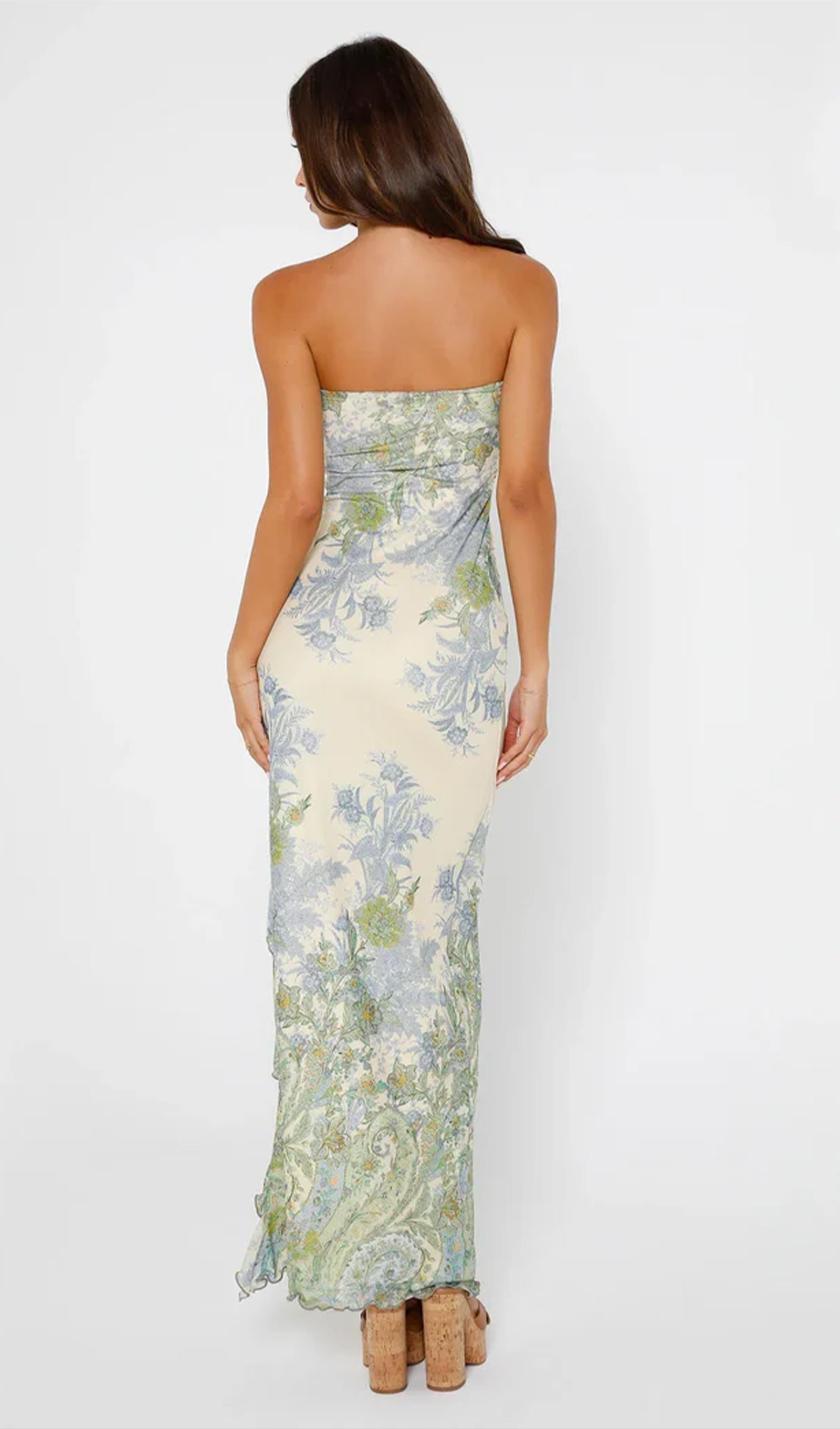 - Mavi ve yeşil tonlarında güzel bir toile de jouy desenine sahip bu çarpıcı Baskılı Straplez Yırtmaçlı Midi Elbise ile baş döndürün! Fırfır detayları ve yırtmacı ile kesinlikle büyüleyici görünün ve straplez görünümünüzü sergilemeyi unutmayın! Eğlenceli bir gece için mükemmel - bu türünün tek örneği elbiseyi kaçırmayın!