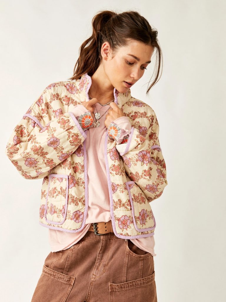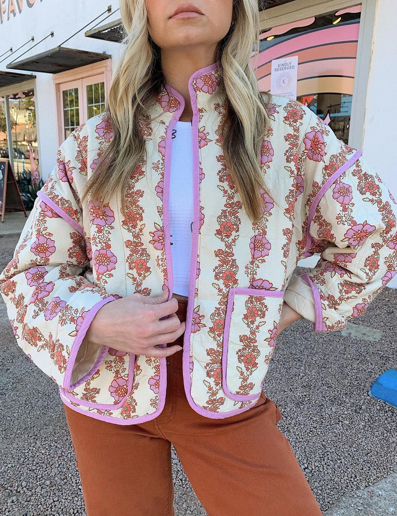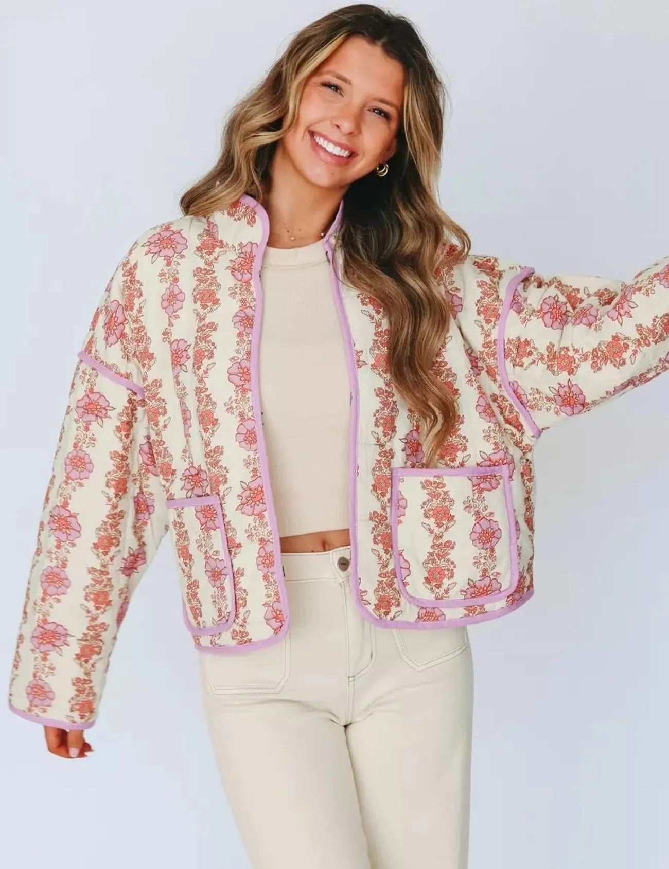 Beyaz Yakasız Çiçek Desenli Ceketimizle sonbahar ve kış tatilini kucaklayın. Bu tatlı, rahat kesim dış giyim, zarif bir çiçek desenine ve eğimli yakasız bir yapıya sahiptir.