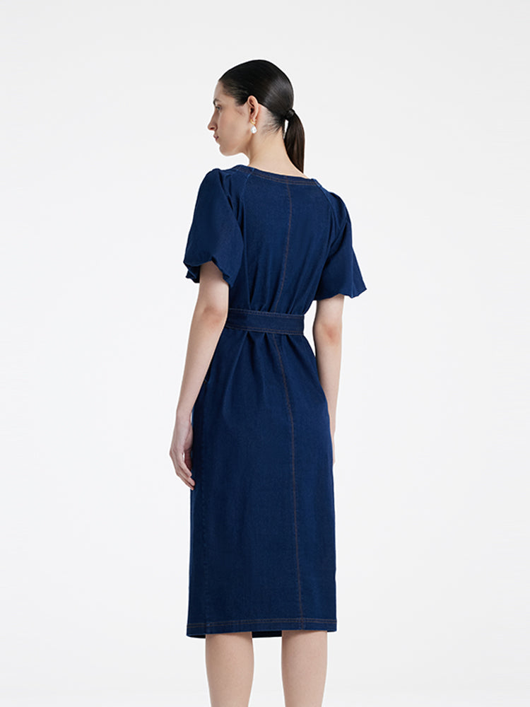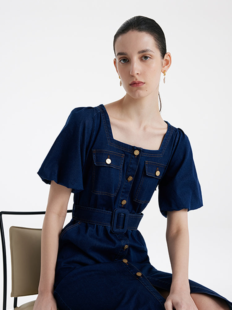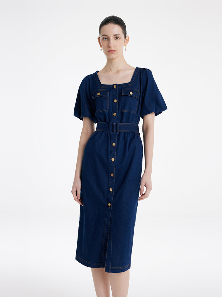 Puf Kollu Kare Yaka Denim Kadın Midi Kot Elbise Kemerli