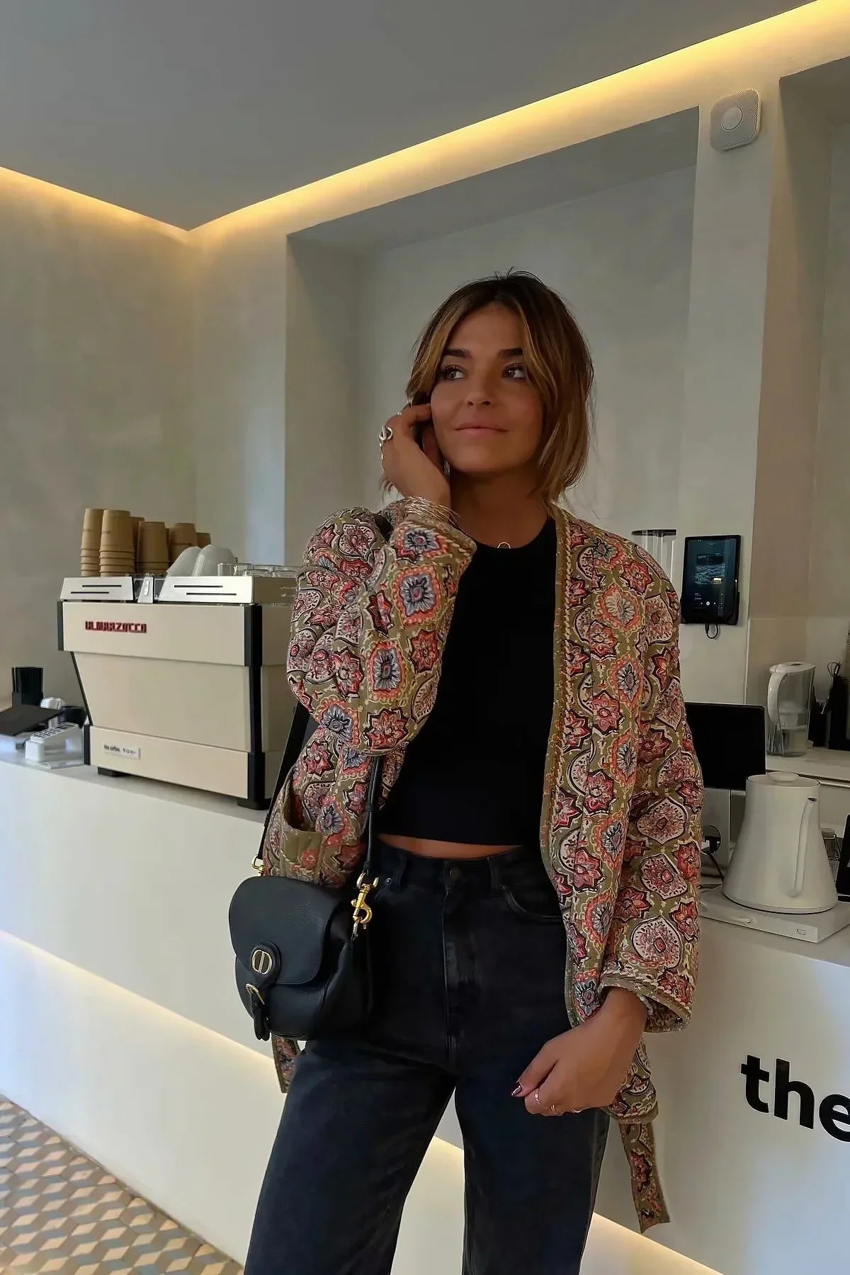 Günlük kıyafetlerinize şıklık katmak için mükemmel olan bu ceket, hem sıcaklık hem de şıklık sunuyor. Eşsiz baskının cazibesini benimseyin ve pratiklik ile stilin birleşiminin keyfini çıkarın.