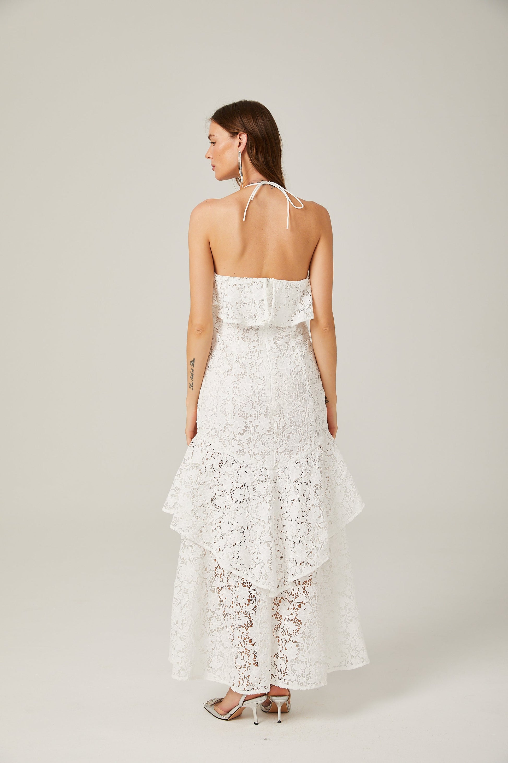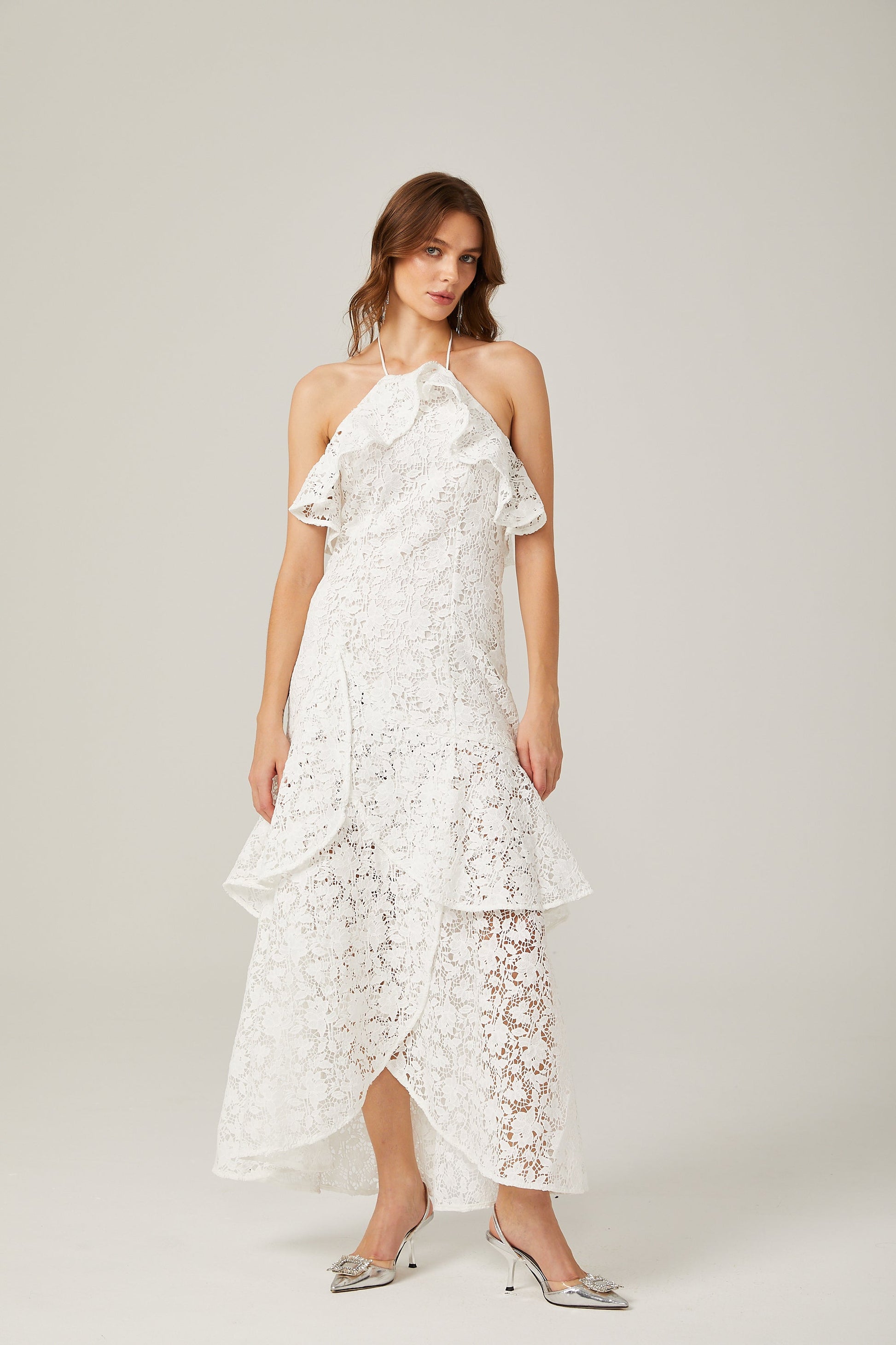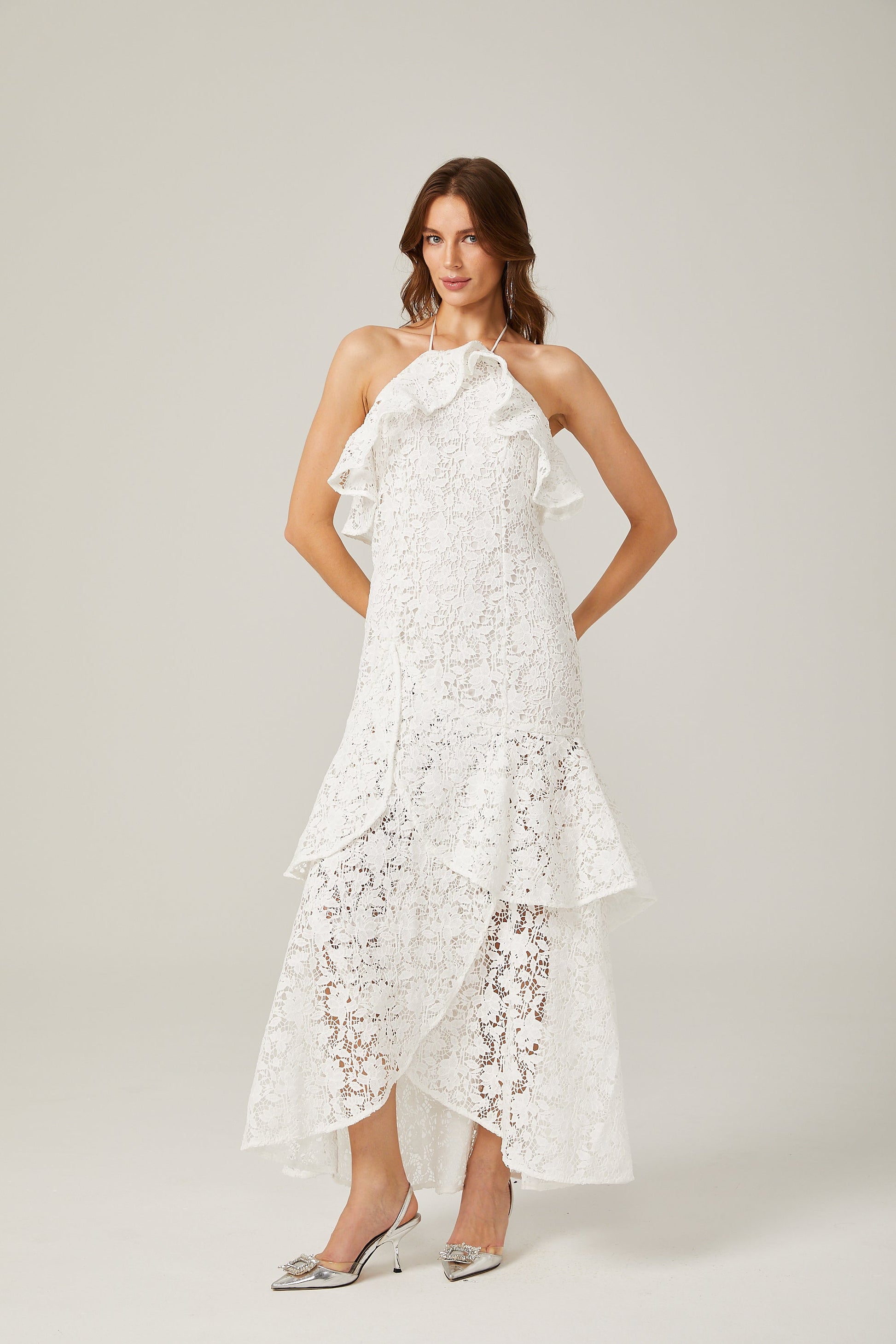 Sancia beyaz fırfırlı güpür dantel Maxi elbise