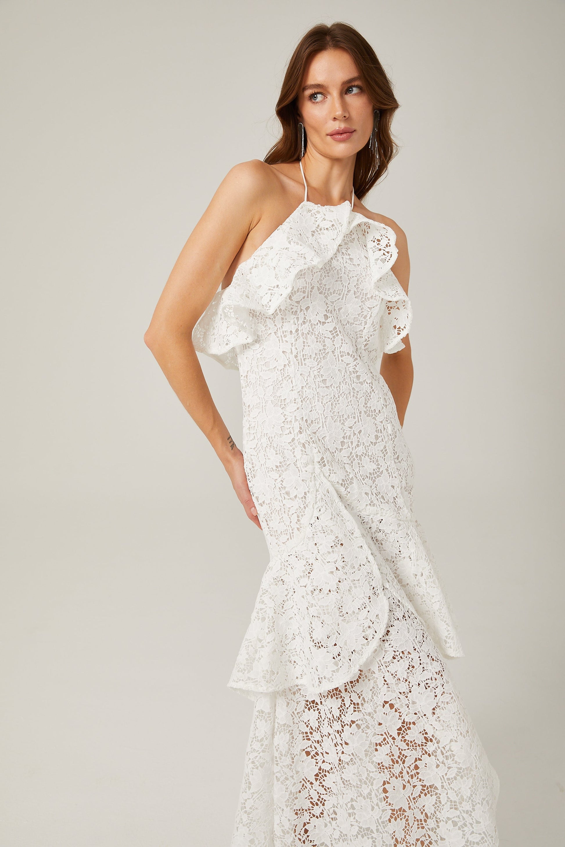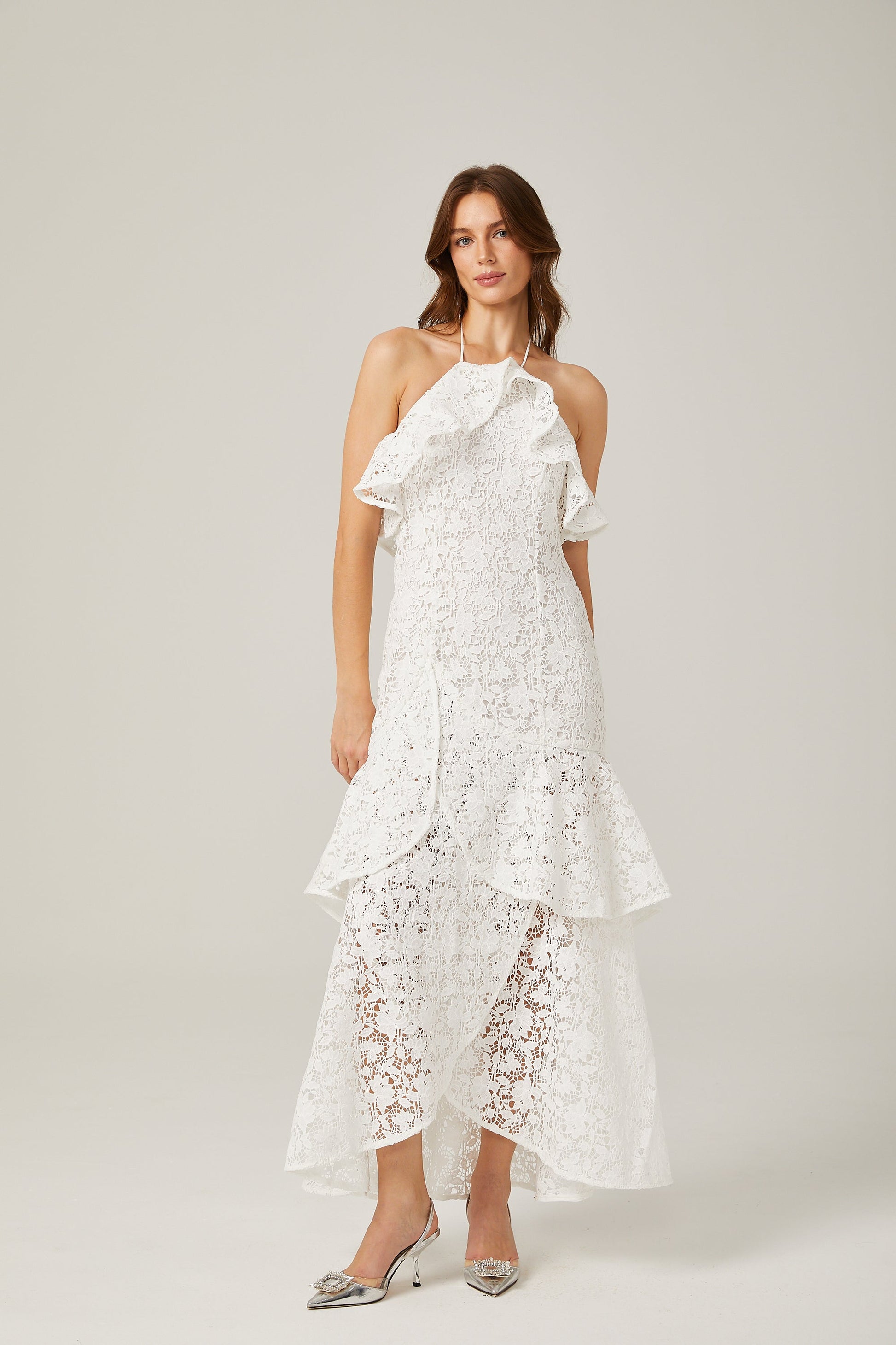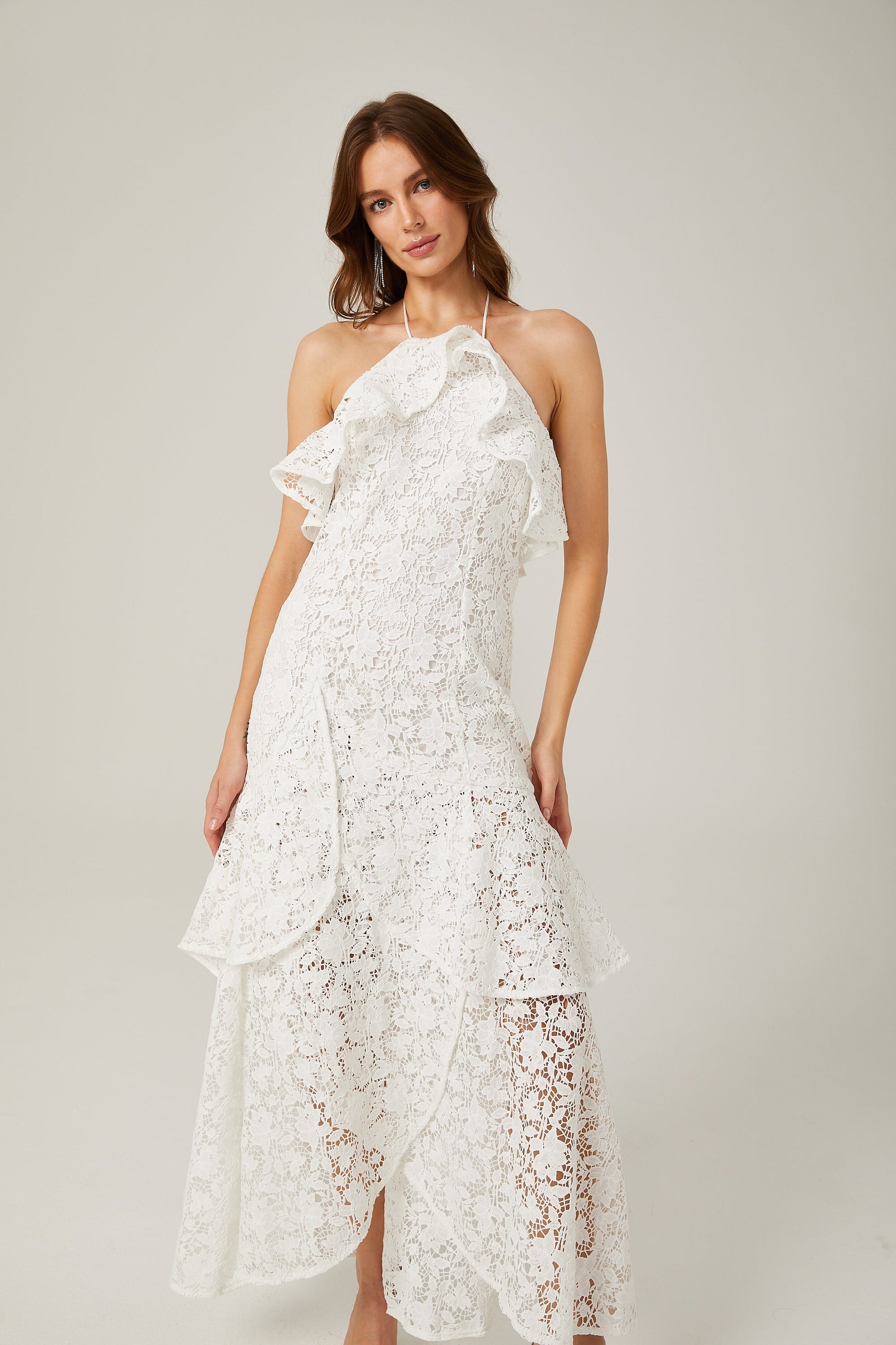 Sancia beyaz fırfırlı güpür dantel Maxi elbise