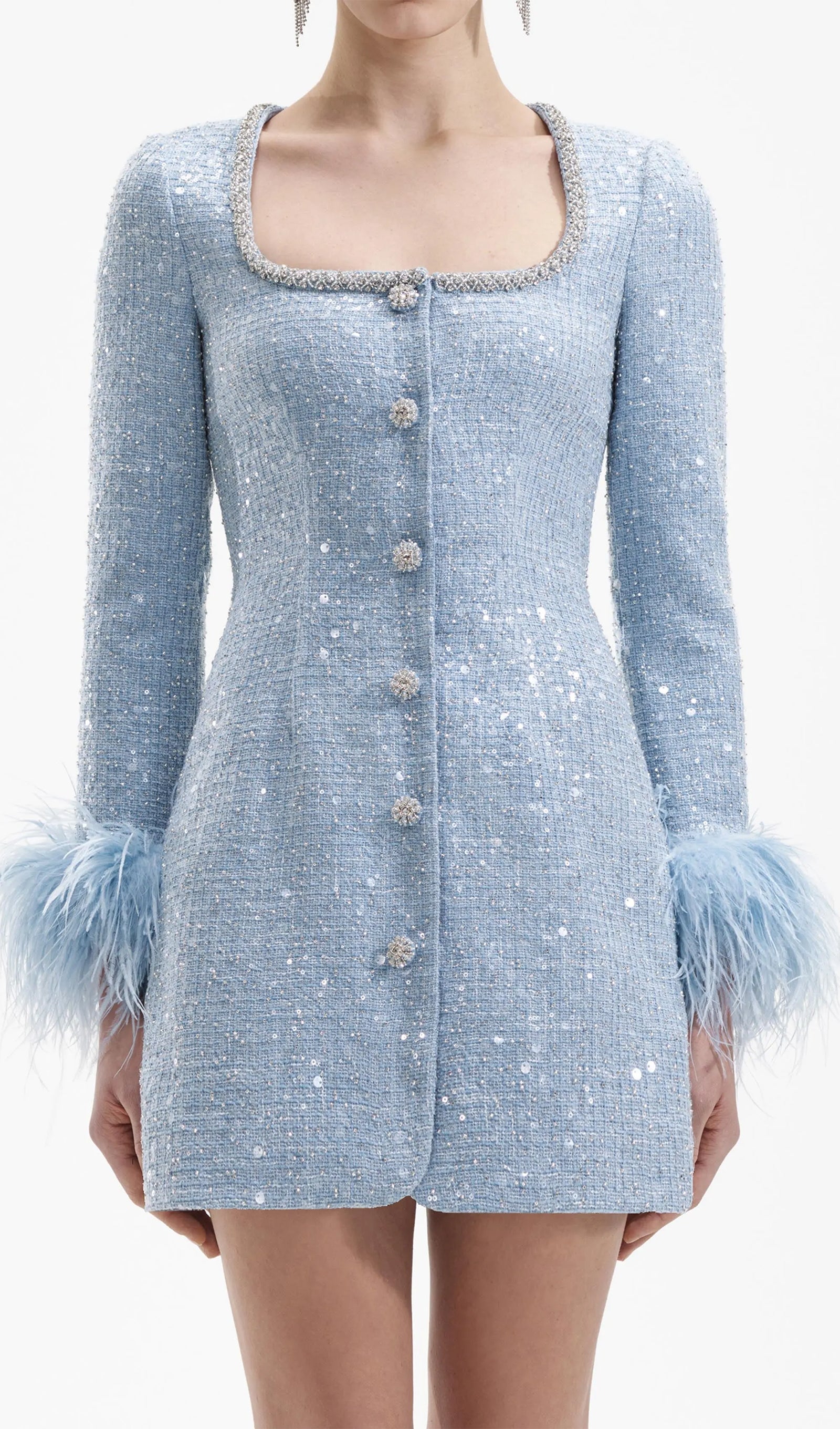 Yapısı ve ışıltısı için payetli bukleden kesilen bu parti elbisesinde zarif çizgiler maksimalist vurgularla buluşuyor. Diamanté düğmeler ve tüylü manşetler, zamansız siluetinin dramını artırıyor.