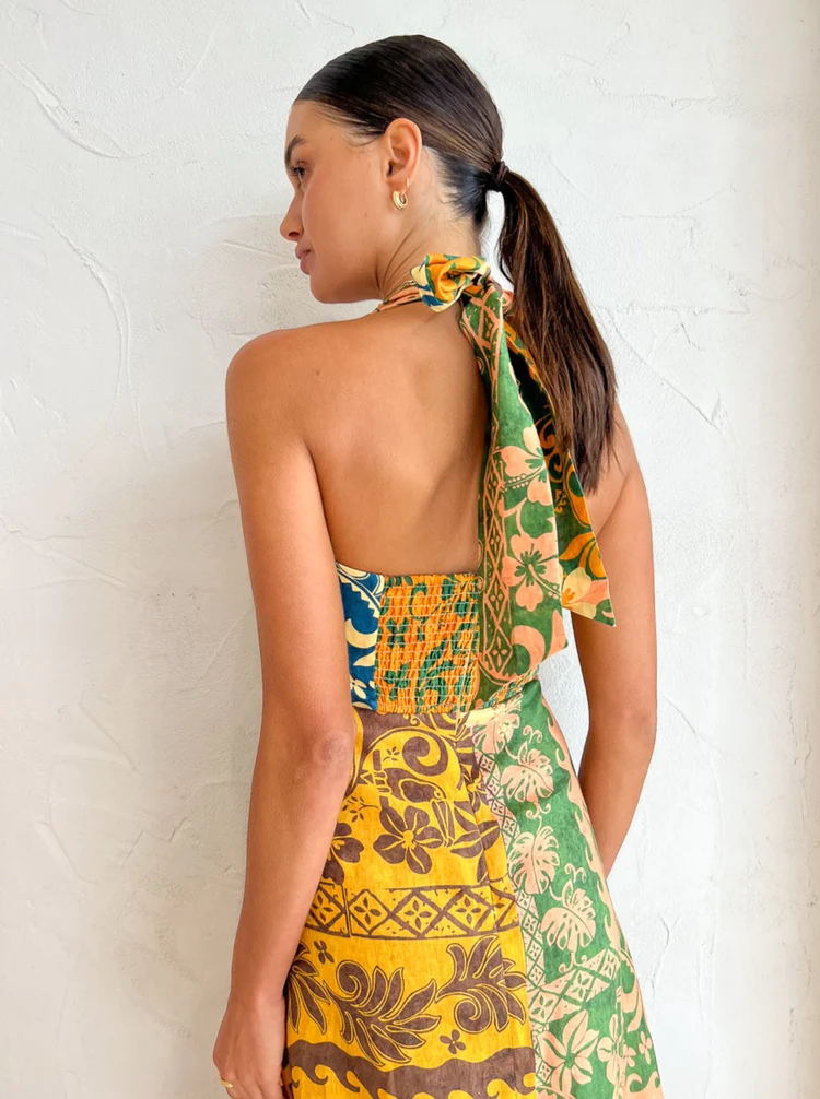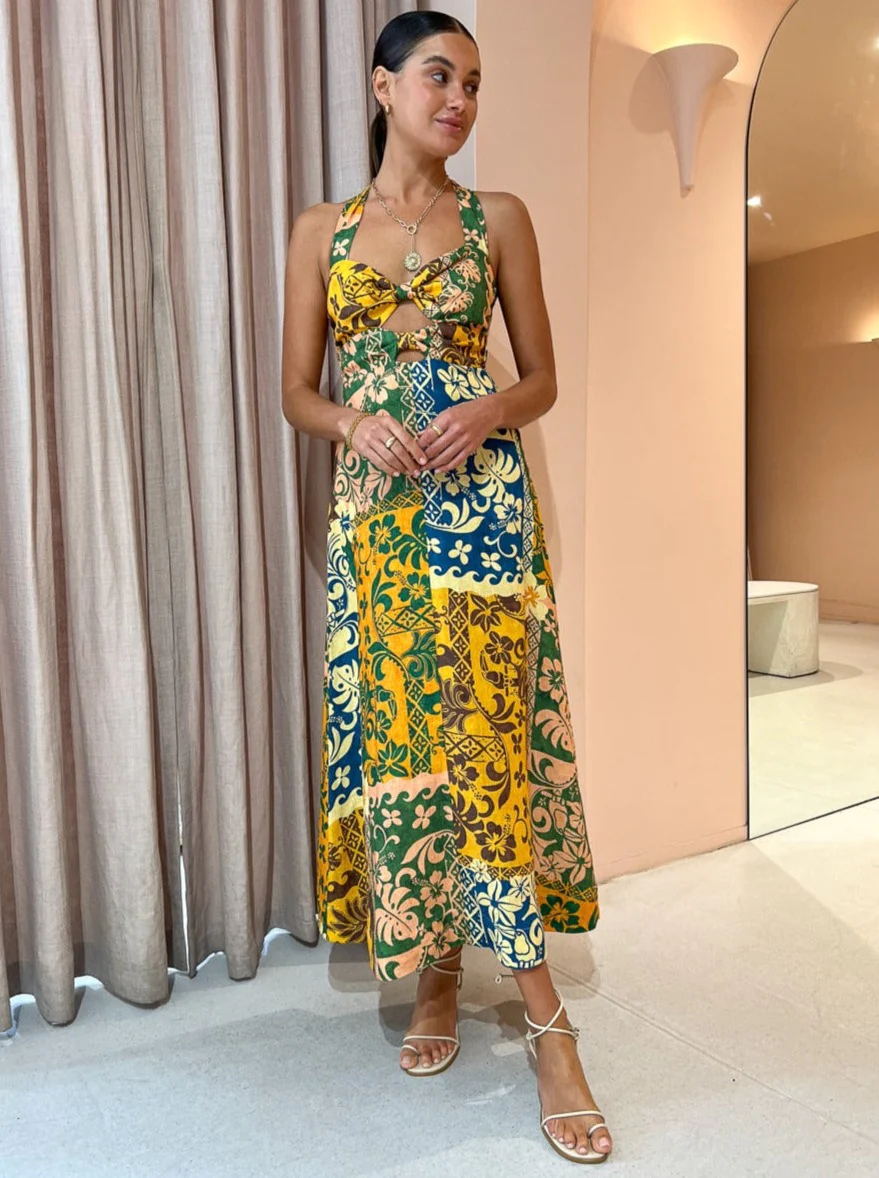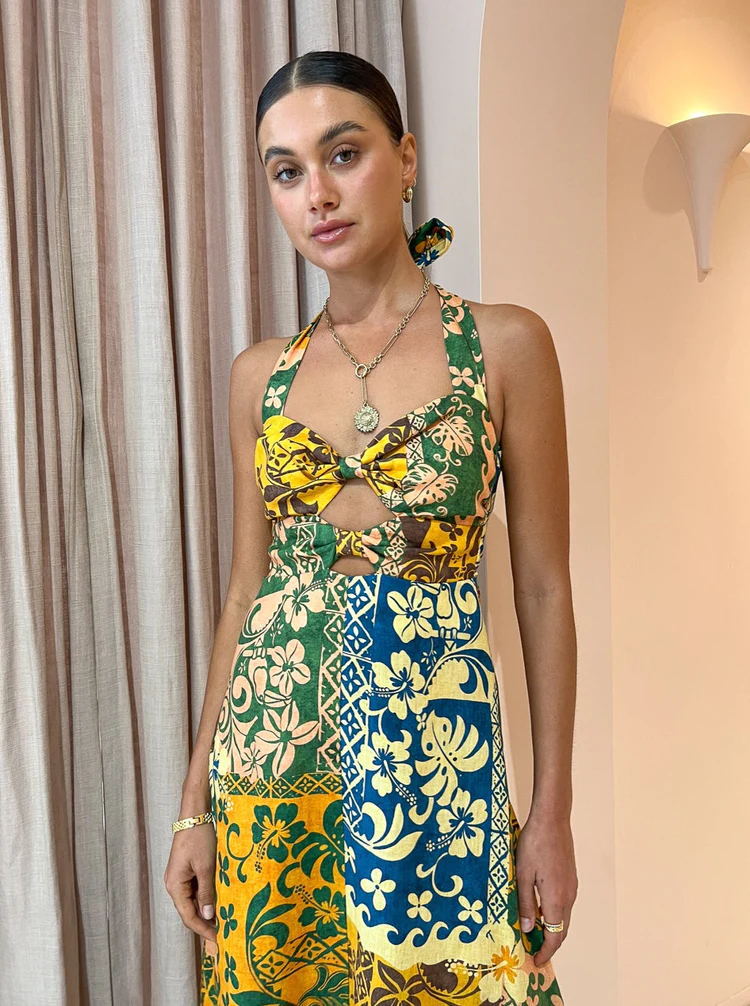 Seksi Baskı Bandaj Sırtı Açık Halter Baskılı Maxi Elbise