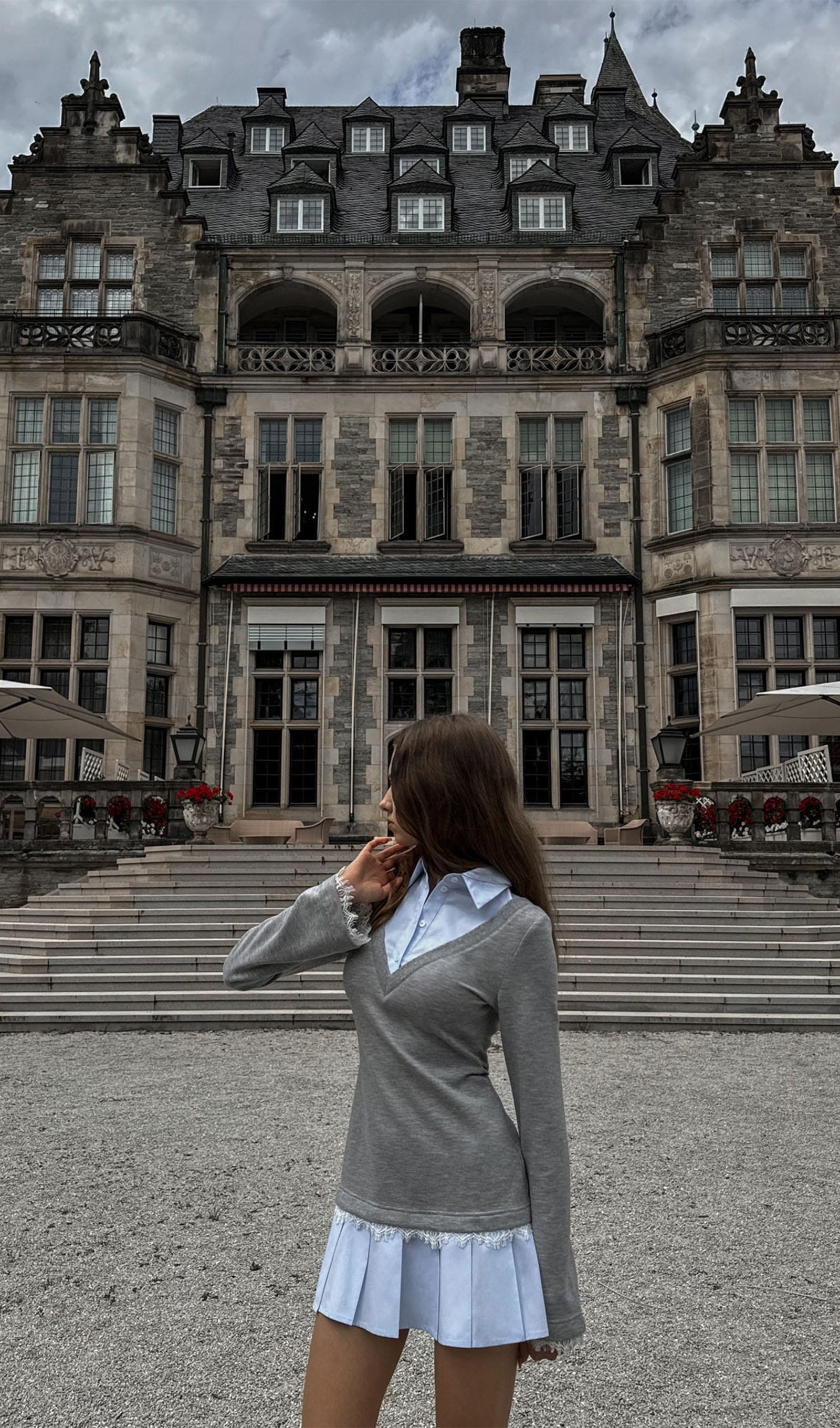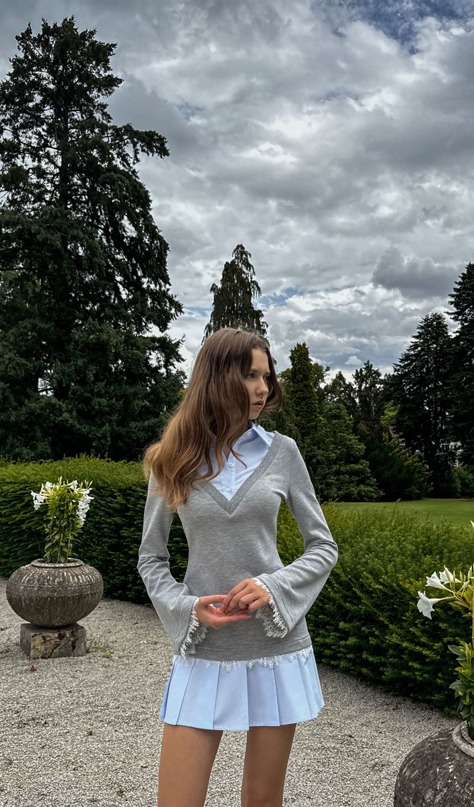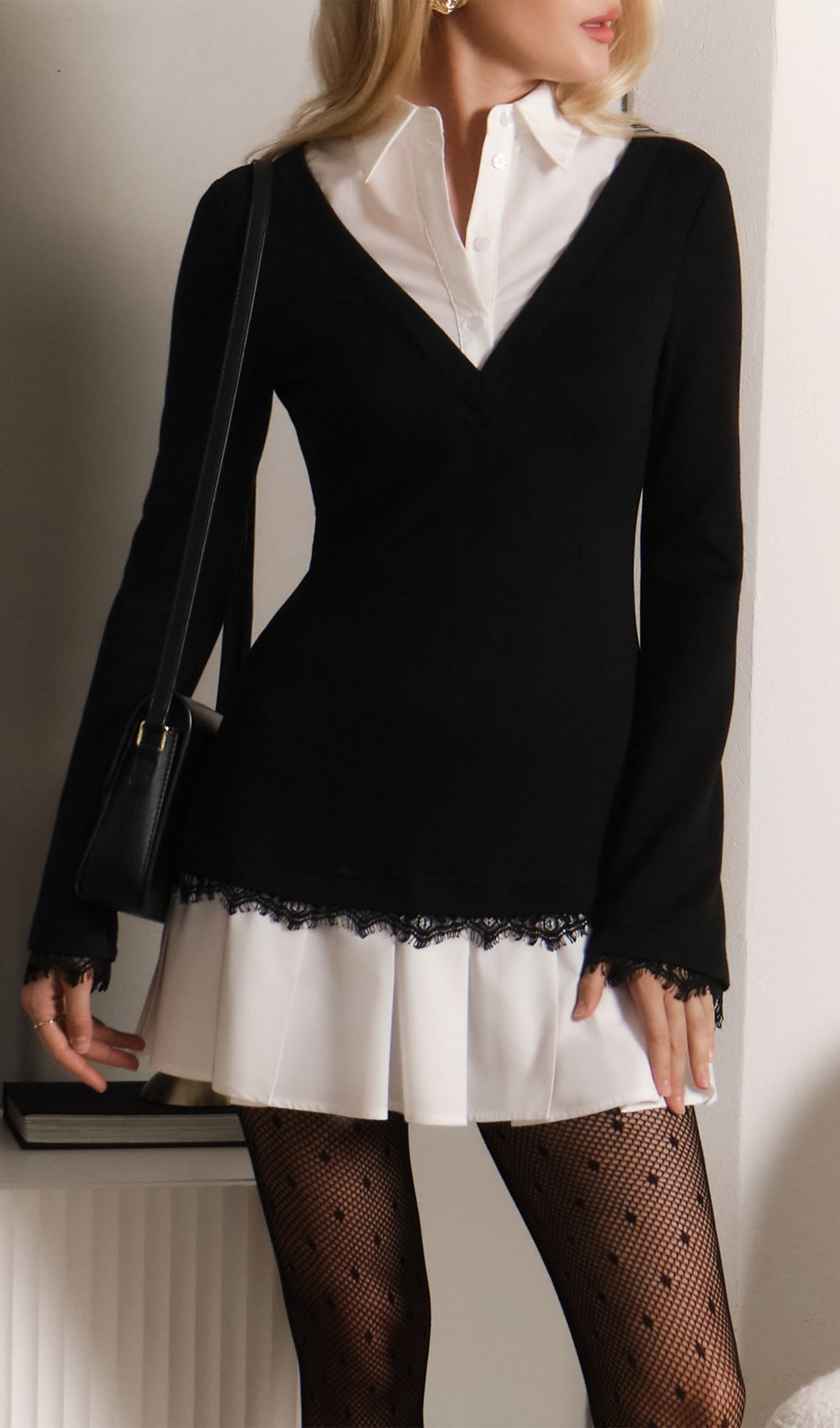 İş tarzında iki malzemenin birleşiminden oluşan yarı fit siluetli mini elbise. Elbisenin gömlek yakası ve yoğun pamuktan yapılmış eğlenceli pileli eteğinin yanı sıra uzun kollu, manşetleri ve alt kenarı dantel dekorlu örme bir kazağı vardır.