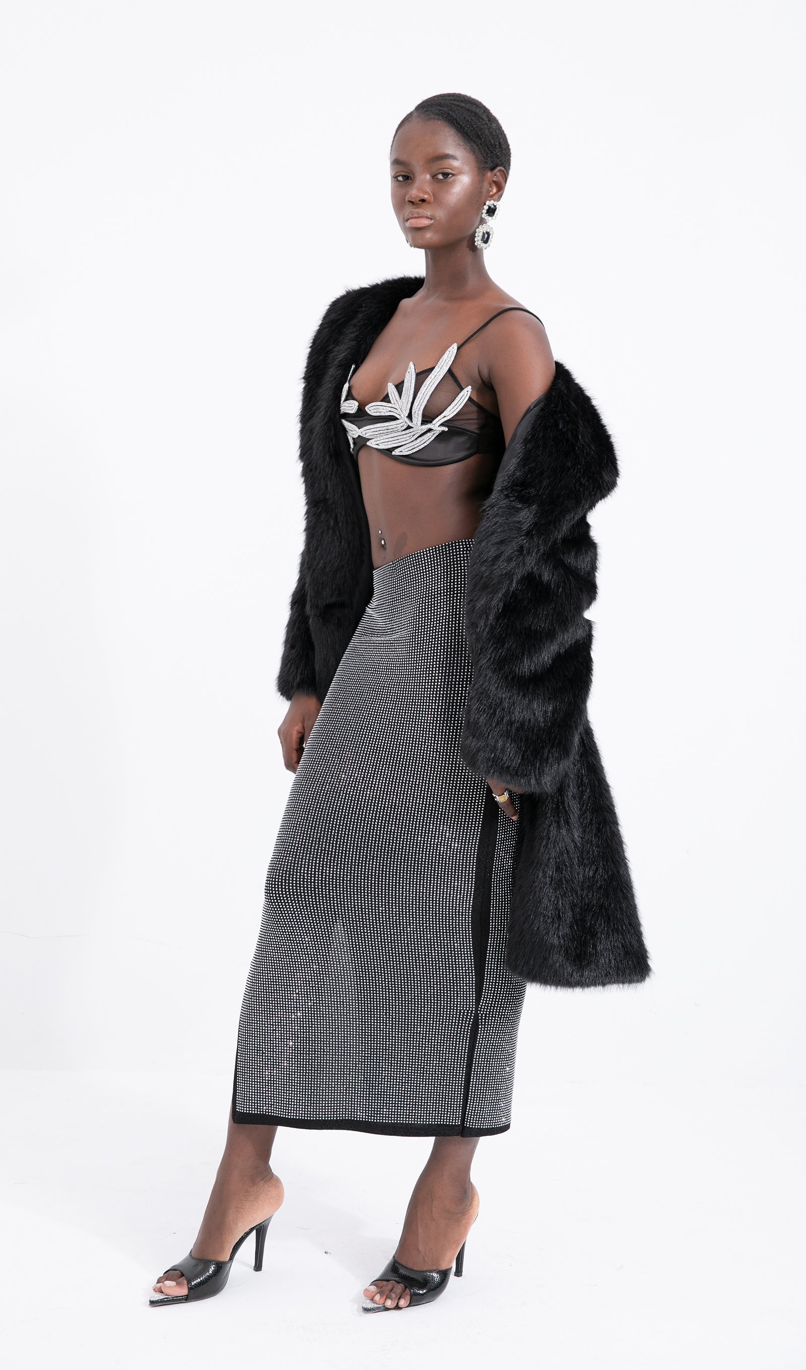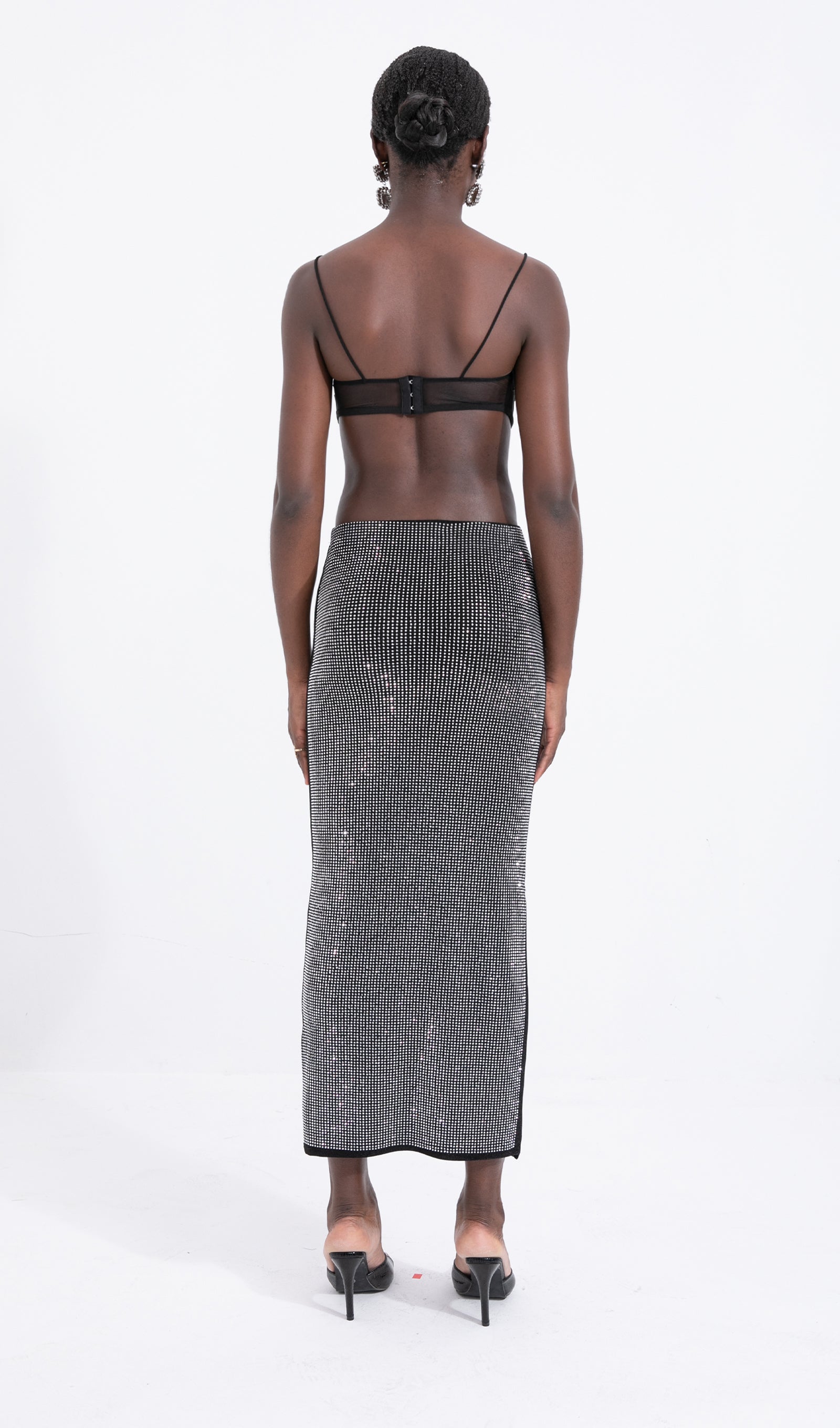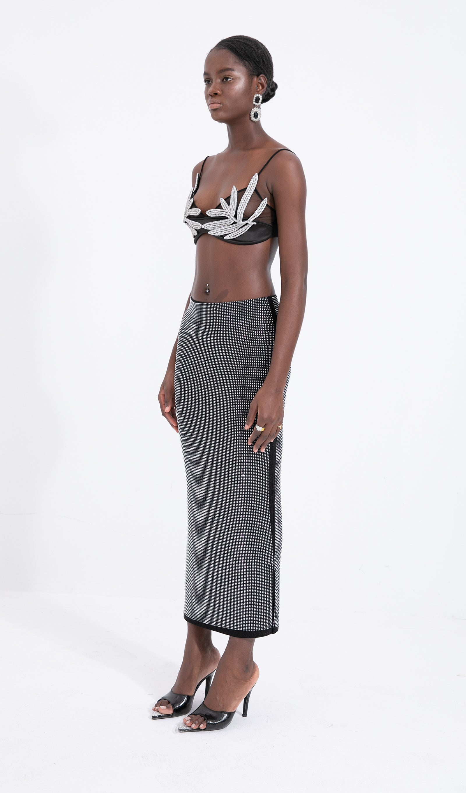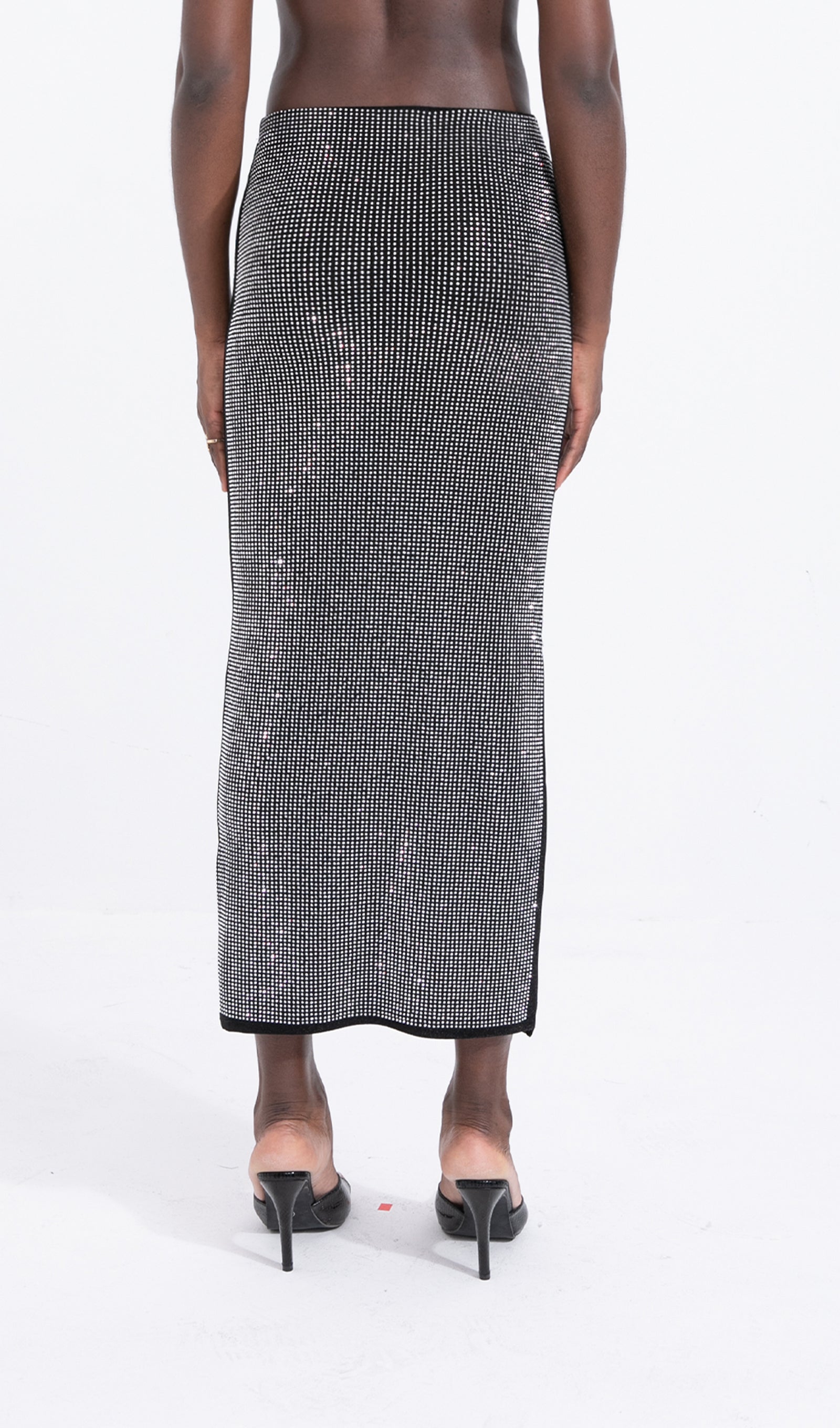 Bu gümüş tonlu boncuklu midi etek, herhangi bir özel etkinlikte bir açıklama yapmak için sofistike bir seçimdir. Şık kesimi ve baştan çıkarıcı bir dokunuş katan yan yırtmacı ile bu parça parlamak için tasarlandı. Siyah süslemesi, boncukların ışıltısıyla mükemmel bir tezat oluşturarak modern ve göz alıcı bir görünüm yaratır. Sofistike ve şık bir görünüm için sade bir üst ve yüksek topuklu ayakkabılarla eşleştirmek için mükemmeldir.