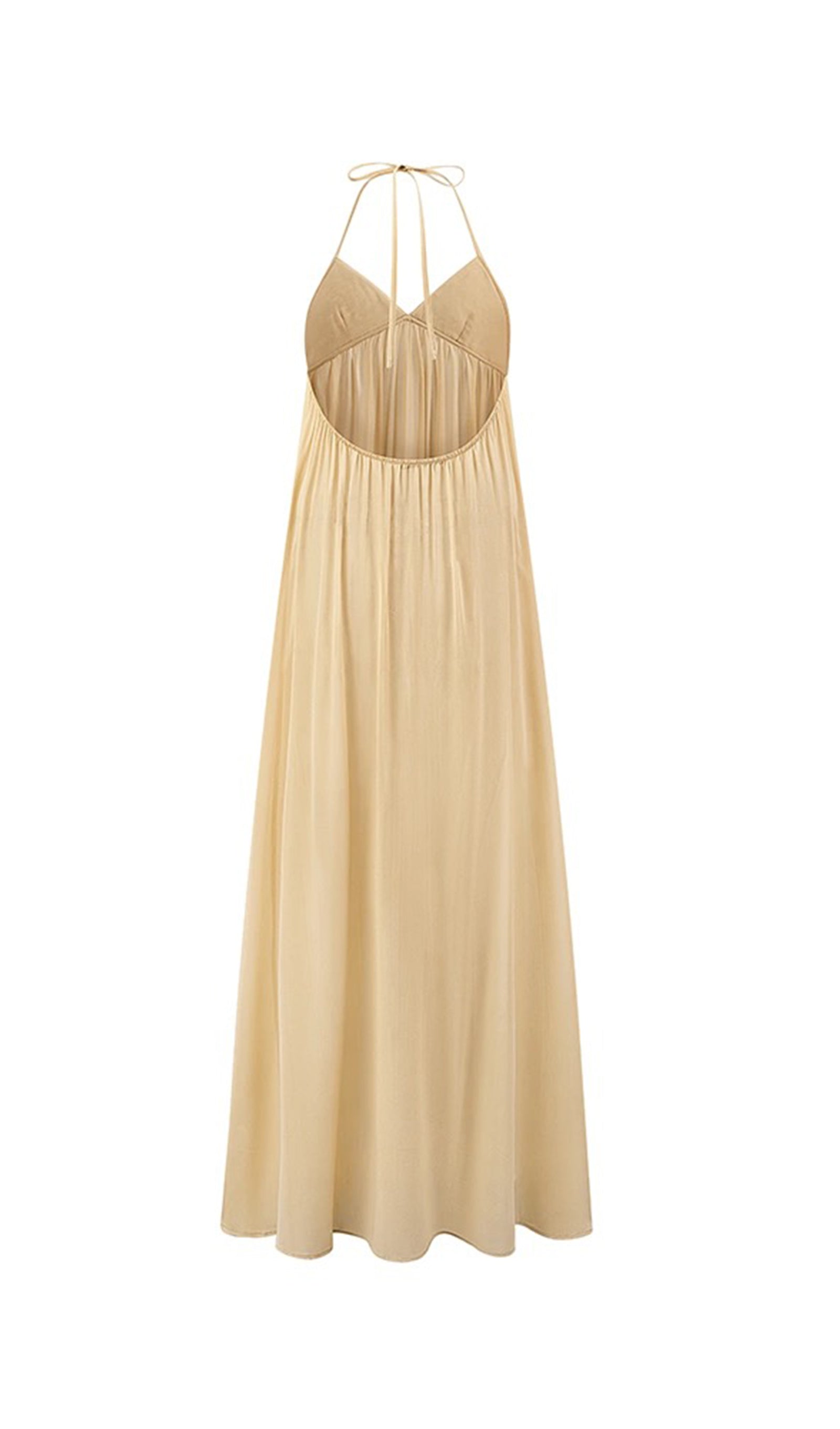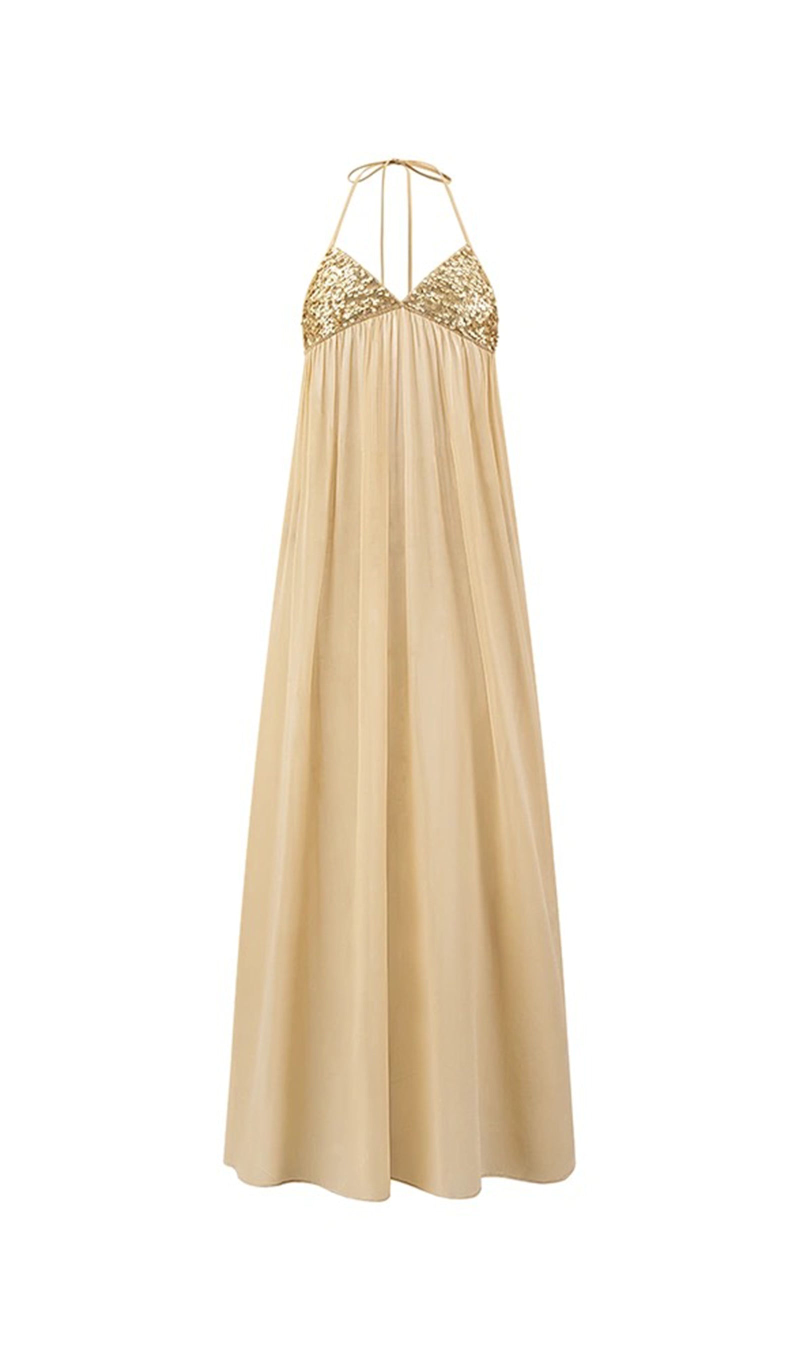 Rahatlık ve stil için ustalıkla tasarlanan Slip Pamuklu Gazlı Bez Maksi Elbisemiz tatil görünümünüzü yükseltecek. Keten ve payetli kumaşların karışımından üretilen elbise, alt kısmı hafif transparan olan bol bir A kesim eteğe sahiptir. Halter yakası ve açıkta kalan sırtı cazibeli bir dokunuş katarken, üst üste veya tek başına giymek için mükemmeldir.