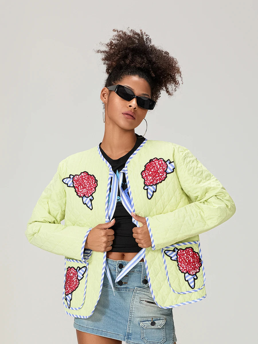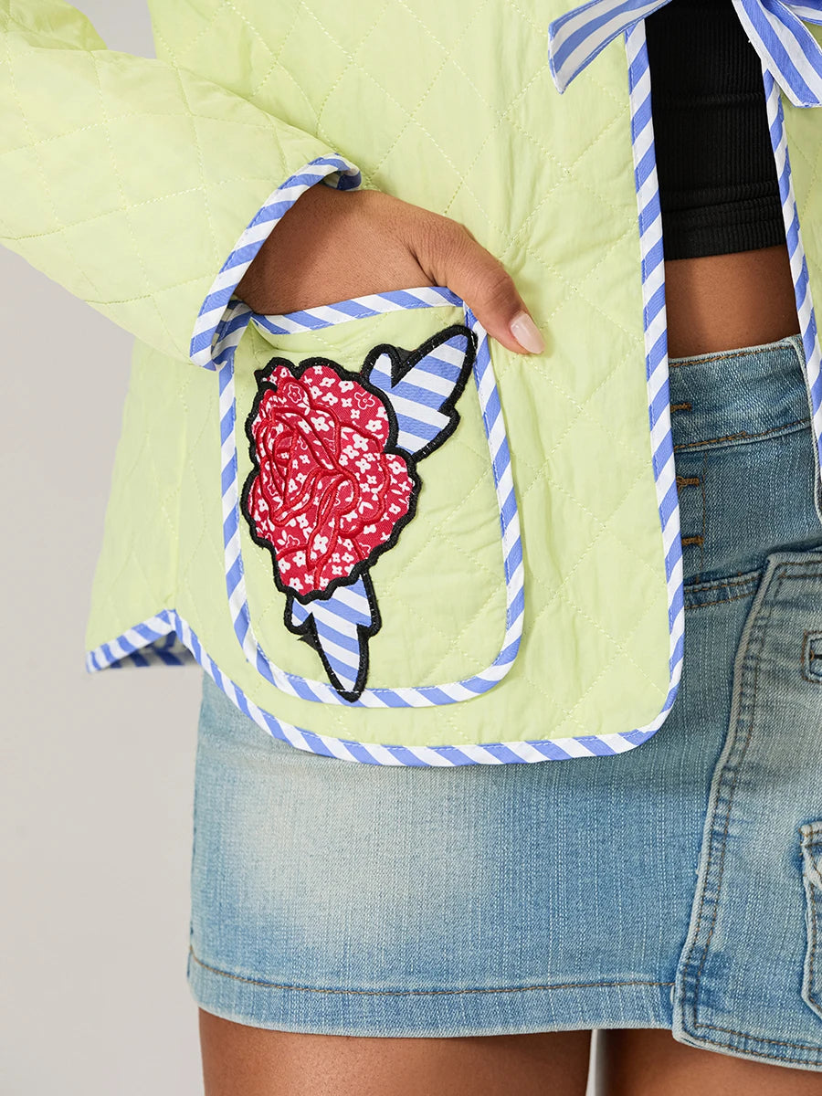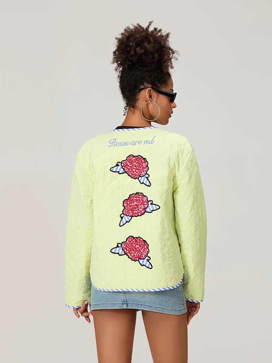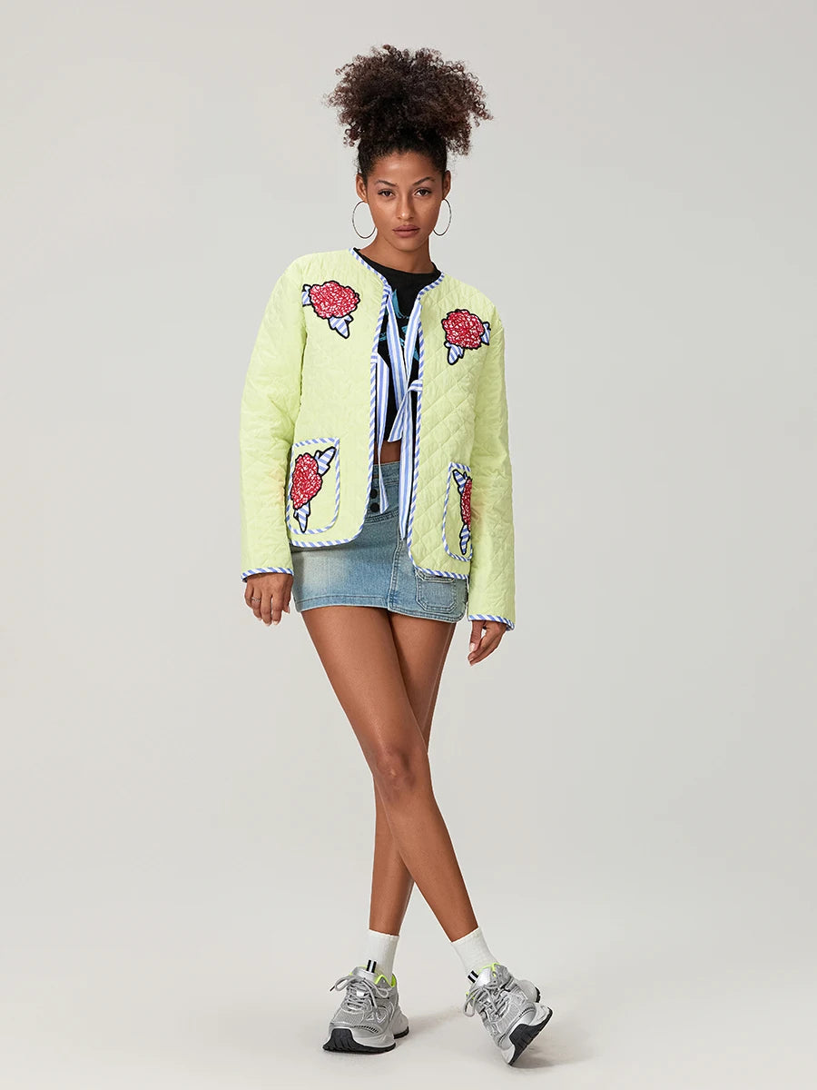 Gül Desenli Fiyonklu Kapitone Ceket -Sarı