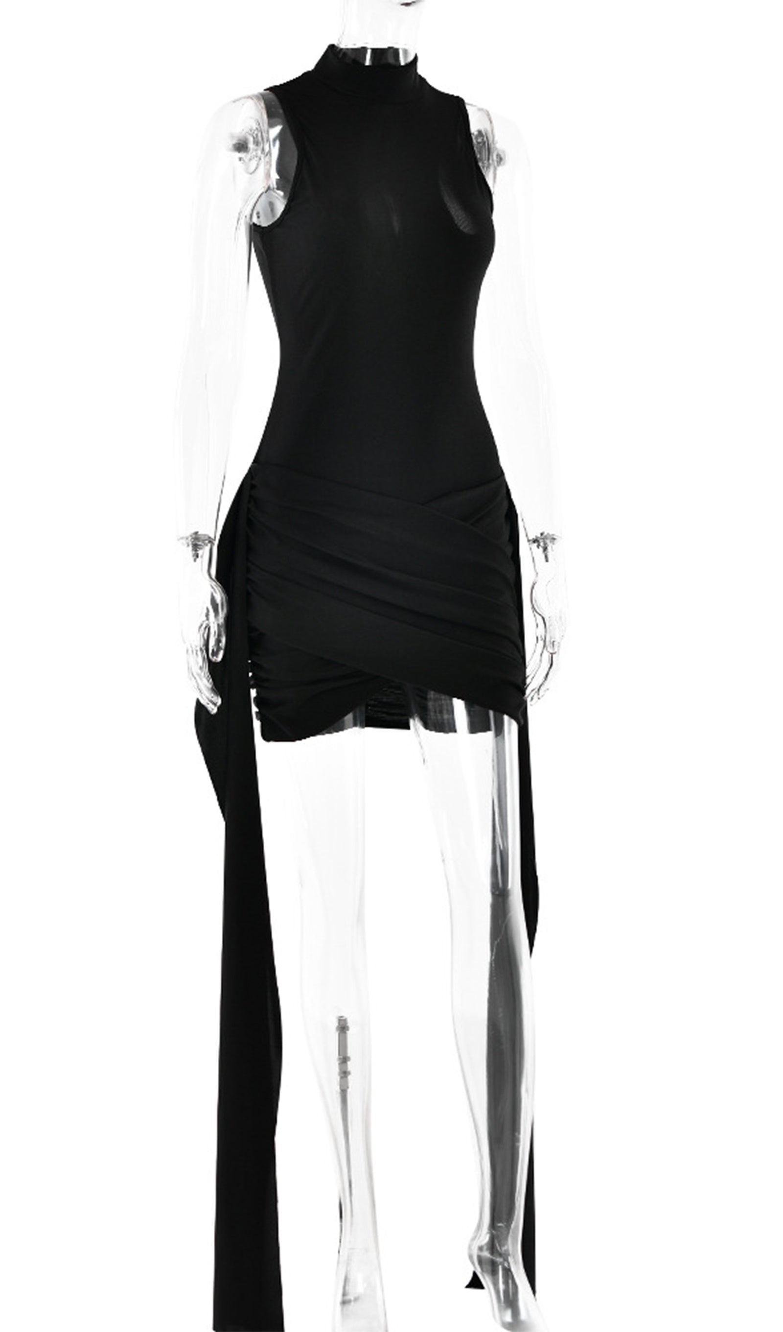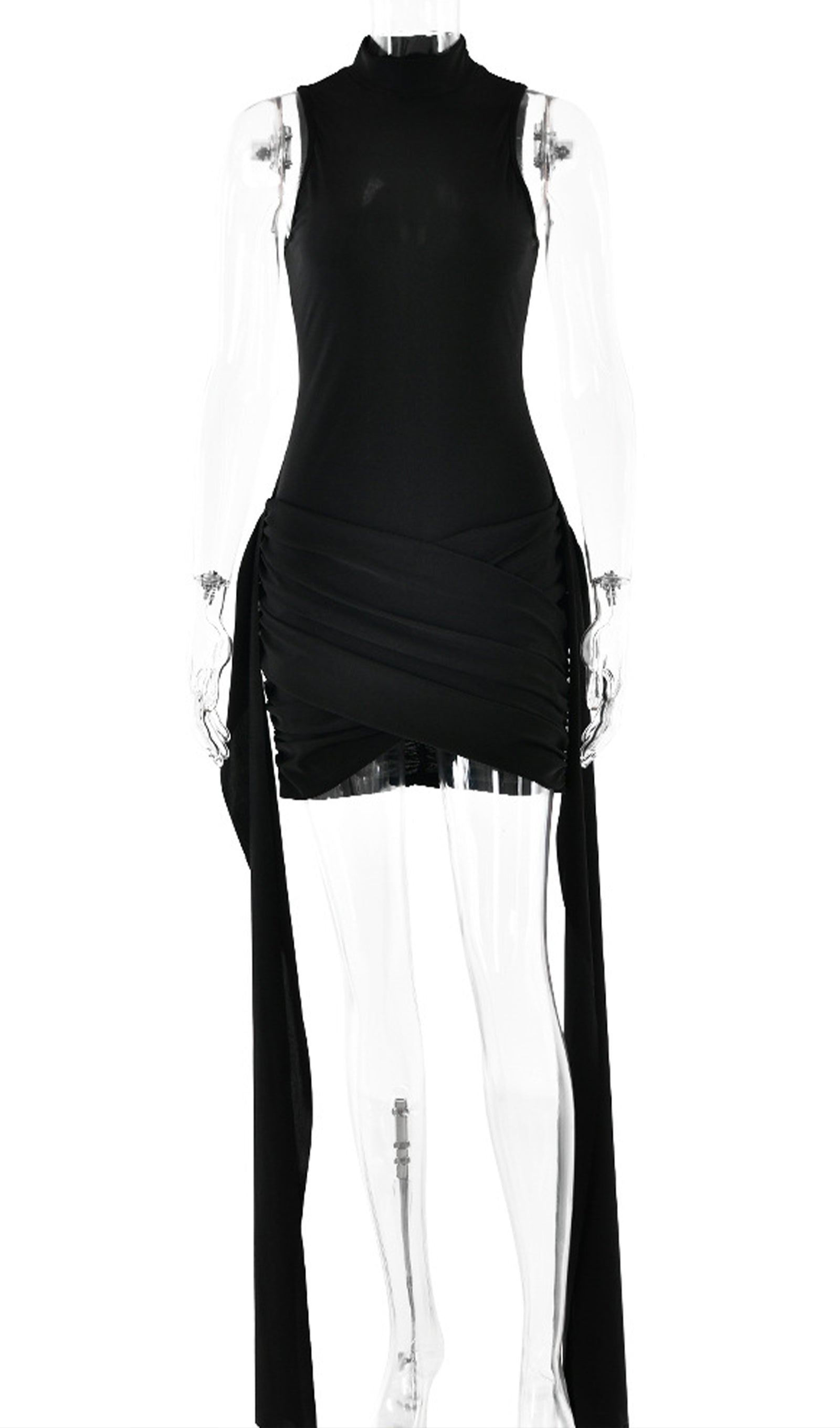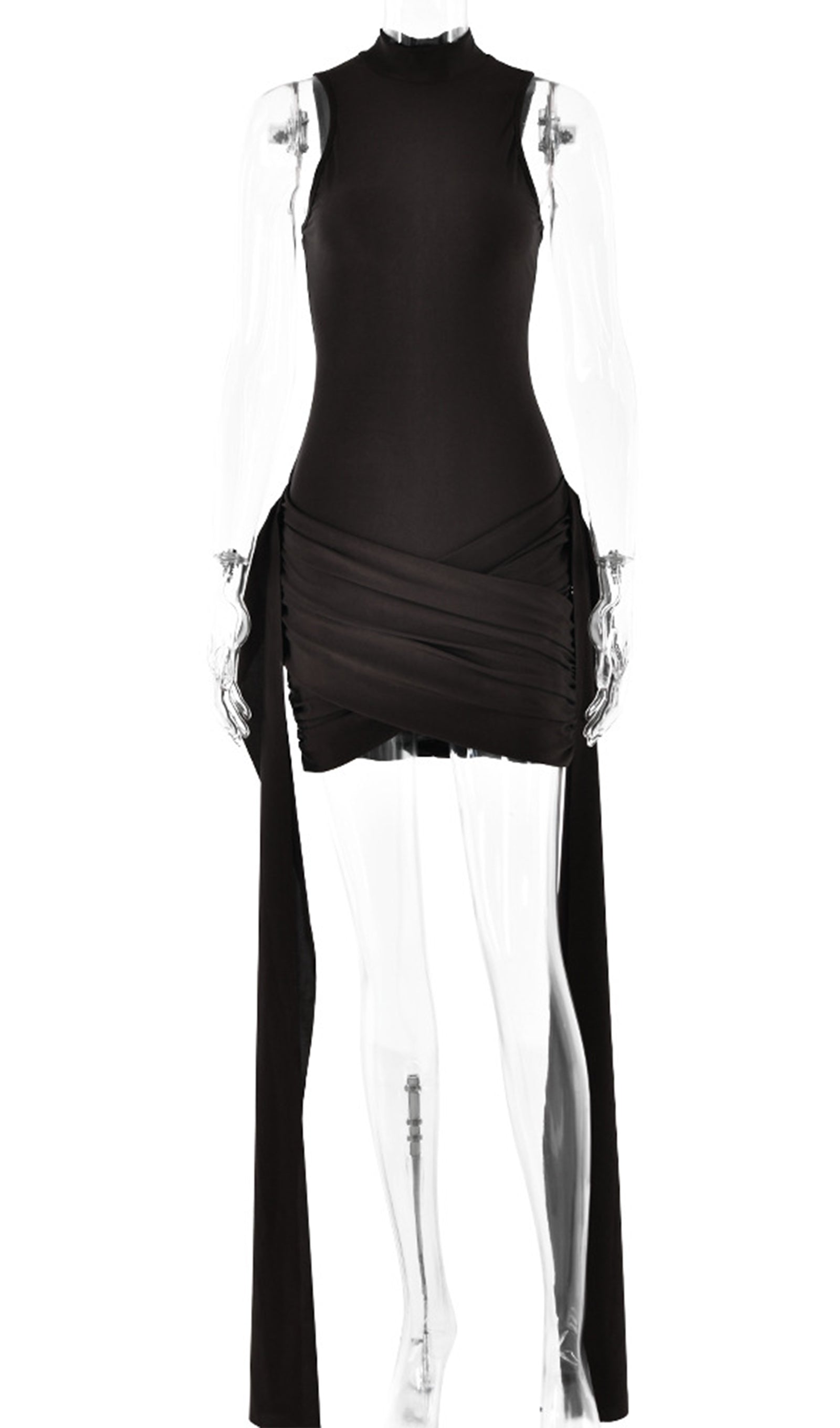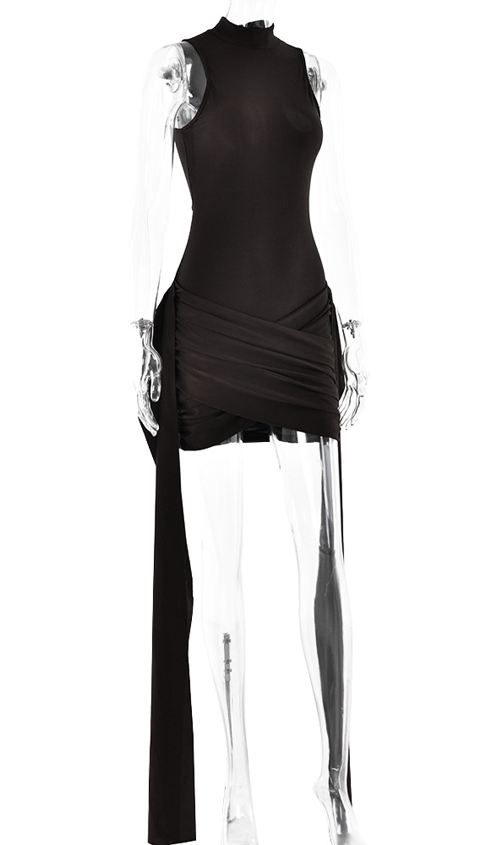 Zengin ve rahat bir kumaştan üretilen ürün, sofistike bir dokunuş katan yüksek yakaya sahiptir. Vücudu saran silueti vücudu düzleştirirken, eteğindeki benzersiz asimetrik tasarım görsel ilgi katar. Elbisenin her iki yanında bulunan uzun, dökümlü kuşaklar hareket ve drama hissi yaratır.