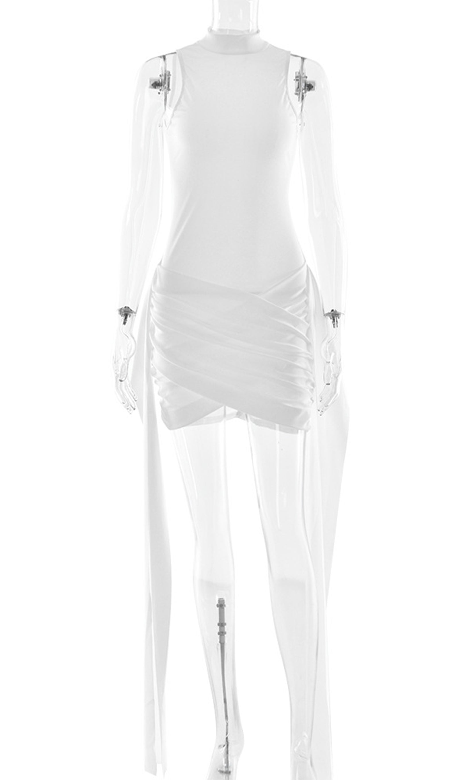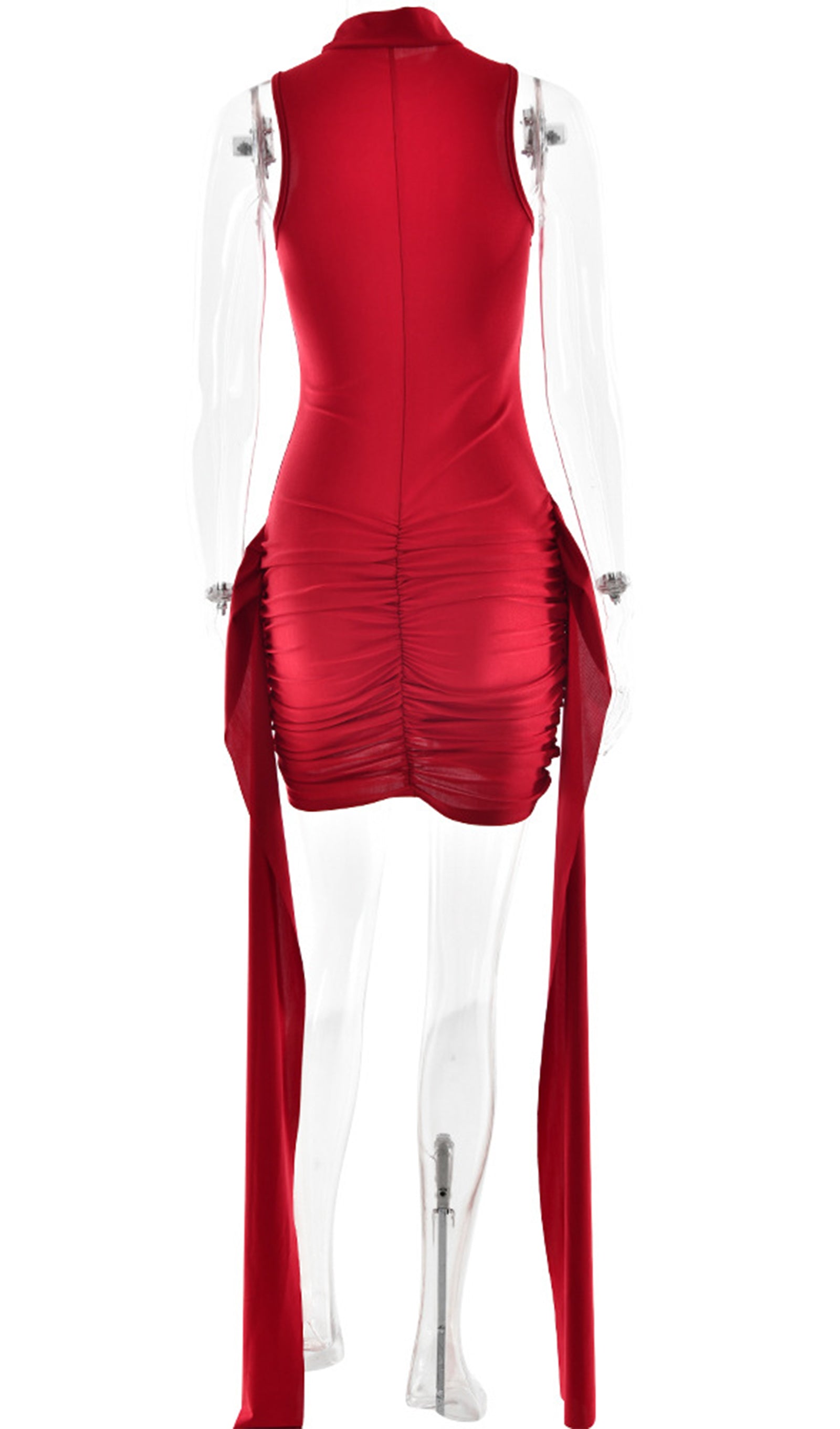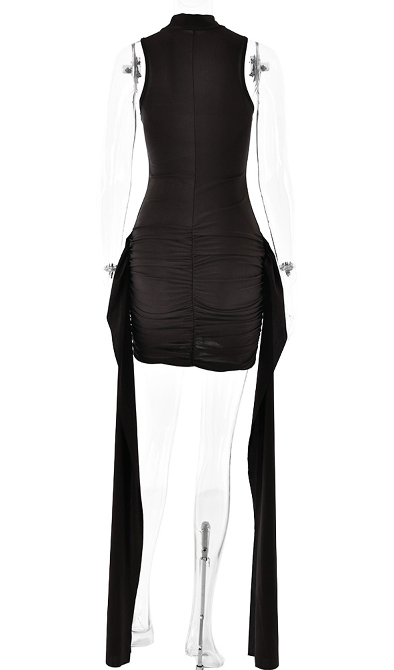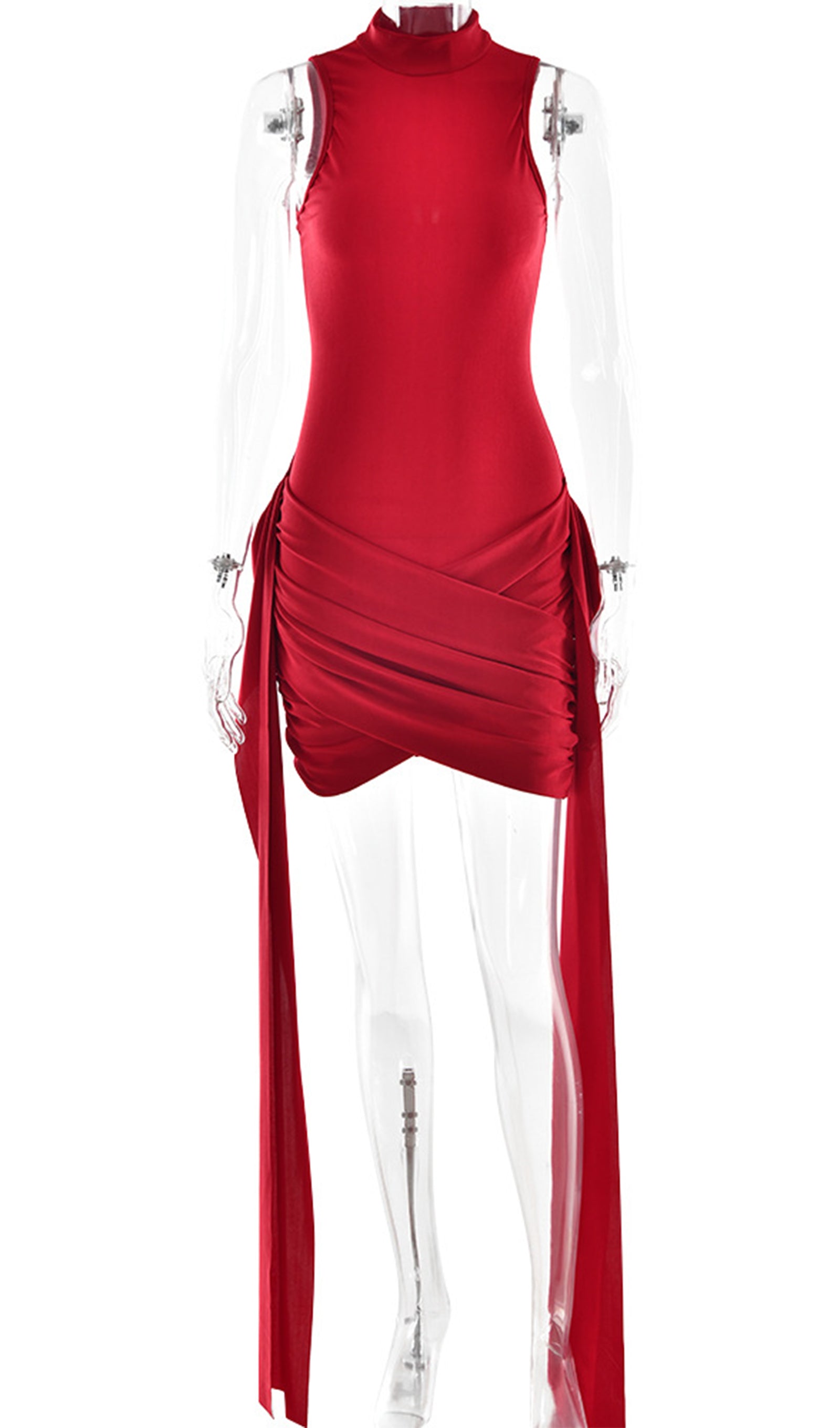Zengin ve rahat bir kumaştan üretilen ürün, sofistike bir dokunuş katan yüksek yakaya sahiptir. Vücudu saran silueti vücudu düzleştirirken, eteğindeki benzersiz asimetrik tasarım görsel ilgi katar. Elbisenin her iki yanında bulunan uzun, dökümlü kuşaklar hareket ve drama hissi yaratır.