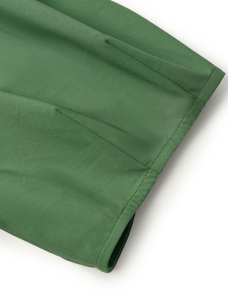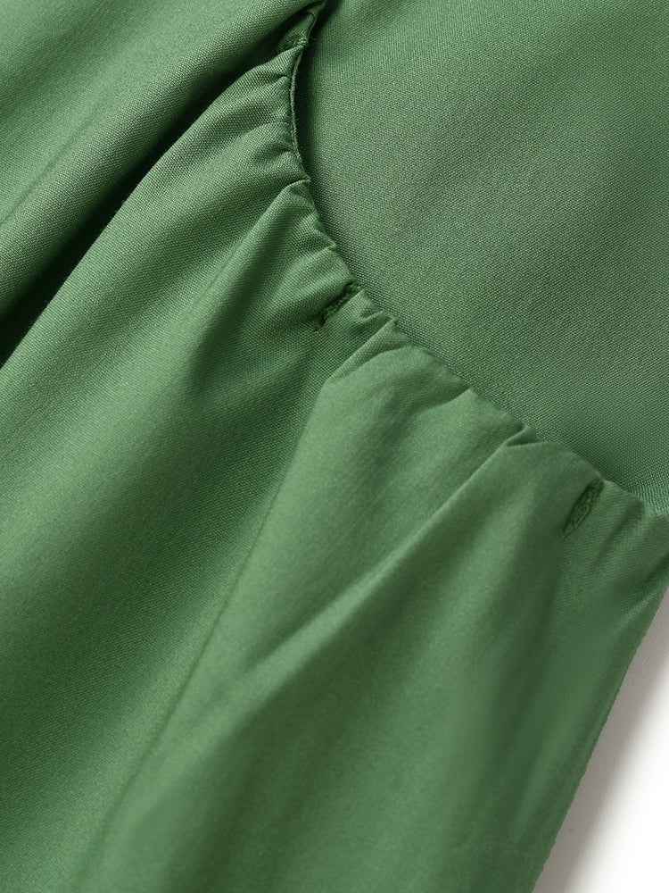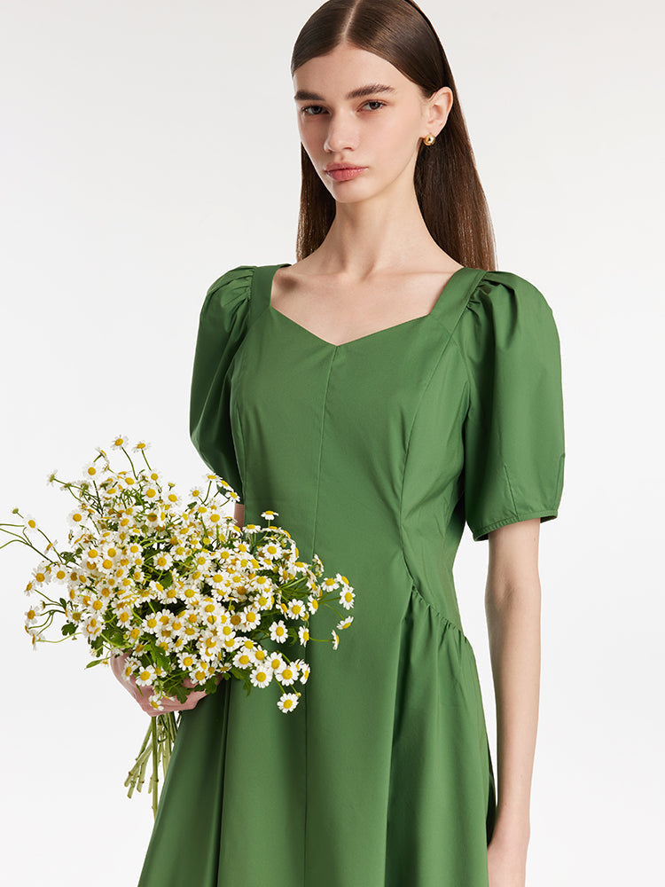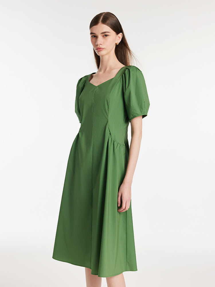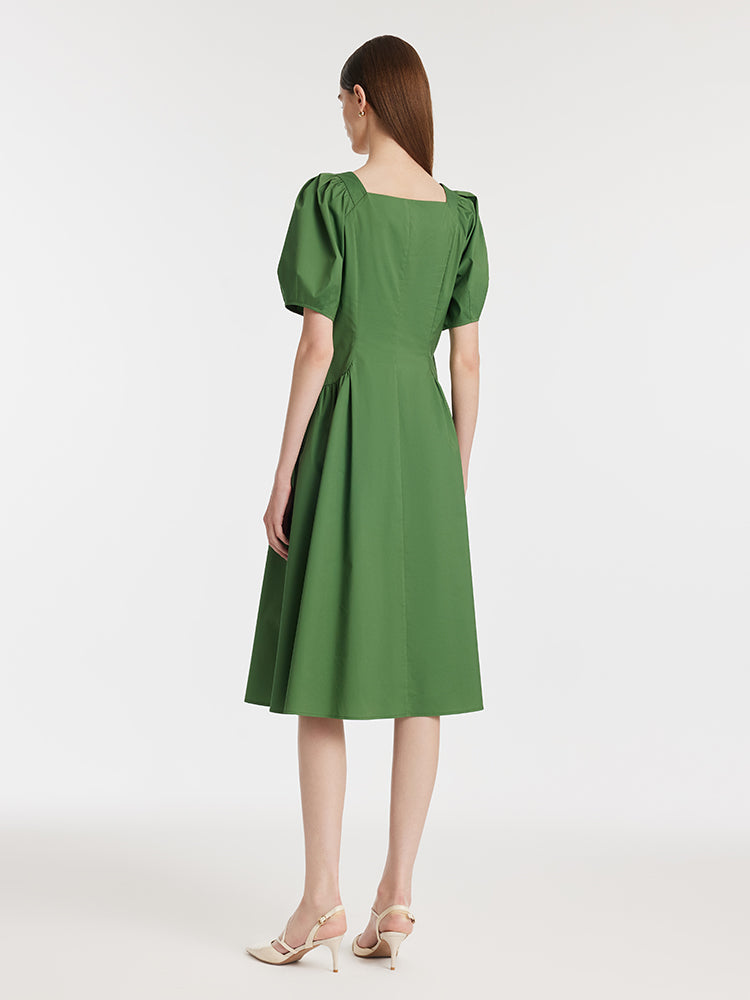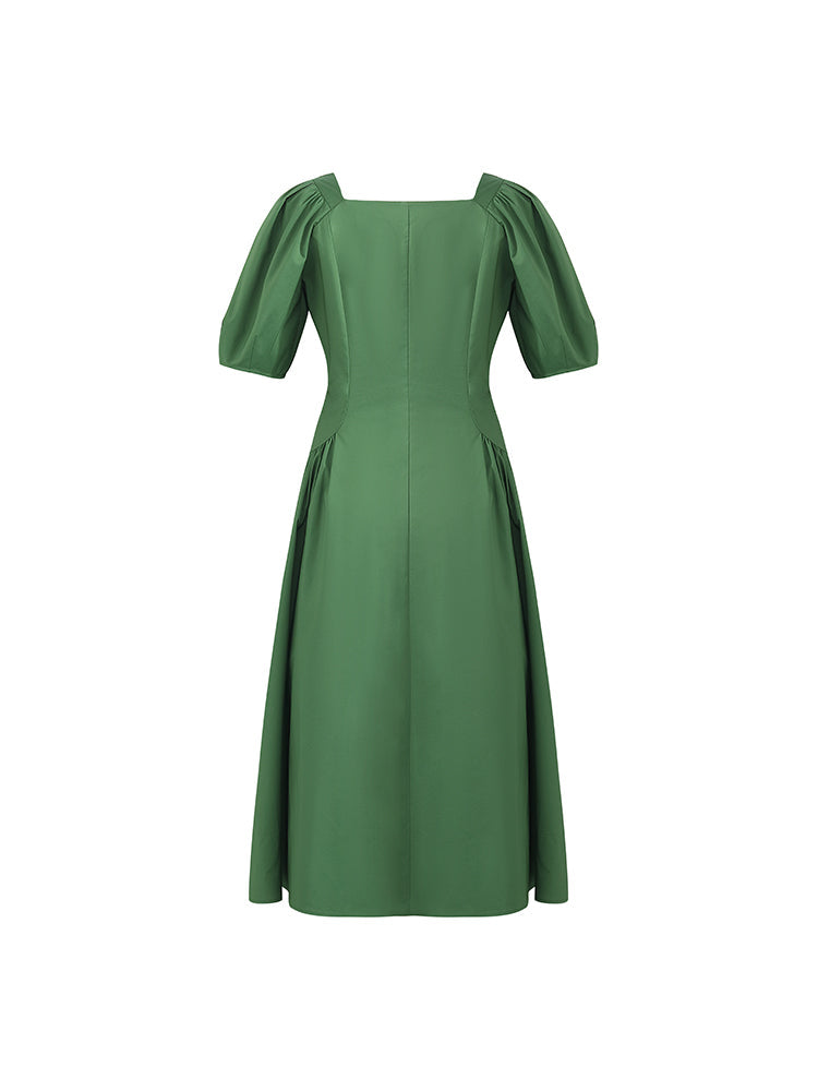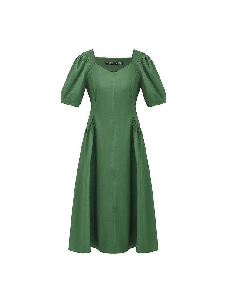 Kare Yaka Puf Kollu Kadın Midi Spor Yeşil Elbise