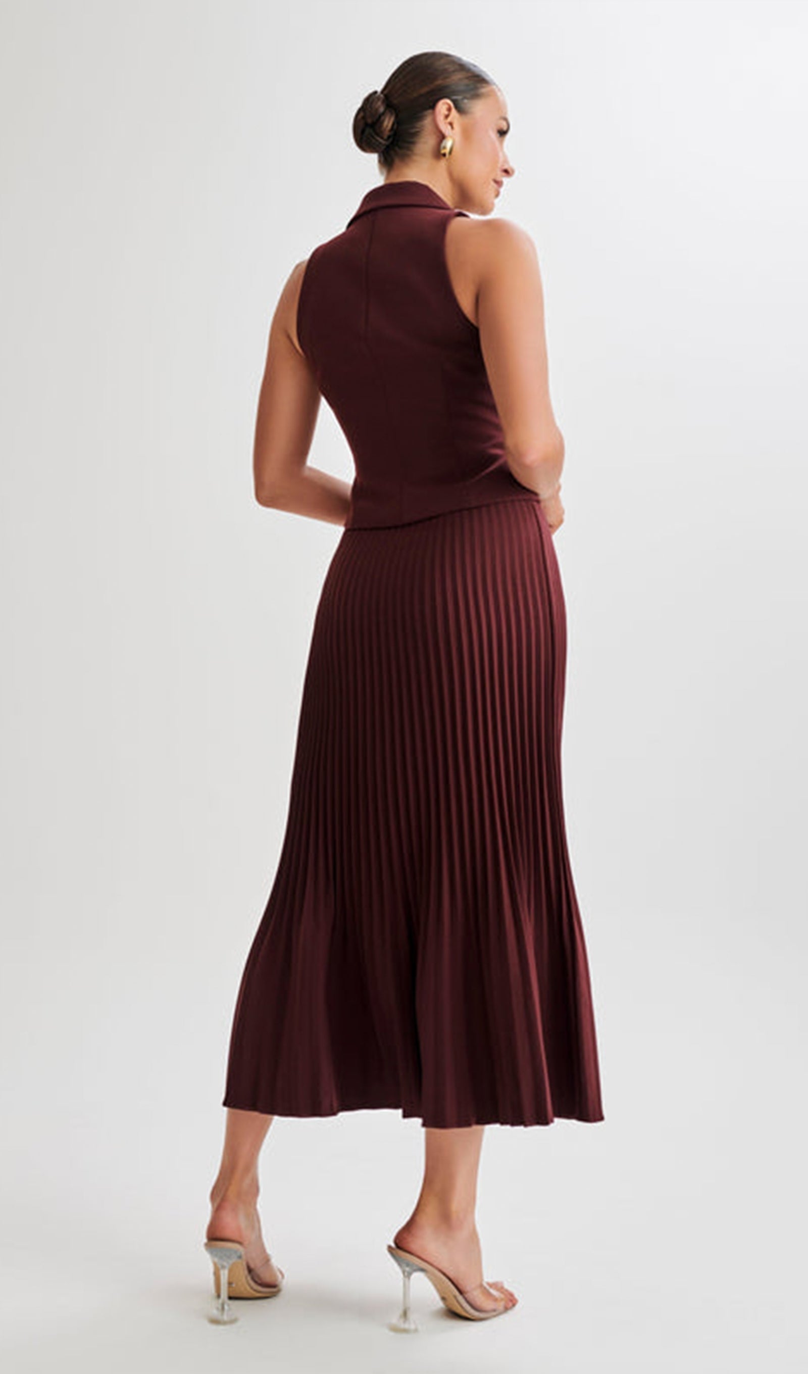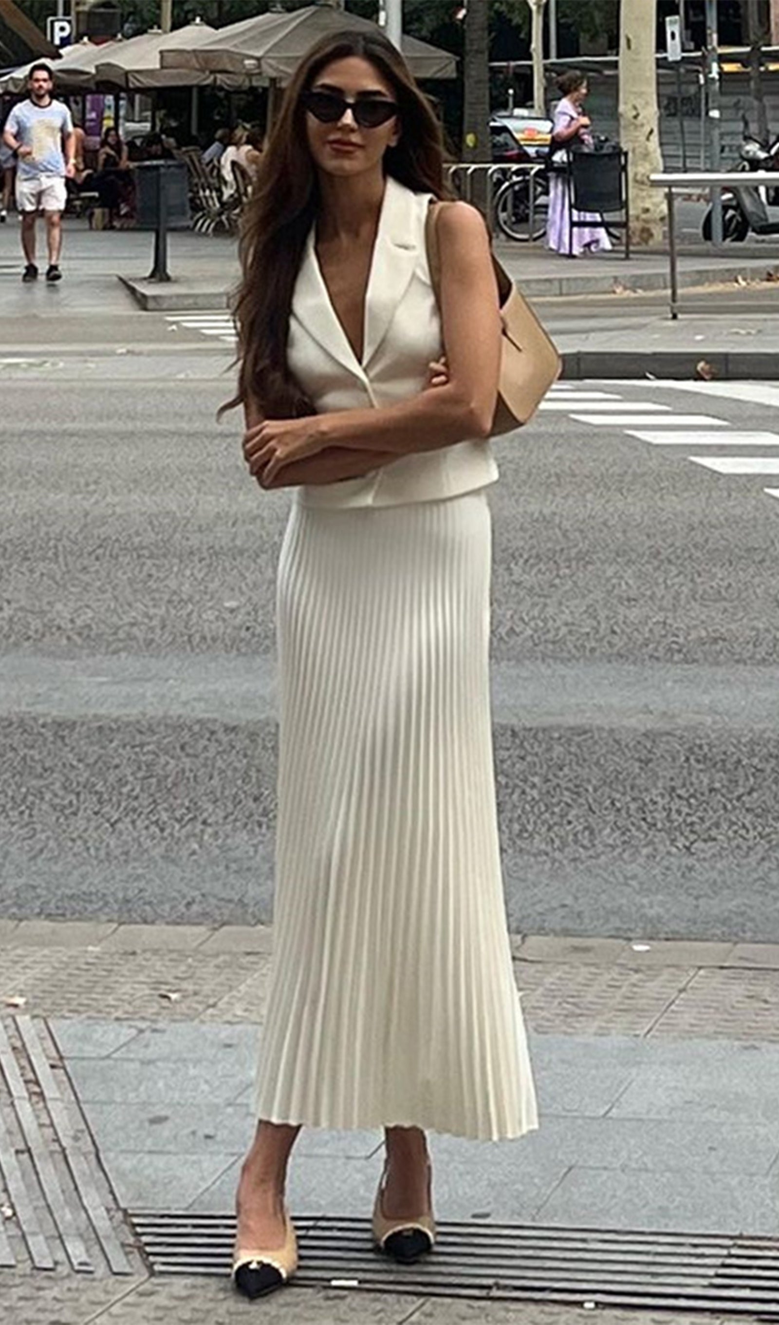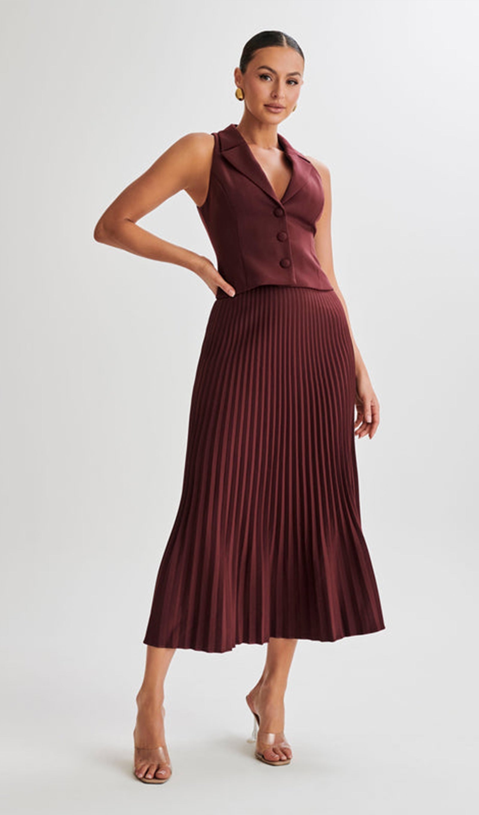 Etek kısmı görünmez yan fermuarlı ve belden paçaya kadar pilelidir. Taze ve çok yönlü polyester ve elastan kumaşı, yapısını kaybetmeden bol ve dökümlü görünmesini sağlar. Görsel çekicilik için takma bel ve pilili etek ucu gibi küçük detaylar zamansız bir uzunlukta.